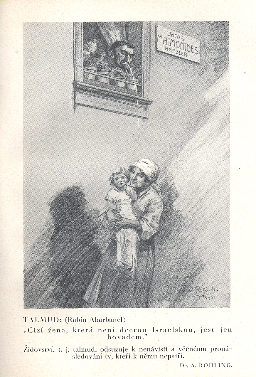 Názvové údaje Zrcadlo Židů : Žid podle talmudu : dle známých badatelů rabínské literatury jako: Dr. De Lamarque-a, Pontigny, Drumonta, Dr. Briemanna (Justus), Dr. A. Rohlinga, Ljutostanského / 36 kresbami doprovází malíř Karel Rélink Osobní jméno Rélink, Karel, 1880-1945 (Autor) (Grafický technik) (Nakladatel, vydavatel) Další autoři Lamarque, abbé de (Bibliografický předchůdce) Pontigny, A. (Bibliografický předchůdce) Drumont, Édouard, 1844-1917 (Bibliografický předchůdce) Brimann, Aron Israel, asi 1860- (Bibliografický předchůdce) Rohling, August, 1839-1931 (Bibliografický předchůdce) Ljutostanskij, Ippolit I., 1835-1915 (Bibliografický předchůdce) Korp. Dr. Ed. Grégr a syn (nakladatelství, tiskárna) (Tiskař) Korp. Zrcadlo Židů (1925 : Praha) Nakladatel V Praze : [K. Rélink], 1925 Výrobce Tiskem Dr. Ed. Grégra a syna Rozsah 80 nečíslovaných stran : ilustrace Klíčová slova česká literatura * výtvarné umění * české malířství * kresby * karikatury * antisemitismus * antisemitská ideologie * Židé * židovské dějiny * talmud * židovské náboženství * židovská otázka * první republika * stol. 20., léta 20.-40. * r. 1925 Počet ex. 2, z toho volných 2 Druh dok. monografie Signatura P 138 H 9 přív., KaG LXIV 335