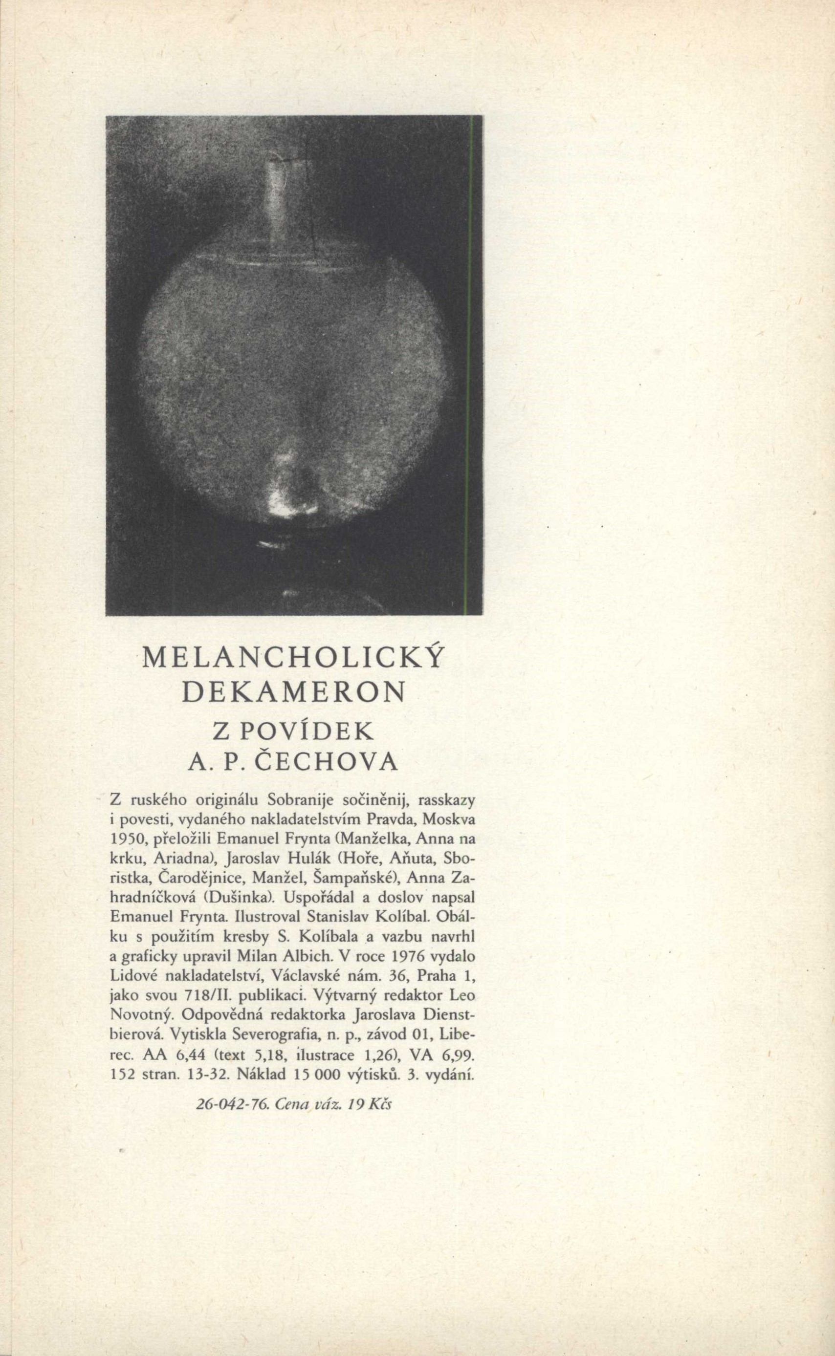 Názvové údaje Zápisky a rozhovory / Georges Braque ; Z franc. přel. Jitka Hamzová ; Graf. úpr. Stanislav Kolíbal, Michal Burda Osobní jméno Braque, Georges, 1882-1963 (Autor) Další autoři Hamzová, Jitka, 1929-2017 (Překladatel) Kolíbal, Stanislav, 1925- (Grafický technik) Burda, Michal, 1952- (Grafický technik) Nakladatel Praha : Arbor vitae, 1998 Rozsah 116 s. : il Osobní hesla Braque, Georges, 1882-1963 - francouzský malíř, sochař a grafik Klíčová slova francouzská literatura * Francie * umění * výtvarní umělci * názory * postoje Počet ex. 2, z toho volných 2 Druh dok. monografie Signatura NK/99 0026, NK/99 0026a Názvové údaje Zápisky a rozhovory / Georges Braque ; Z franc. orig. uved. v ediční pozn. přel. Jitka Hamzová ; Graf. úpr. Stanislav Kolíbal a Michal Burda Osobní jméno Braque, Georges, 1882-1963 (Autor) Další autoři Hamzová, Jitka, 1929-2017 (Překladatel) Kolíbal, Stanislav, 1925- (Grafický technik) Burda, Michal, 1952- (Grafický technik) Nakladatel Praha : Arbor vitae, 1998 Rozsah 116 s. Klíčová slova francouzská literatura * Braque G. * aforismy * rozhovory * Vallierová D. * Zervos Ch. * Reverdy P. * Goldain L. * Astier P. * stol. 20., léta 20.-60. Počet ex. 1, z toho volných 1 Druh dok. monografie Signatura C12a 1952 Názvové údaje Španělské pohádky / Vypravuje Václav Cibula ; Ilustr. Stanislav Kolíbal ; Graf. upr. Miloslav Fulín Osobní jméno Cibula, Václav, 1925-2009 (Autor) Další autoři Kolíbal, Stanislav, 1925- (Ilustrátor) Fulín, Miloslav, 1928-2019 (Grafický technik) Nakladatel Praha : Albatros, 1984 Výrobce Svoboda) Rozsah 237 s. : il Klíčová slova česká literatura * španělská literatura * próza * pohádky * literatura pro děti Počet ex. 1, z toho volných 1 Druh dok. monografie Signatura NK/83 0011 Názvové údaje Melancholický dekameron : z povídek A.P. Čechova / z ruského originálu Sobranije sočinenij, rasskazy i povesti ... přeložili Emanuel Frynta, Jaroslav Hulák a Anna Zahradníčková ; ilustroval Stanislav Kolíbal Osobní jméno Čechov, Anton Pavlovič, 1860-1904 (Autor) Další autoři Frynta, Emanuel, 1888-1949 (Překladatel) (Sestavovatel, kompilátor) (Autor doslovu, tiráže atd.) Hulák, Jaroslav, 1920-1999 (Překladatel) Zahradníčková, Anna, 1894-1979 (Překladatel) Kolíbal, Stanislav, 1925- (Ilustrátor) Albich, Milan, 1925-2000 (Autor obálky) (Výtvarník vazby) (Knižní grafik) Korp. Lidové nakladatelství (Nakladatel, vydavatel) Severografia Liberec (tiskárna) (Tiskař) (Tiskař obrazu) Nakladatel Praha : Lidové nakladatelství, 1976 Výrobce Liberec : Severografia, n. p., závod 1 Rozsah 149 stran : ilustrace ; 25 cm Klíčová slova ruská literatura * próza * Čechov A. P. * povídky * milostné povídky * melancholie * výbory * ilustrované knihy * ilustrace * Kolíbal S. * r. 1976 Počet ex. 2, z toho volných 2 Druh dok. monografie Signatura Holan 1116, VZinková 0763 Názvové údaje Nudná historie : ze zápisků starého člověka / Anton Pavlovič Čechov ; [obálku a vazbu navrhl a ilustracemi vyzdobil Stanislav Kolíbal ; z ruského originálu ... přeložil Vladimír Pravda ; doslov napsal Jaroslav Hulák] Osobní jméno Čechov, Anton Pavlovič, 1860-1904 (Autor) Další autoři Kolíbal, Stanislav, 1925- (Výtvarník vazby) (Autor obálky) (Ilustrátor) Pravda, Vladimír, 1907-1978 (Překladatel) Hulák, Jaroslav, 1920-1999 (Autor doslovu, tiráže atd.) Nakladatel Praha : Československý spisovatel, 1960 Rozsah 91 s., [4] l. obr. příl. Klíčová slova ruská literatura * próza * novela Počet ex. 3, z toho volných 3 Druh dok. monografie Signatura AČS 02581, AČS 02581a, MUK 1671 Názvové údaje Poesie / Ivan Franko ; [z ukrajinského originálu ... přeložili Zdeňka Hanusová ... [et al.] ; výbor uspořádal, doslov a poznámky napsal Jan Vladislav ; frontispice nakreslil a obálku a vazbu navrhl Stanislav Kolíbal ; graficky upravil Antonín Jukl] Osobní jméno Franko, Ìvan, 1856-1916 (Autor) Další autoři Hanusová, Zdeňka, 1931- (Překladatel) Vladislav, Jan, 1923-2009 (Editor) Kolíbal, Stanislav, 1925- (Ilustrátor) (Autor obálky) (Výtvarník vazby) Jukl, Antonín (Knižní grafik) Korp. Státní nakladatelství krásné literatury, hudby a umění (Nakladatel, vydavatel) Nakladatel Praha : Státní nakladatelství krásné literatury, hudby a umění, 1956 Výrobce (Práce 01) Rozsah 409 s. ; 8 Klíčová slova ukrajinská literatura * výbor poezie * poémy * občanská poezie * lyrická poezie * r. 1956 Počet ex. 2, z toho volných 2 Druh dok. monografie Signatura MUK 1640, JVladislav 069