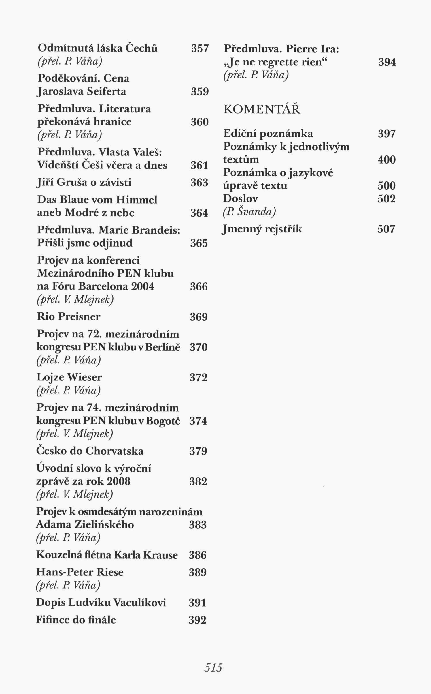 Názvové údaje Naše, národní umění : studie z dějin dějepisu umění / Milena Bartlová ; [sazba a obálka Čestmír Kučera] Osobní jméno Bartlová, Milena, 1958- (Autor) Další autoři Kučera, Čestmír (Autor obálky) Korp. Společnost pro odbornou literaturu - Barrister & Principal (nakladatelství) (Nakladatel, vydavatel) Masarykova univerzita. Seminář dějin umění (Brno) (Nakladatel, vydavatel) Nakladatel Brno : Společnost pro odbornou literaturu - Barrister & Principal : Masarykova univerzita, Filozofická fakulta - Seminář dějin umění, 2009 Rozsah 149 s., xxiv s. obr. příl. : il. (převážně barev.), mapy, portréty, faksim. Chronologie 19.-20. stol. Klíčová slova soubor studií * české umění * evropské umění * české výtvarné umění * národní identita * kulturní identita * historiografie umění * dějiny umění * Čechy a Morava * střední Evropa * stol. 19.-20. Počet ex. 1, z toho volných 1 Adr. el. zdr. obsah Druh dok. monografie Signatura C12b 18321 Názvové údaje Listy drahým / Jaroslav Durych Osobní jméno Durych, Jaroslav, 1886-1962 (Autor) Další autoři Komárek, Karel, 1963 duben 29.- (Editor) Kučera, Čestmír (Sazeč) (Autor obálky) Lukášová, Dora, 1977- (Sazeč) Korp. Společnost pro odbornou literaturu - Barrister & Principal (nakladatelství) (Nakladatel, vydavatel) Nakladatel Brno : Společnost pro odbornou literaturu – Barrister & Principal, 2008 Rozsah 317 stran ; 20 cm + 1 brožura (16 nečíslovaných stran obrazové přílohy) Osobní hesla Durych, Jaroslav, 1886-1962 - beletrista, básník, publicista, kritik, teoretik literatury, překladatel a redaktor Klíčová slova čeští spisovatelé * křesťanští spisovatelé * Durych J. * rodinná korespondence * stol. 20., léta 10.-50. * fotografické přílohy Počet ex. 2, z toho volných 2 Druh dok. monografie Signatura C12b 11671, VZinková 0403 Názvové údaje U mých krajanů / Marie von Ebner-Eschenbachová Osobní jméno Ebner-Eschenbach, Marie von, 1830-1916 (Autor) Další autoři Munzar, Jiří, 1937- (Sestavovatel, kompilátor) (Autor doslovu, tiráže atd.) Topoľská, Lucy, 1933- (Překladatel) Kučera, Čestmír (Autor obálky) Korp. Společnost pro odbornou literaturu - Barrister & Principal (nakladatelství) (Nakladatel, vydavatel) Nakladatel Brno : Společnost pro odbornou literaturu - Barrister & Principal, 2008 Rozsah 289 stran ; 21 cm Klíčová slova rakouská literatura * rakouská próza * německy psaná literatura * německy psaná próza * Ebner-Eschenbach M. von * povídky * stol. 19.-20. * překlad * výbory Počet ex. 1, z toho volných 1 Druh dok. monografie Signatura C12b 17192 Názvové údaje Eseje a studie o literatuře a kultuře II / Jiří Gruša ; editor Dalibor Dobiáš Osobní jméno Gruša, Jiří, 1938-2011 (Autor) Další autoři Dobiáš, Dalibor, 1977- (Editor) Švanda, Pavel, 1936- (Autor doslovu, tiráže atd.) Lukáš, Bohdan, 1987- (Typograf) (Sazeč) (Autor obálky) Kučera, Čestmír (Typograf) (Sazeč) (Autor obálky) Korp. Barrister & Principal (nakladatelství) (Nakladatel, vydavatel) Nakladatel Brno : Barrister & Principal, 2016 Rozsah 515 stran ; 22 cm Osobní hesla Gruša, Jiří, 1938-2011 - pnp_us_auth*0030328 Klíčová slova česká literatura * eseje * studie * vybrané práce * projevy * texty * literatura * kultura * Gruša J. Počet ex. 1, z toho volných 1 Druh dok. monografie Signatura C12b 17402 Názvové údaje Snad nesbíráte obrazy? : cesty soukromého sběratelství moderního umění v českých zemích v letech 1948-1965 / Marcela Rusinko Osobní jméno Rusinko, Marcela, 1976- (Autor) Další autoři Kučera, Čestmír (Knižní grafik) (Sazeč) Albert, Gwendolyn, 1967- (Překladatel) Korp. Books & Pipes Publishing (nakladatelství) (Nakladatel, vydavatel) Masarykova univerzita (Brno, Česko) (Spolupracovník) Nakladatel Brno : ve spolupráci s Masarykovou univerzitou vydalo nakladatelství B&P Publishing, 2018 Rozsah 351 stran, 32 nečíslovaných stran obrazových příloh : ilustrace (některé barevné), portréty, faksimile ; 27 cm Předmětová hesla sběratelé umění - Česko - 20. století * umění a společnost - Česko - 20. století * umění a politika - Česko - 20. století * umělecké sbírky - Česko - 20. století * soukromé sbírky - Česko - 20. století * umělecké sbírky - politické aspekty * soukromé sbírky - politické aspekty * moderní umění * art collectors - Czechia - 20th century * art and society - Czechia - 20th century * art and politics - Czechia - 20th century * art collections - Czechia - 20th century * private collections - Czechia - 20th century * art collections - political aspects * private collections - political aspects * modern art Klíčová slova česká literatura * studie * výtvarné umění * sběratelství * r. 1948-1965 * Československo * české země * obrazové publikace Počet ex. 1, z toho volných 1 Druh dok. monografie Signatura C12c 5159 Názvové údaje Estetika na přelomu milénia : vybrané problémy současné estetiky / Pavel Zahrádka (ed.) ; [obálka Bohdan Bobo Lukáš. typografie a sazba Čestmír Kučera] Další autoři Zahrádka, Pavel, 1977- (Editor) Lukáš, Bohdan, 1987- (Autor obálky) Kučera, Čestmír (Typograf) (Sazeč) Nakladatel Brno : Barrister & Principal, 2010 Rozsah 486 s. : il. Klíčová slova umění * filozofie umění * estetika umění * ontologie umění * hodnota umění * estetika * falzum * autorské právo * stol. 20.-21. * studie * sborník Počet ex. 1, z toho volných 0 Druh dok. monografie Signatura C12c 3604 Názvové údaje Možnosti vizuálních studií : obrazy, texty, interpretace / Marta Filipová, Matthew Rampley (eds.) ; obálka a sazba Čestmír Kučera Další autoři Filipová, Marta, 1978- (Editor) (Autor) Rampley, Matthew (Editor) (Autor) Kučera, Čestmír (Autor obálky) (Sazeč) Korp. Společnost pro odbornou literaturu - Barrister & Principal (nak