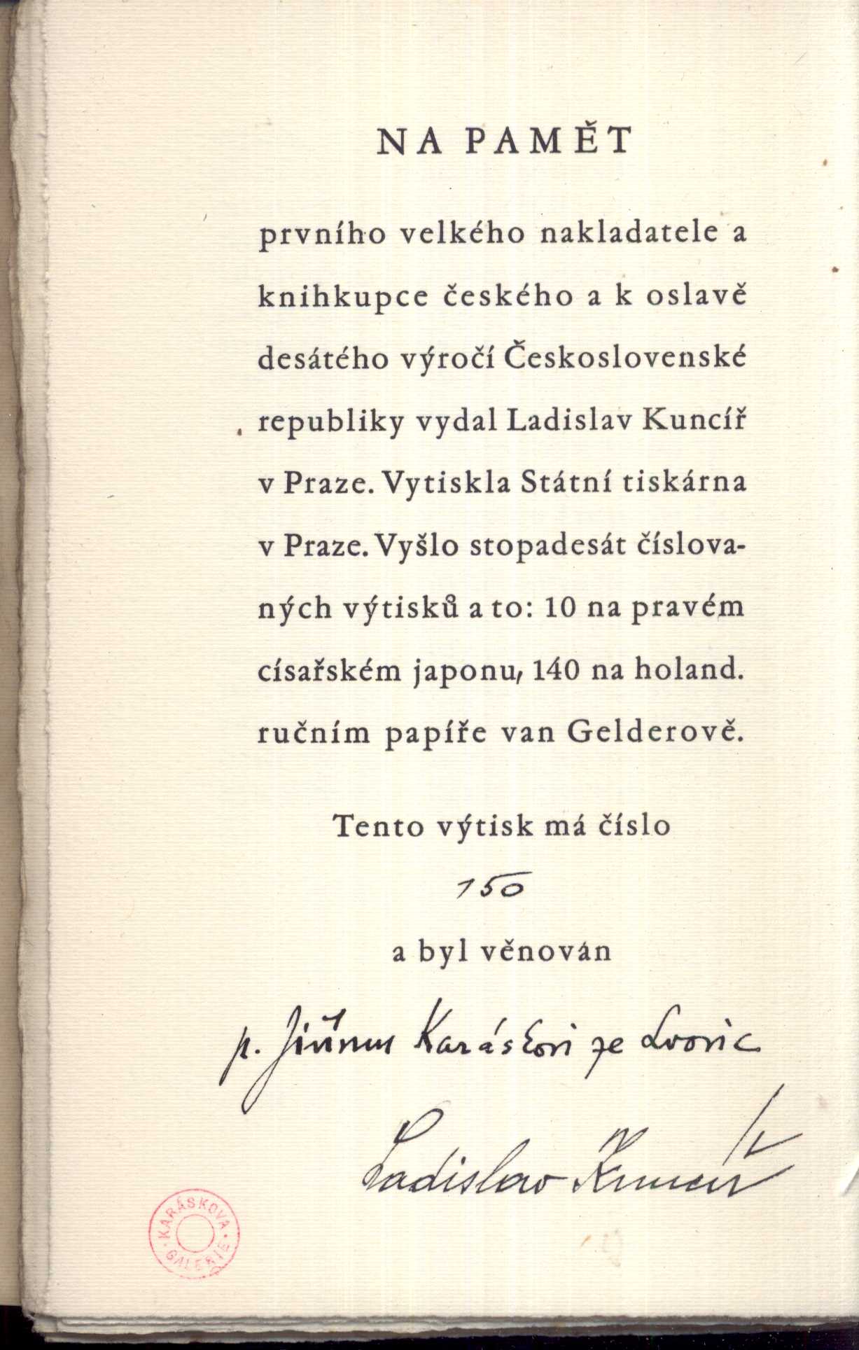 Názvové údaje Básně ; Amaidée ; Zapomenuté rytmy / Jules Barbey d'Aurevilly ; [Básně přeložil Zdeněk Hobzík ; Amaidée, Zapomenuté rytmy přeložila St. Jílovská ; upravil V. H. Brunner ; vytiskl F. Obzina] Osobní jméno Barbey d'Aurevilly, Jules Amédée, 1808-1889 (Autor) Další autoři Jílovská, Staša, 1898-1955 (Překladatel) Hobzík, Zdeněk, 1900-1969 (Překladatel) (Dedikátor) Brunner, Vratislav Hugo, 1886-1928 (Grafický technik) Kuncíř, Ladislav, 1890-1974 (Nakladatel, vydavatel) Obzina, František, 1871-1927 (Tiskař) Korp. Nakladatelská společnost Rozmach (nakladatelství) (Nakladatel, vydavatel) Ladislav Kuncíř (nakladatelství a knihkupectví) (Nakladatel, vydavatel) František Obzina (tiskárna, nakladatelství) (Tiskař) Nakladatel Praha : Ladislav Kuncíř, 1926 Výrobce F. Obzina) Rozsah 116 s. ; 20 cm Klíčová slova francouzská literatura * symbolismus * přelom 19. a 20. stol. * dekadence * básně v próze * francouzská poezie * francouzská próza Počet ex. 1, z toho volných 1 Druh dok. monografie Signatura RSzpuk 0436 Názvové údaje Básně ; Amaidée ; Zapomenuté rytmy / Jules Barbey d'Aurevilly ; [Básně přeložil Zdeněk Hobzík ; Amaidée, Zapomenuté rytmy přeložila St. Jílovská ; upravil V. H. Brunner ; vytiskl F. Obzina] Osobní jméno Barbey d'Aurevilly, Jules Amédée, 1808-1889 (Autor) Další autoři Jílovská, Staša, 1898-1955 (Překladatel) Hobzík, Zdeněk, 1900-1969 (Překladatel) (Dedikátor) Brunner, Vratislav Hugo, 1886-1928 (Grafický technik) Kuncíř, Ladislav, 1890-1974 (Nakladatel, vydavatel) Obzina, František, 1871-1927 (Tiskař) Karásek ze Lvovic, Jiří, 1871-1951 (Dedikant) Korp. Nakladatelská společnost Rozmach (nakladatelství) (Nakladatel, vydavatel) Ladislav Kuncíř (nakladatelství a knihkupectví) (Nakladatel, vydavatel) František Obzina (tiskárna, nakladatelství) (Tiskař) Nakladatel Praha : Ladislav Kuncíř, 1926 Výrobce Ve Vyškově : F. Obzina, 1926 Rozsah 116 stran Klíčová slova francouzská literatura * symbolismus * přelom 19. a 20. stol. * dekadence * básně v próze * francouzská poezie * francouzská próza Počet ex. 3, z toho volných 3 Druh dok. monografie Signatura Holan 20, KaG XV B2 119, VHB 2039 Názvové údaje Tři básně z války / Paul Claudel ; [přeložil Bohuslav Reynek] Osobní jméno Claudel, Paul, 1868-1955 (Autor) Další autoři Reynek, Bohuslav, 1892-1971 (Překladatel) Kuncíř, Ladislav, 1890-1974 (Nakladatel, vydavatel) Korp. Ladislav Kuncíř (nakladatelství a knihkupectví) (Nakladatel, vydavatel) František Obzina (tiskárna, nakladatelství) (Tiskař) Nakladatel V Praze : Lad. Kuncíř, 1921 Výrobce Frant. Obzina) Rozsah 12 s. Klíčová slova francouzská literatura * francouzská poezie * 1. světová válka Počet ex. 1, z toho volných 1 Druh dok. monografie Signatura KaG XLI G 121 Názvové údaje Přátelům a českému bibliofilstvu / Jaroslav Durych ; Ilustr. V. H. Brunner Osobní jméno Durych, Jaroslav, 1886-1962 (Autor) Další autoři Brunner, Vratislav Hugo, 1886-1928 (Ilustrátor) Kuncíř, Ladislav, 1890-1974 (Dedikátor) Portman, Josef, 1893-1968 (Dedikant) Kuncíř, Ladislav, 1890-1974 (Autor podpisu) Nakladatel Praha : Ladislav Kuncíř, 1925 Rozsah [Nestr.]., obr Osobní hesla Durych, Jaroslav, 1886-1962 - beletrista, básník, publicista, kritik, teoretik literatury, překladatel a redaktor * Brunner, Vratislav Hugo, 1886-1928 - malíř, grafik, karikaturista, ilustrátor * Kuncíř, Ladislav, 1890-1974 - nakladatel, redaktor * Portman, Josef, 1893-1968 - bibliofil, vydavatel, tiskař, sběratel * Kuncíř, Ladislav, 1890-1974 - nakladatel, redaktor Klíčová slova česká literatura * próza * pojednání Počet ex. 1, z toho volných 1 Druh dok. monografie Signatura POR 22 Názvové údaje Valdštejnův kraj : tři obrázky / Jaroslav Durych Osobní jméno Durych, Jaroslav, 1886-1962 (Autor) Další autoři Portman, Josef, 1893-1968 (Dedikant) Kuncíř, Ladislav, 1890-1974 (Nakladatel, vydavatel) (Dedikátor) Karásek ze Lvovic, Jiří, 1871-1951 (Dedikant) Korp. Ladislav Kuncíř (nakladatelství a knihkupectví) (Nakladatel, vydavatel) Kryl a Scotti (firma) (Tiskař) Nakladatel V Praze : Ladislav Kuncíř, 1929 Výrobce Kryl a Scotti) Rozsah 22 s. Klíčová slova česká literatura * próza * obrázky * bibliofilie Počet ex. 2, z toho volných 2 Druh dok. monografie Signatura POR 130, KaG XVI B2 239 Názvové údaje Vzpomínky a komentáře : 1893-1918 / Viktor Dyk ; [v úpr. Methoda Kalába]. Kniha první, 1914-1918 Osobní jméno Dyk, Viktor, 1877-1931 (Autor) Další autoři Kaláb, Method, 1885-1963 (Grafický technik) Kuncíř, Ladislav, 1890-1974 (Nakladatel, vydavatel) Korp. Nakladatelská společnost Rozmach (nakladatelství) (Nakladatel, vydavatel) Nakladatel Praha : Ladislav Kuncíř, 1927 Rozsah 331 s. Klíčová slova česká literatura * Dyk V. * vzpomínky * komentáře * polemiky * časopisecké články * novinové články * r. 1914-1918 Počet ex. 7, z toho volných 7 Druh dok. monografie Signatura MUK 858/2, LK Knytl 1264, LK Knytl 231, LK P 33 f 46, LK Thon 2711, LK P 55 a 97, LK M 68 g 3 Názvové údaje Člověk narozený z války : svědectví konvertitovo : (Yser - Artois 1915) / Henri Ghéon ; přeložil František Odvalil ; upravil V. H. Brunner Osobní jméno Ghéon, Henri, 1875-1944 (Autor) Další autoři Odvalil, František, 1880-1938 (Překladatel) Koníček, Oldřich (Dřívější majitel) Brunner, Vratislav Hugo, 1886-1928 (Grafický technik) (Knižní grafik) Kuncíř, Ladislav, 1890-1974 (Nakladatel, vydavatel) Korp. Ladislav Kuncíř (nakladatelství a knihkupectví) (Nakladatel, vydavatel) Kryl a Scotti (firma) (Tiskař) Nakladatel Praha : Ladislav Kuncíř, 1922 Výrobce V Nov. Jičíně : Kryl a Scotti, 1922 Rozsah 146 stran Klíčová slova francouzská literatura * francouzská próza * katolicismus * válka * křesťanská literatura * 1. světová válka Počet ex.