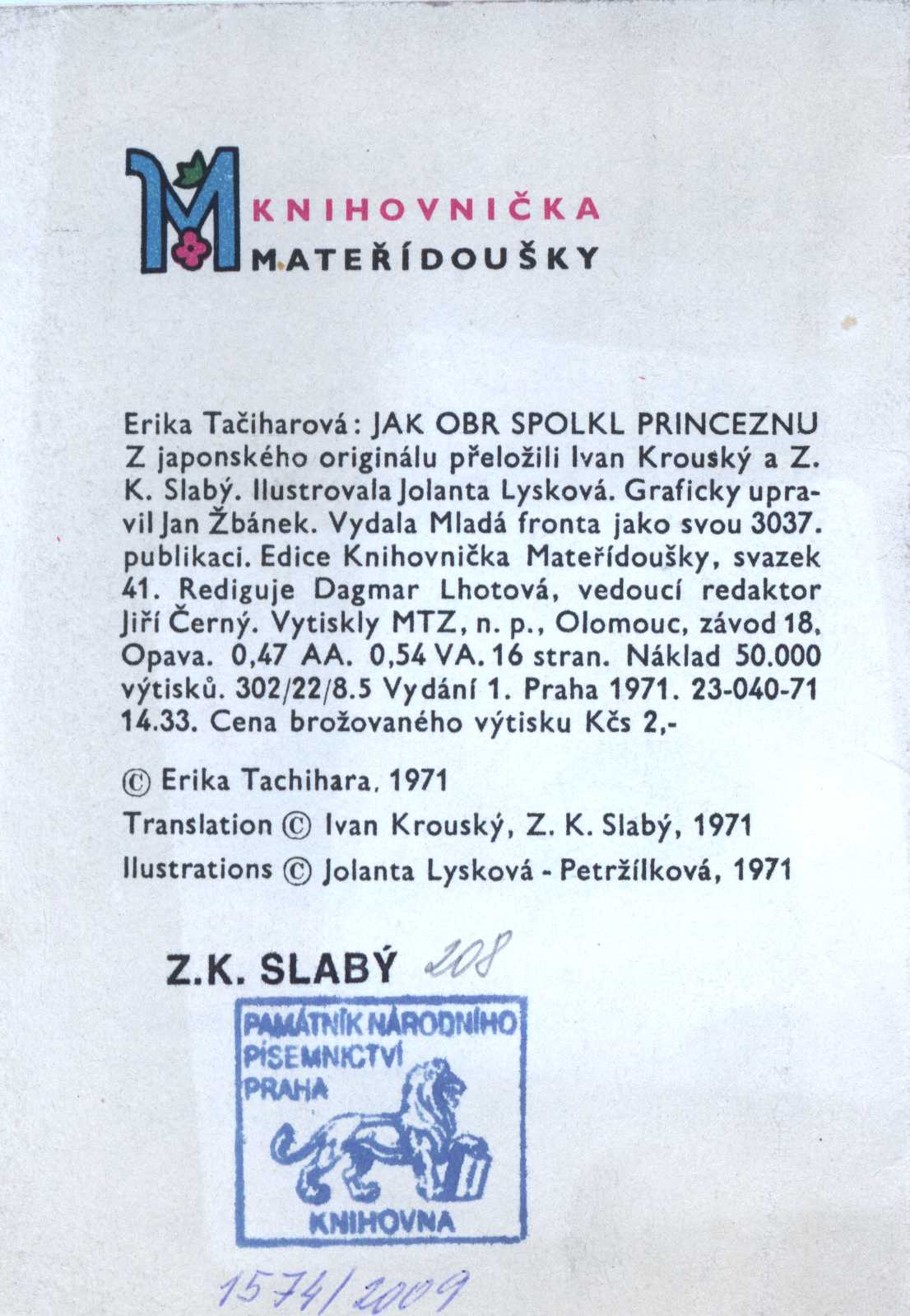 Názvové údaje Hurá za Bardem! : pro děti od 7 let / Zdeněk Adla ; ilustrace Jolanta Lysková ; grafická úprava Pavel Hrach Osobní jméno Adla, Zdeněk, 1910-1990 (Autor) Další autoři Lysková, Jolanta, 1939- (Ilustrátor) Hrach, Pavel, 1947- (Knižní grafik) Korp. Nakladatelství Albatros (Nakladatel, vydavatel) Nakladatel Praha : Albatros, 1989 Výrobce Gottwaldov : MTZ Rozsah 91 stran : barevné ilustrace ; 20 cm Klíčová slova česká literatura * literatura pro děti * české pohádky Počet ex. 1, z toho volných 1 Druh dok. monografie Signatura M 178f 29 Názvové údaje Hurá za Bardem! : pro děti od 7 let / Zdeněk Adla ; ilustrace Jolanta Lysková Osobní jméno Adla, Zdeněk, 1910-1990 (Autor) Další autoři Lysková, Jolanta, 1939- (Ilustrátor) Korp. Nakladatelství Albatros (Nakladatel, vydavatel) Severografia Liberec (tiskárna) (Tiskař) Nakladatel Praha : Albatros, 1982 Výrobce Liberec : Severografia Rozsah 91 stran : ilustracee ; 20 cm Klíčová slova česká literatura * literatura pro děti * české pohádky Počet ex. 1, z toho volných 1 Druh dok. monografie Signatura F I 5 Názvové údaje Traládští kouzelníci / napsal Zdeněk Adla ; ilustrovala Jolanta Lysková Osobní jméno Adla, Zdeněk, 1910-1990 (Autor) (Dedikátor) Další autoři Lysková, Jolanta, 1939- (Ilustrátor) Cvejn, Karel, 1911-1986 (Dedikant) Korp. Panorama (nakladatelství a vydavatelství) (Nakladatel, vydavatel) Severografia Červený Kostelec (tiskárna) (Tiskař) Nakladatel Praha : Panorama, 1984 Výrobce Červený Kotelec : Severografia Červený Kostelec Rozsah 32 nečíslovaných stran : barevné ilustrace ; 23 cm Klíčová slova česká literatura * literatura pro děti * české pohádky Počet ex. 1, z toho volných 1 Druh dok. monografie Signatura M 165c 34 Názvové údaje Hrdinové z pohádek / Ladislav Dvorský ; [ilustrace a obal Jolanta Lysková] Osobní jméno Dvorský, Ladislav, 1931-1995 (Autor) Další autoři Lysková, Jolanta, 1939- (Ilustrátor) Nakladatel Liberec : Severočeské nakladatelství, 1969 Výrobce (Liberecké tisk) Rozsah 266, [5] s. ; 8° Klíčová slova česká próza * literatura pro děti a mládež * pohádky * pohádkové postavy Počet ex. 1, z toho volných 1 Druh dok. monografie Signatura Holan 02734 Názvové údaje Tesknice / Ludmila Hořká ; vybral, k vydání připravil a závěrečné slovo napsal Antonín Satke ; s použitím kresby Jolanty Lyskové graficky upravil Oldřich Harok Osobní jméno Hořká, Ludmila, 1892-1966 (Autor) Další autoři Satke, Antonín, 1920-2008 (Sestavovatel, kompilátor) Satke, Antonín, 1920-2008 (Editor) Satke, Antonín, 1920-2008 (Autor úvodu atd.) Harok, Oldřich, 1950- (Grafický technik) Lysková, Jolanta, 1939- (Ilustrátor) Nakladatel B.m. : Gramma, 1992 Rozsah 43 s. Osobní hesla Hořká, Ludmila, 1892-1966 - básnířka, prozaička, sběratelka lidové slovesnosti, vlastivědná pracovnice * Hořká, Ludmila, 1892-1966 - básnířka, prozaička, sběratelka lidové slovesnosti, vlastivědná pracovnice Klíčová slova česká literatura * poezie * lyrické básně * nářečí Počet ex. 1, z toho volných 1 Druh dok. monografie Signatura M 218 c 24 Názvové údaje Řetízek / Jarmila Konečná ; Ilustr. Jolanta Lysková ; Graf. úprava Oldřich Harok Osobní jméno Konečná, Jarmila, 1931 říjen 16.- (Autor) Další autoři Lysková, Jolanta, 1939- (Ilustrátor) Harok, Oldřich, 1950- (Grafický technik) Nakladatel Karviná : Gramma, 1991 Výrobce Harok) Rozsah [39] s. : il Klíčová slova česká literatura * poezie pro děti * stol. 20., léta 90. Počet ex. 1, z toho volných 1 Druh dok. monografie Signatura M 218 h 77 Názvové údaje Pan Sluníčko / [Z.K. Slabý ; ilustrovala Jolanta Lysková ; graficky upravila Zdenka Táborská] Osobní jméno Slabý, Zdeněk Karel, 1930-2020 (Autor) Další autoři Lysková, Jolanta, 1939- (Ilustrátor) Kabátová-Táborská, Zdenka, 1933- (Knižní grafik) Korp. Lidové nakladatelství (Nakladatel, vydavatel) Nakladatel Praha : Lidové nakladatelství, 1969 Rozsah 31 s. : il. Klíčová slova literatura pro děti * české pohádky * moderní pohádky Počet ex. 1, z toho volných 1 Druh dok. monografie Signatura ZKSlabý 0171 Názvové údaje Jak obr spolkl princeznu / Erika Tačiharová ; [z japonského originálu přeložili Ivan Krouský a Z.K. Slabý ; ilustrovala Jolanta Lysková ; graficky upravil Jan Žbánek] Osobní jméno Tachihara, Erika, 1937- (Autor) Další autoři Slabý, Zdeněk Karel, 1930-2020 (Překladatel) Krouský, Ivan, 1933- (Překladatel) Lysková, Jolanta, 1939- (Ilustrátor) Žbánek, Jan, 1927-2018 (Knižní grafik) Korp. Mladá fronta (nakladatelství) (Nakladatel, vydavatel) Nakladatel Praha : Mladá fronta, 1971 Výrobce MTZ) Rozsah [14] s. : il. Klíčová slova japonská literatura * pohádky * literatura pro děti Počet ex. 1, z toho volných 1 Druh dok. monografie Signatura ZKSlabý 0208