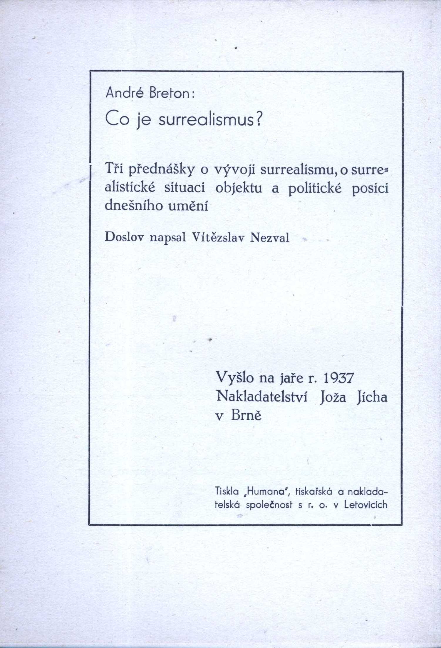 Názvové údaje Pásmo a jiné verše / Guillaume Apollinaire ; uspořádali Adolf Kroupa a Milan Kundera ; z francouzských originálů přeložili Karel Čapek, Vladimír Holan, Jindřich Hořejší, František Hrubín, Hanuš Jelínek, Adolf Kroupa, Milan Kundera a Jaroslav Seifert ; předmluvu napsal Vítězslav Nezval Osobní jméno Apollinaire, Guillaume, 1880-1918 (Autor) Další autoři Kundera, Milan, 1929-2023 (Sestavovatel, kompilátor) Čapek, Karel, 1890-1938 (Překladatel) Nezval, Vítězslav, 1900-1958 (Překladatel) (Autor úvodu atd.) Kroupa, Adolf, 1910-1981 (Sestavovatel, kompilátor) (Překladatel) Seifert, Jaroslav, 1901-1986 (Překladatel) Holan, Vladimír, 1905-1980 (Překladatel) Hořejší, Jindřich, 1886-1941 (Překladatel) Hrubín, František, 1910-1971 (Překladatel) Jelínek, Hanuš, 1878-1944 (Překladatel) Korp. Státní nakladatelství krásné literatury, hudby a umění (Nakladatel, vydavatel) Nakladatel Praha : Státní nakladatelství krásné literatury, hudby a umění, 1958 Rozsah 188 stran Klíčová slova francouzská poezie * básně * výbory Počet ex. 4, z toho volných 4 Druh dok. monografie Signatura Nezval 1787, P 136 g 16, Janeček 348, P 90 g 41 Názvové údaje Květy zla / Charles Baudelaire ; česky Vítězslav Nezval Osobní jméno Baudelaire, Charles, 1821-1867 (Autor) Další autoři Nezval, Vítězslav, 1900-1958 (Překladatel) Blahynka, Milan, 1933- (Autor komentáře) (Autor doslovu, tiráže atd.) Vodáková, Sylvie, 1926-2016 (Výtvarník vazby) Korp. Mladá fronta (nakladatelství) (Nakladatel, vydavatel) Mír, novinářské závody (tiskárna) (Tiskař) Unifikovaný název Fleurs du mal. Česky Nakladatel Praha : Mladá fronta, 1964 Výrobce Praha : Mír, novinářské závody, n. p., závod 3 Rozsah 232 stran ; 15 cm Osobní hesla Baudelaire, Charles, 1821-1867 - francouzský básník, umělecký kritik a překladatel Klíčová slova francouzská literatura * poezie * Baudelaire Ch. * český překlad * Nezval V. * r. 1964 Počet ex. 1, z toho volných 1 Adr. el. zdr. http://krameriusndk.nkp.cz/search/handle/uuid:096e1170-b30b-11e7-a6f3-005056827e52 Druh dok. monografie Signatura VZinková 0653 Názvové údaje Anthologie : 9 básníků Devětsilu / 1. Konstantin Biebl ... [et al.] ; uspořádal redaktor Redu Karel Teige ; typo, obálka a vazba K. Teigeho Osobní jméno Biebl, Konstantin, 1898-1951 (Autor) Další autoři Teige, Karel, 1900-1951 (Editor) (Grafický technik) (Autor obálky) Halas, František, 1901-1949 (Autor) Konrád, Karel, 1899-1971 (Autor) Mařánek, Jiří, 1891-1959 (Autor) Nezval, Vítězslav, 1900-1958 (Autor) Seifert, Jaroslav, 1901-1986 (Autor) Vančura, Vladislav, 1891-1942 (Autor) Voskovec, Jiří, 1905-1981 (Autor) Závada, Vilém, 1905-1982 (Autor) Korp. Odeon, Jan Fromek (Praha) (Nakladatel, vydavatel) Orbis (tiskárna) (Tiskař) Nakladatel Praha : nakladatelství Odeon, Jan Fromek, 1928 Výrobce Vytiskla knihtiskárna Orbis Rozsah 36 nečíslovaných stran Klíčová slova česká literatura * poezie * próza * výběr * antologie * Devětsil * členové * bibliofilská vydání * r. 1928 Počet ex. 5, z toho volných 5 Druh dok. monografie Signatura P 131 c 42, P 27 E 46, Nezval 0778, P 131 B 59, M 200 d 21 Názvové údaje Dílo / Konstantin Biebl ; uspoř., k vyd. připr., doslov a pozn. naps. Z. K. Slabý za red. spolupr. Vítěslava Nezvala, který je i aut. úvodu, Jiřího Taufra a Karla Konráda ; obálku, vazbu a typogr. úpr. navrhl Antonín Dvořák. [Díl] 5, 1919-1951. Verše nepojaté do sbírek, verše z pozůstalosti, próza Osobní jméno Biebl, Konstantin, 1898-1951 (Autor) Další autoři Slabý, Zdeněk Karel, 1930-2020 (Sestavovatel, kompilátor) Nezval, Vítězslav, 1900-1958 (Dotazovatel, interviewující) (Autor úvodu atd.) Taufer, Jiří, 1911-1986 (Dotazovatel, interviewující) Konrád, Karel, 1899-1971 (Dotazovatel, interviewující) Dvořák, Antonín, 1920-1997 (Typograf) (Výtvarník vazby) (Autor obálky) Nakladatel Praha : Československý spisovatel, 1954 Rozsah 484 s. Klíčová slova česká literatura * poezie * próza * r. 1919-1951 * výbor Počet ex. 2, z toho volných 2 Druh dok. monografie Signatura AČS 00902/V, AČS 00902/Va Názvové údaje Co je surrealismus? : tři přednášky o vývoji surrealismu, o surrealistické situaci objektu a politické posici dnešního umění / André Breton ; [doslov napsal Vítězslav Nezval] Osobní jméno Breton, André, 1896-1966 (Autor) Další autoři Nezval, Vítězslav, 1900-1958 (Autor doslovu, tiráže atd.) Korp. Joža Jícha (nakladatelství) (Nakladatel, vydavatel) Humana (tiskařská a nakladatelská společnost) (Tiskař) Nakladatel Brno : Joža Jícha, 1937 Výrobce Humana) Rozsah 157 s. Klíčová slova česká literatura * přednášky * surrealismus * r. 1934 Počet ex. 5, z toho volných 5 Druh dok. monografie Signatura C12b 4677, LK P 73 e 30, LK JG VII 1, Holan 2534, Teige 110 Názvové údaje Les champs magnétiques / par André Breton et Philippe Soupault Osobní jméno Breton, André, 1896-1966 (Autor) (Dedikátor) Další autoři Soupault, Philippe, 1897-1990 (Autor) (Dedikátor) Nezval, Vítězslav, 1900-1958 (Dedikant) Nakladatel A Paris : au Sans Pareil, 1920 Výrobce Par René Tancrède Rozsah 111 stran ; 19,5 cm Klíčová slova francouzská literatura * francouzská přátelství * surrealismus * surrealistické skupiny * stol. 20., léta 20. Počet ex. 1, z toho volných 1 Druh dok. monografie Signatura Nezval 0489 Názvové údaje Nadja / André Breton ; [přeložili M. Hlávka, V. Nezval a B. Vaníček ; reprodukce obrázků a nadpisu v titulu z původních kreseb Nadji ; autorův portrét kreslil Pablo Picasso ; obálka Josefa Šímy] Osobní jméno Breton, André, 1896-1966 (Autor) Další autoři Hlávka, Miloš, 1907-1945 (Překladatel) Nezval, Vítězslav, 1900-1958 (Překladatel) Vaníček, Bedřich, 1885-1955 (Překladatel) Picasso, Pablo, 1881-1973 (Ilustrátor) Šíma, 