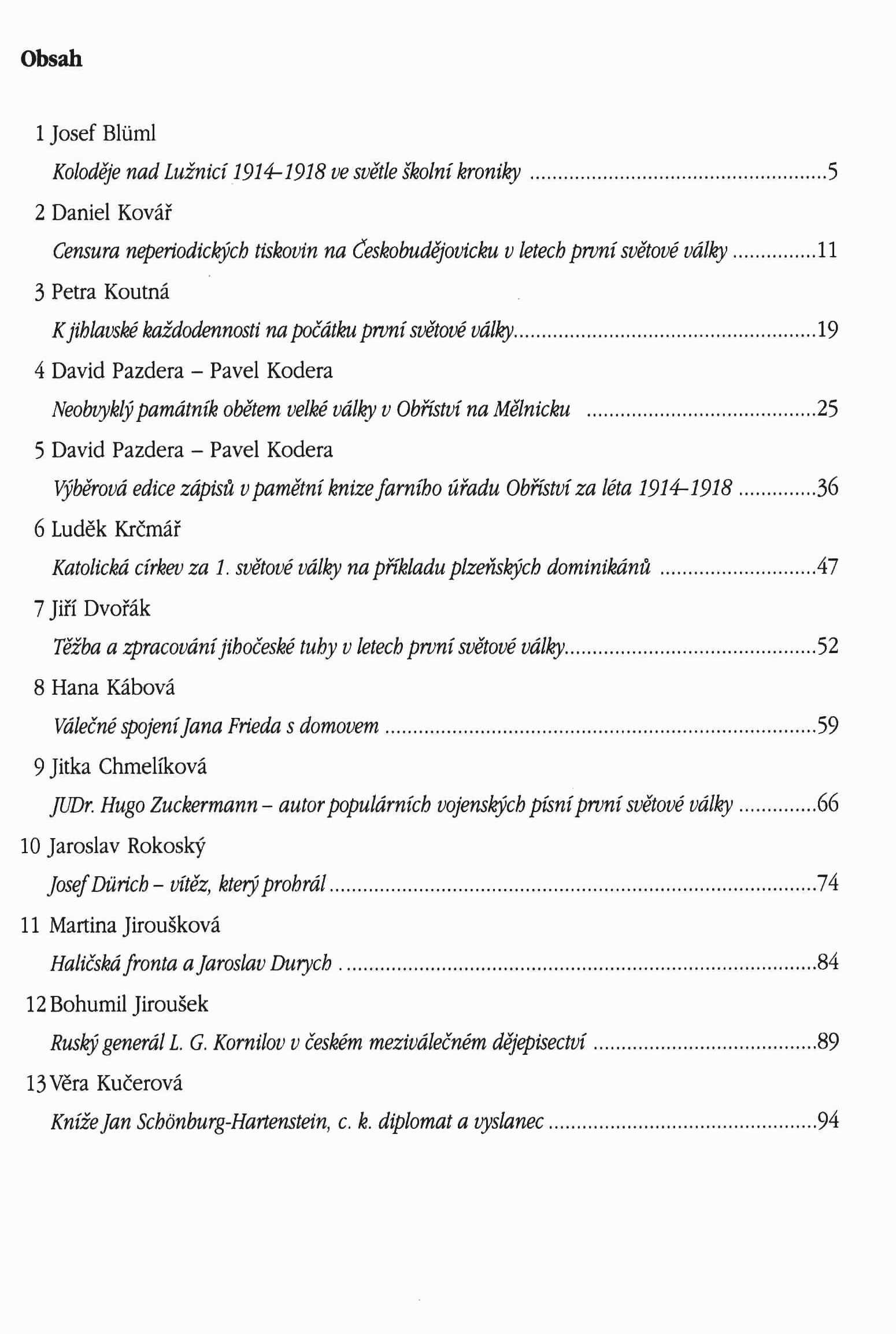 Názvové údaje Československé legie a první světová válka : sborník příspěvků z vědecké konference konané v Jihočeském muzeu v Českých Budějovicích dne 9. listopadu 2001 / [sestavil Jiří Petráš] Záhlaví-akce Československé legie a první světová válka (2001 : České Budějovice, Česko) Další autoři Petráš, Jiří, 1963- (Sestavovatel, kompilátor) Nakladatel České Budějovice : Jihočeské muzeum, 2002 Rozsah 152 s. : il., portréty, faksim., mapy Klíčová slova československé legie * 1. světová válka * zahraniční vojenské jednotky * českoslovenští legionáři * r. 1914-1918 * sborník příspěvků * sborníky z konferencí Počet ex. 1, z toho volných 1 Druh dok. monografie Signatura C12b 14489 Názvové údaje Jihočeský sborník historický Záhlaví-korpor. Jihočeské muzeum (České Budějovice, Česko) (Nakladatel, vydavatel) Další autoři Fröhlich, Jiří, 1946-2023 (Editor) Petráš, Jiří, 1963- (Redaktor, výkonný redaktor) Květounová, Vladimíra (Překladatel) Benešová, Radka (Překladatel) Roč., číslo 85, 2016 Nakladatel České Budějovice : Jihočeské muzeum v Českých Budějovicích, 2017 Rozsah 492 stran : ilustrace, faksimile, grafy, mapky ; 23 cm Klíčová slova jižní Čechy * historie kraje * osobnosti kraje * kulturní památky * studie * recenze * zprávy * r. 2016 * regionální sborník Nadřízená jednotka Jihočeský sborník historický Počet ex. 1, z toho volných 1 Druh dok. PERIODIKA - Svázaný ročník periodika Signatura C12c 4874 Názvové údaje Jihočeský sborník historický Záhlaví-korpor. Jihočeské muzeum (České Budějovice, Česko) (Nakladatel, vydavatel) Další autoři Fröhlich, Jiří, 1946-2023 (Editor) Petráš, Jiří, 1963- (Redaktor, výkonný redaktor) Květounová, Vladimíra (Překladatel) Benešová, Radka (Překladatel) Korp. Nová tiskárna Pelhřimov (tiskárna) (Tiskař) Roč., číslo 87, 2018 Nakladatel České Budějovice : Jihočeské muzeum v Českých Budějovicích, 2019 Výrobce Pelhřimov : Nová tiskárna Pelhřimov, spol. s r. o. Rozsah 450 stran : fotografie, faksimile, grafy ; 23 cm Klíčová slova jižní Čechy * historie kraje * osobnosti kraje * kulturní památky * studie * recenze * zprávy * r. 2018 * regionální sborník Nadřízená jednotka Jihočeský sborník historický Počet ex. 1, z toho volných 1 Druh dok. PERIODIKA - Svázaný ročník periodika Signatura C12c 5457 Názvové údaje Jihočeský sborník historický Záhlaví-korpor. Jihočeské muzeum (České Budějovice, Česko) (Nakladatel, vydavatel) Další autoři Fröhlich, Jiří, 1946-2023 (Editor) Petráš, Jiří, 1963- (Redaktor, výkonný redaktor) Květounová, Vladimíra (Překladatel) Benešová, Radka (Překladatel) Belcher, Bryce, 1966- (Překladatel) Korp. Nová tiskárna Pelhřimov (tiskárna) (Tiskař) Roč., číslo 86, 2017 Nakladatel České Budějovice : Jihočeské muzeum v Českých Budějovicích, 2018 Výrobce Pelhřimov : Nová tiskárna Pelhřimov, spol. s r. o. Rozsah 615 stran : fotografie, faksimile, mapky ; 23 cm Klíčová slova jižní Čechy * historie kraje * osobnosti kraje * kulturní památky * studie * recenze * zprávy * r. 2017 * regionální sborník Nadřízená jednotka Jihočeský sborník historický Počet ex. 1, z toho volných 1 Druh dok. PERIODIKA - Svázaný ročník periodika Signatura C12c 5130 Názvové údaje Odraz první světové války v umění a vědě : sborník příspěvků z vědecké konference konané v Jihočeském muzeu v Českých Budějovicích dne 7. listopadu 2003 / [sestavil Jiří Petraš] Záhlaví-akce Odraz první světové války v umění a vědě (2003 : České Budějovice, Česko) Další autoři Petráš, Jiří, 1963- (Sestavovatel, kompilátor) Nakladatel V Českých Budějovicích : Jihočeské muzeum, 2005 Rozsah 151 s. Klíčová slova 1. světová válka * r. 1914-1918 * společnost * Československo * umělecké náměty * sborníky z konferencí Počet ex. 1, z toho volných 1 Druh dok. monografie Signatura C12b 8568 Názvové údaje Osobnosti a první světová válka : sborník příspěvků z vědecké konference konané v Jihočeském muzeu v Českých Budějovicích dne 10. listopadu 2000 / [sestavil Jiří Petráš] Záhlaví-akce Osobnosti a první světová válka (2000 : České Budějovice, Česko) Další autoři Petráš, Jiří, 1963- (Sestavovatel, kompilátor) Nakladatel V Českých Budějovicích : Jihočeské muzeum v Českých Budějovicích, [2001?] Rozsah 81 s. : il., mapy, portréty ; 21 cm Klíčová slova 1. světová válka * osobnosti * Česko Počet ex. 2, z toho volných 2 Druh dok. ***nezařazeno*** Signatura C12b 5543, C12b 5543a Názvové údaje Československo v letech 1954-1962 / Jiří Petráš, Libor Svoboda (eds.) ; [obálka Zuzana Michálková] Osobní jméno Petráš, Jiří, 1963- (Autor) (Editor) Další autoři Svoboda, Libor, 1970- (Autor) (Editor) Michálková, Zuzana (Autor obálky) Korp. Ústav pro studium totalitních režimů (vědecký ústav) (Nakladatel, vydavatel) Jihočeské muzeum (České Budějovice, Česko) (Nakladatel, vydavatel) TNM PRINT s. r. o. (tiskárna) (Tiskař) Nakladatel České Budějovice ; Praha : Jihočeské muzeum v Českých Budějovicích : Ústav pro studium totalitních režimů, 2015 Výrobce (TNM Print) Rozsah 651 s. : il. ; 25 cm Geografické heslo Československo - dějiny - 1948-1968 * Československo - společnost a politika - 1948-1968 * Československo - hospodářské poměry - 1948-1968 Klíčová slova česká literatura * dějiny * dějiny Čech * dějiny Československa * dějiny Slovenska * kultura * zemědělství * politika * stol. 20. Počet ex. 1, z toho volných 1 Druh dok. monografie Signatura C12c 4442 Názvové údaje Regiony a první světová válka : sborník příspěvků z vědecké konference konané v Jihočeském muzeu v Českých Budějovicích dne 12. listopadu 1999 / 