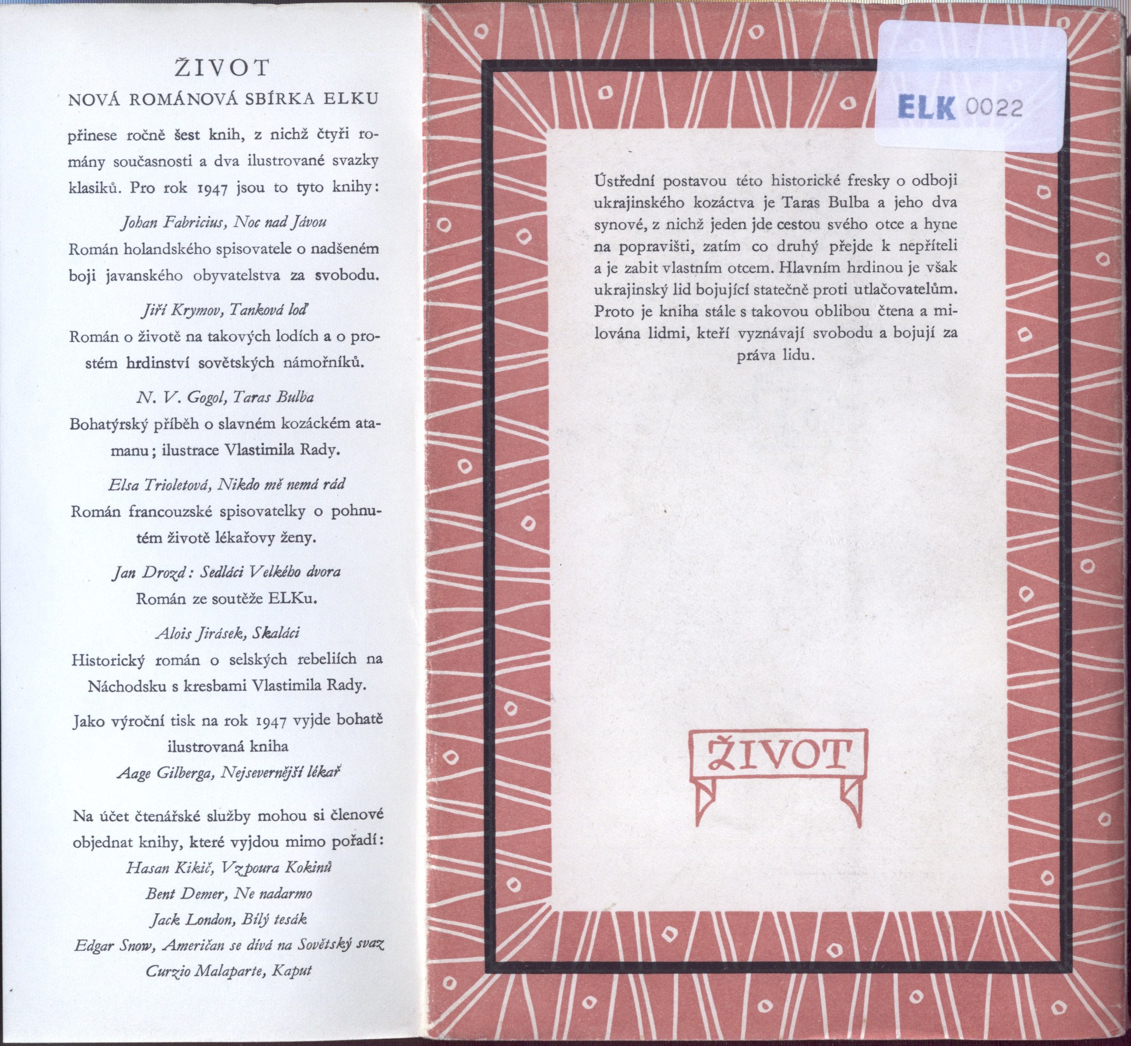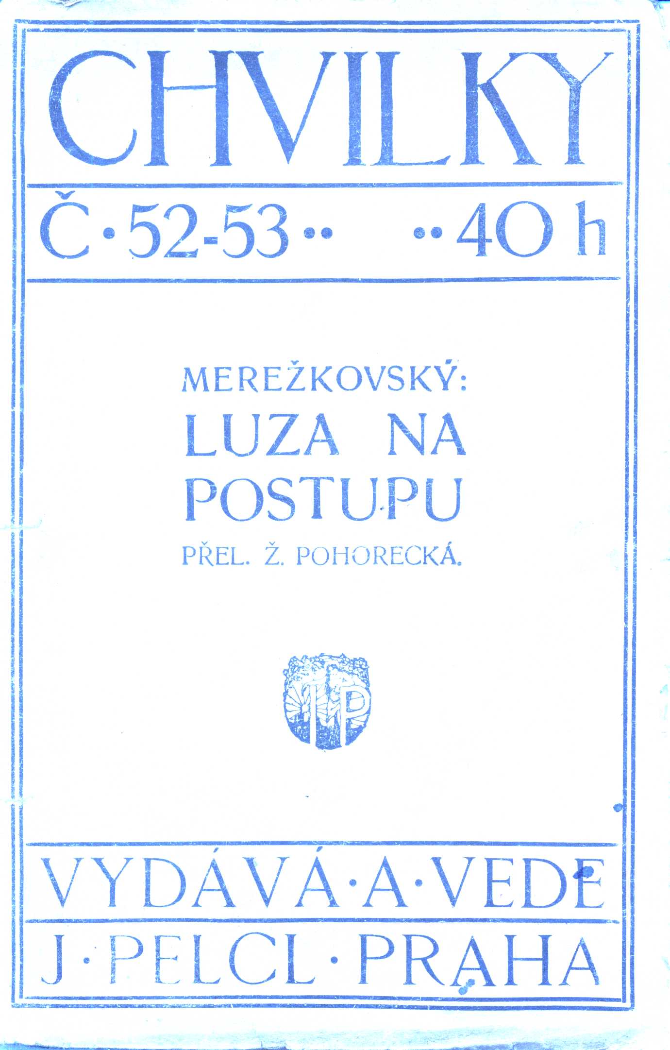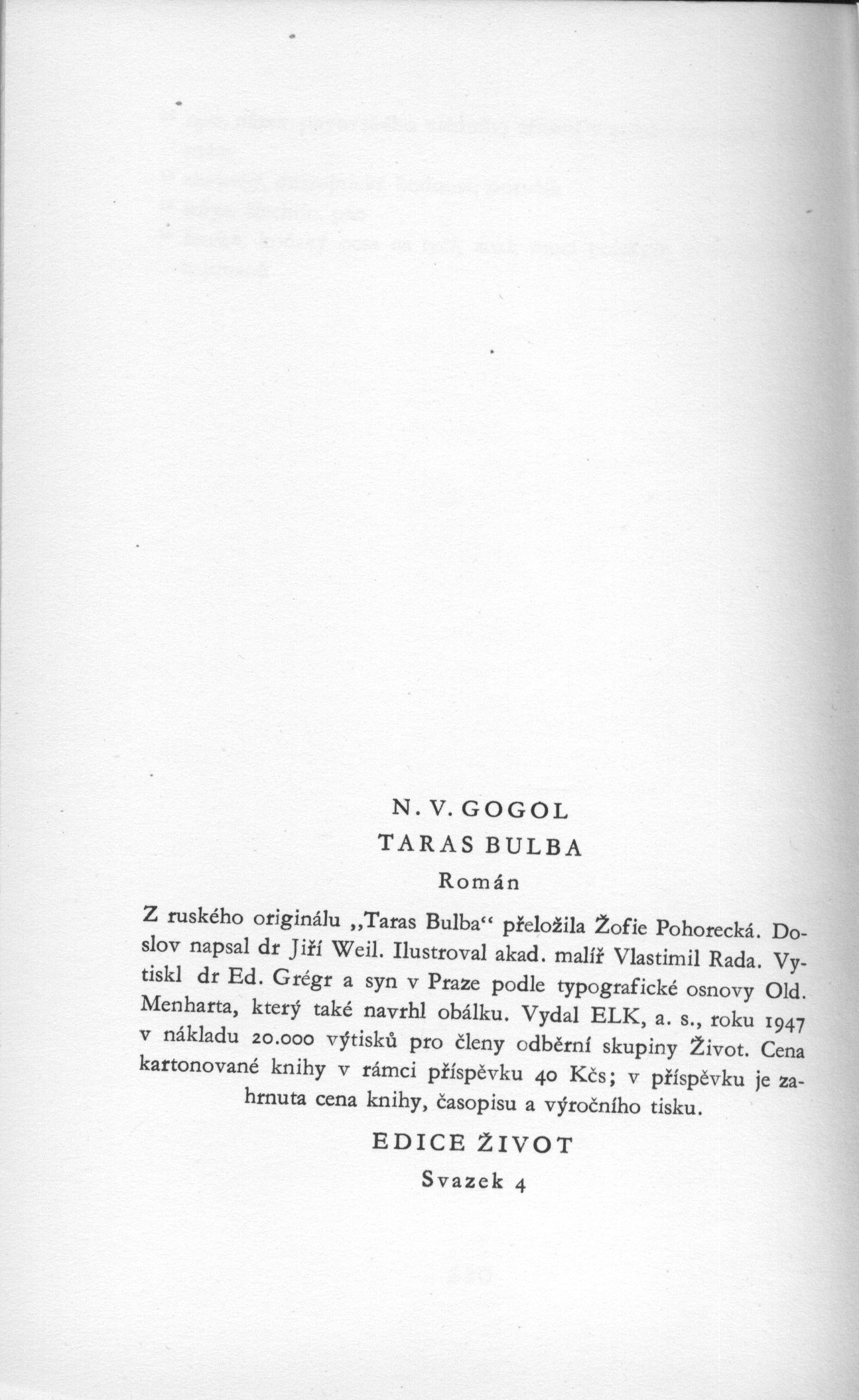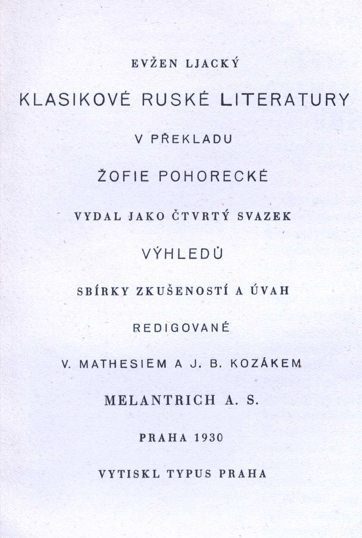 Názvové údaje Taras Bulba : [román] / Nikolaj Vasiljevič Gogol ; [z ruského originálu ... přeložila Žofie Pohorecká ; doslov napsal Jiří Weil ; ilustroval Vlastimil Rada ; podle typografické osnovy Old. Menharta, který také navrhl obálku] Osobní jméno Gogol‘, Nikolaj Vasil‘jevič, 1809-1852 (Autor) Další autoři Pohorecká, Žofie, 1877-1963 (Překladatel) Weil, Jiří, 1900-1959 (Autor doslovu, tiráže atd.) Rada, Vlastimil, 1895-1962 (Ilustrátor) Menhart, Oldřich, 1897-1962 (Typograf) (Autor obálky) Korp. Evropský literární klub (nakladatelství) (Nakladatel, vydavatel) Dr. Ed. Grégr a syn (nakladatelství, tiskárna) (Tiskař) Unifikovaný název Taras Bul'ba. Česky Nakladatel Praha : ELK, 1947 Výrobce (dr Ed. Grégr a syn) Rozsah 220 s. : il. ; 19 cm Osobní hesla Gogol‘, Nikolaj Vasil‘jevič, 1809-1852 - ruský prozaik, dramatik Klíčová slova ruská literatura * próza * povídka * překlad * historická freska * Ukrajinci * odboj * polská šlechta Počet ex. 2, z toho volných 2 Druh dok. monografie Signatura ELK 0022, VMartínek 0102 Názvové údaje Klasikové ruské literatury / Evžen Ljacký ; [v překladu Žofie Pohorecké] Osobní jméno Ljackij, Jevgenij Aleksandrovič, 1868-1942 (Autor) Další autoři Pohorecká, Žofie, 1877-1963 (Překladatel) Korp. Melantrich (nakladatelství) (Nakladatel, vydavatel) Nakladatel V Praze : Melantrich, 1930 Výrobce (Typus) Rozsah 271 s. ; 8° Klíčová slova ruská literatura * ruští spisovatelé * stol. 19. * biografie * literární studie * přehledy * dějiny literatury Počet ex. 2, z toho volných 2 Druh dok. monografie Signatura Holan 00420, MEL 2282 Názvové údaje Leonardo : Mona Lisa / z D.S. Merežkovského ; úvod J.P. ; autorisovaný překlad Žofie Pohorecké Osobní jméno Merežkovskij, Dmitrij Sergejevič, 1865-1941 (Autor) (Bibliografický předchůdce) Další autoři Pelcl, Josef, 1861-1916 (Autor úvodu atd.) Pohorecká, Žofie, 1877-1963 (Překladatel) Korp. Josef Pelcl (nakladatelství) (Nakladatel, vydavatel) Edvard Leschinger (firma) (Tiskař) Nakladatel V Praze : nákladem Josefa Pelcla, 1911 Výrobce Tiskem Edvarda Leschingra Rozsah 64 stran ; 18,5 cm Osobní hesla Leonardo, da Vinci, 1452-1519 - italský malíř, sochař, architekt a vědec Klíčová slova ruská literatura * biografické romány * výtvarní umělci * Itálie * stati * stol. 15.-16. Počet ex. 1, z toho volných 1 Druh dok. monografie Signatura VMartínek 1637 Názvové údaje Luza na postupu / D. S. Merežkovskij ; autorisovaný překlad Žofie Pohorecké Osobní jméno Merežkovskij, Dmitrij Sergejevič, 1865-1941 (Autor) Další autoři Pohorecká, Žofie, 1877-1963 (Překladatel) Korp. Josef Pelcl (nakladatelství) (Nakladatel, vydavatel) Nakladatel V Praze : Josef Pelcl, 1912 Rozsah 47 s. ; 18 cm Klíčová slova ruská literatura * Rusko * civilizace * společnost * stol. 20. * filozofické aspekty * filozofické úvahy Počet ex. 1, z toho volných 1 Druh dok. monografie Signatura Teige 061 Názvové údaje Monna innominata : sonetový věnec / Christina Rossetti ; z angličtiny přeložila Žofie Pohorecká ; úvodní glossu napsala Eva Jurčinová Osobní jméno Rossetti, Christina Georgina, 1830-1894 (Autor) Další autoři Pohorecká, Žofie, 1877-1963 (Překladatel) Jurčinová, Eva, 1886-1969 (Autor úvodu atd.) Nakladatel Královské Vinohrady : Ludvík Bradáč, 1925 Rozsah 26 s. ; 13 cm Klíčová slova česká literatura Počet ex. 1, z toho volných 1 Druh dok. monografie Signatura Holan 272 Názvové údaje Vzkříšení / L. N. Tolstoj ; přeložila Žofie Pohorecká Osobní jméno Tolstoj, Lev Nikolajevič, 1828-1910 (Autor) Další autoři Pohorecká, Žofie, 1877-1963 (Autor úvodu atd.) Rélink, Karel, 1880-1945 (Autor obálky) Korp. Jos. R. Vilímek (nakladatelství) (Nakladatel, vydavatel) (Tiskař) Nakladatel V Praze : Jos. R. Vilímek, 1924 Rozsah 596 s. Klíčová slova ruská literatura * ruská próza * ruský román Počet ex. 1, z toho volných 1 Druh dok. monografie Signatura VHB 1865