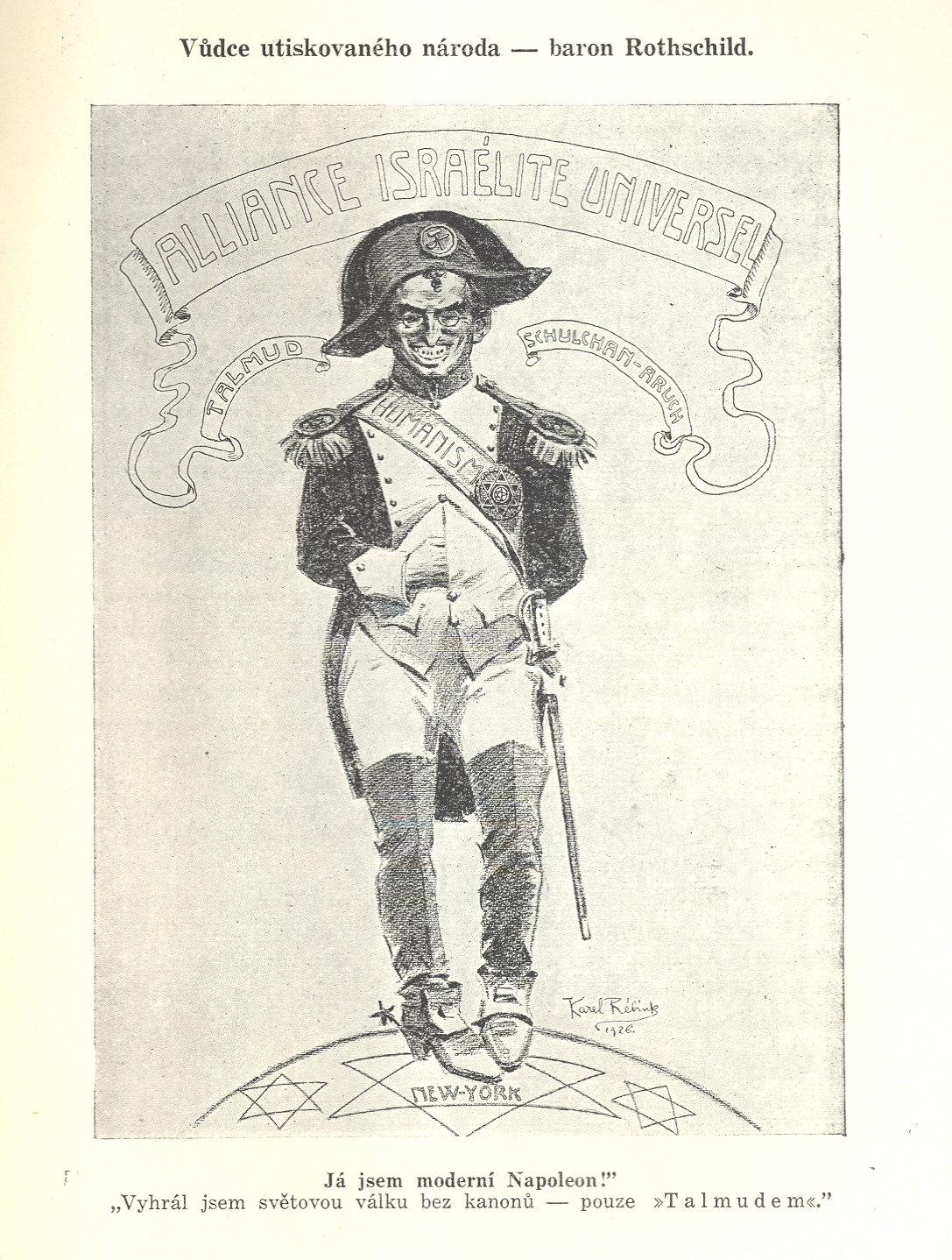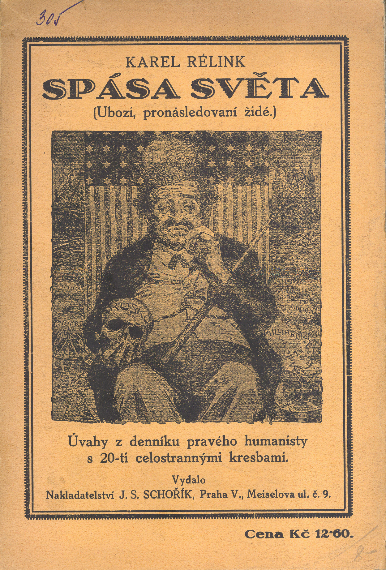 Názvové údaje Spása světa : ubozí, pronásledovaní židé : úvahy z denníku pravého humanisty / Karel Rélink Osobní jméno Rélink, Karel, 1880-1945 (Autor) (Grafický technik) Další autoři Schneider, Ernst (Autor úvodu atd.) Hušek, Jaromír Ivanovič, 1852- (Překladatel) Schořík, J.S. (Nakladatel, vydavatel) Korp. Nakladatelství J.S. Schořík (Praha) (Nakladatel, vydavatel) Studentská knihtiskárna (Tiskař) Nakladatel V Praze : vydalo Nakladatelství J.S. Schořík, Praha V., Maiselova ul. č. 9, 1926 Výrobce (tiskem Studentské knihtiskárny v Praze III., Pod Letnou 4 (bývalá Strakova akademie)) Rozsah 86, [2] s. : il. Klíčová slova česká literatura * výtvarné umění * české malířství * kresby * karikatury * antisemitismus * antisemitská ideologie * marxismus * socialismus * komunismus * svobodné zednářství * Židé * židovský bolševismus * židovské dějiny * židovská otázka * první republika * stol. 20., léta 20.-40. * r. 1926 Počet ex. 1, z toho volných 1 Druh dok. monografie Signatura Sáňka 2856