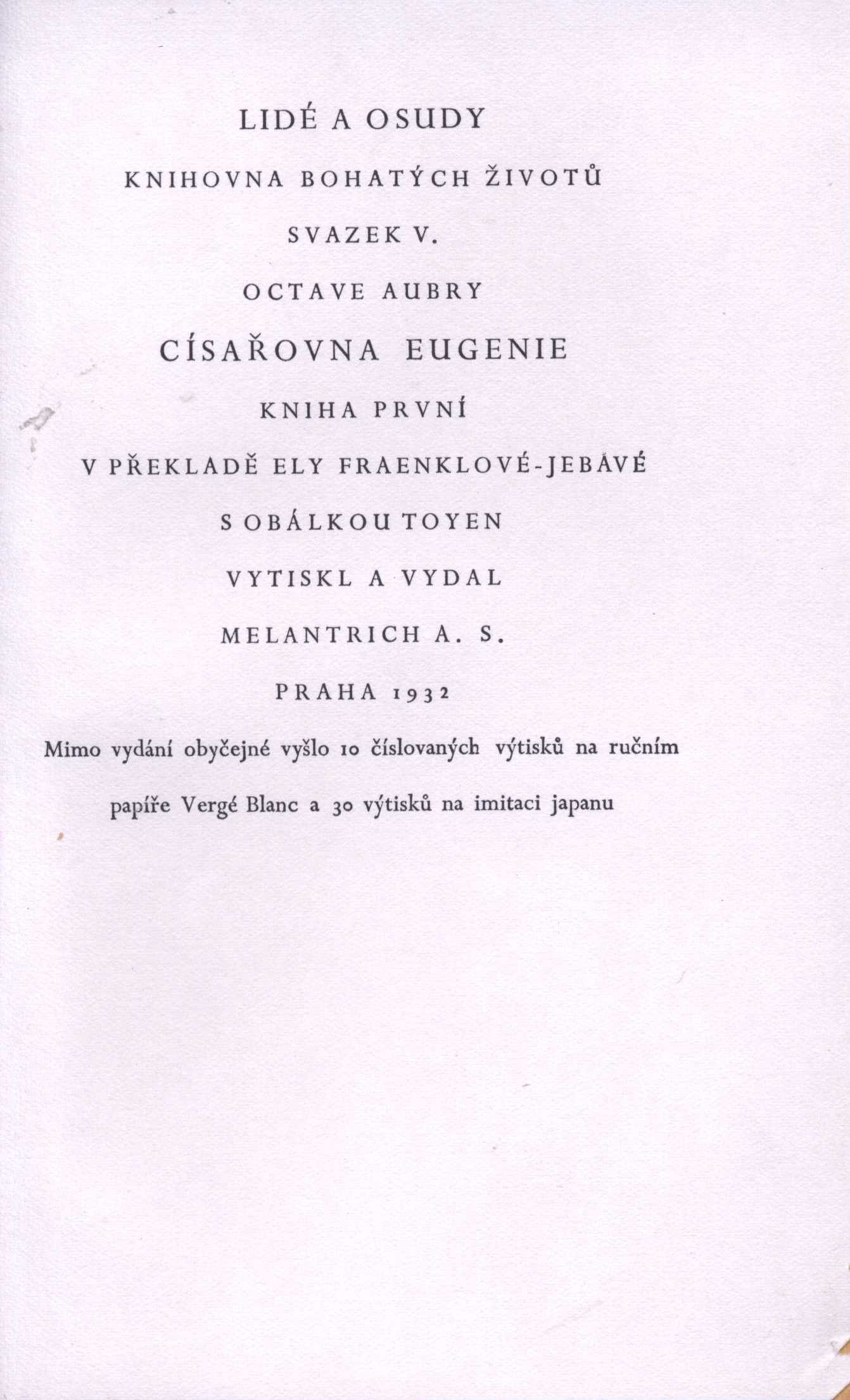 Názvové údaje Alkoholy : (výbor) / Guillaume Apollinaire ; překlad Zdeněk Kalista Osobní jméno Apollinaire, Guillaume, 1880-1918 (Autor) Další autoři Kalista, Zdeněk, 1900-1982 (Překladatel) (Dedikátor) (Autor podpisu) Toyen, 1902-1980 (Ilustrátor) Štyrský, Jindřich, 1899-1942 (Typograf) Holan, Vladimír, 1905-1980 (Dedikant) Hořejší, Jindřich, 1886-1941 (Dedikant) Korp. Al. Jirout a K. Teytz (Praha) (Nakladatel, vydavatel) Kryl a Scotti (firma) (Tiskař) (Tiskař obrazu) Nakladatel Praha : Al. Jirout a K. Teytz, 1933 Výrobce [Nový Jičín] : Kryl a Scotti Rozsah 47 stran : ilustrace ; 21 cm Klíčová slova francouzská literatura * poezie * Apollinaire G. * sbírka básní * český překlad * Kalista Z. * číslovaný výtisk * bibliofilie Počet ex. 3, z toho volných 3 Druh dok. monografie Signatura Holan 1463, P 97 B 37, AHO 0340 Názvové údaje Básně / Guillaume Apollinaire ; souborné vydání českých překladů Karla Čapka, Jindřicha Hořejšího, Zdeňka Kalisty a Jaroslava Seiferta Osobní jméno Apollinaire, Guillaume, 1880-1918 (Autor) Další autoři Čapek, Karel, 1890-1938 (Překladatel) Hořejší, Jindřich, 1886-1941 (Překladatel) (Dedikátor) (Autor podpisu) Kalista, Zdeněk, 1900-1982 (Překladatel) Seifert, Jaroslav, 1901-1986 (Překladatel) Teige, Karel, 1900-1951 (Autor úvodu atd.) Toyen, 1902-1980 (Knižní grafik) (Ilustrátor) (Autor podpisu) Hořejší, Růžena, 1899- (Dedikant) Korp. Ústřední dělnické nakladatelství a knihkupectví (Nakladatel, vydavatel) Svoboda (Kladno) (Tiskař) (Tiskař obrazu) Nakladatel V Praze : Ústřední dělnické knihkupectví a nakladatelství, 1935 Výrobce V Kladně : tiskárna "Svobody" Rozsah 4 nečíslované strany, 97 stran : ilustrace ; 21 cm Osobní hesla Apollinaire, Guillaume, 1880-1918 - francouzský básník Klíčová slova Čapek K. * francouzská literatura * poezie * Apollinaire G. * básně * české překlady * Hořejší J. * Kalista Z. * Seifert J. * frontispis * Toyen * r. 1935 Počet ex. 2, z toho volných 2 Druh dok. monografie Signatura VZinková 0425, AHO 0341 Názvové údaje Básně / Guillaume Apollinaire ; souborné vydání českých překladů Karla Čapka, Jindřicha Hořejšího, Zdeňka Kalisty a Jaroslava Seiferta ; s předmluvou Karla Teiga ; v grafické úpravě Toyen Osobní jméno Apollinaire, Guillaume, 1880-1918 (Autor) Další autoři Čapek, Karel, 1890-1938 (Překladatel) Hořejší, Jindřich, 1886-1941 (Překladatel) Kalista, Zdeněk, 1900-1982 (Překladatel) Seifert, Jaroslav, 1901-1986 (Překladatel) Teige, Karel, 1900-1951 (Autor úvodu atd.) Toyen, 1902-1980 (Grafický technik) Korp. Ústřední dělnické nakladatelství a knihkupectví (Nakladatel, vydavatel) Svoboda (Kladno) (Tiskař) Nakladatel V Praze : Ústřední dělnické knihkupectví a nakladatelství, 1935 Výrobce V Kladně : tiskárna "Svobody" Rozsah 97 stran ; 21 cm Klíčová slova francouzská literatura * překlad * poezie * básně Počet ex. 2, z toho volných 2 Druh dok. monografie Signatura Holan 45, P 126 C 21 Názvové údaje Basilejské zvony / Louis Aragon ; z francouzského originálu Les Gloches de bal ... přeložil Quido Palička ; obálku a titulní list navrhla Toyen Osobní jméno Aragon, Louis, 1897-1982 (Autor) Další autoři Palička, Quido, 1892-1962 (Překladatel) Toyen, 1902-1980 (Ilustrátor) (Autor obálky) Nakladatel Praha : Rudolf Schütz, 1947 Rozsah 367 stran ; 21 cm Klíčová slova francouzská próza * francouzský román Počet ex. 1, z toho volných 1 Druh dok. monografie Signatura P 143 b 24 Názvové údaje Basilejské zvony / Louis Aragon ; přeložil Quido Palička ; obálku, titulní kresbu a rytinu na vazbu provedla akad. malířka Toyen v úpravě grafika Aloise Chvály Osobní jméno Aragon, Louis, 1897-1982 (Autor) Další autoři Palička, Quido, 1892-1962 (Překladatel) Toyen, 1902-1980 (Ilustrátor) Chvála, Alois, 1885-1973 (Knižní grafik) Korp. V. Čejka (Praha) (Nakladatel, vydavatel) Stiebling a Havelka (tiskárna) (Tiskař) Nakladatel [Praha] : V. Čejka, 1935 Výrobce Stiebling a Havelka Rozsah 367 stran Klíčová slova francouzská próza * francouzský román Počet ex. 2, z toho volných 2 Druh dok. monografie Signatura Nezval 551, Václavek 2477 Názvové údaje Život kajícnic / Pietro Aretino ; [přeložil V. Mrázek ; s ilustracemi T.] Osobní jméno Aretino, Pietro, 1492-1556 (Autor) Další autoři Toyen, 1902-1980 (Ilustrátor) Nakladatel [Praha : J. Štyrský, 1932] Rozsah 79, [1] s. : il. ; 13,8 cm Klíčová slova italská literatura * erotická literatura * erotické příběhy * stol. 16. * bibliofilie * r. 1932 Počet ex. 1, z toho volných 1 Adr. el. zdr. nakladatelské údaje Druh dok. monografie Signatura LP A 0044 Názvové údaje Císařovna Eugenie. kniha druhá / Octave Aubry ; [v překladě Ely Fraenklové-Jebavé ; s obálkou Toyen] Osobní jméno Aubry, Octave, 1881-1946 (Autor) Další autoři Fraenkelová-Jebavá, Ela (Překladatel) Toyen, 1902-1980 (Autor obálky) Korp. Melantrich (nakladatelství) (Nakladatel, vydavatel) Nakladatel Praha : Melantrich, 1932 Rozsah 170 s., [3] s. obr. příl. ; 8° Osobní hesla Eugénia María, francouzská císařovna, 1826-1920 Klíčová slova francouzská literatura * francouzská próza * francouzský román * životopisný román Počet ex. 1, z toho volných 1 Druh dok. monografie Signatura MEL 2210 Názvové údaje Císařovna Eugenie. kniha první / Octave Aubry ; [v překladě Ely Fraenklové-Jebavé ; s obálkou Toyen] Osobní jméno Aubry, Octave, 1881-1946 (Autor) Další autoři Fraenkelová-Jebavá, Ela (Překladatel) Toyen, 1902-1980 (Autor obálky) Korp. Melantrich (nakladatelství) (Nakladatel, vydavatel) Nakladatel Praha : Melantrich, 1932 Rozsah 236 s., [5] s. obr. příl. ; 8° Osobní hesla Eugénia María, francouzská císařovna, 1826-1920 Klíčová slova francouzská literatura * francouzská próza * francouzský román * životo