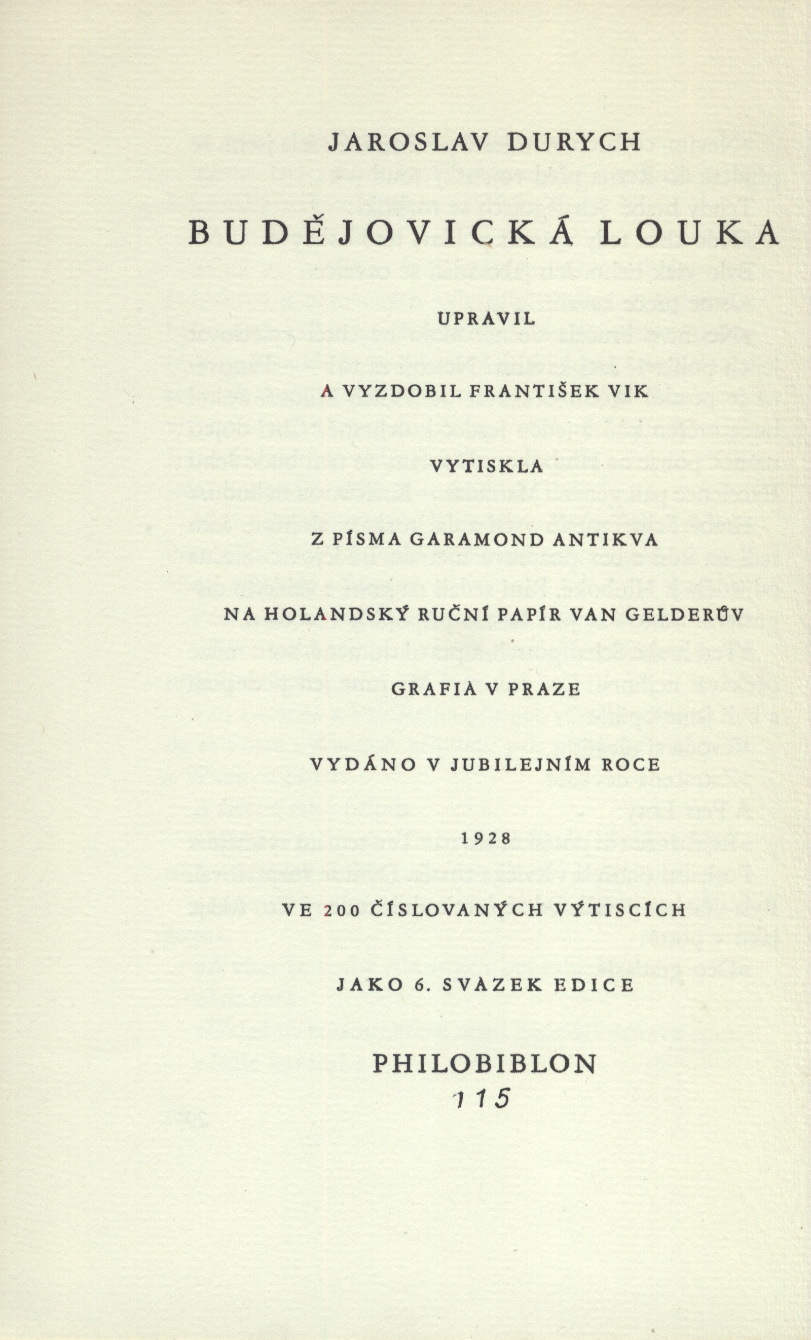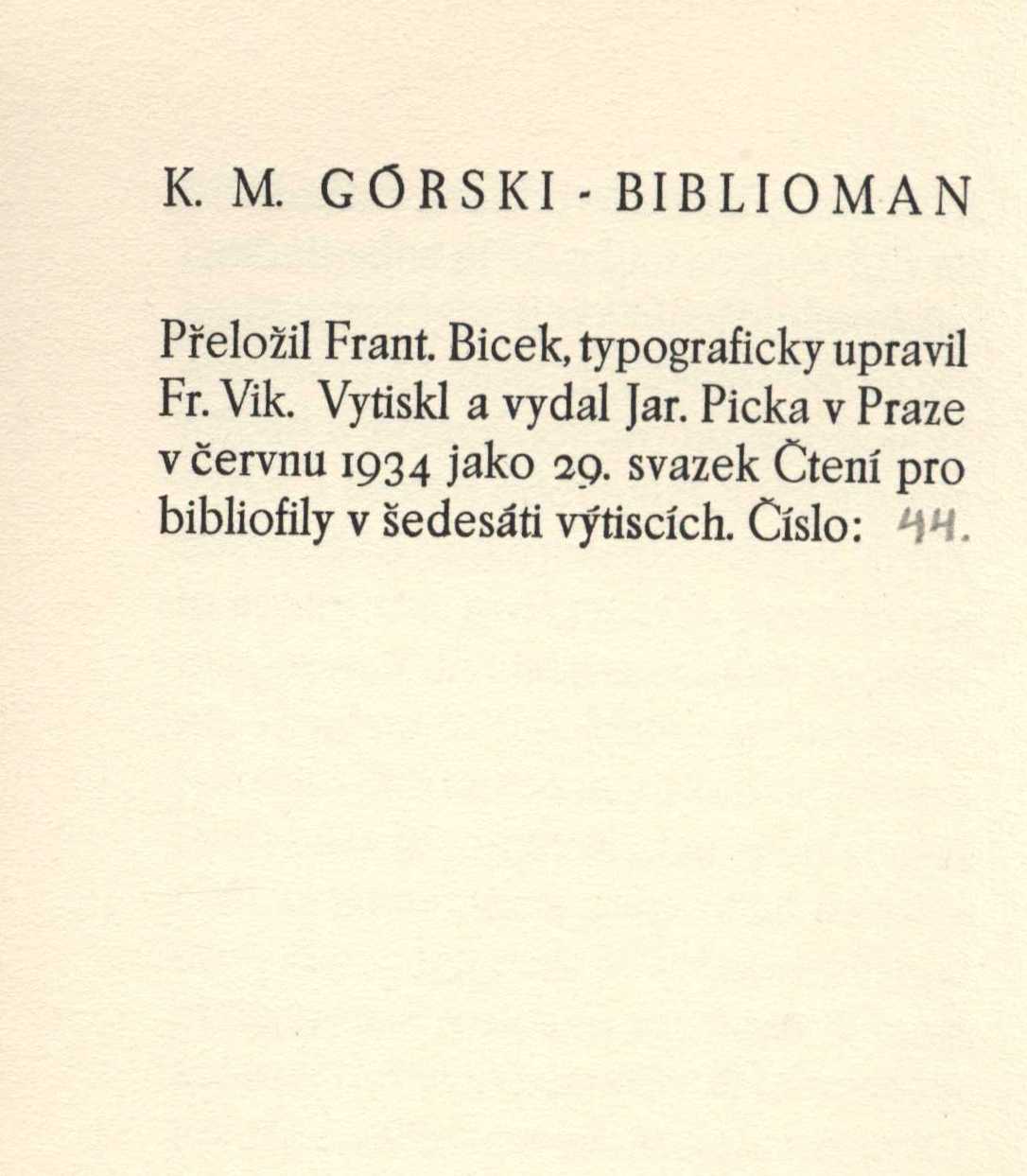 Názvové údaje Kašpar Noci / Aloysius Bertrand ; [přeložil Josef Heyduk ; frontispice od Fr. Vika ; typograficky upravil Ant. Lískovec] Osobní jméno Bertrand, Aloysius, 1807-1841 (Autor) Další autoři Heyduk, Josef, 1904-1994 (Překladatel) Vik, František, 1895-1957 (Ilustrátor) Lískovec, Antonín, 1894-1949 (Grafický technik) Korp. Jan V. Pojer (Brno) (Nakladatel, vydavatel) Kryl a Scotti (firma) (Tiskař) Nakladatel [Brno : Jan V. Pojer], 1935 Výrobce Kryl a Scotti) Rozsah 183 s. Klíčová slova francouzská próza * povídky Počet ex. 2, z toho volných 2 Druh dok. monografie Signatura C12a 260, VMartínek 1098 Názvové údaje Zjevení přesvaté Panny na hoře La Saletské 19. září L. P. 1846 dle sepsání Melanie Kalvatové, pasačky La Saletské / [z francouzštiny přeložil Josef Florian ; frontispis, vignetu v titulu a vazbu navrhl Frant. Vik ; typograficky upravil Antonín Lískovec] Osobní jméno Calvat, Mélanie, 1831-1904 (Autor) Další autoři Florian, Josef, 1873-1941 (Překladatel) Vik, František, 1895-1957 (Ilustrátor) Lískovec, Antonín, 1894-1949 (Grafický technik) Vokolek, Vlastimil, 1903-1985 (Dřívější majitel) Nakladatel Praha : Lad. Kuncíř, 1921 Výrobce (Grafia) Rozsah 32 s. : il. Osobní hesla Marie, Panna * Calvat, Mélanie, 1831-1904 - pasačka Klíčová slova mariánská zjevení * Saletta (Francie) * r. 1846 * vzpomínky Počet ex. 2, z toho volných 2 Druh dok. monografie Signatura Holan 395, C12c 1914 Názvové údaje List o bibliofilech / Georges Duhamel ; [z francouzštiny přeložil Jiří Kryšpín ; dřevoryty vyzdobil František Vik] Osobní jméno Duhamel, Georges, 1884-1966 (Autor) Další autoři Picka, Jaroslav, 1897-1957 (Nakladatel, vydavatel) Vik, František, 1895-1957 (Ilustrátor) Nakladatel Praha : Jaroslav Picka, 1930 Rozsah 51, 1 s. : il. ; 8° Klíčová slova francouzská literatura * francouzská próza * bibliofilie Počet ex. 1, z toho volných 1 Druh dok. monografie Signatura P 97 g 27 Názvové údaje Budějovická louka / Jaroslav Durych ; [upravil a vyzdobil František Vik] Osobní jméno Durych, Jaroslav, 1886-1962 (Autor) Další autoři Vik, František, 1895-1957 (Knižní grafik) (Ilustrátor) Korp. Ladislav Kuncíř (nakladatelství a knihkupectví) (Nakladatel, vydavatel) Grafia (tiskárna, nakladatelství) (Tiskař) Nakladatel [Praha : L. Kuncíř], 1928 Výrobce (Grafia) Rozsah 29 s. : il. ; 23 cm Klíčová slova česká literatura * próza * novela * ilustrace * číslovaný výtisk * bibliofilský tisk Počet ex. 1, z toho volných 1 Druh dok. monografie Signatura Topič 0677 Názvové údaje Budějovická louka / Jaroslav Durych ; [upravil a vyzdobil František Vik] Osobní jméno Durych, Jaroslav, 1886-1962 (Autor) Další autoři Vik, František, 1895-1957 (Ilustrátor) (Knižní grafik) Korp. Grafia (tiskárna, nakladatelství) (Tiskař) Philobiblon (Praha, Česko) (Nakladatel, vydavatel) Nakladatel [S. l.] : Philobiblon, 1928 Výrobce Grafia) Rozsah 29 s. : il. Klíčová slova česká literatura * česká próza * bibliofilie * bibliofilské tisky * bibliofilský tisk Počet ex. 1, z toho volných 1 Druh dok. monografie Signatura KaG XVI B2 295 Názvové údaje Vévodkyně / Kasimir Edschmid ; přeložil Miloš Matula ; [upravil a vyzdobil F. Vik] Osobní jméno Edschmid, Kasimir, 1890-1966 (Autor) Další autoři Matula, Miloš, 1906-1979 (Překladatel) Vik, František, 1895-1957 (Knižní grafik) (Ilustrátor) Martínek, Vojtěch, 1887-1960 (Nakladatel, vydavatel) Korp. Jan V. Pojer (Brno) (Nakladatel, vydavatel) Vokolek, Václav (tiskárna : Pardubice) (Tiskař) Nakladatel Brno : Jan V. Pojer, 1931 Výrobce V. Vokolek) Rozsah 65 s. : il. ; 17 cm Osobní hesla Villon, François, asi 1429-asi 1463 - franc. básník Klíčová slova německá próza * novela * francouzští básníci * biografický příběh * stol. 15. * fiktivní příběhy * středověk * Francie * stol. 15. * bibliofilie Počet ex. 3, z toho volných 3 Druh dok. monografie Signatura Holan 589, VMartínek 1128, C12a 319 Názvové údaje Peřeje / Otokar Fischer ; [upravil a vyzdobil František Vik] Osobní jméno Fischer, Otokar, 1883-1938 (Autor) (Autor podpisu) (Dedikátor) Další autoři Vik, František, 1895-1957 (Knižní grafik) Martínek, Vojtěch, 1887-1960 (Dedikant) Korp. Jan V. Pojer (Brno) (Nakladatel, vydavatel) Kryl a Scotti (firma) (Tiskař) Nakladatel Brno : Jan V. Pojer, 1931 Výrobce Kryl a Scotti) Rozsah 74 s. : il Klíčová slova česká poezie * sbírka veršů * stol. 20., léta 30. Počet ex. 2, z toho volných 2 Druh dok. monografie Signatura C12b 418, VMartínek 0098 Názvové údaje Požadavek dne / Otokar Fischer ; [úpravu navrhl a vyzdobil František Vik] Osobní jméno Fischer, Otokar, 1883-1938 (Autor) (Autor podpisu) Další autoři Vik, František, 1895-1957 (Ilustrátor) (Knižní grafik) Píša, Miloslav, 1901-1979 (Nakladatel, vydavatel) Korp. Kryl a Scotti (firma) (Tiskař) Nakladatel V Brně : Miloslav Píša, 1932 Výrobce Kryl a Scotti) Rozsah 12 s. ; 8° Klíčová slova společenská situace * kulturní dění * stol. 20., léta 30. * časopisecký článek Počet ex. 1, z toho volných 1 Druh dok. monografie Signatura VMartínek 0677 Názvové údaje Biblioman / K.M. Górski ; přeložil František Bicek ; [typografický upravil Fr. Vik] Osobní jméno Górski, Konstanty Maria, 1862-1909 (Autor) Další autoři Bicek, František, 1891-1938 (Překladatel) Vik, František, 1895-1957 (Typograf) Picka, Jaroslav, 1897-1957 (Nakladatel, vydavatel) (Tiskař) Nakladatel Praha - Královské Vinohrady : Vytiskl a vydal Jar. Picka, 1934 Rozsah 64 s. Klíčová slova polská literatura * novela * bibliofilie Počet ex. 1, z toho volných 0 Druh dok. monografie Signatura VMartínek 1334 Názvové údaje Veliký karbunkul / Nathaniel Hawthorne ; přeložil Jaroslav Skalický ; [obrázky kreslil František Vik ; podle osnovy Ant. Lískovce vytiskla ...] Osobní jméno Hawthorne, N