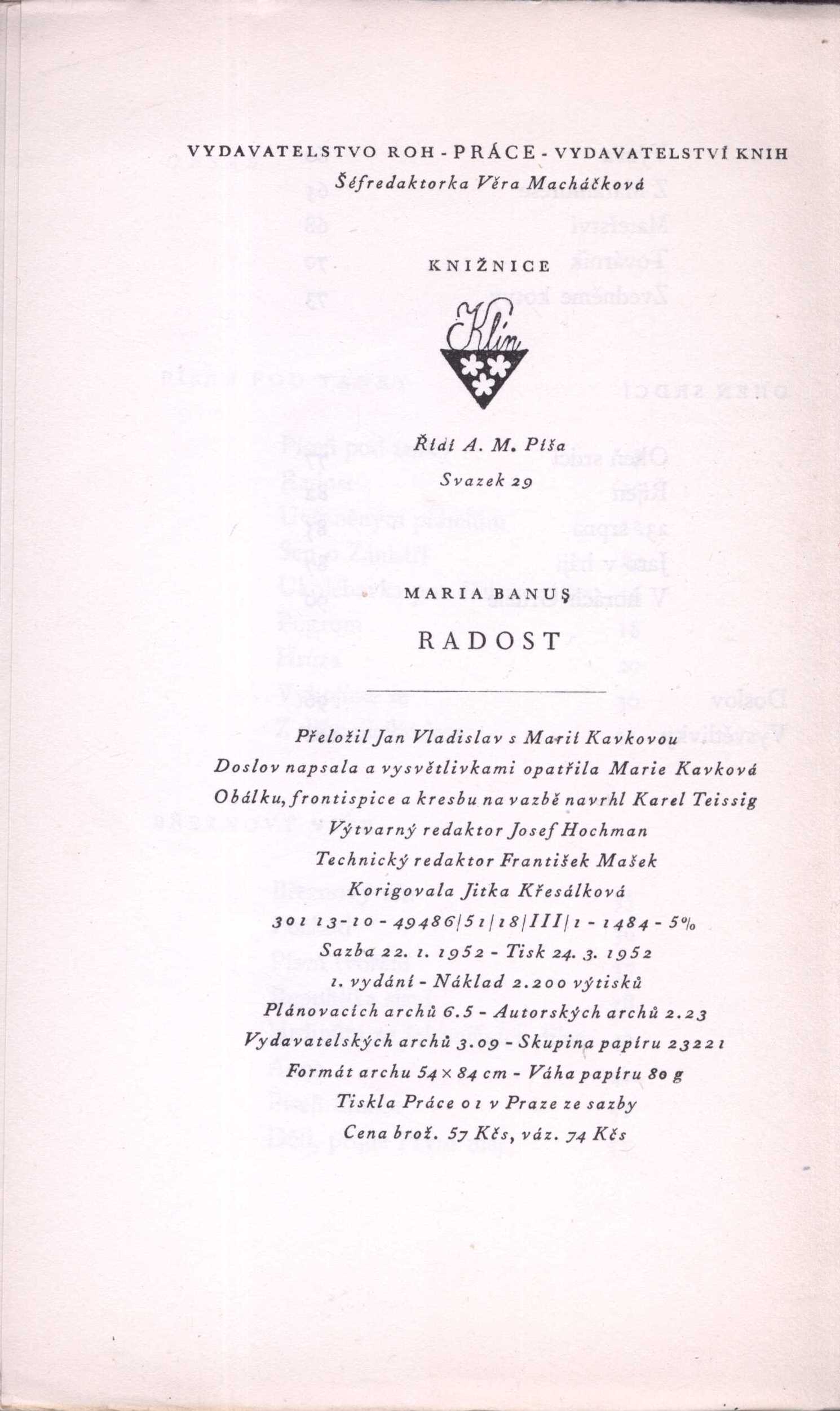 Názvové údaje Florentské malířství a jeho společenské pozadí : měšťanská republika, než převzal moc Cosimi de' Medici : XIV. století a počátek století XV. / Frederick Antal ; z anglického originálu přeložil Jan Vladislav ; doslov k dílu napsal Jaromír Neumann ; grafickou úpravu, obálku a vazbu navrhl Zdeněk Rossmann Osobní jméno Antal, Frederick, 1887-1954 (Autor) Další autoři Vladislav, Jan, 1923-2009 (Překladatel) Neumann, Jaromír, 1924-2001 (Autor doslovu, tiráže atd.) Rossmann, Zdeněk, 1905-1984 (Grafický technik) (Autor obálky) Korp. Státní nakladatelství krásné literatury, hudby a umění (Nakladatel, vydavatel) Orbis (tiskárna) (Tiskař) Nakladatel Praha : Státní nakladatelství krásné literatury, hudby a umění, 1954 Rozsah 305 stran, 166 nečíslovaných obrazových příloh Klíčová slova anglická literatura * dějiny umění * renesance * společenské poměry * Itálie * italské malířství * Florencie * studie Počet ex. 3, z toho volných 3 Druh dok. monografie Signatura MUK 1704, JVladislav 039, K Q I 51 Názvové údaje O novém umění / Guillaume Apollinaire ; z francouzských originálů Chroniques d'Art, Méditations esthétiques, Les peintres cubistes, Anecdotiques a Ilya vybral Vladimír Diviš, výbor doplnila, přeložila, chronologický přehled sestavila a obrazovou část připravila Jitka Hamzová Osobní jméno Apollinaire, Guillaume, 1880-1918 (Autor) Další autoři Hamzová, Jitka, 1929-2017 (Jiná role) (Dedikátor) Diviš, Vladimír (Sestavovatel, kompilátor) Vladislav, Jan, 1923-2009 (Dedikant) Korp. Odeon (nakladatelství) (Nakladatel, vydavatel) Středočeské tiskárny, n. p. (Praha) (Tiskař) Nakladatel Praha : Odeon, 1974 Výrobce ST 2 Rozsah 327 stran : 26 ilustrací ; 4 strany barevných příloh, 99 nečíslovaných stran fotografických příloh Klíčová slova výtvarné umění * Paříž * stol. 20., 1. pol. * umělecká kritika * kritické texty Počet ex. 2, z toho volných 2 Druh dok. monografie Signatura M 98 d 1, JVladislav 2346 Názvové údaje Pásmo / Guillaume Apollinaire ; přeložil Petr Kopta ; kresby Vlasty Dyrynkové Osobní jméno Apollinaire, Guillaume, 1880-1918 (Autor) Další autoři Kopta, Petr, 1927-1983 (Překladatel) (Autor podpisu) (Dedikátor) Dyrynková, Vlasta, 1944- (Ilustrátor) (Autor podpisu) Dyrynk, Martin, 1941-2019 (Nakladatel, vydavatel) (Autor podpisu) Černý, Václav, 1905-1987 (Autor doslovu, tiráže atd.) (Autor podpisu) Vladislav, Jan, 1923-2009 (Dedikant) Nakladatel Praha : vlastním nákladem vydal Martin Dyrynk, 1978 Rozsah 21 stran : ilustrace ; 20 cm Klíčová slova francouzská poezie * asociace * avantgarda * moderní poezie * stol. 19., léta 80.-stol. 20., léta 10. * bibliofilie * bibliofilská vydání * soukromé tisky * novoroční tisk Počet ex. 3, z toho volných 3 Druh dok. monografie Signatura M 156 b 13, M 174 f 81, JVladislav 2205 Názvové údaje Modrý pták / Marie d' Aulnoy ; vypravuje Jan Vladislav ; ilustroval Mirko Hanák ; graficky upravil Václav Bláha Osobní jméno Aulnoy, Marie-Catherine Le Jumel de Barneville, baronka, ca 1650-1705 (Autor) Další autoři Vladislav, Jan, 1923-2009 (Autor adaptace, upravovatel) Hanák, Mirko, 1921-1971 (Ilustrátor) Bláha, Václav, 1922-2021 (Knižní grafik) Korp. Artia (nakladatelství) (Nakladatel, vydavatel) Polygrafia (tiskárna, Praha) (Tiskař) Nakladatel V Praze : Artia, 1971 Výrobce Polygrafia Rozsah 54 stran : ilustrace Klíčová slova francouzská literatura * francouzská próza * pohádky * převyprávění * literatura pro děti a mládež Počet ex. 2, z toho volných 2 Druh dok. monografie Signatura JVladislav 029, ZB 4 a 14 Názvové údaje Cesty vzhůru / Milan Balabán, Kateřina Dejmalová ; obálku navrhl Zdeněk Ziegler Osobní jméno Balabán, Milan, 1929-2019 (Autor) Další autoři Dejmalová, Kateřina, 1949- (Autor) Ziegler, Zdeněk, 1932-2023 (Grafický technik) Turek, Petr, 1963- (Dedikátor) Vladislav, Jan, 1923-2009 (Dedikant) Korp. OIKOYMENH (nakladatelství) (Nakladatel, vydavatel) Nakladatel Praha : Oikoymenh, 1997 Rozsah 87 stran ; 20 cm Klíčová slova jazykové rozbory * Bible * Starý zákon * překlady * hebrejština * čeština Počet ex. 2, z toho volných 2 Druh dok. monografie Signatura C12b 1702, JVladislav 611 Názvové údaje Radost : verše / Maria Banuş ; [z rumunského originálu ... přeložil Jan Vladislav s Marií Kavkovou ; doslov napsala a vysvětlivkami opatřila Marie Kavková ; obálku, frontispice a kresbu na vazbě navrhl Karel Teissig] Osobní jméno Banuş, Maria, 1914-1999 (Autor) Další autoři Vladislav, Jan, 1923-2009 (Překladatel) Kavková, Marie, 1921-2000 (Překladatel) (Autor doslovu, tiráže atd.) (Autor komentáře textu) Teissig, Karel, 1925-2000 (Ilustrátor) (Autor obálky) Korp. Práce (nakladatelství, tiskárna) (Nakladatel, vydavatel) Nakladatel Praha : Práce, 1952 Výrobce Práce) Rozsah 101 s. : il. Osobní hesla Banuş, Maria, 1914-1999 - rumunská básnířka a překladatelka Klíčová slova rumunská literatura * verše * sbírka básní Počet ex. 1, z toho volných 1 Druh dok. monografie Signatura JVladislav 109 Názvové údaje Úvahy o některých současnících / Charles Baudelaire ; z francouzského originálu ... k vydání připravil Jan Vladislav ; přeložila J. Fialová a další ; předmluvu, komentář a rejstřík vypracoval Jan Vladislav ; obrazovou přílohu vybral a doslov napsal Jiří Padrta ; obálku, vazbu a grafickou úpravu navrhl Jan Kotík Osobní jméno Baudelaire, Charles, 1821-1867 (Autor) Další autoři Vladislav, Jan, 1923-2009 (Sestavovatel, kompilátor) Fialová, Jarmila, 1925-2016 (Překladatel) Padrta, Jiří, 1929-1978 (Ilustrátor) Kotík, Jan, 1916-2002 (Grafický technik) Nakladatel Praha : Odeon, 1968 Rozsah 663 s., 64 s. obr. příl. ; 21 cm Klíčová slova česká literatura Počet ex. 1, z toho volných 1 Druh dok. monografie Signatura Hola