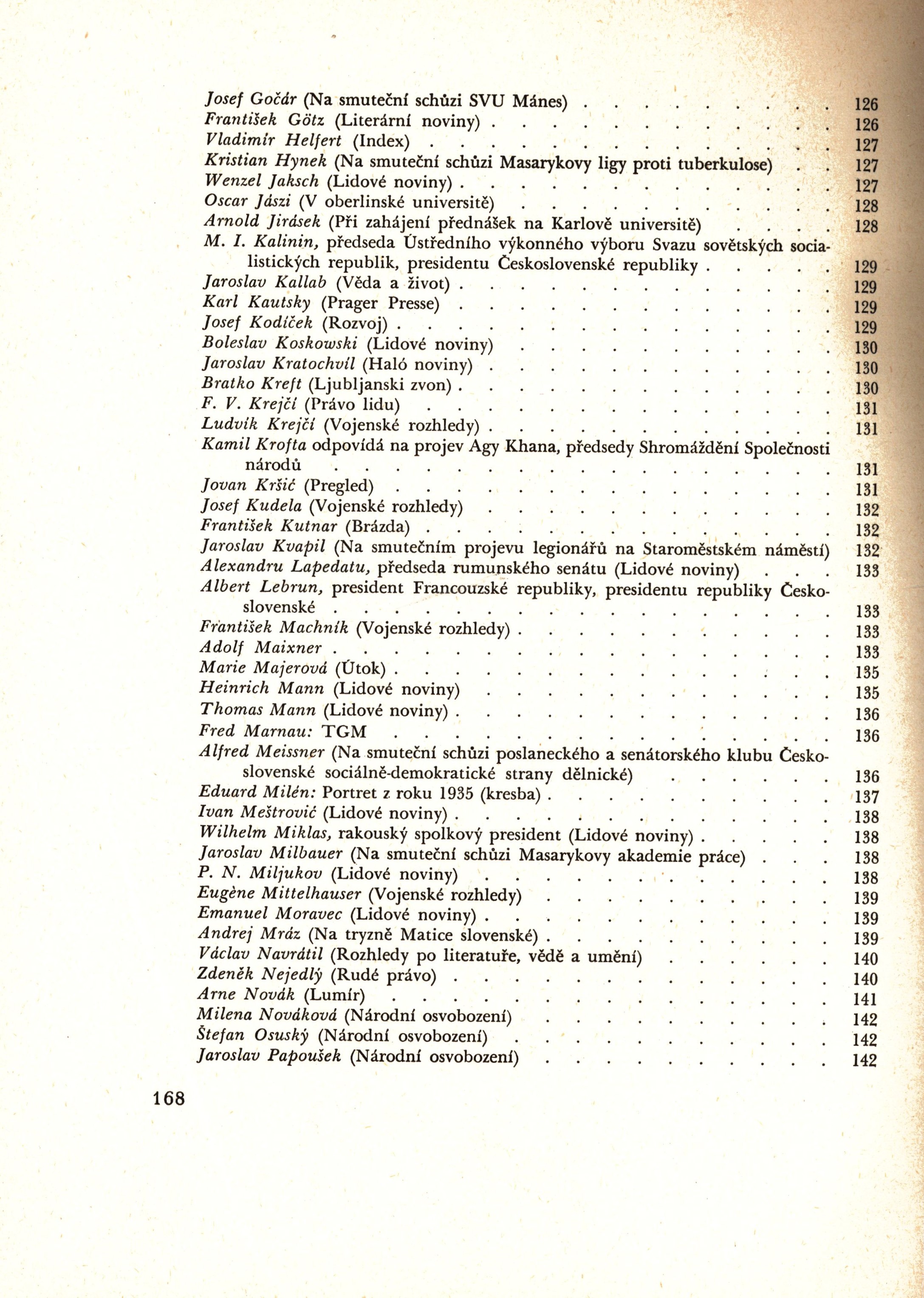 Názvové údaje Za literaturu životní pravdy : [referát na] 2. sjezdu čs. spisovatelů - duben 1956 / Jan Drda Osobní jméno Drda, Jan, 1915-1970 (Autor) Další autoři Svaz československých spisovatelů (Nakladatel, vydavatel) Nakladatel Praha : Svaz čs. spisovatelů, 1956 Výrobce (Práce) Rozsah 47 s. ; 8° Klíčová slova československá literatura * úkoly * r. 1956 * referáty Počet ex. 3, z toho volných 3 Druh dok. monografie Signatura M 76 b 406, M 74 h 311, P 89 b 74 Názvové údaje Vůz s plachtou : lyrika / Karel Erban Osobní jméno Erban, Karel, 1901-1982 (Autor) Nakladatel Ve Zvolenu : vydal autor, 1930 Výrobce Slovenská kníhtlačiareň Rozsah 22 stran, nečíslováno ; 16 cm Klíčová slova československá literatura * československá poezie * lyrika * vlast * dekadence * stol. 20., léta 20.-30. Počet ex. 1, z toho volných 1 Druh dok. monografie Signatura Z A 5 B 81 Názvové údaje Rozbor českoslovanské literatury a životopisy českoslovanských výtečníkův. Seš. 1 / sepsal Rupert M. Přecechtěl Osobní jméno Přecechtěl, Josef Rupert Maria, 1821-1897 (Autor) (Nakladatel, vydavatel) Nakladatel V Pešti : Rupert M. Přecechtěl, 1870 Výrobce (Minerva) Rozsah 27, 1, 49, 1 s. : 1 příl. ; 8° Klíčová slova česká literatura * československá literatura * rozbory * životopisy * biografie * osobnosti Počet ex. 1, z toho volných 1 Druh dok. monografie Signatura L XXI c 20 Názvové údaje Návrh stanoviska ÚV SČSS k některým otázkám československé literatury : IV. sjezd, Praha, červen 1967 Záhlaví-korpor. Svaz československých spisovatelů (Nakladatel, vydavatel) Další autoři Dilia, divadelní a literární agentura (Tiskař) Korp. Sjezd Svazu československých spisovatelů (4. : 1967 : Praha, Česko) Nakladatel Praha : Svaz československých spisovatelů, 1967 Rozsah 10 stran ; 21 cm Heslo korporace (zkrác. heslo korp.) : Svaz československých spisovatelů * Svaz československých spisovatelů. Sjezd (4. : 1967 : Praha, Česko) Klíčová slova čeští spisovatelé * sjezdy * československá literatura * socialistická literatura * otázky literatury * stanovy * r. 1967 Počet ex. 2, z toho volných 2 Druh dok. monografie Signatura AČS 06311, C12b 19386 Názvové údaje Bibliografický soupis knih vydaných v roce 1967 / [graficky upravil Václav Konečný] Další autoři Konečný, Václav, 1947- (Knižní grafik) Nakladatel Praha : Československý spisovatel, [1967] Rozsah 39 s. Klíčová slova bibliografie * výběrová bibliografie * československá literatura * próza * poezie * literární ročenky * sborník Počet ex. 1, z toho volných 1 Druh dok. monografie Signatura C12b 9165 Názvové údaje Bibliografický soupis knih vydaných v roce 1968 / Graficky upr. Václav Konečný Další autoři Konečný, Václav, 1947- (Grafický technik) Nakladatel Praha : Československý spisovatel, [1968] Rozsah 36 s., obr Klíčová slova bibliografie * výběrová bibliografie * československá literatura * próza * poezie * literární ročenky * sborník Počet ex. 1, z toho volných 1 Druh dok. monografie Signatura PS Názvové údaje Bibliografický soupis knih vydaných v roce 1969 / [graficky upravil Václav Konečný] Další autoři Konečný, Václav, 1947- (Grafický technik) Nakladatel Praha : Československý spisovatel, [1969] Rozsah 34 s., obr Klíčová slova bibliografie * výběrová bibliografie * československá literatura * próza * poezie * literární ročenky * sborník Počet ex. 2, z toho volných 2 Druh dok. monografie Signatura PS, C12b 9164 Názvové údaje Dni žalu : památník o sklonku života, o nemoci, smrti a pohřbu presidenta Osvoboditele T.G. Masaryka / redakční kruh K. Č., Josef Kopta (hlavní redaktor), Vasil Kaprálek Škrach Osobní jméno Kopta, Josef, 1894-1962 (Editor) Další autoři Přikryl, Bohumil, 1893-1965 (Sestavovatel, kompilátor) (Editor) Škrach, Vasil Kaprálek, 1891-1943 (Editor) Čapek, Karel, 1890-1938 (Autor obálky) Svolinský, Karel, 1896-1986 (Výtvarník vazby) (Knižní grafik) Korp. Orbis (firma) (Nakladatel, vydavatel) Čin - tiskové a nakladatelské družstvo československých legionářů (Nakladatel, vydavatel) Orbis (tiskárna) (Tiskař) V. Neubert a synové (firma) (Tiskař) Nakladatel V Praze : Čin ; Orbis, 1937 Výrobce V Praze : Orbis ; V. Neubert a synové Rozsah 169 stran, [80] stran obrazové přílohy : černobílé fotografie, ilustrace, portréty ; 28 cm Osobní hesla Masaryk, Tomáš Garrigue, 1850-1937 - politik, první čsl. president, filosof Klíčová slova československá literatura * československá politika * Československá republika * prezident * prezident Československa * Masaryk T. G. * úmrtí * sborník Počet ex. 2, z toho volných 2 Druh dok. monografie Signatura M 25 a 8, AHO 0739 Názvové údaje Dr Edvard Beneš : spoluzakladatel nové svobody a tvůrce zahraniční politiky československé : sborník statí / vydal Čin Záhlaví-korpor. Čin - tiskové a nakladatelské družstvo československých legionářů (Nakladatel, vydavatel) Další autoři Werstadt, Jaroslav, 1888-1970 (Autor úvodu atd.) Kunte, Ladislav, 1874-1945 (Přispěvatel) Kallab, Jaroslav, 1879-1942 (Přispěvatel) Sychrava, Lev, 1887-1958 (Přispěvatel) Hrušovský, Igor, 1907-1978 (Přispěvatel) Krčmář, Jan, 1877-1950 (Přispěvatel) Macek, Josef, 1887-1972 (Přispěvatel) Procházka, Rudolf, 1889-1945 (Přispěvatel) Eisenmann, Louis, 1869-1937 (Přispěvatel) Junius, 1867-1937 (Přispěvatel) Borgese, Giuseppe Antonio, 1882-1952 (Přispěvatel) Vochoč, Vladimír, 1894-1985 (Přispěvatel) Sarolea, Charles, 1870-1953 (Přispěvatel) Korp. Politika (tiskárna, nakladatelství) (Tiskař) Nakladatel V Praze : Čin, 1924 Výrobce V Praze : tiskem Politiky Rozsah 283 stran, 9 nečíslovaných listů obrazových příloh : reprodukce, fotografie ; 25 cm Osobní hesla Beneš, Edvard, 1884-1948 - československý prezident