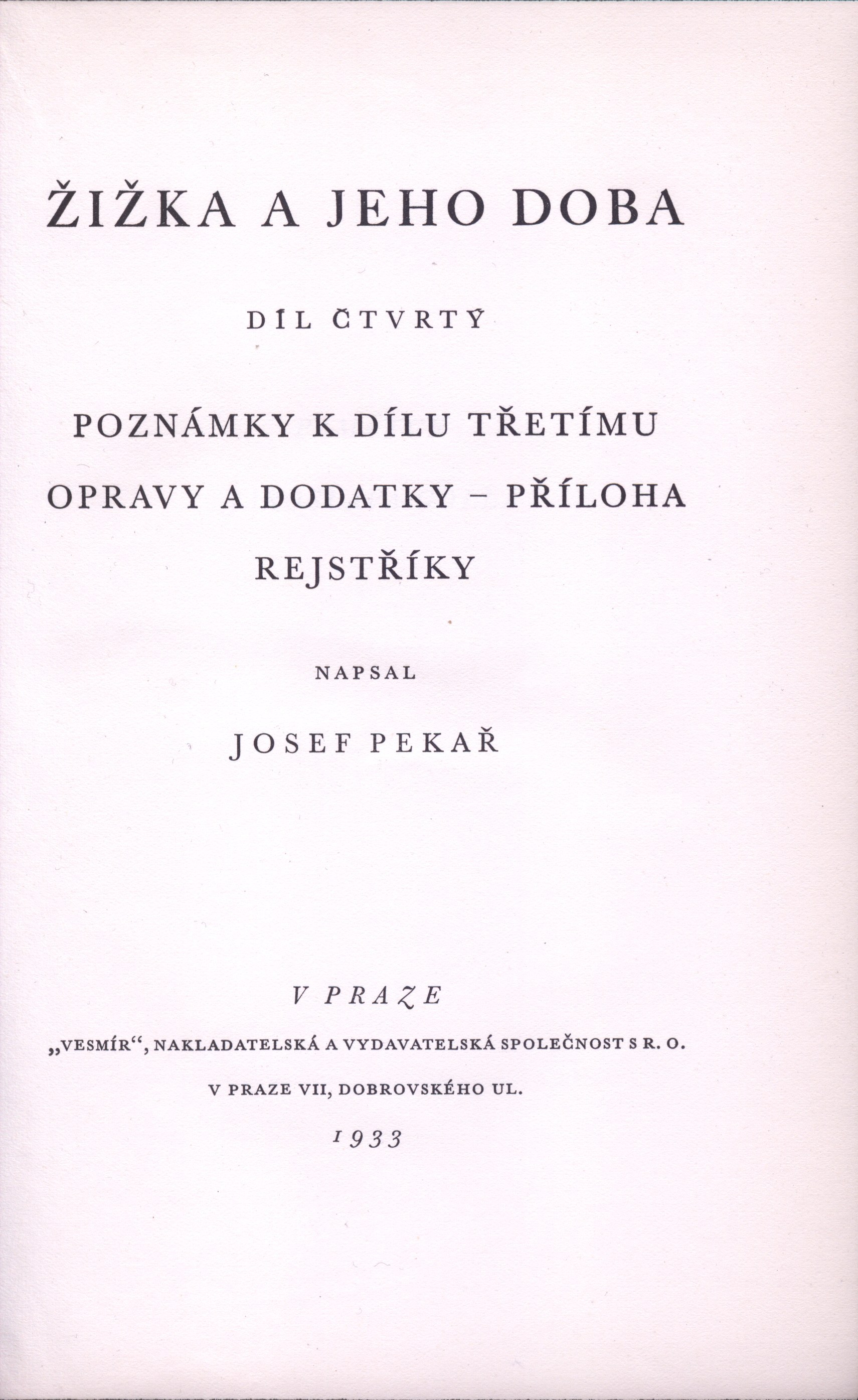10. Názvové údajeŽižka a jeho doba. Díl čtvrtý, Poznámky k dílu třetímu, opravy a dodatky - příloha, rejstříky / napsal Josef Pekař