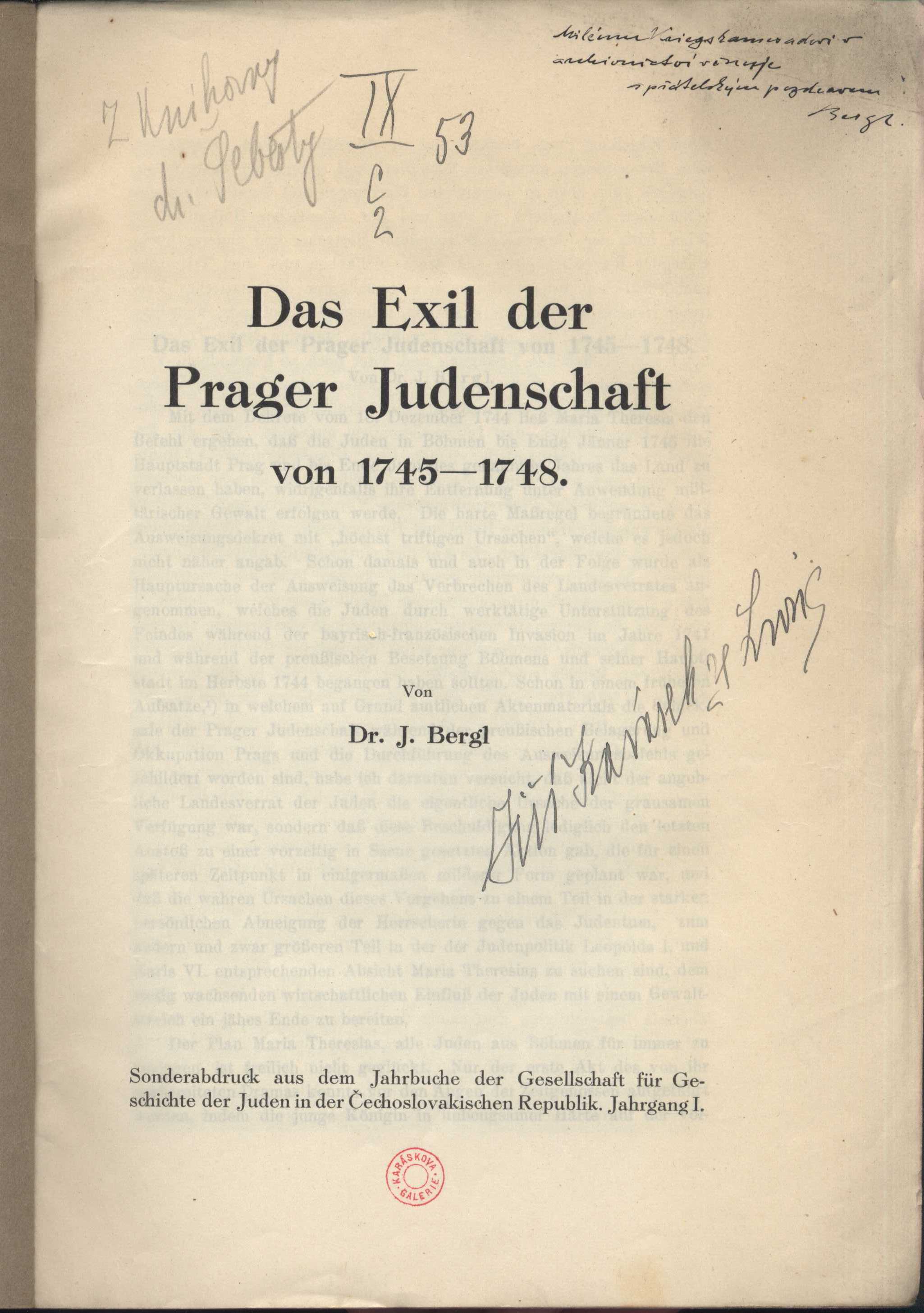 Názvové údaje Das Exil der Prager Judenschaft von 1745-1748 / von J. Bergl Osobní jméno Bergl, Josef, 1874-1952 (Dedikátor) (Autor) Další autoři Šebesta, Eduard, 1879-1933 (Dřívější majitel) (Dedikant) Karásek ze Lvovic, Jiří, 1871-1951 (Autor podpisu) Nakladatel [S. l. : s. n., 19--] Rozsah 71 s. Klíčová slova česká literatura * Židé * Praha * pragensia * osudy Židů * židovská historie * židovské dějiny * židovské ghetto * židovské město pražské Počet ex. 1, z toho volných 1 Druh dok. monografie Signatura KaG IX C2 53 Názvové údaje Der Prager Golem : von seiner "Geburt" bis zu seinem "Tod" / Chajim Bloch ; mit einem Geleitwort von Hans Ludwig Held Osobní jméno Bloch, Chajim, 1881-1973 (Autor) Další autoři Held, Hans Ludwig, 1885-1954 (Autor úvodu atd.) Karásek ze Lvovic, Jiří, 1871-1951 (Autor podpisu) Korp. G. Kreysing (Leipzig) (Tiskař) Verlag von Benjamin Harz (Berlin, Německo) (Nakladatel, vydavatel) Samuel Wolf Pascheles (nakladatelství) (Knihkupec) Nakladatel Berlin : Verlag von Benjamin Harz, 1920 Výrobce G. Kreysing) Rozsah 231, [1] s. ; 18,5 x 13 cm ; 8° Klíčová slova židovská literatura * Židé * židovská čtvrť * židovská historie * židovská kultura * židovská mystika * židovská tematika * židovská teologie * židovské ghetto * židovské město pražské * židovské náboženství * židovští myslitelé * golem * rabi Löw * úvahy * rozbory * stol. 20., léta 20. * r. 1920 Počet ex. 1, z toho volných 1 Druh dok. monografie Signatura KaG XI C2 24 Názvové údaje Jews, God and History / Max I. Dimont Osobní jméno Dimont, Max I., 1912-1992 (Autor) Nakladatel New York : New American Library, 1964 Rozsah 472 s. Klíčová slova americká literatura * Židé * židovská historie * sionismus * náboženství * populární výklady Počet ex. 1, z toho volných 1 Druh dok. monografie Signatura M 208 d 20 Názvové údaje Jews, God and History / Max I. Dimont Osobní jméno Dimont, Max I., 1912-1992 (Autor) Nakladatel New York : New American Library, 1962 Rozsah xi, 472 s. Klíčová slova americká literatura * Židé * židovská historie * sionismus * náboženství * populární výklady Počet ex. 1, z toho volných 1 Druh dok. monografie Signatura BVolkova 0078 Názvové údaje The Jewish Problem : with 33 illustrations / by Louis Golding Osobní jméno Golding, Louis, 1895-1958 (Autor) Další autoři Penguin Books (firma) Hazell, Watson & Viney, Ltd. (London and Aylesbury, Velká Británie) (Tiskař) Nakladatel Harmondsworth : Penguin Books Limited, 1939 Výrobce Hazell, Watson & Viney, Ltd.) Rozsah 213, [11] s., [4] listy obr. příl. : il. Klíčová slova britská literatura * studie * historie Židů * perzekuce Židů * postavení Židů * Židé * židovská historie * židovská kultura * židovská literatura * židovská otázka * židovská problematika * židovská tematika * židovská tradice * židovské děti * židovské tradice * židovství * židovští myslitelé * antifašistická literatura * stol. 20., léta 30. * r. 1939 Počet ex. 1, z toho volných 1 Druh dok. monografie Signatura KaG XLVII D2 11 Názvové údaje Vom jüdischen Geist : ein Wort an die Ehrlichen unter seinen Anklägern / I. Heinemann Osobní jméno Heinemann, Isaak, 1876-1957 (Autor) Další autoři Philo-Verlag (Nakladatel, vydavatel) Gehring & Reimers (tiskárna) (Tiskař) Nakladatel Berlin : Philo Verlag, [19--] Výrobce Berlin : Gehring & Reimers, [19--] Rozsah 35 stran Klíčová slova německá literatura * historie Židů * Židé * židovská historie * židovská literatura * židovská problematika * židovská tematika Počet ex. 1, z toho volných 1 Druh dok. monografie Signatura KaG III D2 11 Názvové údaje Das Gespenst des Golem : eine Studie aus der hebräischen Mystik mit einem Exkurs über Das Wesen des Doppelgängers / von Hans Ludwig Held Osobní jméno Held, Hans Ludwig, 1885-1954 (Autor) Další autoři Karásek ze Lvovic, Jiří, 1871-1951 (Autor podpisu) Korp. Allgemeine Verlagsanstalt (München) (Nakladatel, vydavatel) Universitätbuchdruckerei C. Wolf & Sohn (München, Německo) (Tiskař) Nakladatel München : Allgemeine Verlagsanstalt, 1927 Výrobce (Universitätbuchdruckerei C. Wolf & Sohn) Rozsah 282, [2] s., [2] listy obr. přílohy : il. ; 19 x 13,5 cm ; 8° Klíčová slova Židé * židovství * židovská literatura * židovské dějiny * německá literatura * mystika * kabala * kabalisté * golem * pražské ghetto * rabi Löw * historie Židů * židovská historie * židovská kultura * židovská mystika * židovská tematika * židovské ghetto * židovské náboženství * židovské památky * židovské pověsti * judaismus * stol. 20., léta 20. * r. 1927 Počet ex. 1, z toho volných 1 Druh dok. monografie Signatura KaG XI C2 25 Názvové údaje Krátká hystorye o wálce židowské : z knih Jozefa Flawia wytažená léta 1595 / od Mikulásse Stypacya Strakowského Autor Josephus Flavius, 37-asi 100 (Bibliografický předchůdce) Další autoři Stipacius ze Strakova, Mikuláš, -1602 (Autor) Kramerius, Václav Matěj, 1753-1808 (Nakladatel, vydavatel) Nakladatel Praha : Nynj poznowu wydaná Kraméryusowau pracý a nákladem, 1806 Rozsah 16, 284, 2 s. ; 8° Klíčová slova česká literatura * dějiny * historie * války * Židé * židovská historie * židovské dějiny Počet ex. 1, z toho volných 1 Druh dok. monografie Signatura L VII b 54 Názvové údaje Krátká Hystorye o wálce židowské : z knih Jozefa Flawia wytažená léta 1595 / od Mikulásse Stypacya Strakowského Autor Josephus Flavius, 37-asi 100 (Autor) Další autoři Stipacius ze Strakova, Mikuláš, -1602 (Sestavovatel, kompilátor) Kramerius, Václav Matěj, 1753-1808 (Nakladatel, vydavatel) Nakladatel Praha : Kraméryus, 1806 Rozsah 284 s. ; 8° Klíčová slova dějiny * historie * války * Židé * židovská historie Počet ex. 1, z toho volných 1 Druh dok. monografie Signa