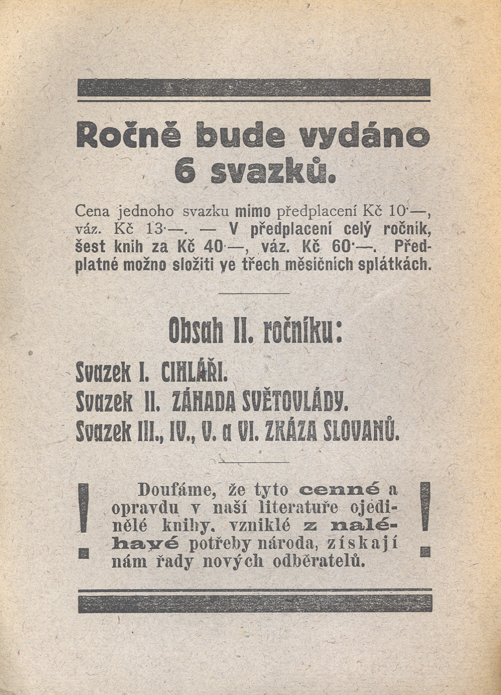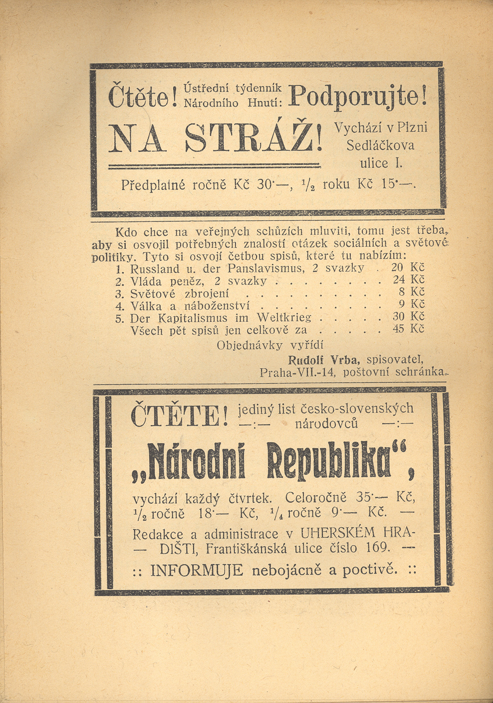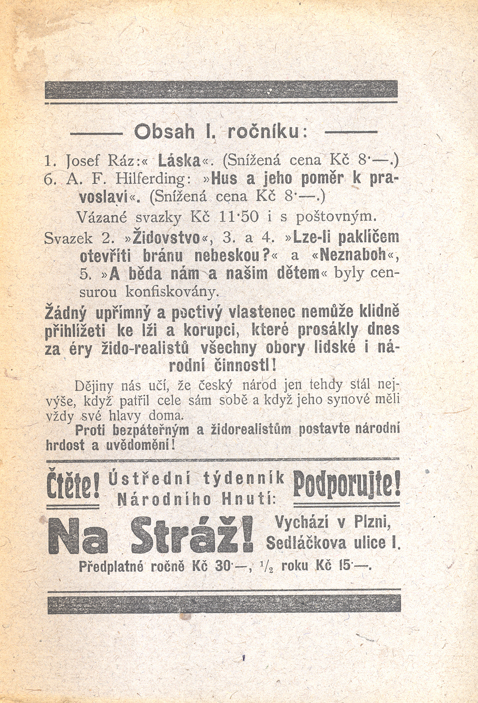 Názvové údaje Spása světa : ubozí, pronásledovaní židé : úvahy z denníku pravého humanisty / Karel Rélink Osobní jméno Rélink, Karel, 1880-1945 (Autor) (Grafický technik) Další autoři Schneider, Ernst (Autor úvodu atd.) Hušek, Jaromír Ivanovič, 1852- (Překladatel) Schořík, J.S. (Nakladatel, vydavatel) Korp. Nakladatelství J.S. Schořík (Praha) (Nakladatel, vydavatel) Studentská knihtiskárna (Tiskař) Nakladatel V Praze : vydalo Nakladatelství J.S. Schořík, Praha V., Maiselova ul. č. 9, 1926 Výrobce (tiskem Studentské knihtiskárny v Praze III., Pod Letnou 4 (bývalá Strakova akademie)) Rozsah 86, [2] s. : il. Klíčová slova česká literatura * výtvarné umění * české malířství * kresby * karikatury * antisemitismus * antisemitská ideologie * marxismus * socialismus * komunismus * svobodné zednářství * Židé * židovský bolševismus * židovské dějiny * židovská otázka * první republika * stol. 20., léta 20.-40. * r. 1926 Počet ex. 1, z toho volných 1 Druh dok. monografie Signatura Sáňka 2856 Názvové údaje Vývin židomarxisty : s 20ti celostrannými i menšími ilustracemi a textem / Karel Rélink Osobní jméno Rélink, Karel, 1880-1945 (Autor) (Grafický technik) (Nakladatel, vydavatel) Další autoři Chudomel, František (Tiskař) Nakladatel Praha : nákladem vlastním, 1938 Výrobce ([tiskl Fr. Chudomel]) Rozsah 86, [2] s. : il. Klíčová slova česká literatura * výtvarné umění * české malířství * kresby * karikatury * antisemitismus * antisemitská ideologie * marxismus * socialismus * komunismus * Židé * židovský bolševismus * židovské dějiny * židovská otázka * stol. 20., léta 20.-40. * r. 1938 Počet ex. 1, z toho volných 1 Druh dok. monografie Signatura Rp 00565 Názvové údaje Zkáza Slovanů ze světové války : denník poválečný. díl I. / Rudolf Vrba Osobní jméno Vrba, Rudolf, 1860-1939 (Autor) (Nakladatel, vydavatel) Další autoři Družstvotisk (Třeboň) (Tiskař) Nakladatel [České Budějovice] ; [Třeboň] : nákladem autorovým: Č. Budějovice 744, únor 1924 Výrobce (tiskem knihtiskárny "Družstvotisk" v Třeboni) Rozsah [2], 263, [5] s. Klíčová slova katolická církev * katolická literatura * politika * dějiny * antisemitismus * antisemitská ideologie * dějiny Slovanů * dějiny Ruska * 1. světová válka * Židé * Rusové * židovské dějiny * židovská otázka * bolševismus * židovský bolševismus * ruská revoluce * teror * koncentrační tábory * první republika * stol. 20., léta 10.-20. * r. 1924 Počet ex. 1, z toho volných 1 Druh dok. monografie Signatura Sáňka 2660 Názvové údaje Zkáza Slovanů ze světové války : denník poválečný. díl II. / Rudolf Vrba Osobní jméno Vrba, Rudolf, 1860-1939 (Autor) (Nakladatel, vydavatel) Další autoři Družstvotisk (Třeboň) (Tiskař) Nakladatel [České Budějovice] ; [Třeboň] : nákladem autorovým: Č. Budějovice 744, únor 1924 Výrobce (tiskem knihtiskárny "Družstvotisk" v Třeboni) Rozsah 240 s. - def. neúpl. Klíčová slova katolická církev * katolická literatura * politika * dějiny * antisemitismus * antisemitská ideologie * dějiny Slovanů * dějiny Ruska * 1. světová válka * Rusové * Židé * židovské dějiny * židovská otázka * bolševismus * židovský bolševismus * ruská revoluce * teror * koncentrační tábory * první republika * stol. 20., léta 10.-20. * r. 1924 Počet ex. 1, z toho volných 1 Druh dok. monografie Signatura M 39 f 36