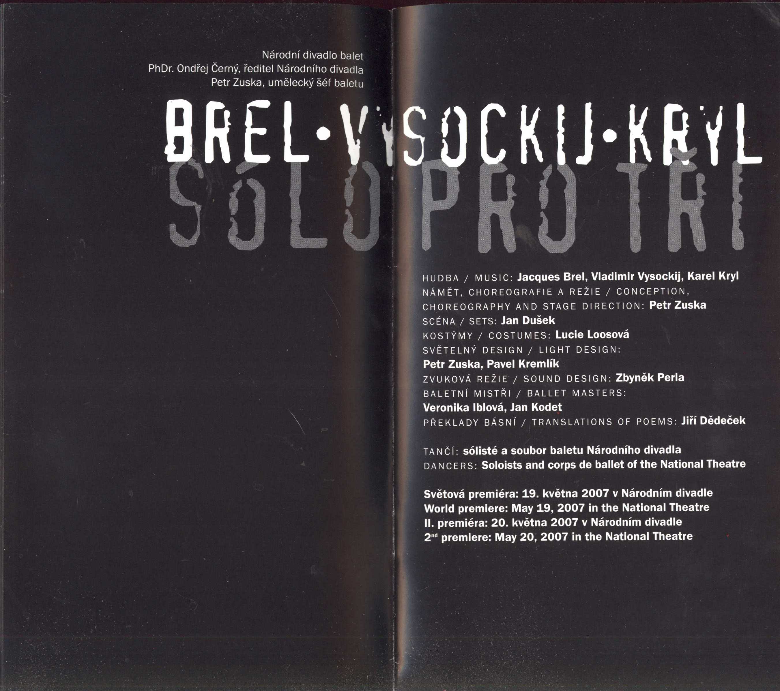 Názvové údaje Brel - Vysockij - Kryl ; Sólo pro tři : světová premiéra 19. května 2007 v Národním divadle, II. premiéra 20. května 2007 v Národním divadle / [autoři textů Jiří Dědeček, Petr Zuska, Kateřina Hanáčková] ; hudba Jacques Brel, Vladimir Vysockij, Karel Kryl Další autoři Dědeček, Jiří, 1953- (Autor) Zuska, Petr, 1968- (Autor) Hanáčková, Kateřina (Autor) Korp. Národní divadlo v Praze. Balet (Nakladatel, vydavatel) Nakladatel Praha : Národní divadlo, 2007 Rozsah 35 s. : il. Osobní hesla Brel, Jacques, 1929-1978 - belgický skladatel, textař, zpěvák, šansoniér, básník, herec a režisér * Vysockij, Vladimir, 1938-1980 - básník a šansoniér * Kryl, Karel, 1944-1994 - zpěvák, textař písní, básník, výtvarník * Zuska, Petr, 1968- - tanečník a choreograf Klíčová slova české divadlo * balet * divadelní program Počet ex. 1, z toho volných 1 Druh dok. monografie Signatura BVolkova 0238 Názvové údaje Jacques Brel : vivre debout / Jacques Vassal Osobní jméno Vassal, Jacques, 1947- (Autor) Další autoři Brel, Jacques, 1929-1978 (Umělec) Korp. Hors collection (nakladatelství) (Nakladatel, vydavatel) Imprimerie stéréotype de Mame (tiskárna, Francie) (Tiskař) (Tiskař obrazu) Nakladatel [Paris?] : Hors Collection, [2003] Výrobce Tours : MAME Imprimeurs Copyright ©2003 Rozsah 196 stran : ilustrace, fotografie, portréty ; 23 cm Osobní hesla Brel, Jacques, 1929-1978 - belgický skladatel, textař, zpěvák, šansoniér, básník, herec a režisér Klíčová slova francouzská literatura * monografie * šansoniér * Brel J. * r. 2003 Počet ex. 1, z toho volných 1 Druh dok. monografie Signatura R&AHamanovi 1514