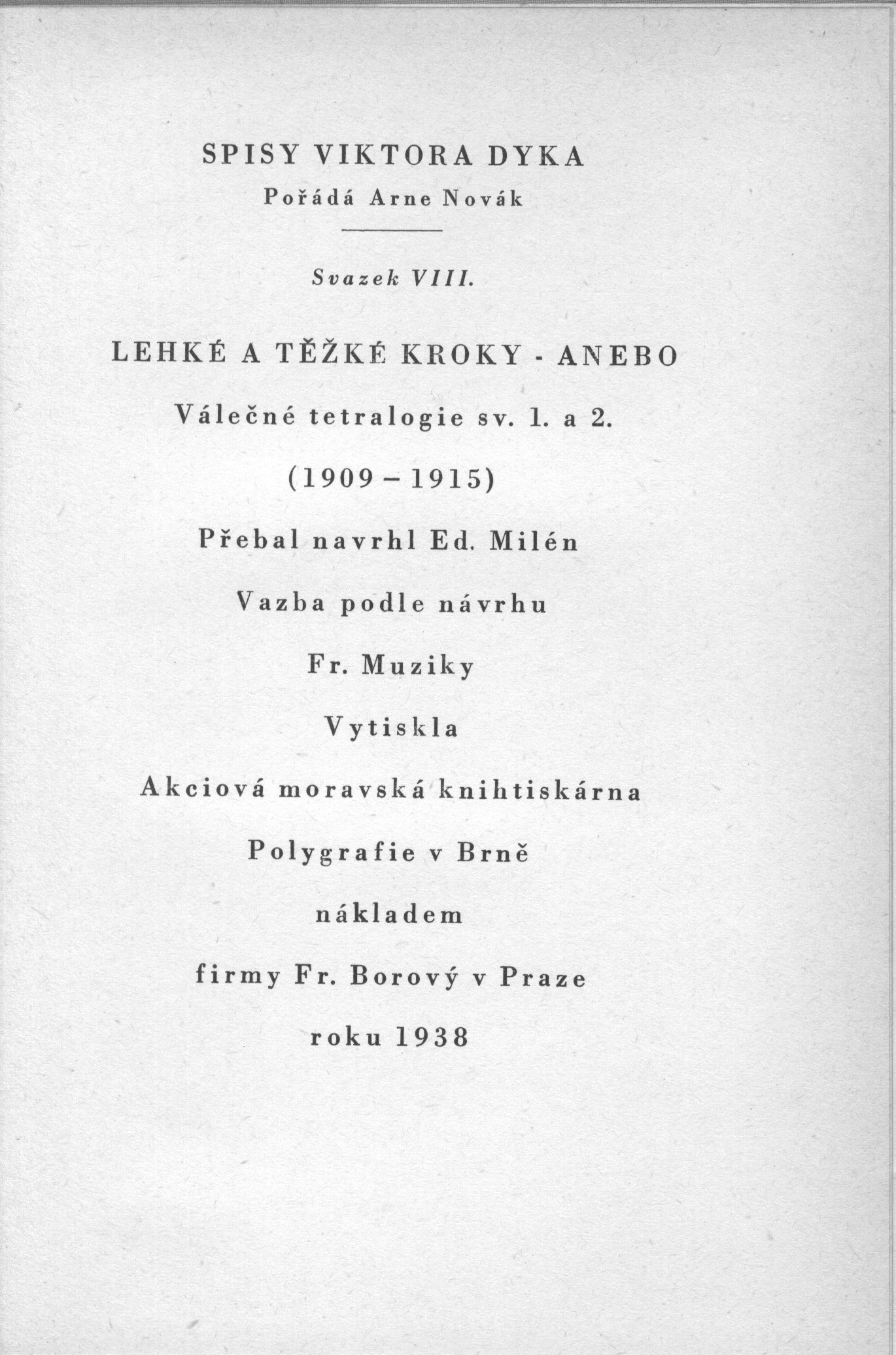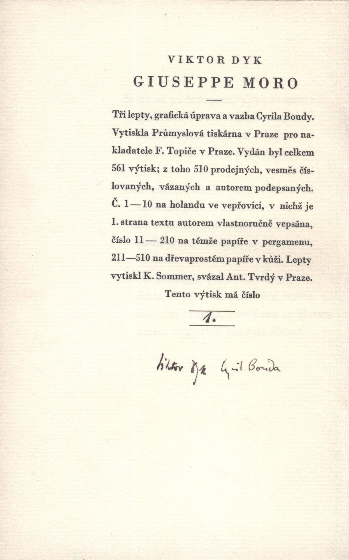Názvové údaje Žluté lásky / Tristan Corbière ; přeložil Jindřich Hořejší, báseňí Epitaf a Paria přeložil Viktor Dyk, Sonet pohrobní a Rákosovou píšťalku přeložil Jan Zahradníček Osobní jméno Corbière, Tristan, 1845-1875 (Autor) Další autoři Hořejší, Jindřich, 1886-1941 (Překladatel) (Autor komentáře) Dyk, Viktor, 1877-1931 (Překladatel) Zahradníček, Jan, 1905-1960 (Překladatel) Korp. Melantrich (nakladatelství) (Tiskař) (Nakladatel, vydavatel) Nakladatel Praha : vytiskl a vydal Melantrich, 1934 Rozsah 77 stran ; 21 cm Klíčová slova francouzská literatura * poezie * Corbière T. * francouzská poezie * sbírka básní * český překlad * Hořejší J. * Dyk V. * Zahradníček J. * r. 1934 Počet ex. 2, z toho volných 2 Druh dok. monografie Signatura MEL 1557, AHO 0332 Názvové údaje Ad usum pana presidenta republiky / napsal Viktor Dyk Osobní jméno Dyk, Viktor, 1877-1931 (Autor) (Autor úvodu atd.) Další autoři Ústřední zemědělské knihkupectví A. Neubert (Nakladatel, vydavatel) Českoslovanská akciová tiskárna (Tiskař) Nakladatel V Praze : Zemědělské knihkupectví A. Neubert, 1929 Výrobce V Praze Českoslovanská akc. tiskárna Rozsah 97 stran ; 21 cm Klíčová slova česká literatura * Dyk V. * česká politika * 1. světová válka * první republika * polemika * Beneš E. * Masaryk T. G. * r. 1929 Počet ex. 1, z toho volných 1 Druh dok. monografie Signatura VZinková 0539 Názvové údaje Buřiči a smíření / napsal Viktor Dyk Osobní jméno Dyk, Viktor, 1877-1931 (Autor) (Autor úvodu atd.) Další autoři F. Topič (nakladatelství) (Nakladatel, vydavatel) Grafia (tiskárna, nakladatelství) (Tiskař) Nakladatel V Praze : Nakladatel F. Topič knihkupec, 1918 Výrobce (Grafia) Rozsah 162 s. ; 19 cm Klíčová slova česká literatura * poezie * lyrickoepické skladby * Dyk V. * soubor básní Počet ex. 1, z toho volných 1 Druh dok. monografie Signatura Topič 0413 Názvové údaje Giuseppe Moro / Viktor Dyk ; [tři lepty, grafická úprava a vazba Cyrila Boudy ; lepty vytiskl K. Sommer ; svázal Ant. Tvrdý] Osobní jméno Dyk, Viktor, 1877-1931 (Autor) (Autor podpisu) Další autoři Bouda, Cyril, 1901-1984 (Ilustrátor) (Grafický technik) (Knižní grafik) (Výtvarník vazby) (Autor podpisu) Sommer, K. (Tiskař obrazu) Tvrdý, Antonín, 1888-1961 (Vazač) Korp. F. Topič (nakladatelství) (Nakladatel, vydavatel) Průmyslová tiskárna v Praze (Tiskař) Nakladatel Praha : Nakladatel F. Topič, 1930 Výrobce (Průmyslová tiskárna) Rozsah 76 s. : il. ; 18 cm Klíčová slova česká literatura * poezie * Dyk V. * poéma * epická báseň * mořeplavecké cesty * bibliofilský výtisk * číslovaný výtisk * ilustrované knihy * Bouda C. Počet ex. 1, z toho volných 1 Druh dok. monografie Signatura Topič 0469 Názvové údaje Klíč : povídka o zločinu / Viktor Dyk ; [tři lepty L. Dvořáčka ; typografická úprava Rudolfa Hály] Osobní jméno Dyk, Viktor, 1877-1931 (Autor) Další autoři Dvořáček, Ludvík, 1895-1972 (Ilustrátor) (Autor podpisu) Hála, Rudolf, 1892-1968 (Typograf) (Ilustrátor) Hladký, Josef, 1885-1960 (Nakladatel, vydavatel) (Autor podpisu) Korp. Josef Hladký (nakladatelství) (Nakladatel, vydavatel) Orbis (tiskárna) (Tiskař) Nakladatel Hranice na Moravě : Josef Hladký, 1927 Výrobce knihtiskárna Orbis) Rozsah 31 s., [3] l. obr. příl. : il. ; 20 cm Klíčová slova česká literatura * próza * povídka * Dyk V. * ilustrované vydání * lepty * číslovaný výtisk * bibliofilie * bibliofilský tisk * r. 1927 Počet ex. 1, z toho volných 1 Druh dok. monografie Signatura Topič 0312 Názvové údaje Krysař / Viktor Dyk Osobní jméno Dyk, Viktor, 1877-1931 (Autor) Další autoři Justl, Vladimír, 1928-2010 (Redaktor, výkonný redaktor) (Autor doslovu, tiráže atd.) (Dedikátor) (Autor podpisu) Bouda, Cyril, 1901-1984 (Ilustrátor) (Autor obálky) (Výtvarník vazby) (Typograf) Grossman, Jan, 1925-1993 (Dedikant) Korp. Československý spisovatel (nakladatelství) (Nakladatel, vydavatel) Orbis (tiskárna) (Tiskař) (Tiskař obrazu) Nakladatel Praha : Československý spisovatel, 1958 Výrobce Praha : tiskárna Orbis 01 Rozsah 109 stran : ilustrace ; 21 cm Klíčová slova česká literatura * próza * Dyk V. * novela * ilustrované knihy * ilustrace * Bouda C. Počet ex. 3, z toho volných 3 Druh dok. monografie Signatura AČS 04242, AČS 04242a, VZinková 0614 Názvové údaje Lehké a těžké kroky / Viktor Dyk Osobní jméno Dyk, Viktor, 1877-1931 (Autor) Další autoři Klír, Svatopluk, 1896-1959 (Knižní grafik) Hořejší, Růžena, 1899- (Autor podpisu) Korp. Kvasnička a Hampl (nakladatelství) (Nakladatel, vydavatel) Politika (tiskárna, nakladatelství) (Tiskař) Nakladatel Praha-Král. Vinohrady : Nakladatelé Kvasnička a Hampl, 1927 Výrobce V Praze : Tiskem "Politiky" Rozsah 161 stran ; 18 cm Klíčová slova česká literatura * poezie * Dyk V. * česká poezie Počet ex. 2, z toho volných 2 Druh dok. monografie Signatura VHB 0420, AHO 0133 Názvové údaje Lehké a těžké kroky - Anebo : válečné tetralogie sv. 1. a 2. : (1909-1915) / Viktor Dyk ; [přebal navrhl Ed. Milén ; vazba podle návrhu Fr. Muziky] Osobní jméno Dyk, Viktor, 1877-1931 (Autor) Další autoři Milén, Eduard, 1891-1976 (Autor obálky) Muzika, František, 1900-1974 (Výtvarník vazby) Korp. Fr. Borový (firma) (Nakladatel, vydavatel) Akciová moravská knihtiskárna Polygrafie (Tiskař) Nakladatel Praha : Fr. Borový, 1938 Výrobce Akciová moravská knihtiskárna Polygrafie) Rozsah 268 s. ; 18 cm Osobní hesla Dyk, Viktor, 1877-1931 - novinář, politik, spisovatel, dramatik, překladatel Klíčová slova česká literatura * poezie * básnické sbírky * Dyk V. * tetralogie * válečná poezie Počet ex. 1, z toho volných 1 Druh dok. monografie Signatura C12a 5086
