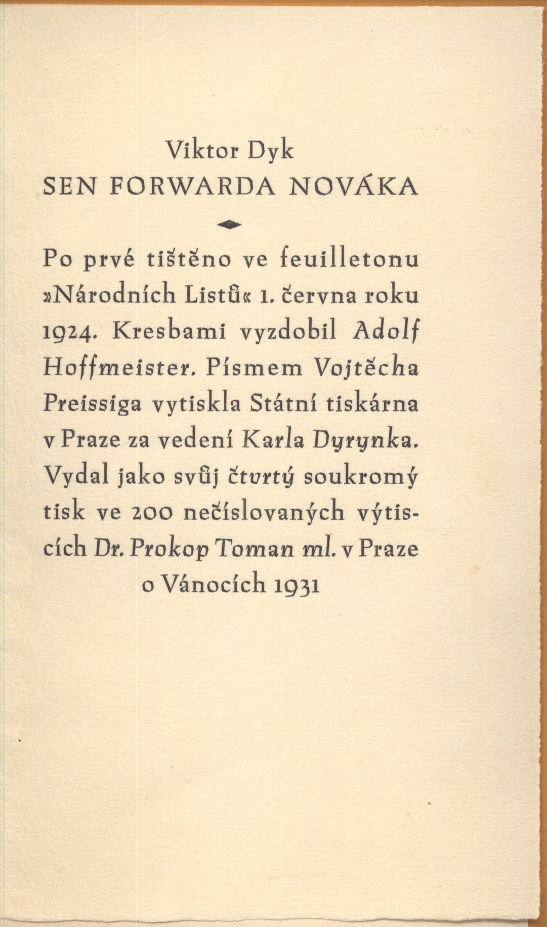 Názvové údaje Ochrana autorů ; O proutkářství / Karel Čapek ; dvěma kresbami vyzdobil Adolf Hoffmeister Osobní jméno Čapek, Karel, 1890-1938 (Autor) Další autoři Hoffmeister, Adolf, 1902-1973 (Ilustrátor) Toman, Prokop Hugo, 1902-1981 (Nakladatel, vydavatel) Dyrynk, Karel, 1876-1949 (Ilustrátor) (Tiskař) (Tiskař obrazu) Nakladatel V Praze : Dr. Prokop Toman ml., 1938 Výrobce V Praze : Karel Dyrynk Rozsah 32 nečíslovaných stran : ilustrace ; 22 cm Klíčová slova česká literatura * próza * Čapek K. * soukromý tisk * Toman P. ml. * ilustrace * Hoffmeister A. * bibliofilský tisk Počet ex. 1, z toho volných 1 Druh dok. monografie Signatura Hoffmeister 0971 Názvové údaje Sen forwarda Nováka / Viktor Dyk ; kresbami vyzdobil Adolf Hoffmeister Osobní jméno Dyk, Viktor, 1877-1931 (Autor) Další autoři Hoffmeister, Adolf, 1902-1973 (Ilustrátor) Toman, Prokop Hugo, 1902-1981 (Nakladatel, vydavatel) Korp. Státní tiskárna v Praze (Tiskař) Nakladatel V Praze : Dr. Prokop Toman ml., 1931 Výrobce V Praze : Státní tiskárna Rozsah 21 stran : ilustrace ; 16 cm Klíčová slova česká literatura * básně * Dyk V. * satirická báseň * fotbal * Československo * Švýcarsko * r. 1924 * olympijské hry * Paříž * Hoffmeister A. * ilustrace * soukromý tisk * Toman P. ml. Počet ex. 1, z toho volných 1 Druh dok. monografie Signatura Hoffmeister 0892 Názvové údaje Neobyčejná dobrodružství Julia Jurenita a jeho žáků ... / Ilja Erenburg ; z ruského originálu Sobranije sočinenij v devjati tomach ... přeložili a vysvětlivkami opatřili Jaroslav a Vlasta Tafelovi ; doslov napsal Jiří Taufer ; ilustroval Adolf Hoffmeister ; typograficky upravil Vladimír Šmerda Osobní jméno Èrenburg, Il‘ja Grigor‘jevič, 1891-1967 (Autor) Další autoři Tafel, Jaroslav, 1929-1973 (Překladatel) (Autor komentáře) Tafelová, Vlasta, 1920-2006 (Překladatel) (Autor komentáře) Taufer, Jiří, 1911-1986 (Autor doslovu, tiráže atd.) Hoffmeister, Adolf, 1902-1973 (Ilustrátor) Šmerda, Vladimír, 1926- (Typograf) Korp. Odeon (nakladatelství) (Nakladatel, vydavatel) Polygrafia (tiskárna, Praha) (Tiskař) Nakladatel Praha : Odeon, nakladatelství krásné literatury a umění, n. p., 1966 Výrobce Praha : Polygrafia 3, n. p. Rozsah 208 stran, 4 listy nečíslovaných příloh, 12 nečíslovaných dvoulistů obrazových příloh : barevné ilustrace ; 25 cm Klíčová slova ruská literatura * próza * překlad * ruský román * prvotiny * Erenburg I. * satirický román * Hoffmeister A. * ilustrované knihy Počet ex. 1, z toho volných 1 Druh dok. monografie Signatura Hoffmeister 0975 Názvové údaje Pozdrav Picassovi / Ilja Erenburg, Adolf Hoffmeister ; grafickou úpravu a obálku navrhl Oldřich Hlavsa ; text Ilji Erenburga z Francouzských sešitů přeložil Jaroslav Hulák, z publikace Lidé, léta, život Ota Klein ; 12 kreseb Adolfa Hoffmeistra Osobní jméno Èrenburg, Il‘ja Grigor‘jevič, 1891-1967 (Autor) Další autoři Picasso, Pablo, 1881-1973 (Umělec) (Ilustrátor) Hoffmeister, Adolf, 1902-1973 (Ilustrátor) Hlavsa, Oldřich, 1909-1995 (Autor obálky) (Knižní grafik) Hulák, Jaroslav, 1920-1999 (Překladatel) Klein, Ota, 1921-1968 (Překladatel) Korp. Státní nakladatelství krásné literatury a umění (Nakladatel, vydavatel) Polygrafia (firma) (Tiskař) Nakladatel Praha : Státní nakladatelství krásné literatury a umění, 1961 Výrobce Praha : Polygrafia 3, národní podnik Rozsah 4 nečíslované strany, 51 stran : ilustrace ; 18 cm Osobní hesla Picasso, Pablo, 1881-1973 - španělský malíř, grafik, sochař, keramik Klíčová slova španělské výtvarné umění * Picasso P. * výročí narození * stati * Erenburg I. * překlady * ilustrace * Hoffmeister A. * r. 1961 Počet ex. 1, z toho volných 1 Druh dok. monografie Signatura Hoffmeister 0931 Názvové údaje Tři měsíce v New Yorku / Miroslav Galuška - Adolf Hoffmeister ; s kresbami Adolfa Hoffmeistera, obálku nakreslil autor Osobní jméno Galuška, Miroslav, 1922-2007 (Autor) Další autoři Hoffmeister, Adolf, 1902-1973 (Autor) (Ilustrátor) (Autor obálky) Korp. Nakladatelství Rudé právo (Nakladatel, vydavatel) Svoboda (tiskárna) (Tiskař) Nakladatel Praha : Rudé právo, 1951 Výrobce Praha : Svoboda, tiskařské závody, n. p. Rozsah 128 stran : ilustrace ; 18 cm Heslo korporace (zkrác. heslo korp.) : Organizace spojených národů. Valné shromáždění Klíčová slova česká literatura * próza * fejetony * Galuška M. * Hoffmeister A. * ilustrace * karikatury * valné shromáždění * shromáždění * Organizace spojených národů * r. 1950 * New York Počet ex. 1, z toho volných 1 Druh dok. monografie Signatura Hoffmeister 0898 Názvové údaje Básnické dílo / Karel Havlíček Borovský ; ilustrovali Adolf Hoffmeister, Ota Janeček, Antonín Pelc, Zdenek Seydl, Jiří Trnka ; vybral, uspořádal, text připravil, poznámky a vysvětlivky napsal Jaromír Bělič ; doslov o výtvarném doprovodu napsal Adolf Hoffmeister ; graficky upravil, přebal a vazbu navrhl Zdeněk Sklenář Osobní jméno Havlíček Borovský, Karel, 1821-1856 (Autor) Další autoři Bělič, Jaromír, 1914-1977 (Sestavovatel, kompilátor) (Autor koncepce) (Autor komentáře) Hoffmeister, Adolf, 1902-1973 (Ilustrátor) (Autor doslovu, tiráže atd.) Janeček, Ota, 1919-1996 (Ilustrátor) Pelc, Antonín, 1895-1967 (Ilustrátor) Seydl, Zdenek, 1916-1978 (Ilustrátor) Trnka, Jiří, 1912-1969 (Ilustrátor) Sklenář, Zdeněk, 1910-1986 (Knižní grafik) (Autor obálky) (Výtvarník vazby) Korp. Státní nakladatelství krásné literatury a umění (Nakladatel, vydavatel) Svoboda (tiskárna) (Tiskař) Nakladatel Praha : Státní nakladatelství krásné literatury a umění, n. p., 1962 Výrobce Praha : Svoboda, grafické závody, n. p. Rozsah 260 stran : ilustrace (některé barevné) ; 25 cm Osobní hesla Havlíček Borovský, Karel, 1821-1856 - spisovatel, publi