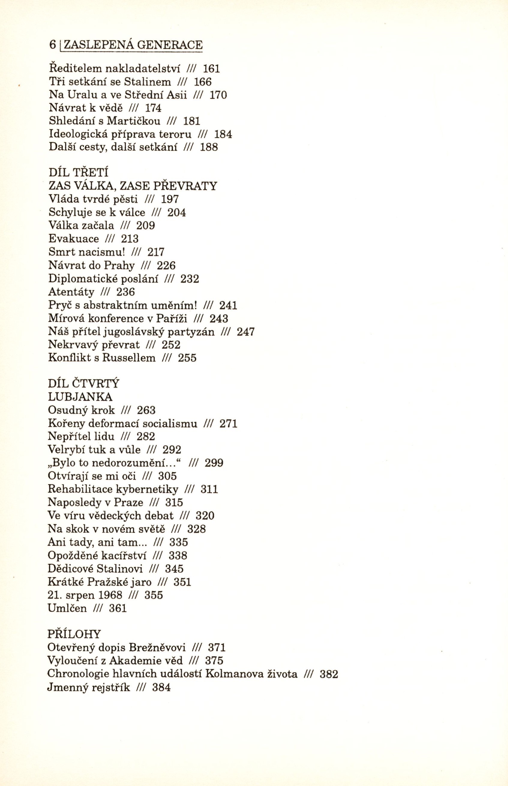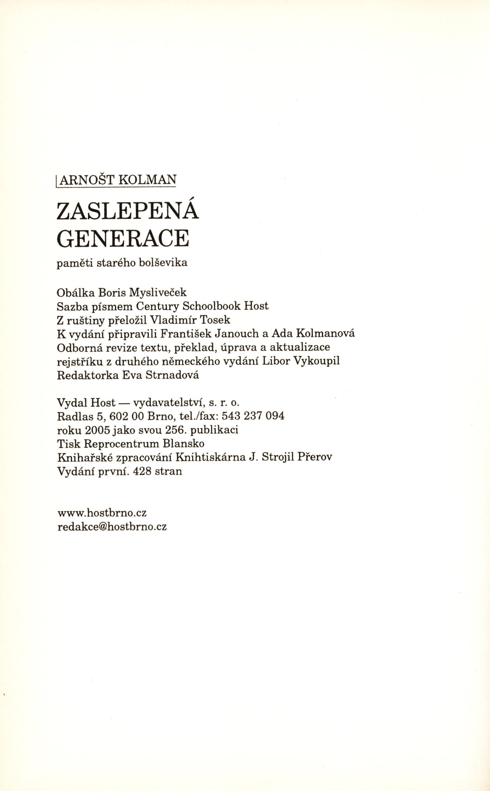 Názvové údaje Den siste Mohikanen / František Janouch, Arnošt Kolman ; översattning av Anders Björnsson Osobní jméno Janouch, František, 1931-2024 Další autoři Kolman, Arnošt, 1892-1979 Björnsson, Anders (Překladatel) Nakladatel Stockholm : Askelin & Hägglund, 1982 Rozsah 154 s., [8] s. obr. příl. Osobní hesla Kolman, Arnošt, 1892-1979 Klíčová slova politické rozhovory * dialog * Švédsko * Kolman A. * Janouch F. * r. 1982 Počet ex. 1, z toho volných 1 Druh dok. monografie Signatura C12b 6274 Názvové údaje Auf der Mauer, auf der Lauer : Satiren über den staatlich verordneten Verdacht / von Arnošt Kolman ; [aus dem Russischen von Arnost Kolman und Henning Schröder ; illustrationen Gisela Büchelmaier ; redaktion Christian Seeger] Osobní jméno Kolman, Arnošt, 1892-1979 (Autor) Další autoři Schröder, Hans-Henning, 1949- (Překladatel) Bűchelmeier, Gisela Nakladatel Berlin : Olle & Wolter, 1979 Rozsah 198 s. : čb. il. Osobní hesla Kolman, Arnošt, 1892-1979 Klíčová slova česká literatura * autobiografie * eseje * satira * stol. 20. Počet ex. 1, z toho volných 1 Druh dok. monografie Signatura C12b 6242 Názvové údaje My ne dolžny byli tak žit' / Arnošt Kolman Osobní jméno Kolman, Arnošt, 1892-1979 Nakladatel New York : Chalidze Publications, 1982 Rozsah 367 s. Osobní hesla Kolman, Arnošt, 1892-1979 Klíčová slova Kolman A. * paměti * život * činnost * Československo * Rusko * stol. 20. Počet ex. 1, z toho volných 1 Druh dok. monografie Signatura C12b 6273 Názvové údaje Die verirrte Generation : so hätten wir nicht leben sollen : eine Autobiographie : Ergänzt durch: Wie habt ihr so leben können? Ein Dialog zwichen František Janouch und Arnošt Kolman / Arnošt Kolman ; herausgegeben von Hanswilhelm Haefs und František Janouch Osobní jméno Kolman, Arnošt, 1892-1979 (Autor) Další autoři Janouch, František, 1931-2024 (Dotazovatel, interviewující) Haefs, Hanswilhelm, 1935- (Editor) Buchholz, Jan, 1938- (Autor obálky) Hinsch, Reni (Autor obálky) Korp. S. Fischer Verlag (nakladatelství) (Nakladatel, vydavatel) Clausen & Bosse. tiskárna (Tiskař) Nakladatel Frankfurt am Main : Fischer Tashenbuch Verlag, 1982 Výrobce Leck : Clausen & Bosse Rozsah 456 stran : černobílé fotografie ; 20 cm Osobní hesla Kolman, Arnošt, 1892-1979 Klíčová slova Kolman A. * autobiografie * politické názory * rozhovory * stol. 20. Počet ex. 2, z toho volných 2 Druh dok. monografie Signatura C12b 6272, JVladislav 1460 Názvové údaje Zaslepená generace : paměti starého bolševika / Arnošt Kolman ; z ruštiny přeložil Vladimír Tosek ; k vydání připravili František Janouch a Ada Kolmanová ; předmluva k českému vydání František Janouch Osobní jméno Kolman, Arnošt, 1892-1979 (Autor) Další autoři Tosek, Vladimír, 1919-1987 (Překladatel) Janouch, František, 1931-2024 (Editor) (Autor úvodu atd.) Kolmanová, Ada, 1939- (Editor) Korp. Host (nakladatelství) (Nakladatel, vydavatel) Tiskárna Reprocentrum (Tiskař) Nakladatel Brno : Host, 2005 Výrobce Blansko : Tisk Reprocentrum Rozsah 426 stran, [16] stran obrazové přílohy : ilustrace, portréty, faksimile ; 24 cm Osobní hesla Kolman, Arnošt, 1892-1979 Klíčová slova dějiny * Sovětský svaz * Československo * komunismus * politika a vláda * filozofové * matematici * paměti Počet ex. 1, z toho volných 0 Druh dok. monografie Signatura Listopad 0081
