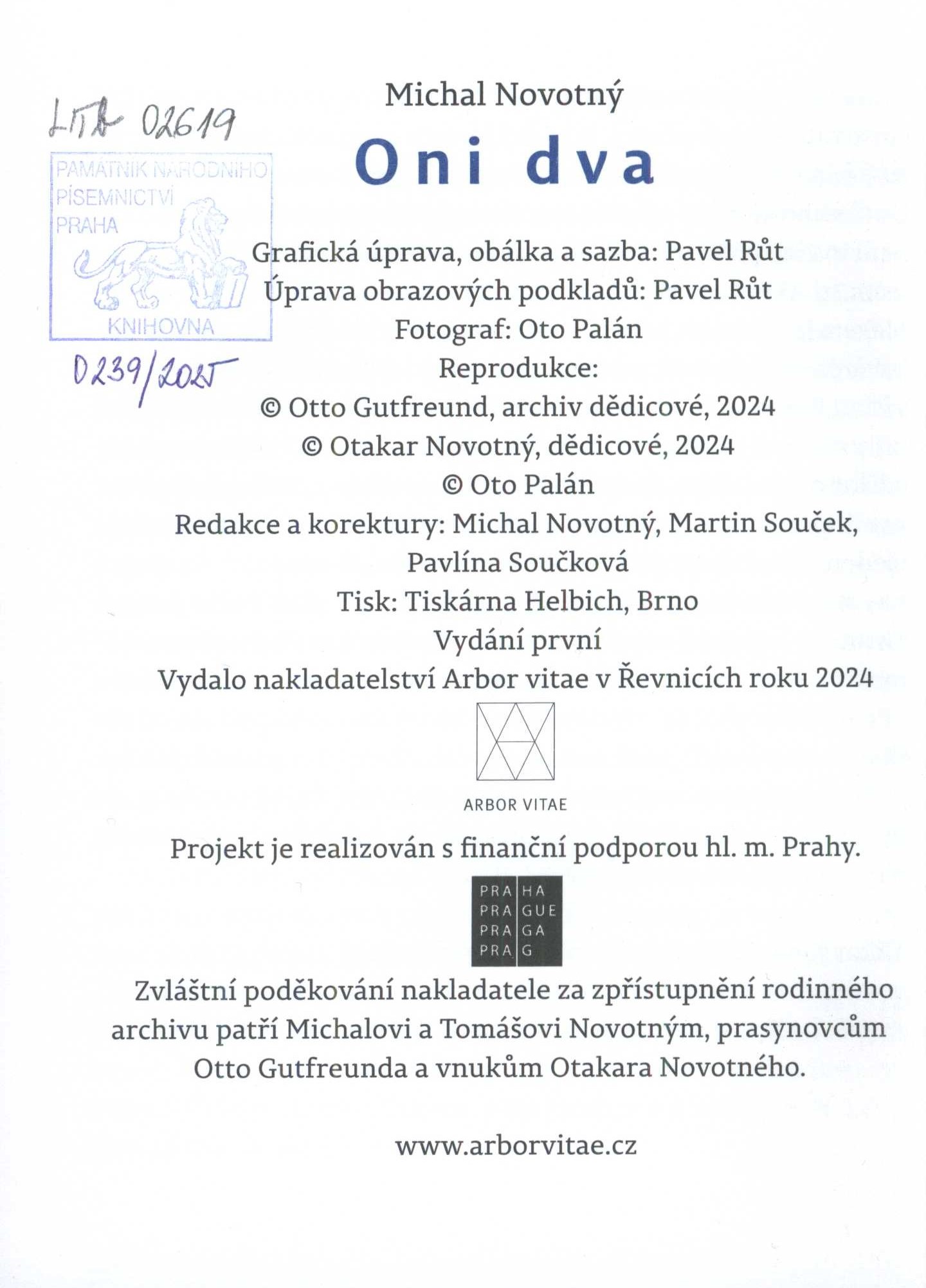 Názvové údaje Oni dva / Michal Novotný ; grafická úprava, úprava obrazových podkladů, obálka a sazba Pavel Růt ; fotograf Oto Palán Osobní jméno Novotný, Michal, 1942- (Autor) Další autoři Růt, Pavel, 1967- (Knižní grafik) (Autor obálky) (Sazeč) Palán, Oto, 1964- (Fotograf) Korp. Arbor vitae (nakladatelství) (Nakladatel, vydavatel) Tiskárna Helbich (Tiskař) Nakladatel V Řevnicích : Arbor vitae, 2024 Výrobce Brno : Tiskárna Helbich Rozsah 206 stran : ilustrace, portréty, faksimile, genealogická tabulka ; 19 cm Osobní hesla Gutfreund, Otto, 1889-1927 - sochař * Novotný, Otakar, 1880-1959 - architekt, redaktor Klíčová slova sochaři * architekti * rodinné vztahy * kulturní život * Česko * stol. 19.-20. * eseje * fotografické publikace Počet ex. 1, z toho volných 1 Druh dok. monografie Signatura LITb 02619