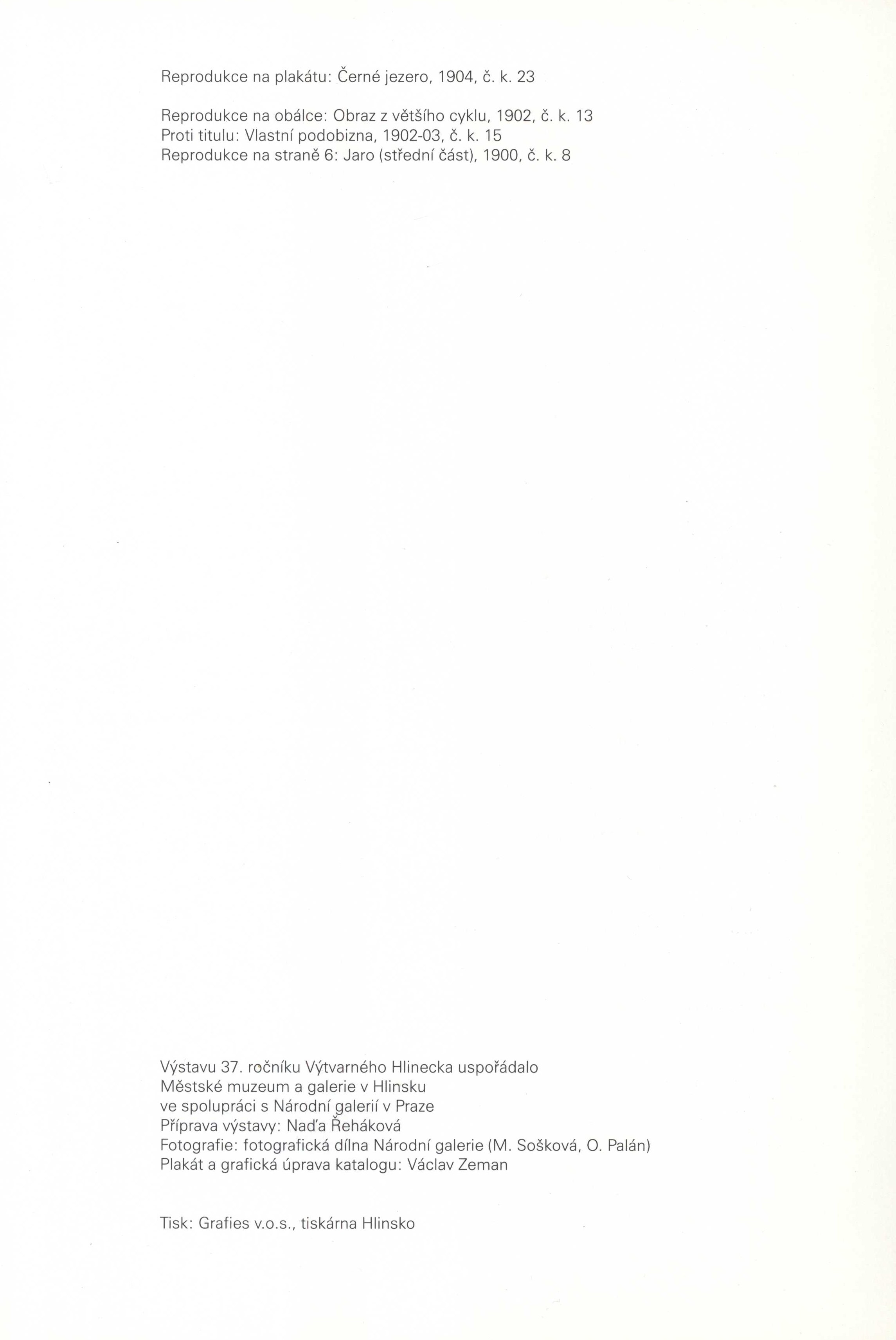 Názvové údaje Jan Preisler : 1872-1918 : [Obecní dům v Praze 9.7.-5.10.2003] / Petr Wittlich ... [et al.] ; [autoři textů Petr Wittlich, Lenka Bydžovská, Karel Srp ; koncepce publikace Petr Wittlich ; dokumentace Polana Bregantová] Záhlaví-akce Jan Preisler : 1872-1918 (2003 : Praha, Česko) Další autoři Wittlich, Petr, 1932- (Autor) (Editor) Bydžovská, Lenka, 1956- (Autor) Srp, Karel, ml. 1958- (Autor) Bregantová, Polana, 1954- (Jiná role) Korp. Obecní dům (Praha, Česko) Národní galerie (Praha, Česko) Nakladatel Praha : Obecní dům, 2003 Rozsah 355 s. Osobní hesla Preisler, Jan, 1872-1918 - akademický malíř, grafik, ilustrátor, profesor AVU, odborný publicista Klíčová slova čeští malíři * české malířství * stol. 19.-20. * život a dílo * studie díla * výstavy * monografie * obrazové publikace Počet ex. 1, z toho volných 1 Druh dok. monografie Signatura C12d 2347 Názvové údaje Sedm statí o výtvarných umělcích / František Kobliha Osobní jméno Kobliha, František, 1877-1962 (Autor) (Ilustrátor) (Nakladatel, vydavatel) (Grafický technik) (Dedikátor) (Dřevorytec) (Leptař) Další autoři Braunerová, Zdenka, 1858-1934 (Dedikant) (Dřívější majitel) Karásek ze Lvovic, Jiří, 1871-1951 (Dedikant) Kaláb, Method, 1885-1963 (Tiskař) Korp. Průmyslová tiskárna v Praze (Tiskař) Nakladatel Praha : F. Kobliha, 1929 Výrobce ([Průmyslová tiskárna]) Rozsah 107 s., [12] l. obr. příl. : il. Osobní hesla Redon, Odilon, 1840-1916 - francouzský malíř a grafik * Ensor, James, 1860-1949 - belgický malíř * Mařák, Julius, 1832-1899 - malíř, grafik, ilustrátor * Pirner, Maxmilián, 1854-1924 - malíř, vysokoškolský pedagog * Preisler, Jan, 1872-1918 - akademický malíř, grafik, ilustrátor, profesor AVU, odborný publicista * Toulouse-Lautrec, Henri de, 1864-1901 - francouzský malíř a grafik Klíčová slova česká literatura * eseje * studie * dějiny umění * dekadence * symbolismus * portréty * bibliofilie * bibliofilská vydání * bibliofilské tisky Počet ex. 2, z toho volných 2 Druh dok. monografie Signatura KaG IV A 9, VHB 4118 Názvové údaje Hlasy světa a domova / Antonín Matějček ; obálka dle návrhu Vlad. Hrsky Osobní jméno Matějček, Antonín, 1889-1950 (Autor) Další autoři Hrska, Alexandr Vladimír, 1890-1954 (Grafický technik) Korp. Spolek výtvarných umělců Mánes (Nakladatel, vydavatel) Družstvo knihtiskárny (tiskárna, Hranice, Přerov) (Tiskař) Nakladatel V Praze : Spolek výtvarných umělců Mánes, 1931 Výrobce V Hranicích : Družstvo knihtiskárny, 1931 Rozsah 254 stran Osobní hesla Navrátil, Josef Matěj, 1798-1865 - malíř * Mánes, Josef, 1820-1871 - malíř a ilustrátor * Myslbek, Josef Václav, 1848-1922 - sochař * Jiránek, Miloš, 1875-1911 - malíř, výtvarný kritik, redaktor, beletrista, překladatel * Preisler, Jan, 1872-1918 - akademický malíř, grafik, ilustrátor, profesor AVU, odborný publicista * Kotěra, Jan, 1871-1923 - architekt, profesor akademie, redaktor * Štursa, Jan, 1880-1925 - sochař * Gutfreund, Otto, 1889-1927 - sochař * Dvořák, Max, 1874-1921 - historik a teoretik umění * Mádl, Karel Boromejský, 1859-1932 - vysokoškolský profesor, historik Klíčová slova česká literatura * výbor * články * stati * historie umění * dějiny umění * výtvarná kritika * r. 1931 Počet ex. 7, z toho volných 7 Druh dok. monografie Signatura MUK 452, LK M 99 g 33, LK P 87 d 59, LK Knytl 2048, LK KM VII 95, LK KCH II 79, KaG IV A 38 Názvové údaje Edvard Munch og den tsjekkiske kunst : Munch-museet Oslo, 27. februar - 30. april 1971 / utstillingsledelse Bente Torjusen, Jiří Kotalík Osobní jméno Munch, Edvard, (Umělec) 1863-1944 Další autoři Torjusen, Bente, 1943- (Autor) Kotalík, Jiří, 1920-1996 (Autor) (Autor úvodu atd.) Blekastad, Milada, 1917-2003 (Překladatel) Korp. Munch-museet (Oslo, Norsko) (Nakladatel, vydavatel) Korp. Edvard Munch og den tsjekkiske kunst (výstava) (1971 : Oslo, Norsko) Nakladatel Oslo : Munch-museet, 1971 Rozsah 129 stran, 6 nečíslovaných barevných listů : ilustrace (některé barevné) : 21 x 22 cm + 8 stran přílohy Osobní hesla Filla, Emil, 1882-1953 - malíř, výtvarný teoretik * Gutfreund, Otto, 1889-1927 - sochař * Kafka, Bohumil, 1878-1942 - sochař * Kotěra, Jan, 1871-1923 - architekt, profesor akademie, redaktor * Kubišta, Bohumil, 1884-1918 - malíř, výtvarný kritik * Preisler, Jan, 1872-1918 - akademický malíř, grafik, ilustrátor, profesor AVU, odborný publicista * Preissig, Vojtěch, 1873-1944 - malíř, ilustrátor, autor typografického písma * Procházka, Antonín, 1882-1945 - malíř, ilustrátor * Prucha, Jindřich, 1886-1914 - čes. malíř * Slavíček, Antonín, 1870-1910 - malíř * Sucharda, Stanislav, 1866-1916 - český výtvarník * Šaloun, Ladislav, 1870-1946 - český sochař * Špála, Václav, 1885-1946 - malíř, ilustrátor * Štursa, Jan, 1880-1925 - sochař * Švabinský, Max, 1873-1962 - malíř, rytec, grafik, pedagog * Váchal, Josef, 1884-1969 - malíř, grafik, ilustrátor, sochař, řezbář a také spisovatel a básník * Zrzavý, Jan, 1890-1977 - malíř, ilustrátor, memoáry, pohádky * Munch, Edvard, 1863-1944 - norský malíř a grafik * Bílek, František, 1872-1941 - sochař, grafik a ilustrátor, architekt, náboženský myslitel a mystik Předmětová hesla české výtvarné umění * Czech art Klíčová slova Norsko * výtvarné umění * muzeum * Oslo * výstava * Munch E. * vliv umění * české výtvarné umění * čeští umělci * katalog výstavy * obrazové publikace Počet ex. 1, z toho volných 1 Druh dok. monografie Signatura C12b 18190 Názvové údaje Posmrtná výstava V. H. Brunnera a Vzpomínková výstava Jana Preislera Záhlaví-akce Posmrtná výstava V. H. Brunnera (1. prosinec 1928 - 1. leden 1929 : Obecní dům, Praha) Další autoři Pečírka, Jaromír, 1891-1966 (Autor úvodu atd.) Korp