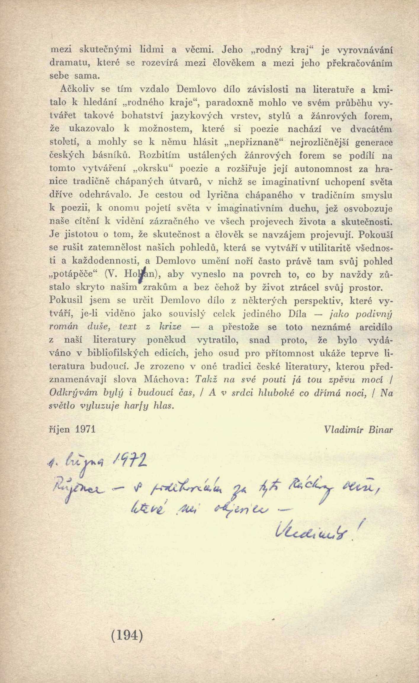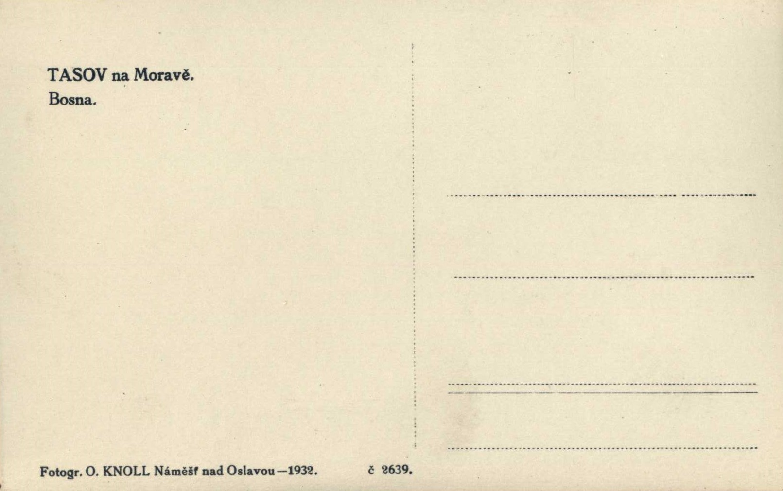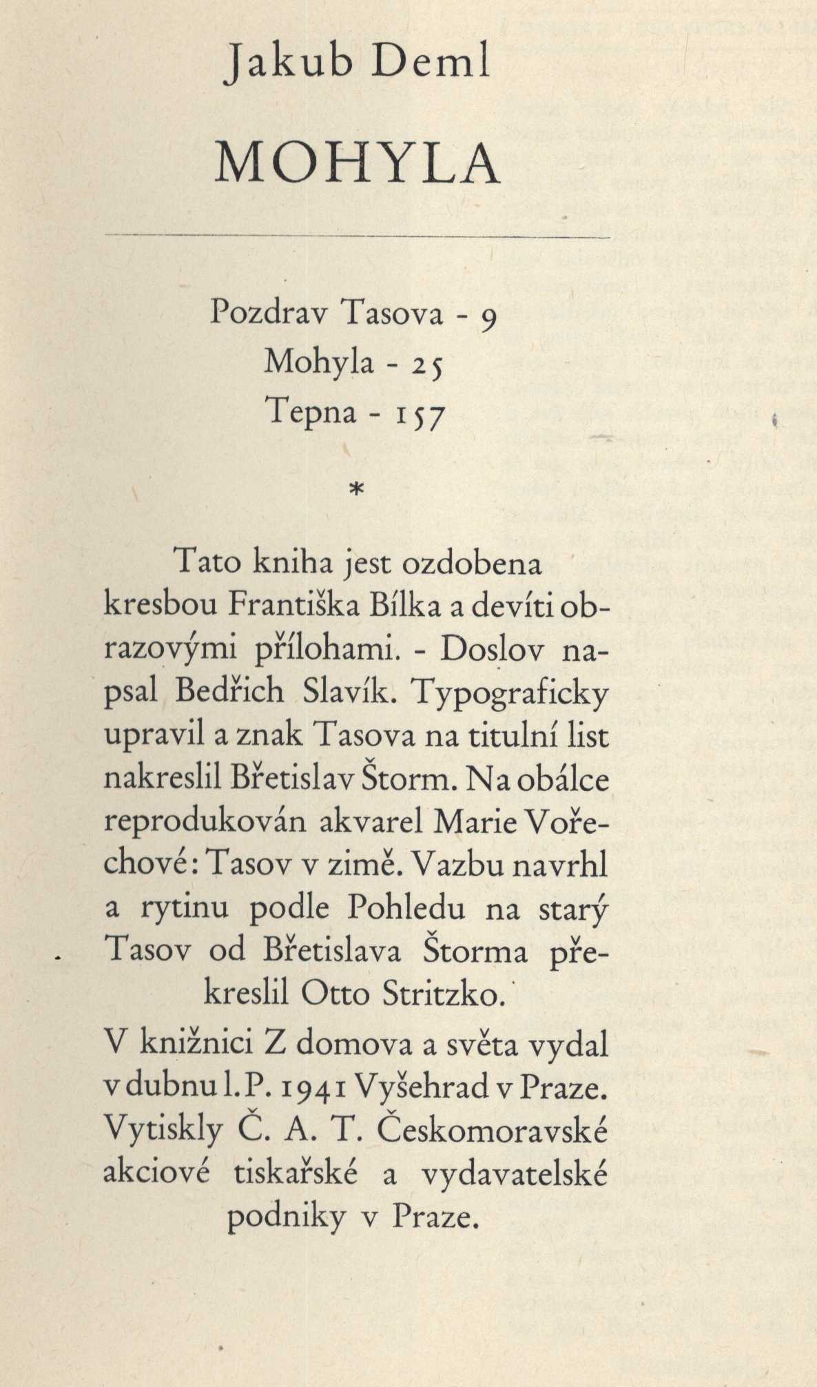 Názvové údaje Tasov / Pavel Adamec Osobní jméno Adamec, Pavel, 1944- (Autor) (Nakladatel, vydavatel) (Dedikátor) Další autoři Goepfertová, Gertruda, 1924-2014 (Dedikant) Nakladatel [Brno] : P. Adamec, [199-] Rozsah [8] s. : il. Klíčová slova Tasov * Morava * Deml J. * básník * vzpomínky * lyrické eseje Počet ex. 1, z toho volných 1 Druh dok. monografie Signatura C12a 4500 Názvové údaje Kronika městečka Tasova : faksimilie tasovské kroniky psané v letech 1922-1929 Jakubem Demlem / Jakub Deml ; [návrh obálky Pavel Čapek ; kresba na obálce Břetislav Štorm] Osobní jméno Deml, Jakub, 1878-1961 (Autor) Další autoři Čapek, Pavel (Autor obálky) Štorm, Břetislav, 1907-1960 (Ilustrátor) Nakladatel Brno : Jota & Arca Jimfa, 1991 Rozsah 224 sl. Osobní hesla Deml, Jakub, 1878-1961 - katolický kněz, básník, prozaik, publicista, překladatel Klíčová slova česká literatura * kroniky * Tasov * r. 1922-1929 Počet ex. 2, z toho volných 2 Druh dok. monografie Signatura EJulis 0212, C12a 5488 Názvové údaje Mohyla. Pozdrav Tasova. Mohyla. Tepna / Jakub Deml ; [tato knihy jest ozdobena kresbou Františka Bílka a devíti obrazovými přílohami ; doslov napsal Bedřich Slavík ; typograficky upravil a znak Tasova na titulní list nakreslil Bedřich Štorm ; na obálce reprodukován akvarel Marie Vořechové: Tasov v zimě ; vazbu a rytinu podle Pohledu na starý Tasov od Břetislava Štorma překreslil Otto Stritzko] Osobní jméno Deml, Jakub, 1878-1961 (Autor) Další autoři Bílek, František, 1872-1941 (Ilustrátor) Slavík, Bedřich, 1911-1979 (Autor doslovu, tiráže atd.) Štorm, Břetislav, 1907-1960 (Ilustrátor) (Typograf) Vořechová-Vejvodová, Marie, 1889-1974 (Autor obálky) Stritzko, Otto, 1908-1986 (Knižní grafik) Korp. Vyšehrad (nakladatelství) (Nakladatel, vydavatel) Č.A.T., Českomoravské akciové tiskařské a vydavatelské podniky (Praha) (Tiskař) (Tiskař obrazu) Nakladatel V Praze : Vyšehrad, 1941 Výrobce (Č.A.T., Českomoravské akciové tiskařské a vydavatelské podniky) Rozsah 242 s. : il. Osobní hesla Deml, Jakub, 1878-1961 - katolický kněz, básník, prozaik, publicista, překladatel Klíčová slova česká próza * Tasov * rodný kraj * autobiografické prožitky * přátelé * rodina * stol. 19.-20. * autobiografické vzpomínky Počet ex. 2, z toho volných 2 Druh dok. monografie Signatura VMartínek 0057, VHB 1453 Názvové údaje Pozdrav Tasova / Jakub Deml ; [typograficky upravil Vlad. Stejskal] Osobní jméno Deml, Jakub, 1878-1961 (Autor) (Nakladatel, vydavatel) (Autor podpisu) (Dedikátor) Další autoři Stejskal, Vladimír (Nakladatel, vydavatel) Holan, Vladimír, 1905-1980 (Dedikant) Korp. Družstvo knihtiskárny (tiskárna, Hranice, Přerov) (Tiskař) Nakladatel Tasov : J. Deml, 1932 Výrobce Družstvo knihtiskárny) Rozsah 22 s. : il. ; 17 cm Klíčová slova česká literatura * katolická literatura * česká próza * Morava * rodný kraj * Tasov * esej * esejistické texty * stol. 20., léta 30. Počet ex. 2, z toho volných 2 Druh dok. monografie Signatura Holan 2396, KaG XXII C2 20 Názvové údaje Tasov / Jakub Deml ; [vybral a uspořádal Miloš Dvořák ; obálku a vazbu navrhl a graficky upravil Václav Kučera ; doslov a ediční poznámku napsal Vladimír Binar] Osobní jméno Deml, Jakub, 1878-1961 (Autor) Další autoři Dvořák, Miloš, 1901-1971 (Sestavovatel, kompilátor) Kučera, Václav, 1944- (Autor obálky) (Výtvarník vazby) (Knižní grafik) Binar, Vladimír, 1941-2016 (Autor doslovu, tiráže atd.) Hamanová, Růžena, 1942-2023 (Dedikant) Korp. Vyšehrad (nakladatelství) (Nakladatel, vydavatel) Nakladatel Praha : Vyšehrad, 1971 Rozsah 196 s. Osobní hesla Deml, Jakub, 1878-1961 - katolický kněz, básník, prozaik, publicista, překladatel Klíčová slova česká literatura * katolická literatura * čeští básníci * čeští spisovatelé * katoličtí spisovatelé * stol. 19.-20. * Deml J. * Tasov * dětství * rodiče * přátelé * vzpomínky * literární črty * literární reminiscence * výbor Počet ex. 1, z toho volných 1 Druh dok. monografie Signatura R&AHamanovi 0202 Názvové údaje Měsíc jako rybí oko / Karel Švestka Osobní jméno Švestka, Karel, 1926-2012 (Autor) Nakladatel Praha : Jaroslava Jiskrová - Máj : Dokořán, 2003 Rozsah 189 s. Klíčová slova česká literatura próza Tasov Počet ex. 1, z toho volných 1 Druh dok. monografie Signatura C12b 6414 Názvové údaje Básník Jakub Deml v Tasově / Stanislav Vodička ; Uspoř. a k vyd. připr. Vladimír Binar ; Graf. upr. Dušan Straňák ; Fotogr. Jan Jakub Zahradníček Osobní jméno Vodička, Stanislav, 1910-1982 (Autor) Další autoři Binar, Vladimír, 1941-2016 (Editor) Straňák, Dušan (Grafický technik) Zahradníček, Jan, 1948-2019 (Fotograf) Nakladatel Praha : Torst, 2001 Rozsah 207 s., fot Osobní hesla Deml, Jakub, 1878-1961 - katolický kněz, básník, prozaik, publicista, překladatel Klíčová slova česká literatura * monografie * Deml J. * vzpomínky * Tasov * stol. 20., léta 40.-50. Počet ex. 1, z toho volných 1 Druh dok. monografie Signatura C12b 5478 Názvové údaje Místa a cesty Otokara Březiny. IV., Tasov na Moravě / prolog napsal Jakub Deml ; kresba titulní od Františka Bílka Další autoři Deml, Jakub, 1878-1961 (Autor úvodu atd.) Bílek, František, 1872-1941 (Ilustrátor) Knoll, Ondřej, 1883-1960 (Fotograf) (Nakladatel, vydavatel) Korp. Knihtiskárna Jana Muchy (Tiskař) Nakladatel V Náměšti nad Oslavou : Ondřej Knoll, 1932 Výrobce Ve Velkém Meziříčí : Jan Mucha Rozsah 4 nečíslované strany, 28 stran, 29 nečíslovaných černobílých fotografií : 1 ilustrace, fotografie ; 14 cm Osobní hesla Březina, Otokar, 1868-1929 - učitel, básník, esejista, prozaik a myslitel Geografické heslo Česko * Tasov (Žďár nad Sázavou, Česko) * Morava (Česko) Klíčová slova čeští spisovatelé * čeští básníci * česká literat
