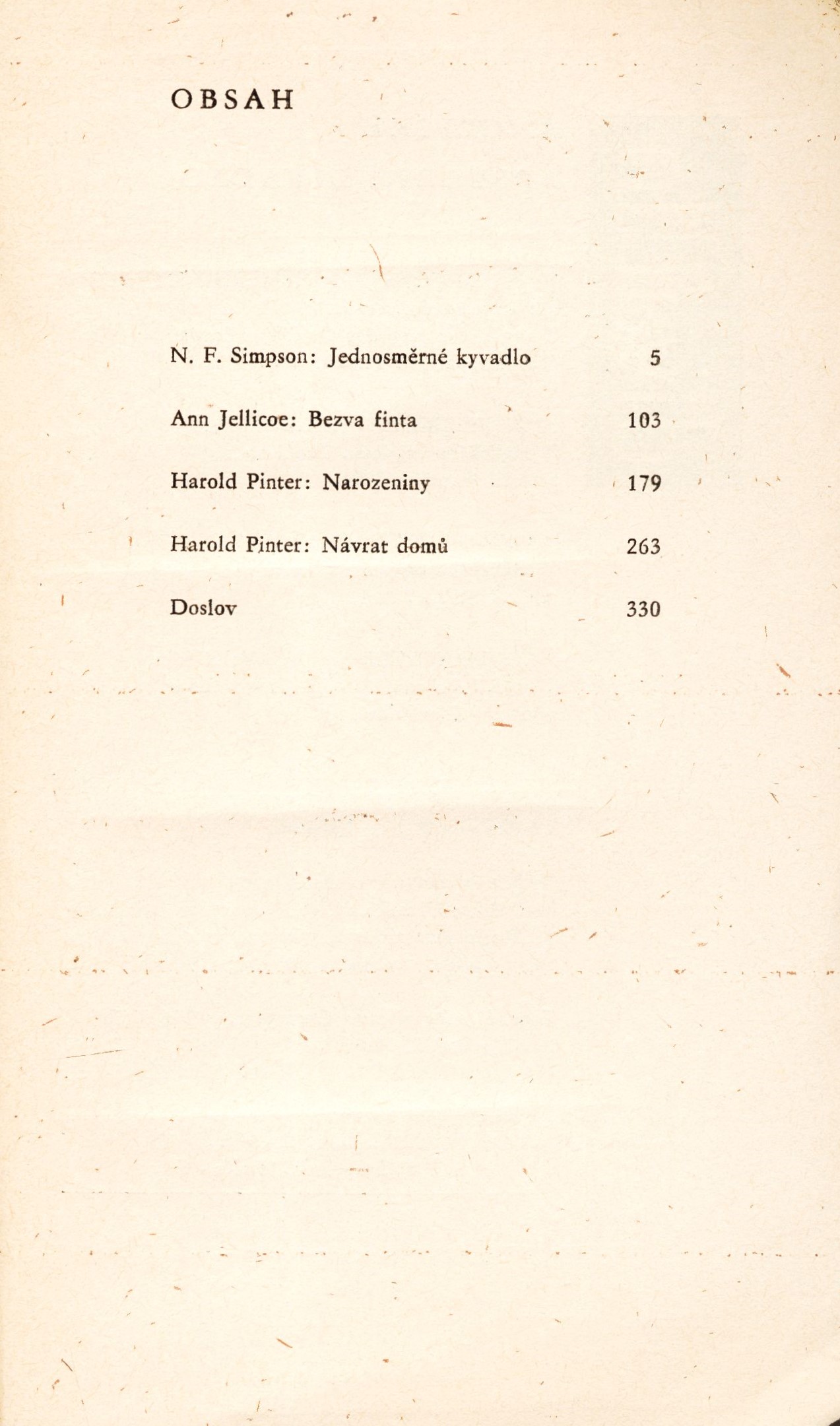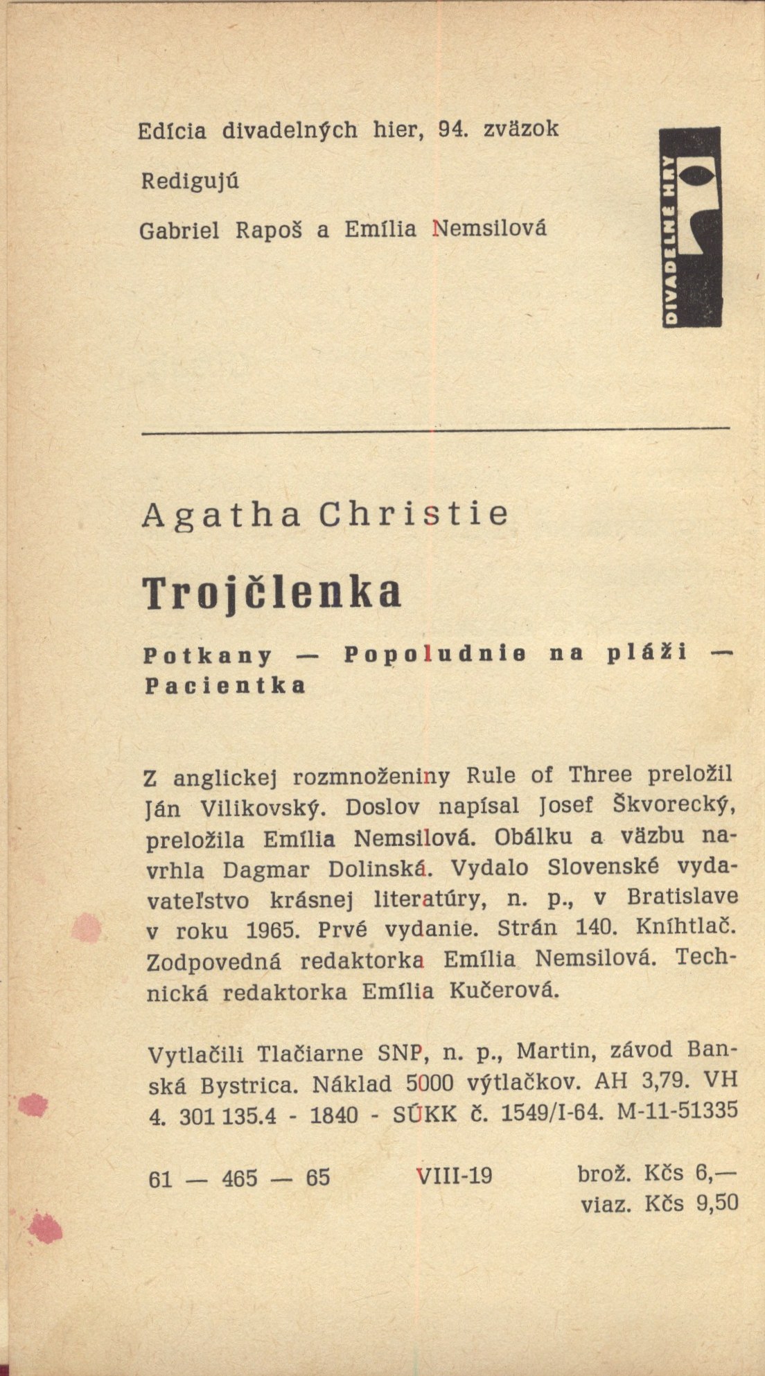 Názvové údaje Všechno na zahradě / podle hry Gilese Coopera Edward Albee ; z anglického originálu Everything in the Garden přeložil a doslov napsal František Vrba ; obálka Jana Sigmundová Osobní jméno Albee, Edward, 1928-2016 (Autor) Další autoři Cooper, Giles, (Bibliografický předchůdce) 1918-1966 Vrba, František, 1920-1985 (Překladatel) (Autor doslovu, tiráže atd.) Sigmundová, Jana, 1940- (Autor obálky) Korp. Orbis (nakladatelství a vydavatelství) (Nakladatel, vydavatel) Středočeské tiskárny, n. p. (Praha) (Tiskař) Nakladatel Praha : Orbis, 1970 Výrobce Středočeské tiskárny, n. p. Rozsah 105 stran Klíčová slova anglická dramata Počet ex. 1, z toho volných 1 Druh dok. monografie Signatura P 125 d 45 Názvové údaje Doslovy k dramatům W. Shakespeara. Díl 2 / A. Anikst, M. Smirnov ; redigoval Artur Závodský Osobní jméno Anikst, Aleksandr Abramovič, 1910-1988 (Autor) Další autoři Smirnov, Michail Timofejevič (Autor) Závodský, Artur, 1912-1982 (Editor) Korp. Univerzita J.E. Purkyně v Brně (Nakladatel, vydavatel) Státní pedagogické nakladatelství (Nakladatel, vydavatel) Nakladatel Praha : Státní pedagogické nakladatelství, 1965 Výrobce SČT 113 Rozsah 192 stran Osobní hesla Shakespeare, William, 1564-1616 - anglický dramatik a básník Klíčová slova anglická literatura * anglická dramata * doslovy Počet ex. 1, z toho volných 1 Druh dok. monografie Signatura R XV a 33 Názvové údaje Trojčlenka. Potkany. Popoludnie na pláži. Pacientka / Agatha Christie ; preložil Ján Vilikovský Osobní jméno Christie, Agatha, 1890-1976 (Autor) Další autoři Vilikovský, Ján, (Překladatel) 1937- Škvorecký, Josef, 1924-2012 (Autor doslovu, tiráže atd.) Nemsilová, Emília, 1932- (Překladatel) Dolinská, Dagmar (Autor obálky) (Výtvarník vazby) Korp. Slovenské vydavateľstvo krásnej literatúry (Nakladatel, vydavatel) Tlačiarne Slovenského národného povstania (tiskárna) (Tiskař) Nakladatel Bratislava : Slovenské vydavateľstvo krásnej literatúry, 1965 Výrobce Bánská Bystrica : Tlačiarne SNP, n. p., Martin Rozsah 137 stran ; 18 cm Osobní hesla Christie, Agatha, 1890-1976 - angl. spisovatelka Předmětová hesla detektivky * anglická literatura * anglická dramata Klíčová slova anglická literatura * drama * Christie A. * divadelní hry * detektivka * překlad * slovenština * r. 1965 Počet ex. 1, z toho volných 1 Druh dok. monografie Signatura VZinková 0091 Názvové údaje O Shakespearových dramatech v Čechách / napsal Jan Kabelík Osobní jméno Kabelík, Jan, 1864-1928 (Autor) (Nakladatel, vydavatel) Nakladatel V Praze : J. Kabelík, 1885 Výrobce Král. Vinohrady : Jelínek, Grund a spol. Rozsah 31 stran ; 18 cm Osobní hesla Shakespeare, William, 1564-1616 - anglický dramatik a básník Klíčová slova Česko * divadlo * dílo * divadelní inscenace * anglická dramata * studie * separáty Počet ex. 1, z toho volných 1 Druh dok. separáty Signatura M 17 f 33 Názvové údaje The Age of Shakespeare / edited by Boris Ford Další autoři Ford, Boris, 1917-1998 (Editor) Korp. Penguin Books (firma) (Nakladatel, vydavatel) Nakladatel Baltimore : Penguin Books, 1955 Rozsah 480 stran Osobní hesla Shakespeare, William, 1564-1616 - anglický dramatik a básník Klíčová slova anglická literatura * anglická próza * anglická dramata * antologie Počet ex. 1, z toho volných 1 Druh dok. monografie Signatura R XIX d 3 Názvové údaje Anglické absurdní divadlo / z anglických originálů přeložil Vladimír Pražák, František Vrba, Milan Lukeš ; doslov k českému vydání F. Vrba Záhlaví-korpor. Orbis (nakladatelství a vydavatelství) (Nakladatel, vydavatel) Další autoři Simpson, N. F. (Norman Frederick), 1919-2011 (Autor) Jellicoe, Ann, 1927-2017 (Autor) Pinter, Harold, 1930-2008 (Autor) Pražák, Vladimír (Překladatel) Vrba, František, 1920-1985 (Překladatel) (Autor doslovu, tiráže atd.) Lukeš, Milan, 1933-2007 (Překladatel) Urbánek, Ivan, 1933-1994 (Autor obálky) Korp. Knihtisk (tiskárna) (Tiskař) Nakladatel V Praze : Orbis, 1966 Výrobce V Praze : Knihtisk n. p. Copyright ©1960 Rozsah 333 stran ; 19 cm Klíčová slova anglická dramata * divadelní hry * překlady do češtiny * překlady z angličtiny * absurdní divadlo Počet ex. 2, z toho volných 2 Druh dok. monografie Signatura P 59 d 24, R&AHamanovi 1562 Názvové údaje Antonius a Kleopatra / [William Shakespeare] ; přeložil J. Č. Osobní jméno Shakespeare, William, 1564-1616 (Autor) Další autoři Čejka, Josef Rodomil, 1812-1862 (Překladatel) Korp. Museum Království českého (Praha, Česko) (Nakladatel, vydavatel) František Řivnáč (nakladatelství) (Nakladatel, vydavatel) Jaroslav Pospíšil (nakladatelství, tiskárna, knihkupectví) (Tiskař) Nakladatel V Praze : nákladem Musea království Českého : v kommissí u Fr. Řivnáče, 1858 Výrobce Tisk Jaroslava Pospíšila Rozsah 128 stran Klíčová slova anglická dramata * historická dramata * divadelní hry Počet ex. 1, z toho volných 1 Druh dok. monografie Signatura L V f 36/přív. 1 Názvové údaje Florencká tragedie / Oscar Wilde ; rozměrem originálu přeložil Jarmil Krecar Osobní jméno Wilde, Oscar, 1854-1900 (Autor) Další autoři Krecar z Růžokvětu, Jarmil, 1884-1959 (Překladatel) (Autor doslovu, tiráže atd.) Korp. Ludvík Bradáč (nakladatelství) (Nakladatel, vydavatel) Kryl a Scotti (firma) (Tiskař) (Tiskař obrazu) Nakladatel Král. Vinohrady : Ludvík Bradáč, 1921 Výrobce V Nov. Jičíně : Kryl a Scotti Rozsah 36 stran : ilustrace ; 18 cm Klíčová slova anglická literatura * drama * Wilde O. * český překlad * Krecar J. * bibliofilie * r. 1921 Počet ex. 1, z toho volných 1 Druh dok. monografie Signatura AHO 0121