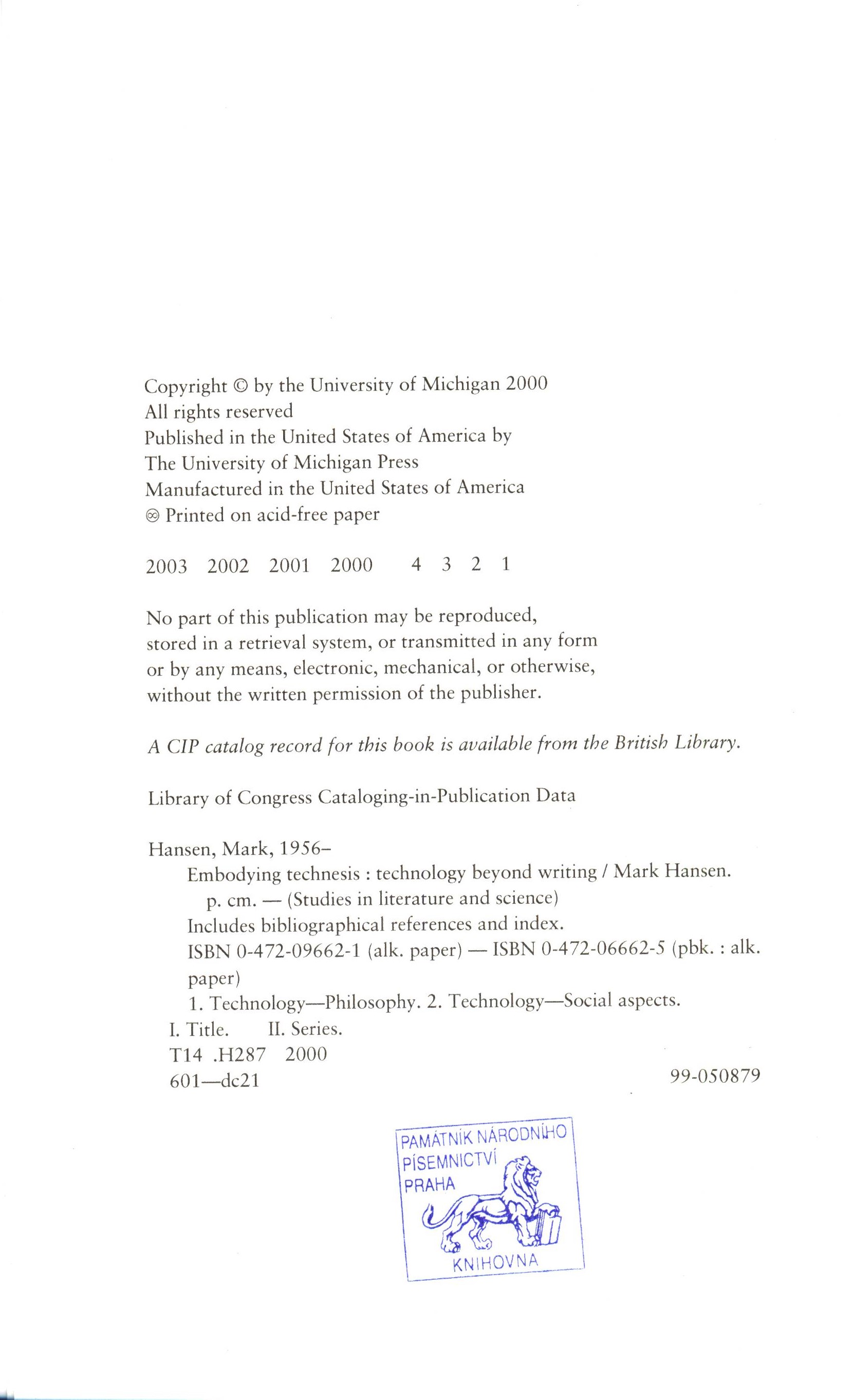 Názvové údaje Digital negroes : an ethnographic dictionary = Digitální černoši : etnografický slovník / Dalibor Knapp ; grafický design a typografie Zdeněk Růžička ; ilustrace Max Máslo ; překlad Ian Mikyska Osobní jméno Knapp, Dalibor, (Autor) (Autor koncepce) 1985- Další autoři Mikyska, Ian, 1994- (Překladatel) Růžička, Zdeněk (Knižní grafik) (Typograf) (Autor koncepce) Máslo, Max, (Ilustrátor) 1994- Korp. Powerprint (tiskárna) (Tiskař) Nakladatel [Praha] : Množina and Studio Famu, 2017 Výrobce PowerPrint, s. r. o. Rozsah 163 stran : ilustrace (částečně barevné), portréty ; 19 cm Klíčová slova česká literatura * dvojjazyčné vydání * obrazové publikace * odborná literatura * digitální technologie * digitální média * kyberkultura * kybernetika * technika * společnost * Nejkrásnější české knihy * r. 2017 Počet ex. 1, z toho volných 1 Druh dok. monografie Signatura C12b 18180 Názvové údaje Data Visualization in Enlightenment / Ileana Baird (editor) Další autoři Baird, Ileana (Editor) Korp. Palgrave Macmillan (firma) (Nakladatel, vydavatel) Springer Nature Switzerland AG (nakladatelství) (Nakladatel, vydavatel) Printforce (firma) (Tiskař) Nakladatel [Cham] : Palgrave Macmillan, [2021] ©2021 Výrobce Netherlands : Printforce Rozsah xxii, 385 stran : ilustrace, faksimile, tabulky, grafy ; 22 cm Klíčová slova dějiny kultury * dějiny literatury * osvícenství * Evropa * vizuální komunikace * vizuální vnímání * vizuální kultura * vizualizace dat * tabulky * grafy * mapy * digitální projekty * digitální technologie * využití * stol. 21. Počet ex. 1, z toho volných 1 Druh dok. monografie Signatura MetC 0426 Názvové údaje Digitizing enlightenment : digital humanities and the transformation of eighteenth-century studies / edited by Simon Burrows and Glenn Roe ; preface by Keith Michael Baker Další autoři Burrows, Simon, (Editor) 1966- Roe, Glenn (Editor) Baker, Keith Michael, 1938- (Autor úvodu atd.) Korp. Liverpool University Press (Nakladatel, vydavatel) CPI Group (tiskařská společnost) (Tiskař) Nakladatel [Liverpool] : Liverpool University Press, [2020]. Výrobce Croydon : CPI Group Ltd Copyright ©2020 Rozsah xvii, 453 stran : ilustrace, mapy, grafy, faksimile ; 24 cm Předmětová hesla enlightenment * scientific methodology * digitization of documents Klíčová slova odborná literatura * historiografie * vědecká metodologie * digitální humanitní vědy * světové dějiny * francouzská literatura * osvícenství * digitální technologie * digitalizace dokumentů * digitální projekty Počet ex. 1, z toho volných 1 Druh dok. monografie Signatura MetC 0425 Názvové údaje Embodying Technesis : technology Beyond Writing / Mark Hansen ; foreword by N. Katherine Hayles Osobní jméno Hansen, Mark B. N. (Mark Boris Nicola), 1965- (Autor) Další autoři Hayles, Katherine, (Autor úvodu atd.) 1943- Korp. University of Michigan Press (Nakladatel, vydavatel) Nakladatel Ann Arbor : University of Michigan Press, [2003] Copyright © 2000 Rozsah ix, 338 stran ; 24 cm Klíčová slova teorie literatury * filozofie * fenomenologie * postmodernismus * vlivy * technologie * moderní technologie * digitální média * digitální technologie * odborná literatura * stol. 21. Počet ex. 1, z toho volných 1 Adr. el. zdr. http://www.loc.gov/catdir/description/umich051/99050879.html Druh dok. monografie Signatura MetC 0369 Názvové údaje Library management for the digital age : a new paradigm / Julie Todaro Osobní jméno Todaro, Julie Beth, (Autor) 1950- Další autoři Rowman and Littlefield, Inc. Nakladatel Lanham ; Boulder ; New York ; Toronto ; Plymouth, UK : Rowman & Littlefield, [2014] Copyright ©2014 Rozsah xxiv, 362 stran ; 24 cm Předmětová hesla management knihoven - 21. století * management změny * rozvoj knihoven - 21. století * nové paradigma - 21. století * činnost knihoven - 21. století * knihovní služby - 21. století * informační služby - 21. století * informační technologie - 21. století Klíčová slova muzea * řízení knihoven * digitální technologie Počet ex. 1, z toho volných 0, prezenčně 1 Druh dok. monografie Signatura MetC 0271 Názvové údaje Literatúra na rozhraní technológií / Bogumiła Suwara Osobní jméno Suwara, Bogumiła, 1957- (Autor) Další autoři VEDA, vydavateľstvo SAV (Nakladatel, vydavatel) (Tiskař) Slovenská akadémia vied. Ústav svetovej literatúry a jazykov (Nakladatel, vydavatel) Nakladatel Bratislava : Veda : Ústav svetovej literatúry SAV, 2022 Rozsah 309 stran ; 21 cm Klíčová slova odborná literatura * odborné studie * literární věda * literární tvorba * digitální technologie * digitální umění * interdisciplinární aspekty * multimediální umění * perspektivy * literatura a umění * literatura moderní doby * stol. 21. Počet ex. 1, z toho volných 1 Druh dok. monografie Signatura LITb 02508 Názvové údaje Museums and digital culture : new perspectives and research / Tula Giannini, Jonathan P. Bowen editors Další autoři Giannini, Tula (Editor) Bowen, Jonathan P., 1956- (Editor) Korp. Springer Nature Switzerland AG (nakladatelství) (Nakladatel, vydavatel) Nakladatel Cham : Springer Nature Switzerland AG, [2019] Copyright ©2019 Rozsah xxviii, 590 stran : barevné ilustrace, fotografie, tabulky, grafy ; 25 cm Klíčová slova muzea * kultura * výstavy * digitální technologie * budoucnost * obrazové publikace Počet ex. 1, z toho volných 0, prezenčně 1 Druh dok. monografie Signatura MetC 0285 Názvové údaje Nejen kruhy : vizuální přístupy v zobrazování dat a informací / Richard Jaroš, Pavla Pauknerová (eds.) ; fotografie: Pavla Pauknerová ; ilustrace: Richard Jaroš ; grafická úprava a sazba: Richard Jaroš (Side2) Další autoři Jaroš, Richard, 1989- (Editor) (Autor koncepce) (Dotazovatel, interviewující) (Ilustrátor) (Knižní grafik) (Sazeč) Pauknerová, Pa