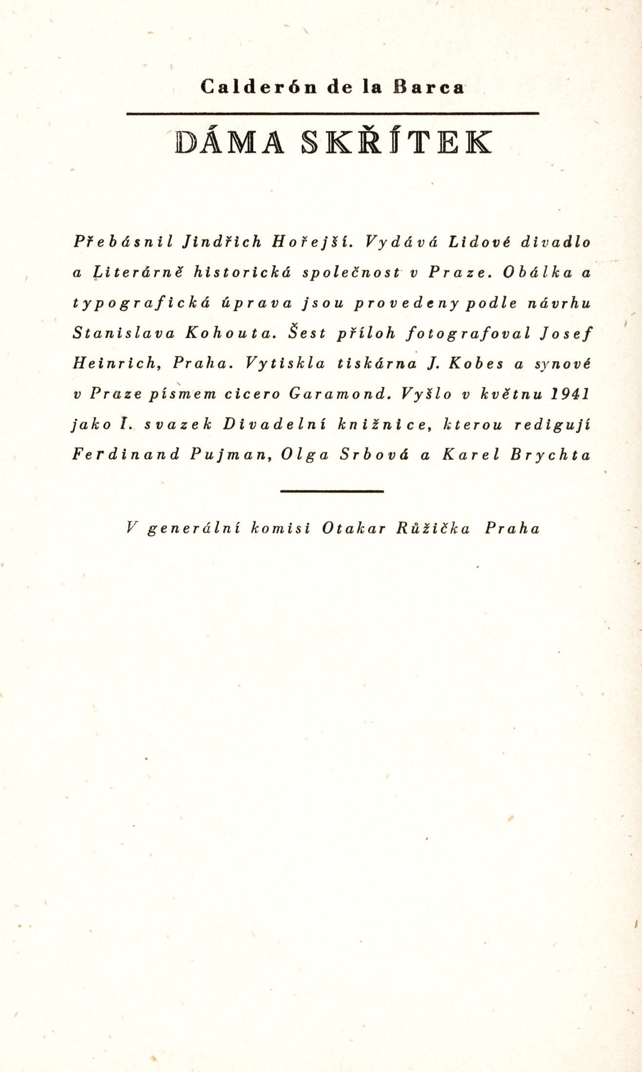 Názvové údaje Josef Svoboda - scénograf / Helena Albertová Osobní jméno Albertová, Helena, 1941- (Autor) Další autoři Svoboda, Josef, 1920-2002 (Umělec) (Ilustrátor) Korp. Institut umění - Divadelní ústav (Praha, Česko) (Nakladatel, vydavatel) Nakladatel Praha : Institut umění - Divadelní ústav, 2012 Rozsah 429 s. : il. (převážně barev.), portréty, plány, faksim. ; 28 cm + 1 DVD Osobní hesla Svoboda, Josef, 1920-2002 - architekt a divadelní výtvarník, scénograf Klíčová slova divadlo * divadelní představení * divadelní osobnosti * scénografové * scénografie * divadelní inscenace * stol. 20.-21. * obrazové publikace * monografické publikace Počet ex. 1, z toho volných 1 Druh dok. monografie Signatura C12d 1930 Názvové údaje Gespräch auf der Probe : mit Szenenbildern von Brechts eigenen Inszenierungen / B. Brecht ; [Bilder und Texte: Bertolt Brecht ... et al.] Osobní jméno Brecht, Bertolt, 1898-1956 (Autor) Nakladatel Zürich : Sanssouci Verlag, c1961 Rozsah 95 s., [24] obr. příl. Osobní hesla Brecht, Bertolt, 1898-1956 - německý dramatik, básník, režisér, prozaik Klíčová slova německá literatura * německé divadlo * divadelní inscenace * němečtí spisovatelé * dramatické dílo * články * úvahy Počet ex. 1, z toho volných 1 Druh dok. monografie Signatura Fuks 0560 Názvové údaje Scénografie mluví : hovory Jarky Buriana s Josefem Svobodou / Barbora Příhodová (ed.) ; [grafická koncepce Marie Jirásková, Pavel Křepela ; sazba Pavel Křepela] Osobní jméno Burian, Jarka, 1927-2005 (Dotazovatel, interviewující) (Autor) Další autoři Svoboda, Josef, 1920-2002 (Dotazovaný, interviewovaný) (Autor) Příhodová, Barbora, 1981- (Editor) Jirásková, Marie, 1964- (Knižní grafik) Křepela, Pavel, 1969- (Knižní grafik) Burian, Grayce Susan (Autor úvodu atd.) Korp. Josef Svoboda (Pacov, Česko) (Nakladatel, vydavatel) Masarykova univerzita (Brno, Česko) (Nakladatel, vydavatel) Tiskárna Didot (Tiskař) Nakladatel Brno : Masarykova univerzita : Josef Svoboda - scénograf, o.p.s, 2014 Výrobce (Tiskárna Didot, spol. s r. o.) Rozsah 303 s. : il. (některé barev.), portréty ; 21,8 x 22 cm Osobní hesla Svoboda, Josef, 1920-2002 - architekt a divadelní výtvarník, scénograf Klíčová slova čeští scénografové * scénografie * divadelní inscenace * Svoboda J. * Česko * stol. 20. * rozhovory * obrazové publikace Počet ex. 2, z toho volných 2 Druh dok. monografie Signatura C12b 16172, C12b 17299 Názvové údaje Dáma skřítek : (La dama duende) ; Veselohra o třech dějstvích (dvanácti obrazech) / Calderón de la Barca ; Přebásnil Jidřich Hořejší ; Obálka a typografická úprava jsou provedeny podle návrhu Stanislava Kohouta ; Šest příloh fotografoval Josef Heinrich Osobní jméno Calderón de la Barca, Pedro, 1600-1681 (Autor) Další autoři Hořejší, Jindřich, 1886-1941 (Překladatel) Kohout, Stanislav, -1965 (Grafický technik) Heinrich, Josef (Fotograf) Černý, Václav, 1905-1987 (Autor úvodu atd.) Dostal, Karel (Autor úvodu atd.) Korp. Literárně historická společnost (Nakladatel, vydavatel) Lidové divadlo (spolek : Praha, Česko). (Nakladatel, vydavatel) Jan Kobes a synové (firma) (Tiskař) Nakladatel V Praze : Literárně historická společnost a Lidové divadlo, 1941 Výrobce V Praze : Jan Kobes a synové Rozsah 143 stran , 6 nečíslovaných stran fotografické přílohy : fotografie ; 20 cm Osobní hesla Calderón de la Barca, Pedro, 1600-1681 - španělský barokní dramatik Klíčová slova španělská literatura * drama * veselohra * překlad * divadelní inscenace * fotografie Počet ex. 4, z toho volných 4 Druh dok. monografie Signatura C12b 2662, LK P 65 c 85, LK P 122 e 45, AHO 0620 Názvové údaje Česká divadelní tradice: mýtus, nebo živá skutečnost? / Jan Císař ; [obálka, grafická úprava a sazba Martin Radimecký] Osobní jméno Císař, Jan, 1932-2021 (Autor) Další autoři Radimecký, Martin, 1963- (Knižní grafik) Korp. Akademie múzických umění v Praze. Ústav dramatické a scénické tvorby (Autor) Nakladatel Praha : KANT, 2011 Výrobce Protisk) Rozsah 163 s. : il., portréty Klíčová slova česká divadla * pražská divadla * divadelní představení * divadelní inscenace * činohra * historie divadla * Česko * stol. 21. * studie Počet ex. 1, z toho volných 1 Druh dok. monografie Signatura C12c 3504 Názvové údaje 3x Ivan Vyskočil / Michal Čunderle, Přemysl Rut, Eva Slavíková ; [překlad summary Michaela Raisová ; grafická úprava a sazba Jan Zich] Osobní jméno Čunderle, Michal, 1971- (Autor) Další autoři Rut, Přemysl, 1954- (Autor) Slavíková, Eva, 1955- (Autor) Raisová, Michaela (Překladatel) Zich, Jan, 1972- (Knižní grafik) (Sazeč) Korp. Brkola (nakladatelství) (Nakladatel, vydavatel) Nakladatel Praha : Brkola, 2013 Rozsah 83 s. : il., portréty Osobní hesla Vyskočil, Ivan, 1929-2023 - herec, dramatik, prozaik Klíčová slova divadelní herci * čeští spisovatelé * čeští pedagogové * divadelní inscenace * herectví * psychosomatika * autorské herectví * stol. 20.-21. * studie Počet ex. 1, z toho volných 1 Druh dok. monografie Signatura C12b 15447 Názvové údaje Soupis repertoáru Národního divadla v Praze : 1881-1935 / sestavili Hubert Doležil a A. M. Píša ; předmluvu napsal Albert Pražák Osobní jméno Doležil, Hubert, 1876-1945 (Sestavovatel, kompilátor) Další autoři Píša, Antonín Matěj, 1902-1966 (Sestavovatel, kompilátor) Pražák, Albert, 1880-1956 (Autor úvodu atd.) Korp. Průmyslová tiskárna v Praze (Tiskař) Nakladatel V Praze : Sbor pro zřízení druhého Národního divadla, 1939 Výrobce (Průmyslová tiskárna) Rozsah 206 s. ; 4° Klíčová slova Národní divadlo, Praha * inscenace * divadelní inscenace * konec 19. stol.-stol. 20., léta 30. * soupisy Počet ex. 1, z toho volných 1 Druh dok. monografie Signatura M 65 b 4