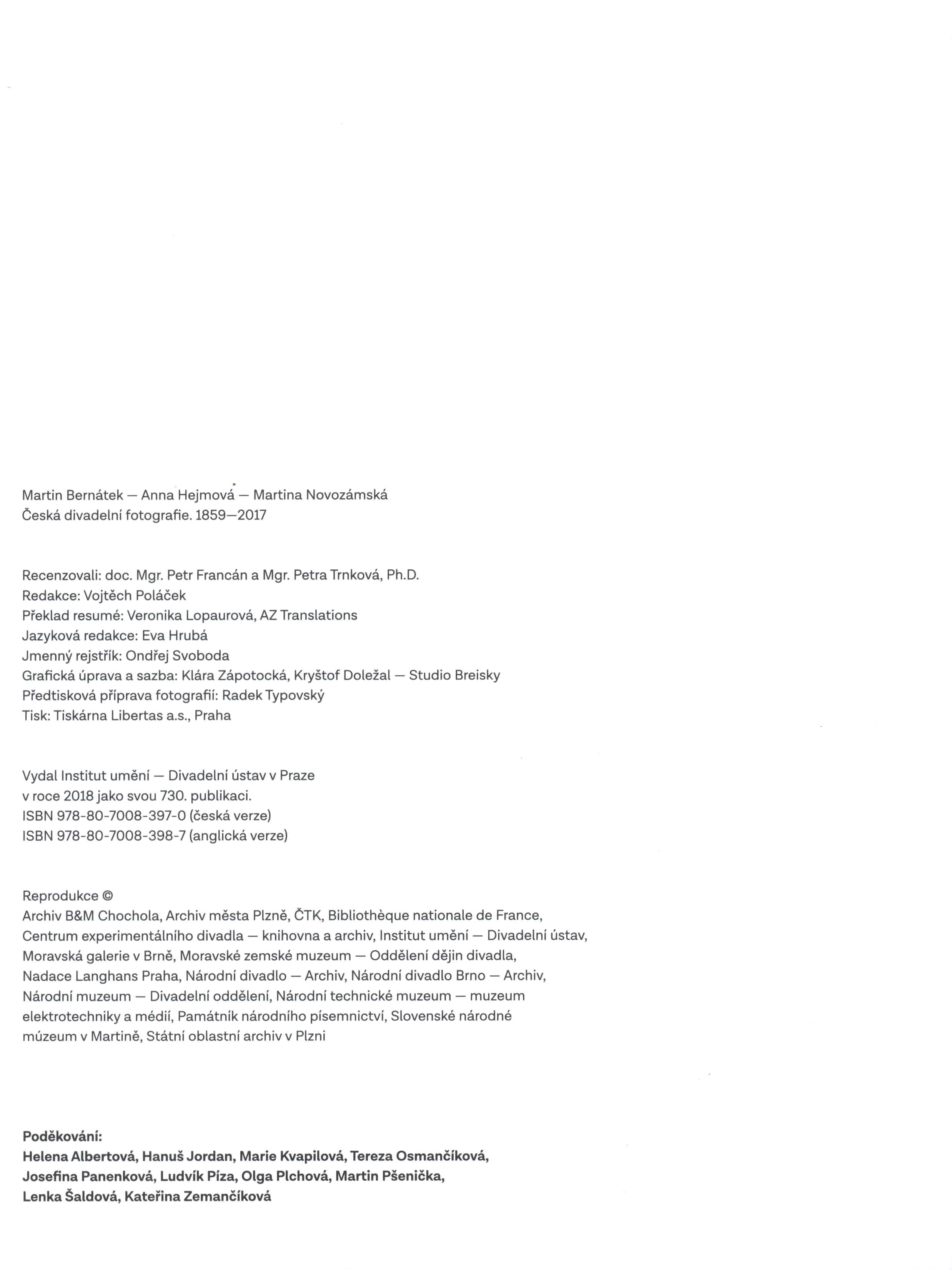 Názvové údaje So simple, so beautiful, so perfect : book on Ahae / Milan Knížák et al.: Joseph Backstein ... [et al.] Autor Ahae, 1941-2014 (Fotograf) Další autoři Knížák, Milan, 1940- (Autor) Bakštejn, Iosif Markovič, 1945-2024 (Autor) Korp. KANT (nakladatelství) (Nakladatel, vydavatel) Tiskárna Daniel (Tiskař) Nakladatel [Praha] : KANT, 2012 Výrobce (Tiskárna Daniel s. r. o.) Rozsah 295 s. : il. (převážně barev.), portréty ; 29 cm Osobní hesla Ahae, 1941-2014 - korejský podnikatel, vynálezce, ekologický aktivista, malíř, sochař, básník a fotograf Předmětová hesla umělecká fotografie - Korea - 20.-21. stol. * příroda * krajina * umělecké náměty Klíčová slova fotografie * fotografové * umělecká fotografie * fotografická publikace * katalog výstavy Počet ex. 1, z toho volných 1 Druh dok. monografie Signatura C12d 1931 Názvové údaje Historie ZOO Praha : prvních 40 zápasů a úspěchů / Romana Anděrová ; [text Romana Anděrová s využitím textů J. Felixe ; foto Archiv ZOO ... [et al.] ; grafická úprava Vladimír Veselý] Osobní jméno Anděrová, Romana, 1951- (Autor) Další autoři Veselý, Vladimír (Knižní grafik) Korp. Zoologická zahrada Praha (Nakladatel, vydavatel) Těšínské papírny, s.r.o. (tiskárna) (Tiskař) Nakladatel Praha : Zoologická zahrada hl. m. Prahy, 2008 Výrobce Těšínské papírny, s. r. o.) Rozsah 96 s. : il. (některé barev.), faksim., portréty ; 17,8 cm Heslo korporace (zkrác. heslo korp.) : Zoologická zahrada Praha Předmětová hesla zoologické zahrady * dějiny Klíčová slova česká literatura * zoologická zahrada, Praha * historie * fotografická publikace * r. 2008 Počet ex. 1, z toho volných 1 Druh dok. monografie Signatura C12a 4439 Názvové údaje Nobuyoshi Araki : Tokyo flowers / text by Zdenek Felix ; [překlad Derek Paton ; grafická úprava Robert V. Novák ; reprodukce Martin Polák] Osobní jméno Araki, Nobuyoshi, 1940- (Umělec) (Fotograf) Další autoři Felix, Zdenek, 1938- (Autor) Novák, Robert V., 1962- (Knižní grafik) Paton, Derek, 1958- (Překladatel) Polák, Martin, 1966- (Fotograf) Korp. Langhans Galerie (Praha, Česko) (Nakladatel, vydavatel) Realtisk (tiskárna) (Tiskař) PBtisk (tiskárna) (Vazač) Nakladatel Praha : Langhans Galerie - PRO Langhans, 2005 Výrobce (Realtisk Praha) Rozsah 64 s. : il. (některé barev.), portréty ; 24 cm Osobní hesla Araki, Nobuyoshi, 1940- - japonský umělecký fotograf Předmětová hesla umělecká fotografie - Japonsko - 20.-21. stol * erotické náměty Klíčová slova fotografická publikace * dvojjazyčné vydání * umělecká fotografie * erotika * Japonsko * japonští výtvarníci * katalogy výstav * r. 2005 Počet ex. 1, z toho volných 1 Druh dok. monografie Signatura C12c 3423 Názvové údaje MCMXCIV MMXIV, mmcité 20 : Petr Babák, Lukáš Kijonka (Laboratoř), David Karásek (mmcité) ; grafická úprava: Petr Babák, Lukáš Kijonka (Laboratoř) Once there were 20 of us. Now we celebrate 20! / Osobní jméno Babák, Petr, 1967- (Autor) (Fotograf) (Knižní grafik) Další autoři Kijonka, Lukáš, 1981- (Autor) (Knižní grafik) Karásek, David, 1969- (Autor) (Fotograf) Nakladatel mmcité, 2014 Výrobce [Praha] : for mmcité made in studio Laboratory Rozsah [204] stran : ilustrace (převážně barevné), 19 cm Klíčová slova česká literatura * fotografická publikace * výročí * oslava * zaměstnanci * poděkování * dortová bitva * firmy * mmcité * Nejkrásnější české knihy * r. 2014 Počet ex. 3, z toho volných 3 Druh dok. monografie Signatura NK/14 005, NK/14 005a, NK/14 005b Názvové údaje Umělecké památky Třebíče / Antonín Bartušek Osobní jméno Bartušek, Antonín, 1921-1974 (Autor) Nakladatel Brno : Blok, 1969 Výrobce (Tisk 02) Rozsah 120 s. : il. + 2 příl. Klíčová slova Třebíč * Česko * umělecké památky * historie města * fotografická publikace Počet ex. 1, z toho volných 1 Druh dok. monografie Signatura Fuks 0122 Názvové údaje Žižkovské pavlače / Kateřina Bečková, Ivan Vavřík, Rudo Prekop ; grafická úprava a sazba Jiří Vašíček Osobní jméno Bečková, Kateřina, 1957- (Autor) Další autoři Vavřík, Ivan, 1958- (Autor) Prekop, Rudolf, 1959- (Fotograf) Vašíček, Jiří, 1958- (Knižní grafik) (Sazeč) Korp. Městská část Praha 3 (Nakladatel, vydavatel) Europrint (tiskárna) (Tiskař) Nakladatel Praha : Městská část Praha 3, 2015 Výrobce Europrint a.s. Rozsah 109 stran : ilustrace (převážně barevné), faksimile, portréty, plány ; 15 x 21 cm Geografické heslo Žižkov (Praha, Česko) Klíčová slova kulturní památky * architektonické památky * architektura domů * informační publikace * fotografická publikace Počet ex. 1, z toho volných 1 Druh dok. monografie Signatura C12a 5796 Názvové údaje Česká divadelní fotografie : 1859-2017 / Martin Bernátek, Anna Hejmová, Martina Novozámská ; grafická úprava a sazba: Klára Zápotocká, Kryštof Doležal - Studio Breisky Osobní jméno Bernátek, Martin, 1986- (Autor) Další autoři Hejmová, Anna, 1982- (Autor) Novozámská, Martina, 1974- (Autor) Zápotocká, Klára, 1985- (Knižní grafik) Doležal, Kryštof, 1976- (Knižní grafik) Korp. Institut umění - Divadelní ústav (Praha, Česko) (Nakladatel, vydavatel) Tiskárna Libertas (Tiskař) Nakladatel V Praze : Institut umění - Divadelní ústav, 2018 Výrobce Praha : Tiskárna Libertas a.s. Rozsah 223 stran : ilustrace (některé barevné), portréty, faksimile ; 29 cm Předmětová hesla theater photography - Czechia - 19th-21st centuries * history of photography - Czechia - 19th-21st centuries * theater - Czechia - 19th-21st centuries Klíčová slova česká literatura * fotografická publikace * divadlo * dějiny fotografie * divadelní fotografie * Česko * r. 1859-2017 * stol. 20.-21. Počet ex. 1, z toho volných 1 Druh dok. monografie Signatura C12d 2366 Názvové údaje Bosko