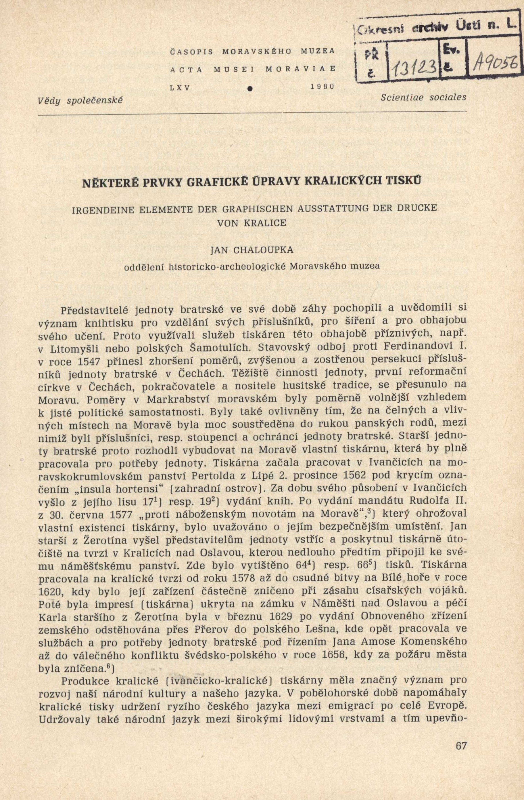 Názvové údaje Kalendář 1991 / Graf. upr., serigrafie, tisk Tomáš Coufal Osobní jméno Coufal, Tomáš, 1964- (Autor) Nakladatel Praha : Vysoká škola uměleckoprůmyslová, 1990 Výrobce Družstvo Malba) Rozsah [Nestr.], obr Klíčová slova česká literatura * kalendář * r. 1991 * grafické zpracování * semestrální práce Počet ex. 1, z toho volných 1 Druh dok. monografie Signatura NK/90 0002 Názvové údaje Krásná kniha : její technická úprava / napsal Karel Dyrynk Osobní jméno Dyrynk, Karel, 1876-1949 (Autor) Další autoři Vokolek, Vlastimil, 1903-1985 (Dřívější majitel) Preissig, Vojtěch, 1873-1944 (Grafický technik) Korp. Typografia (spolek) (Nakladatel, vydavatel) Nakladatel V Praze : Typografia, 1924 Výrobce Státní tiskárna) Rozsah 84 s., 32 s. příl., 2 l., obr. Klíčová slova knihy * typografie * typografie písma * grafický design * grafické zpracování * grafické techniky Počet ex. 1, z toho volných 1 Druh dok. monografie Signatura C12b 8050 Názvové údaje Der Holzschnitt : mit 93 Abbildungen im Text und 2 Tafeln / Max J. Friedländer Osobní jméno Friedländer, Max J., 1867-1958 (Autor) Další autoři Walter de Gruyter & Co.. Vereinigung wissenschaftlicher Verleger (Berlin und Leipzig, Německo) (Nakladatel, vydavatel) Nakladatel Berlin und Leipzig : Vereinigung wissenschaftlicher Verleger Walter de Gruyter & Co., 1921 Rozsah iv, [2], 229, [1] s., [2] listy obr. přílohy : il. Klíčová slova výtvarné umění * stol. 20., léta 20. * umělecká tvorba * dějiny umění * grafika * grafiky * grafici * grafické umění * grafické zpracování * dobová grafika * evropská grafika * knižní grafika * dřevořez * dřevořezy Počet ex. 1, z toho volných 1 Druh dok. monografie Signatura KaG I E 24 Názvové údaje Některé prvky grafické úpravy kralických tisků = Irgendeine Elemente der graphischen Ausstattung der Drucke von Kralice / Jan Chaloupka Osobní jméno Chaloupka, Jan, 1943-1989 (Autor) Nakladatel [Brno] : Moravské muzeum, 1980 Rozsah Strany 67-80 : ilustrace ; 24,5 cm Heslo korporace (zkrác. heslo korp.) : Tiskárna Jednoty bratrské Geografické heslo Kralice nad Oslavou (Česko) Klíčová slova tiskárny * Česko * produkce * tisky * grafiky * grafické zpracování * znaky * prvky * stol. 16.-17. Počet ex. 1, z toho volných 1 Druh dok. separáty Signatura C12c 5484 Názvové údaje Nonverbální prvky v učebnicích zeměpisu jako nástroj didaktické transformace / Tomáš Janko Osobní jméno Janko, Tomáš, 1983- (Autor) Nakladatel Brno : Masarykova univerzita, 2012 Výrobce Olomouc : Books Print, s.r.o. Rozsah 145 stran : ilustrace ; 23 cm Klíčová slova učebnice pro základní školy * zeměpis * obrazový zeměpis * obrazové informace * grafické zpracování * pedagogický výzkum * Česko * r. 2001-2020 * monografie Počet ex. 1, z toho volných 1 Druh dok. monografie Signatura MetC 0207 Názvové údaje Die graphischen Künste / von C. Kampmann Osobní jméno Kampmann, Carl, 1847-1913 (Autor) Další autoři G. J. Göschen'sche Verlagsbuchhandlung (vydavatelství a knihkupectví) (Nakladatel, vydavatel) Carl Rembold & Co, (Heilbronn, Německo) (Tiskař) Nakladatel Leipzig : G. J. Göschen'sche Verlagshandlung, 1898 Výrobce Carl Rembold) Rozsah 174, [2] s., [3] listy obr. přílohy : il. Klíčová slova německá literatura * dějiny umění * příručky * grafické techniky * grafické umění * grafické zpracování * grafický design * grafika * výtvarné umění * rytecké techniky * techniky * stol. 19., léta 90. Počet ex. 1, z toho volných 1 Druh dok. monografie Signatura KaG I E 14 Názvové údaje Básně - Noci po nichž nepřichází ráno / J. H. Krchovský ; [graficky upravila a písmem Tusar a Naudin vysázela Renata Hovorková] Osobní jméno Krchovský, J. H., 1960- (Autor) Další autoři Hovorková, Renata, 1988- (Knižní grafik) (Sazeč) Nakladatel [Praha : Vysoká škola uměleckoprůmyslová, 2012] Rozsah 73 s. Klíčová slova česká literatura * česká poezie * básně * grafické zpracování * studijní práce Počet ex. 1, z toho volných 1 Druh dok. monografie Signatura NK/12 023 Názvové údaje Havran / Edgar Allan Poe ; přebásnil Vítězslav Nezval ; [ilustr.] Jiřina Lockerová Osobní jméno Poe, Edgar Allan, 1809-1849 (Autor) Další autoři Nezval, Vítězslav, 1900-1958 (Překladatel) Lockerová, Jiřina, 1957- (Ilustrátor) Výrobce VŠUP) Rozsah [Nestr.], obr Klíčová slova americká literatura * poezie * básnické skladby * grafické zpracování * grafické listy * diplomová práce Počet ex. 1, z toho volných 1 Druh dok. diplomové/disertační práce Signatura NK/84 0002 Názvové údaje Systems / Martin Prudil ; [grafická úprava Martin Prudil] Osobní jméno Prudil, Martin, 1988- (Autor) (Knižní grafik) (Nakladatel, vydavatel) Nakladatel Praha : Martin Prudil : KudlaPress & Risograph GR, 2013 Výrobce (KudlaPress) Rozsah 10 sešitů po 16 s. Klíčová slova studijní práce * grafické zpracování * knižní design * r. 2013 * Nejkrásnější české knihy Počet ex. 1, z toho volných 1 Druh dok. monografie Signatura NK/13 019
