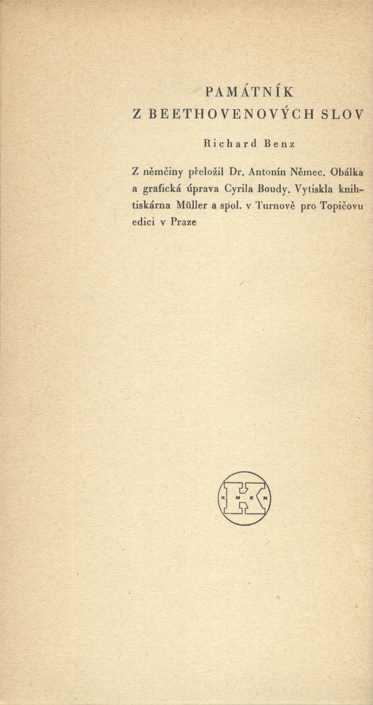 Názvové údaje Antonín Dvořák : kritická studie / Josef Bartoš Osobní jméno Bartoš, Josef, 1887-1952 (Autor) Další autoři Pelcl, Josef, 1861-1916 (Nakladatel, vydavatel) Korp. E. Leschinger (knihtiskař, nakladatel) (Tiskař) Nakladatel V Praze : Nákladem Josefa Pelcla, 1913 Výrobce (Tiskem E. Leschingra) Rozsah 447 s. Osobní hesla Dvořák, Antonín, 1841-1904 - hudební skladatel Klíčová slova česká literatura * česká hudba * česká hudební tvorba * čeští hudebníci * hudební skladatelé * stol. 19., 2. pol. * hudba Počet ex. 1, z toho volných 1 Druh dok. monografie Signatura KaG XXVIII G2 71 Názvové údaje Památník z Beethovenových slov / [uspořádal] Richard Benz ; [z němčiny] přeložil Antonín Němec ; obálka a grafická úprava Cyrila Boudy] Osobní jméno Beethoven, Ludwig van, 1770-1827 (Umělec) Další autoři Benz, Richard, 1884-1966 (Sestavovatel, kompilátor) Němec, Antonín, 1894-1958 (Překladatel) Bouda, Cyril, 1901-1984 (Autor obálky) (Knižní grafik) Korp. Topičova edice (nakladatelství) (Nakladatel, vydavatel) Müller a spol. (tiskárna) (Tiskař) Nakladatel V Praze : Topičova edice, 1941 Výrobce knihtiskárna Müller a spol.) Rozsah 80 s. ; 20 cm Osobní hesla Beethoven, Ludwig van, 1770-1827 - německý skladatel Klíčová slova hudebníci * němečtí umělci * Beethoven L. van * autobiografický text * překlad Počet ex. 1, z toho volných 1 Druh dok. monografie Signatura Topič 0335 Názvové údaje Vlastní životopis jejž pro své děti a potomky roku 1763 napsal František Benda královský pruský koncertní mistr / přeložil a vysvětlivkami opatřil Jaroslav Čeleda Osobní jméno Benda, František, 1709-1786 (Autor) Další autoři Čeleda, Jaroslav, 1890-1974 (Překladatel) (Autor úvodu atd.) Korp. Topičova edice (nakladatelství) (Nakladatel, vydavatel) Osvěta (tiskárna) (Tiskař) Nakladatel V Praze : Topičova edice, 1939 Výrobce Osvěta) Rozsah 63 s., [8] l. obr. příl. : il. Osobní hesla Benda, František, 1709-1786 - houslový virtuos, skladatel, pruský koncertní mistr, pedagog Klíčová slova česká literatura * německy psaná literatura * životopis * česká hudba * čeští hudebníci * České království * Prusko * Německo * stol. 18. Počet ex. 2, z toho volných 2 Druh dok. monografie Signatura Leschinger 178, KaG XLV D 34 Názvové údaje Beethoven / Hector Berlioz ; avant-propos de J.-G. Prod'homme Osobní jméno Berlioz, Hector, 1803-1869 (Autor) Další autoři Prod'homme, Jacques-Gabriel, 1871-1956 (Autor úvodu atd.) Korp. Éditions Corrêa (nakladatelství) (Nakladatel, vydavatel) Imprimerie du Parnasse (tiskárna) (Tiskař) Nakladatel Paris : Éditions Corréa, 1948 Výrobce Paris : Sur les presses de l'Imprimerie du Parnasse, 1948 Rozsah 179 stran Osobní hesla Beethoven, Ludwig van, 1770-1827 - německý skladatel Klíčová slova francouzská literatura * hudba * německá hudba * hudebníci * hudební skladatelé * skladatelé Počet ex. 1, z toho volných 1 Druh dok. monografie Signatura VHB 2052 Názvové údaje Pětadvacet : rozhovory s českými muzikanty / Ondřej Bezr ; [fotografie Daniel Vojtíšek ... et al. ; předmluva Vojtěch Lindaur ; obálka a grafická úprava Bedřich Vémola] Osobní jméno Bezr, Ondřej, 1968- (Autor) Další autoři Vojtíšek, Daniel, 1950-2023 (Fotograf) Lindaur, Vojtěch, 1957-2018 (Autor úvodu atd.) Vémola, Bedřich, 1970- (Knižní grafik) Nakladatel Brno : Petrov, 2004 Rozsah 307 s. : il. Klíčová slova hudebníci * Česko * stol. 20.-21. * rozhovory Počet ex. 1, z toho volných 1 Druh dok. monografie Signatura C12b 8486 Názvové údaje Klejme píseň dokola : výběr z textů / Georges Brassens ; [přeložil, životopisem a předmluvou doplnil] Jiří Dědeček ; [obálku, grafickou úpravu a ilustrace navrhl J.E. Jiránek] Osobní jméno Brassens, Georges, 1921-1981 (Autor) Další autoři Dědeček, Jiří, 1953- (Překladatel) (Autor úvodu atd.) Jiránek, Jaroslav Eugen, 1925-1992 (Autor obálky) (Knižní grafik) (Ilustrátor) Nakladatel Praha : Panton, 1988 Výrobce (SNV) Rozsah 165 s. : il., portréty, noty Osobní hesla Brassens, Georges, 1921-1981 - francouzský zpěvák, písničkář a básník Klíčová slova francouzská poezie * překlad * francouzští básníci * francouzští hudebníci * francouzští skladatelé * francouzští písničkáři * francouzští zpěváci * život a dílo * hudební dílo * písně * šansony * písňová tvorba * písňové texty * výběr z textů * stol. 20. Počet ex. 2, z toho volných 2 Druh dok. monografie Signatura R&AHamanovi 0027, R&AHamanovi 0442