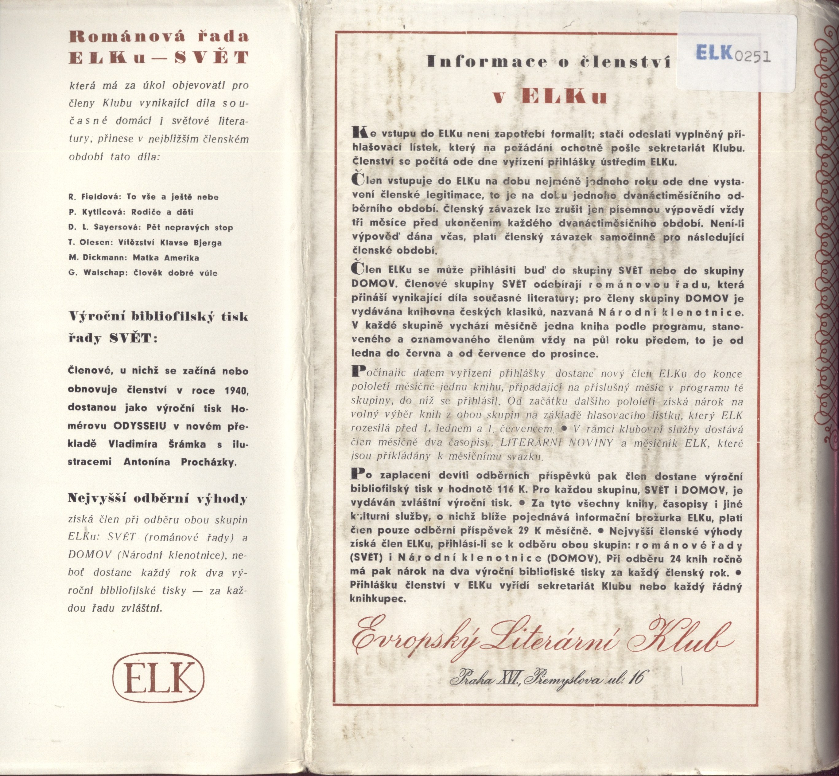 Názvové údaje Portugalské listy / dopisy Marianny Alcoforado ; přeložil Hanuš Jelínek ; frontispic ... T. Františka Šimona, který nakreslil i veškeré obrazy, ozdoby a navrhl předsádku i vazbu ; svázal ... Ant. Malík Osobní jméno Alcoforado, Mariana, 1640-1723 (Autor) Další autoři Guilleragues, Gabriel Joseph de Lavergne, vicomte de, 1628-1685 (Autor) Jelínek, Hanuš, 1878-1944 (Překladatel) (Autor úvodu atd.) Šimon, Tavík František, 1877-1942 (Ilustrátor) (Výtvarník vazby) (Grafický technik) Kaláb, Method, 1885-1963 (Typograf) Malík, Antonín, 1882-1918 (Vazač) Korp. Arthur Novák (nakladatelství) (Nakladatel, vydavatel) Grafia (tiskárna, nakladatelství) (Tiskař) Nakladatel V Praze : Arthur Novák, 1916 Výrobce Grafie Rozsah 42 stran, 1 nečíslovaný list obrazové přílohy : ilustrace ; 17 cm Osobní hesla Alcoforado, Mariana, 1640-1723 - portugalská jeptiška Klíčová slova portugalská literatura * francouzsky psaná literatura * překlad * dopisy * jeptišky * ilustrované knihy * Šimon T. F. * číslovaný výtisk * bibliofilie Počet ex. 3, z toho volných 3 Druh dok. monografie Signatura Topič 0635, Sáňka 1419, P 138 f 30 Názvové údaje Všichni lidé jsou nepřátelé : romance / Richard Aldington ; z anglického originálu All Men are Enemies ... přeložila Jaroslava Vojtěchová Osobní jméno Aldington, Richard, 1892-1962 (Autor) Další autoři Vojtěchová, Jaroslava, 1943- (Překladatel) Tesař, Vladimír, 1924-2008 (Ilustrátor) Turek, František, 1916-2008 (Ilustrátor) Týfa, Josef, 1913-2007 (Autor obálky) (Knižní grafik) Korp. Práce (nakladatelství, tiskárna) (Nakladatel, vydavatel) Mír, novinářské závody (tiskárna) (Tiskař) Nakladatel Praha : Práce, 1972 Výrobce V Praze : Mír 1, novinářské závody Rozsah 461 stran : ilustrace ; 21 cm Klíčová slova anglická literatura * próza * Aldington R. * anglický román * český překlad * Vojtěchová J. * ilustrované knihy * ilustrace * Turek F. * r. 1972 Počet ex. 3, z toho volných 3 Druh dok. monografie Signatura P 42 e 56, Z A 7 b 46, VZinková 0487 Názvové údaje Malý Alšův Špalíček národních písní a říkadel / Mikoláš Aleš ; výbor za spolupráce Maryny Svobodové-Alšové uspořádala Jana Štefánková Osobní jméno Aleš, Mikoláš, 1852-1913 (Ilustrátor) Další autoři Štefánková, Jana, 1921- (Editor) Svobodová-Alšová, Maryna, 1882-1973 (Editor) (Spolupracovník) Korp. Nakladatelství Albatros (Nakladatel, vydavatel) Nakladatel Praha : Albatros, 1988 Rozsah 127 stran : ilustrace ; 20 cm Osobní hesla Aleš, Mikoláš, 1852-1913 - malíř, kreslíř a ilustrátor Klíčová slova národní říkadla * národní písně * ilustrované knihy Počet ex. 1, z toho volných 1 Druh dok. monografie Signatura F I 5210 Názvové údaje Pohádky / Hans Christian Andersen ; [tuto knihu] přeložil [a studii o autoru napsal] Karel Koval ; tři lepty [grafická úprava a návrh na vazbu] od Cyrila Boudy ; [svázal do pergamenu Karel Šilingr]. Osobní jméno Andersen, Hans Christian, 1805-1875 (Autor) Další autoři Koval, Karel, 1896-1956 (Překladatel) (Autor doslovu, tiráže atd.) Bouda, Cyril, 1901-1984 (Ilustrátor) (Knižní grafik) (Výtvarník vazby) (Typograf) Škábová, Olga (Nakladatel, vydavatel) Pegrassi, Mirro, 1891-1963 (Tiskař obrazu) Pian, Alessandro de, 1895-1940 (Leptař) Šilingr, Karel (Vazač) Korp. Průmyslová tiskárna v Praze (Tiskař) Nakladatel V Plzni : Olga Škábová, 1928 Výrobce Průmyslová tiskárna) Rozsah 36 s. : il. ; 28 cm Osobní hesla Andersen, Hans Christian, 1805-1875 - dánský prozaik a básník Klíčová slova dánská literatura * próza * Andersen H. Ch. * pohádky * překlad * ilustrace * lepty * Bouda C. * ilustrované knihy * číslovaný výtisk * bibliofilská vydání * bibliofilie Počet ex. 1, z toho volných 1 Druh dok. monografie Signatura Topič 0744 Názvové údaje Chymische Hochzeit Christiani Rosencreutz : Anno Domini 1459 / verfasst von Joh. Val. Andreae ; mit achtundzwanzig Federzeichnungen von Hans Wildermann Osobní jméno Andreä, Johann Valentin, 1586-1654 (Autor) Další autoři Wildermann, Hans Wilhelm, 1884-1954 (Ilustrátor) Korp. Gustav Bosse Verlag (nakladatelství) (Nakladatel, vydavatel) Nakladatel Regensburg : Gustav Bosse Verlag, 1923 Rozsah 57 s. : il. ; 26 cm Osobní hesla Rosenkreutz, Christian, asi 1378-1484 - německý autor publikací z oboru křesťanské mystiky, filozofie, teozofie Klíčová slova německá literatura * próza * alchymie * hermetismus * okultismus * rosikruciáni * ilustrované knihy Počet ex. 1, z toho volných 1 Druh dok. monografie Signatura Topič 0791 Názvové údaje Štrajchpudlíci / J. Arbes ; illustroval M. Aleš ; [s doslovem Jiřího Karáska ze Lvovic ; typografická úprava, obálka a vazba jsou provedeny podle návrhů Jindřicha Štyrského] Osobní jméno Arbes, Jakub, 1840-1914 (Autor) Další autoři Aleš, Mikoláš, 1852-1913 (Ilustrátor) Karásek ze Lvovic, Jiří, 1871-1951 (Autor doslovu, tiráže atd.) Štyrský, Jindřich, 1899-1942 (Typograf) (Autor obálky) (Výtvarník vazby) Novotný, Miloslav, 1894-1966 (Autor úvodu atd.) Korp. Evropský literární klub (nakladatelství) (Nakladatel, vydavatel) Müller a spol. (tiskárna) (Tiskař) Nakladatel V Praze : Evropský literární klub, 1940 Výrobce Müller a spol.) Rozsah 303 s. : il. ; 22 cm Osobní hesla Arbes, Jakub, 1840-1914 - novinář, politik, prozaik, dramatik, překladatel Klíčová slova česká literatura * próza * román * sociální román * Praha * Smíchov (Praha) * stol. 19. * ilustrované knihy Počet ex. 1, z toho volných 1 Druh dok. monografie Signatura ELK 0251 Názvové údaje Kapitán Korkorán : a jeho dobrodružstvo v Indii / A. Assollant ; preložili Ján Irmler a Štefan Koperdan ; [redaktor J. F. Kunik ; s originálnymi ilustráciami Miloša Nováka] Osobní jméno Assollant, Alfred, 1827-1886 (Autor) Další 