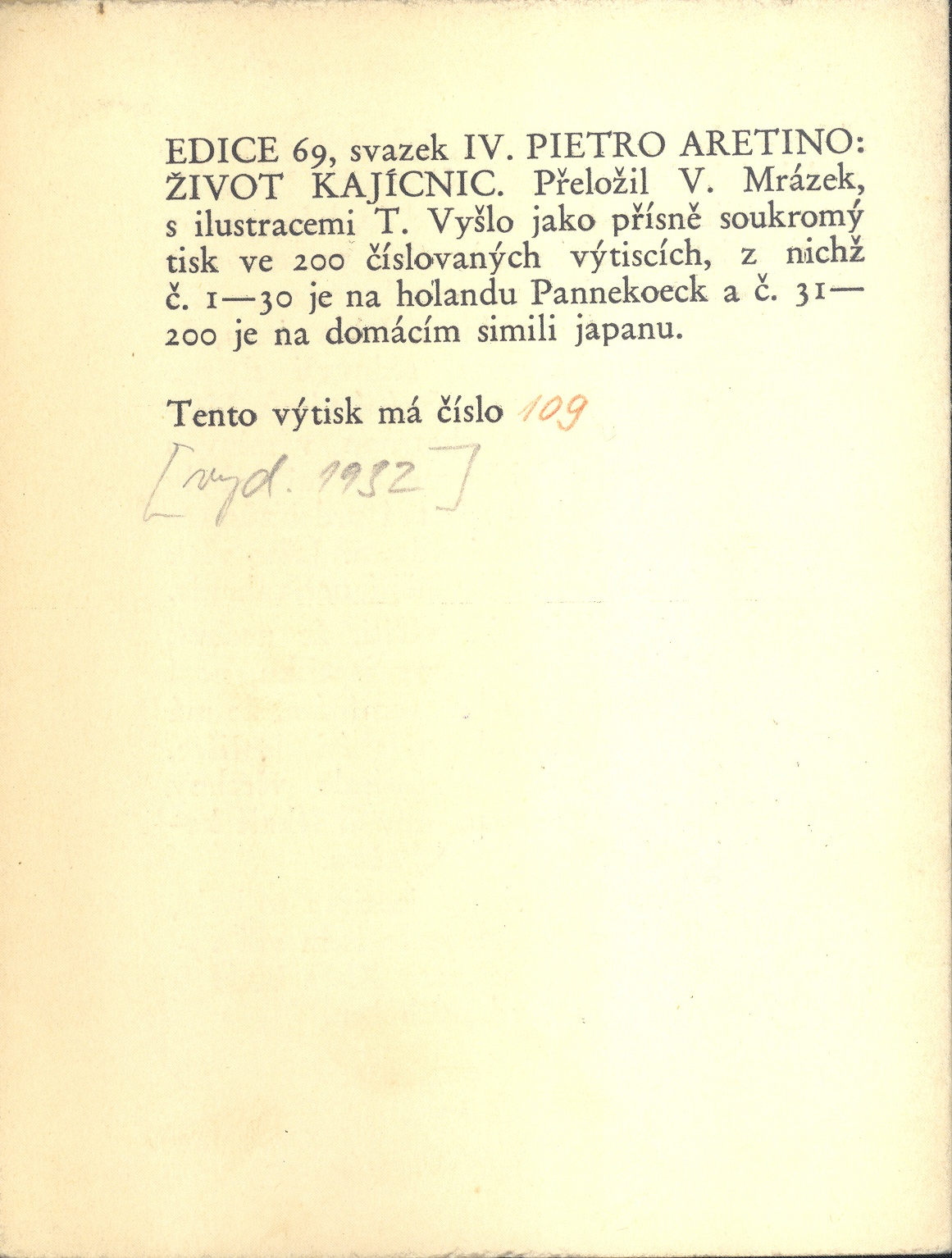 Názvové údaje XIV=14. aukce : Knihovna Arnošta Procházky : třetí část : 4. a 5. května 1928 : hotel "Beránek" na Kr. Vinohradech / [sestavili Miloslav Novotný a Karel Zink ; obálku a frontispic do dřeva ryl František Kobliha ; kromě obyčejného vydání vytištěno 50 exemplářů na holandském ručním papíru s původním leptem T. F. Šimona] Záhlaví-akce XIV=14. aukce (Knihovna Arnošta Procházky) (část třetí) (4.-5. 5. 1928 : Hotel Beránek, Praha, Česko) Další autoři Zink, Karel, 1889-1975 (Sestavovatel, kompilátor) (Nakladatel, vydavatel) (Autor podpisu) Novotný, Miloslav, 1894-1966 (Sestavovatel, kompilátor) (Autor podpisu) Kobliha, František, 1877-1962 (Autor obálky) (Grafický technik) (Ilustrátor) (Autor podpisu) Šimon, Tavík František, 1877-1942 (Grafický technik) Karásek ze Lvovic, Jiří, 1871-1951 (Autor podpisu) Korp. Karel Zink (Praha, Česko) (Nakladatel, vydavatel) Státní tiskárna v Praze (Tiskař) Nakladatel V Praze : Karel Zink, 1928 Výrobce (Tiskem Státní tiskárny) Rozsah [92] s., [2] l. obr. příl. : il. Osobní hesla Procházka, Arnošt, 1869-1925 - básník, esejista, literární a výtvarný kritik, překladatel Klíčová slova česká literatura * katalog * vzácné knihy * bibliofilie * autografy * aukce * katalog knih * vzácné tisky * aukční katalog * autografy spisovatelů * aukční katalog knih * bibliofilská vydání * bibliofilské tisky * věnování * světová literatura * francouzská literatura * německá literatura * holandská literatura * rakouská literatura * polská literatura * španělská literatura * portugalská literatura * italská literatura * stol. 20., léta 20. * r. 1928 * soukromé knihovny Počet ex. 1, z toho volných 1 Druh dok. monografie Signatura KaG XVII B 30/14 Názvové údaje Leone Battista Albertis Kleinere kunsttheoretische Schriften / im Originaltext herausgegeben, übersetzt, erläutert, mit einer Einleitung und excursen versehen von Hubert Janitschek Osobní jméno Alberti, Leon Battista, 1404-1472 (Autor) Další autoři Janitschek, Hubert, 1846-1893 (Editor) (Překladatel) (Autor úvodu atd.) Karásek ze Lvovic, Jiří, 1871-1951 (Autor podpisu) Korp. Wilhelm Braumüller. k. k. Universitäts-Verlagsbuchhandlung (Wien und Leipzig, Rakousko a Německo) (Nakladatel, vydavatel) K. u. k. Hofbuchdruckerei Carl Fromme (Wien) (Tiskař) Nakladatel Wien : Wilhelm Braumüller, 1877 Výrobce (K. k. Hofbuchdruckerei Carl Fromme) Rozsah 270 s. Klíčová slova italská literatura * teorie umění * dějiny umění * renesance * renesanční literatura * renesanční malířství * renesanční umění * obraz * estetika Počet ex. 1, z toho volných 1 Druh dok. monografie Signatura KaG X A 16 Názvové údaje O malbě, O soše / Léon Battista Alberti ; z italštiny přeložil, poznámkami objasnil, studii o L.B. Abertim napsal, náčrty kreslil a obrázky sestavil F. Topinka ; v obálce R. Beneše Osobní jméno Alberti, Leon Battista, 1404-1472 (Autor) Další autoři Topinka, F. (Překladatel) (Autor úvodu atd.) (Autor komentáře textu) (Ilustrátor) Beneš, R. (Autor obálky) Korp. Vladimír Žikeš (nakladatelství a knihkupectví) (Nakladatel, vydavatel) Grafický závod J. Čížek (Pardubice) (Tiskař) Nakladatel V Praze : Nakladatelství Vladimíra Žikeše, 1947 Výrobce V Pardubicích : Grafický závod J. Čížek Rozsah 220 stran, 4 nečíslované listy obrazových příloh : ilustrace ; 16 cm Osobní hesla Alberti, Leon Battista, 1404-1472 - italský teoretik umění, estetik, architekt, spisovatel Klíčová slova italská literatura * překlady * studie * umění * malířství * sochařství * techniky * Alberti L. B. * Itálie * stol. 15. Počet ex. 2, z toho volných 2 Druh dok. monografie Signatura MUK 2078, JVladislav 741 Názvové údaje Filip : tragedie o pěti jednáních / Vittorio Alfieri ; přeložil Bedřich Frida Osobní jméno Alfieri, Vittorio, 1749-1803 (Autor) Další autoři Frída, Bedřich, 1855-1918 (Překladatel) (Autor úvodu atd.) Korp. J. Otto (nakladatelství) (Nakladatel, vydavatel) (Tiskař) Nakladatel V Praze : Nakladatelství J. Otto knihtiskárna, [1892] Rozsah 91 stran Klíčová slova italská literatura * italské divadlo * divadelní hra * tragédie Počet ex. 2, z toho volných 2 Druh dok. monografie Signatura KaG XLI G 211, VHB 1917 Názvové údaje Saul ; Filippo : tragedie / di Vittorio Alfieri Osobní jméno Alfieri, Vittorio, 1749-1803 (Autor) Další autoři Sonzogno, Edoardo, 1836-1920 (Nakladatel, vydavatel) Nakladatel Milano : Edoardo Sonzogno, 1882 Rozsah 98 stran Klíčová slova italská literatura * italské divadlo * divadelní hra * tragédie * veršovaná tragédie Počet ex. 1, z toho volných 1 Druh dok. monografie Signatura VHB 1916 Názvové údaje Pohřební řeč nad sestrou Marií z Kříže rozenou Melanií Kalvatovou, pasačkou La Salettskou, zesnulou v Almuře, v noci 14. prosince 1904 / Annibale Maria di Francia ; Upravil Jaroslav Benda Autor Annibale-Maria di Francia, 1851-1927 (Autor) Další autoři Benda, Jaroslav, 1882-1970 (Grafický technik) Nakladatel Stará Říše : Antonín Ludvík Stříž, 1916 Rozsah 47 s. Klíčová slova italská literatura * próza * náboženská literatura Počet ex. 1, z toho volných 1 Druh dok. monografie Signatura C12a 293 Názvové údaje Černá sfinga : cesty z Maroka na Madagaskar / Mario Appelius ; přeložil Jetřich Lipanský Osobní jméno Appelius, Mario, 1892-1946 (Autor) Další autoři Lipanský, Jetřich, 1900-1971 (Překladatel) Korp. Česká grafická Unie (tiskárna a nakladatelství) (Nakladatel, vydavatel) Nakladatel Praha : Česká grafická Unie, 1940 Rozsah 174 stran, 20 nečíslovaných stran obrazových příloh : mapa Klíčová slova italská literatura * cestopisy Počet ex. 1, z toho volných 1 Druh dok. monografie Signatura P 58 c 22 Názvové údaje Děla a kvetoucí třešně : Nové Japonsko / Mario Appelius ; z italského or