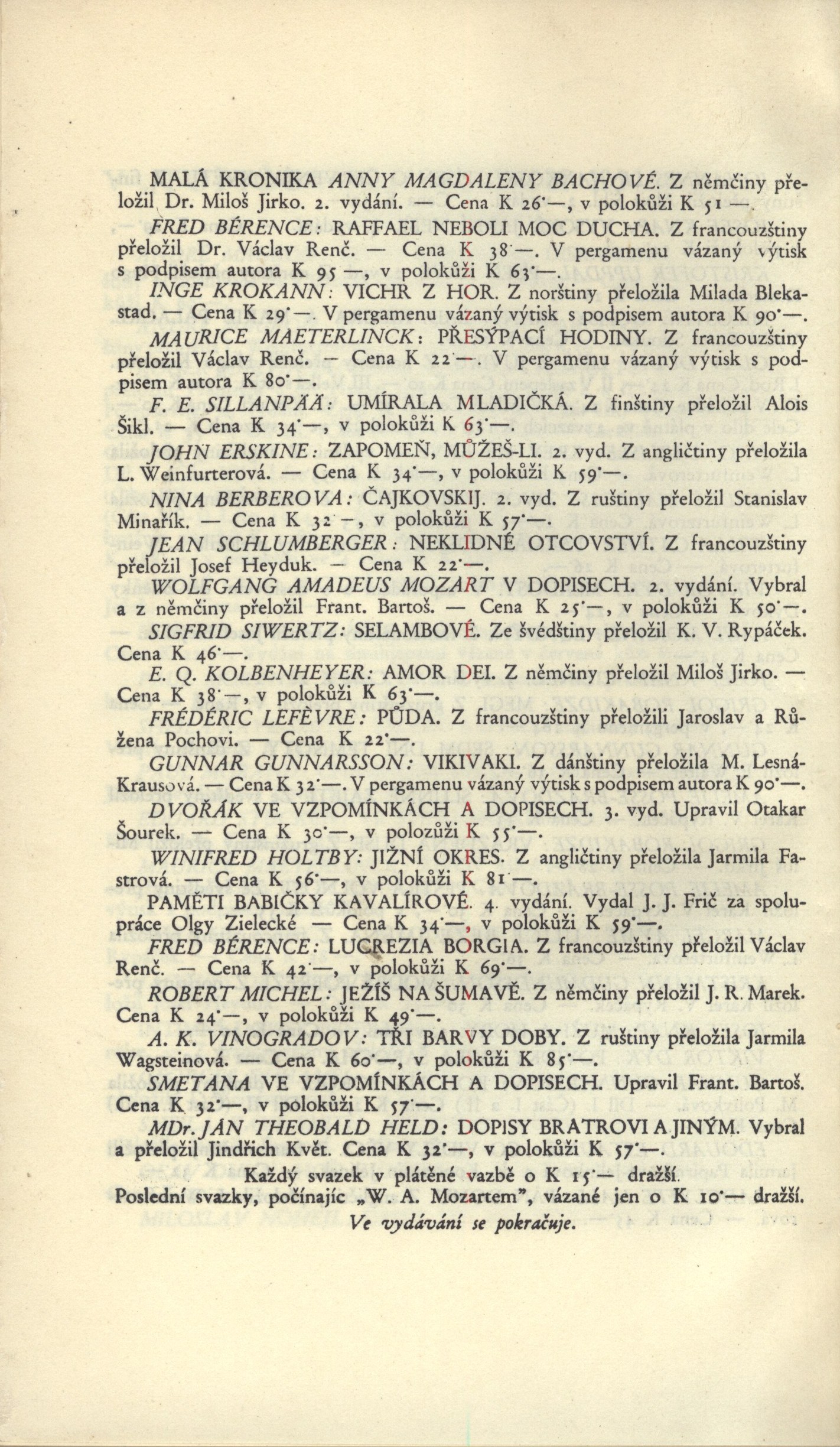 Názvové údaje Florentské malířství a jeho společenské pozadí : měšťanská republika, než převzal moc Cosimi de' Medici : XIV. století a počátek století XV. / Frederick Antal ; z anglického originálu přeložil Jan Vladislav ; doslov k dílu napsal Jaromír Neumann ; grafickou úpravu, obálku a vazbu navrhl Zdeněk Rossmann Osobní jméno Antal, Frederick, 1887-1954 (Autor) Další autoři Vladislav, Jan, 1923-2009 (Překladatel) Neumann, Jaromír, 1924-2001 (Autor doslovu, tiráže atd.) Rossmann, Zdeněk, 1905-1984 (Grafický technik) (Autor obálky) Korp. Státní nakladatelství krásné literatury, hudby a umění (Nakladatel, vydavatel) Orbis (tiskárna) (Tiskař) Nakladatel Praha : Státní nakladatelství krásné literatury, hudby a umění, 1954 Rozsah 305 stran, 166 nečíslovaných obrazových příloh Klíčová slova anglická literatura * dějiny umění * renesance * společenské poměry * Itálie * italské malířství * Florencie * studie Počet ex. 3, z toho volných 3 Druh dok. monografie Signatura MUK 1704, JVladislav 039, K Q I 51 Názvové údaje Raffael : der Maler reiner Schönheit : mit 72 Abbildungen / gewählt und eingeleitet von S. Aschner Osobní jméno Aschner, Siegfried, 1882-1942 (Autor) Další autoři Hugo Schmidt Verlag (München, Německo) (Nakladatel, vydavatel) Nakladatel München : Hugo Schmidt Verlag, [1920] Copyright München : Hugo Schmidt Verlag, [1920] c1920 Rozsah 107 stran : ilustrace Osobní hesla Raffael, 1483-1520 - italský malíř a kreslíř Klíčová slova německá literatura * dějiny umění * renesanční umění * renesanční malířství * italské malířství * italské umění * italští umělci Počet ex. 1, z toho volných 1 Druh dok. monografie Signatura KaG IV C 91 Názvové údaje Lionardo da Vinci, dělník rozumu / Fred Bérence ; z francouzštiny přeložil Duchoslav Foršt ; [dřevoryt a grafická úprava Cyrila Boudy] Osobní jméno Bérence, Fred, 1889-1977 (Autor) Další autoři Foršt, Duchoslav, 1901-1983 (Překladatel) Bouda, Cyril, 1901-1984 (Ilustrátor) (Knižní grafik) Korp. Topičova edice (nakladatelství) (Nakladatel, vydavatel) Osvěta (tiskárna) (Tiskař) Nakladatel V Praze : Topičova edice, 1939 Výrobce Osvěta, společnost s o. r.) Rozsah 369 s., [2] l. obr. příl. : il. ; 22 cm Osobní hesla Leonardo, da Vinci, 1452-1519 - italský malíř, sochař, architekt a vědec Klíčová slova francouzská literatura * próza * překlad * monografie * biografie * Leonardo da Vinci * italské malířství * obrazové přílohy Počet ex. 1, z toho volných 1 Druh dok. monografie Signatura Topič 0101 Názvové údaje Madona s harpyjemi : román / Fred Bérence ; z francouzštiny přeložil Duchoslav Foršt ; [dřevoryt a grafická úprava Cyrila Boudy] Osobní jméno Bérence, Fred, 1889-1977 (Autor) Další autoři Foršt, Duchoslav, 1901-1983 (Překladatel) Bouda, Cyril, 1901-1984 (Ilustrátor) (Knižní grafik) Korp. Topičova edice (nakladatelství) (Nakladatel, vydavatel) První západočeská společnost akciová pro průmysl tiskařský (Plzeň) (Tiskař) Nakladatel Praha : Topičova edice, společnost s r. o., 1946 Výrobce První západočeská spol. akc. pro průmysl tiskařský) Rozsah 235 s. : il. ; 22 cm Osobní hesla Andrea del Sarto, 1486-1530 - italský malíř, představitel florentského manýrismu Klíčová slova francouzská literatura * překlad * próza * román * biografický román * italské malířství * Florencie * Sarto A. del Počet ex. 1, z toho volných 1 Druh dok. monografie Signatura Topič 0128 Názvové údaje Raffael neboli moc ducha / Fred Bérence ; přeložil Václav Renč ; [dřevoryt a grafická úprava Cyrila Boudy] Osobní jméno Bérence, Fred, 1889-1977 Další autoři Renč, Václav, 1911-1973 (Překladatel) Bouda, Cyril, 1901-1984 (Ilustrátor) (Knižní grafik) Korp. F. Topič (nakladatelství) (Nakladatel, vydavatel) Politika (tiskárna, nakladatelství) (Tiskař) Nakladatel V Praze : Nakladatel F. Topič, 1936 Výrobce (Politika) Rozsah 309 s., [1] l. obr. příl. : il. ; 23 cm Osobní hesla Raffael, 1483-1520 - italský malíř a kreslíř Klíčová slova francouzská literatura * překlad * román * biografický román * Raffael * italské malířství * stol. 16. Počet ex. 1, z toho volných 1 Druh dok. monografie Signatura Topič 0162 Odkazy (1) - Monografie Názvové údaje Raphaël ou la puissance de l'esprit / Fred Bérence Osobní jméno Bérence, Fred, 1889-1977 (Autor) (Autor podpisu) (Dedikátor) Další autoři Raffael, 1483-1520 (Umělec) Blekastad, Hallvard, 1883-1966 (Dedikant) Blekastad, Milada, 1917-2003 (Dedikant) Korp. Payot (firma : Paříž, Francie) (Nakladatel, vydavatel) Bussière (firma) (Tiskař) Nakladatel Paris : Payot, 1936 Výrobce (Imprimerie R. Bussière) Rozsah 330, [34] s. obr. příl. : il. ; 23 cm Osobní hesla Raffael, 1483-1520 - italský malíř a kreslíř Klíčová slova francouzská literatura * román * biografický román * Raffael * italské malířství * stol. 16. * obrazové přílohy Počet ex. 1, z toho volných 1 Druh dok. monografie Signatura Topič 0837 Názvové údaje Von der hochedlen Malerei : Tractat / des Michel Angelo Biondo ; ; übersetzt, mit Einleitung und Noten versehen von Albert Ilg Osobní jméno Biondo, Michelangelo, 1497-1565 (Autor) Další autoři Karásek ze Lvovic, Jiří, 1871-1951 (Autor podpisu) Ilg, Albert, 1847-1896 (Autor úvodu atd.) (Překladatel) Korp. Wilhelm Braumüller. k. k. Universitäts-Verlagsbuchhandlung (Wien und Leipzig, Rakousko a Německo) (Nakladatel, vydavatel) K. u. k. Hofbuchdruckerei Carl Fromme (Wien) (Tiskař) Nakladatel Wien : Wilhelm Braumüller, 1873 Výrobce (Carl Fromme) Rozsah xiii, 66 s. Klíčová slova italská literatura * italské umění * italští umělci * italské malířství * malíři * malířská tvorba * malířství * teorie umění * dějiny umění * renesanční literatura * renesanční malířstv