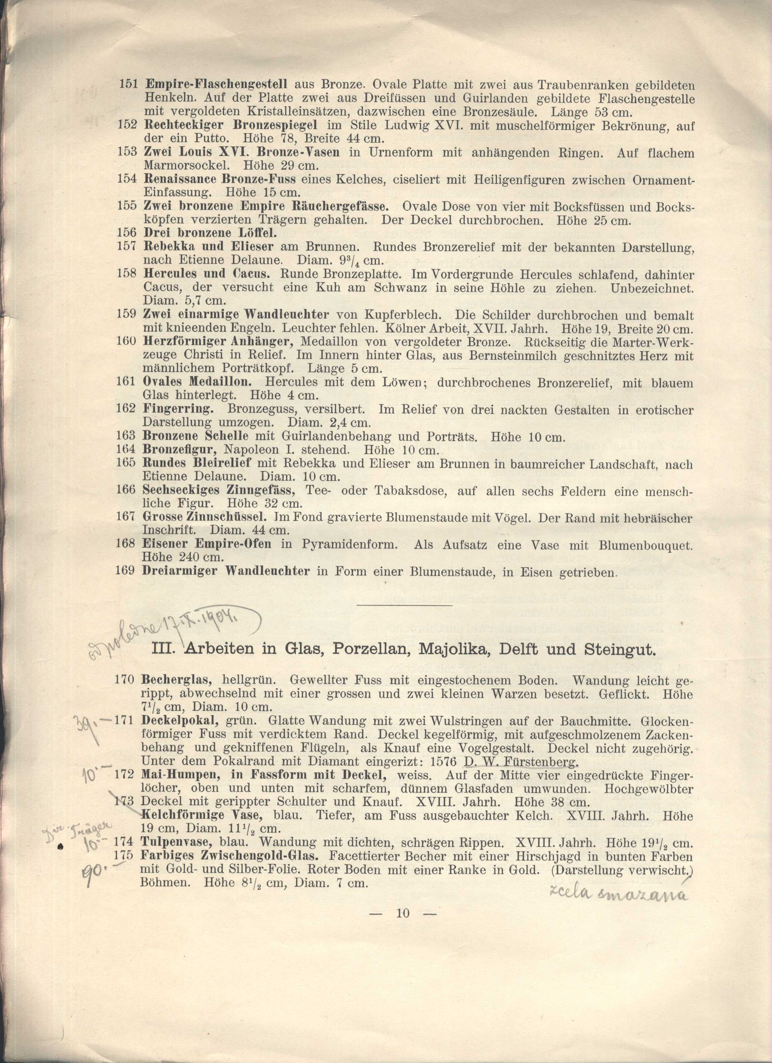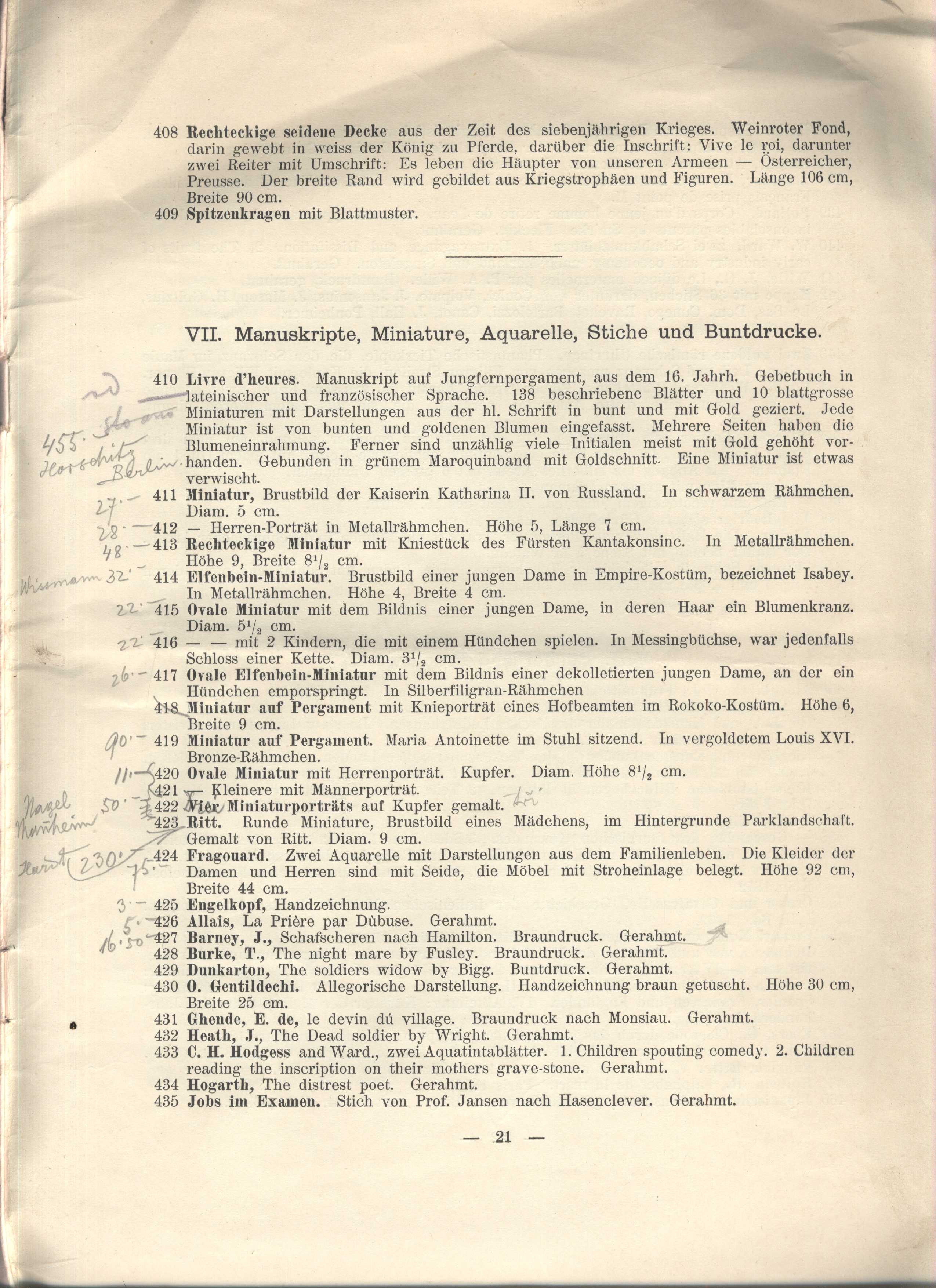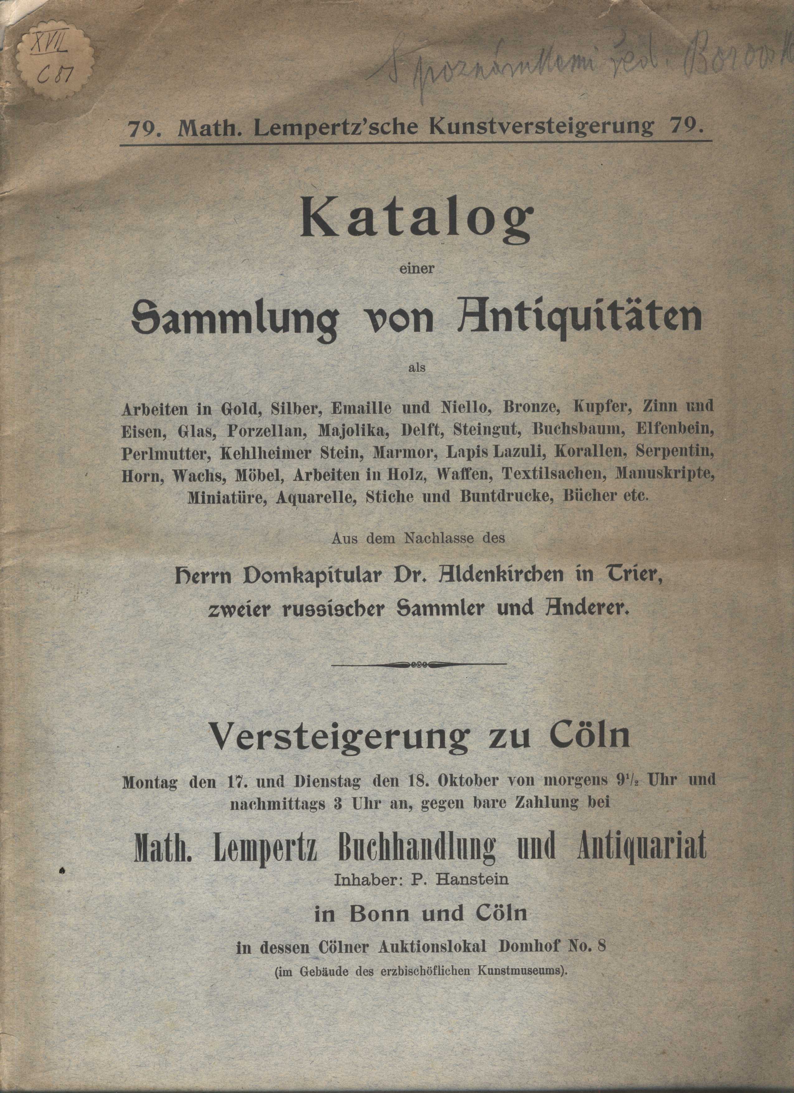 Názvové údaje Antiquariats-Katalog Nr. 173 : Kunst : Kunstgewerbe : Illustrierte Bücher Záhlaví-korpor. Der Bücherwurm. Buchhandlung. Antiquartiat. G. Lübke (Berlin, Německo) (Autor) (Nakladatel, vydavatel) Nakladatel Berlin : Der Bücherwurm, [po r. 1922] Rozsah 114 s. Klíčová slova německá literatura * katalog * stol. 20., léta 20. * katalog knih * antikvariáty * umělecká literatura * umělecká publikace * umělecký průmysl Počet ex. 1, z toho volných 1 Druh dok. monografie Signatura KaG XVII C 275 Názvové údaje XIV=14. aukce : Knihovna Arnošta Procházky : třetí část : 4. a 5. května 1928 : hotel "Beránek" na Kr. Vinohradech / [sestavili Miloslav Novotný a Karel Zink ; obálku a frontispic do dřeva ryl František Kobliha ; kromě obyčejného vydání vytištěno 50 exemplářů na holandském ručním papíru s původním leptem T. F. Šimona] Záhlaví-akce XIV=14. aukce (Knihovna Arnošta Procházky) (část třetí) (4.-5. 5. 1928 : Hotel Beránek, Praha, Česko) Další autoři Zink, Karel, 1889-1975 (Sestavovatel, kompilátor) (Nakladatel, vydavatel) (Autor podpisu) Novotný, Miloslav, 1894-1966 (Sestavovatel, kompilátor) (Autor podpisu) Kobliha, František, 1877-1962 (Autor obálky) (Grafický technik) (Ilustrátor) (Autor podpisu) Šimon, Tavík František, 1877-1942 (Grafický technik) Karásek ze Lvovic, Jiří, 1871-1951 (Autor podpisu) Korp. Karel Zink (Praha, Česko) (Nakladatel, vydavatel) Státní tiskárna v Praze (Tiskař) Nakladatel V Praze : Karel Zink, 1928 Výrobce (Tiskem Státní tiskárny) Rozsah [92] s., [2] l. obr. příl. : il. Osobní hesla Procházka, Arnošt, 1869-1925 - básník, esejista, literární a výtvarný kritik, překladatel Klíčová slova česká literatura * katalog * vzácné knihy * bibliofilie * autografy * aukce * katalog knih * vzácné tisky * aukční katalog * autografy spisovatelů * aukční katalog knih * bibliofilská vydání * bibliofilské tisky * věnování * světová literatura * francouzská literatura * německá literatura * holandská literatura * rakouská literatura * polská literatura * španělská literatura * portugalská literatura * italská literatura * stol. 20., léta 20. * r. 1928 * soukromé knihovny Počet ex. 1, z toho volných 1 Druh dok. monografie Signatura KaG XVII B 30/14 Názvové údaje "Fremde Nähe" - Celan als Übersetzer : eine Ausstellung des Deutschen Literaturarchivs in Verbindung mit dem Präsidialdepartement der Stadt Zürich im Schiller-Nationalmuseum Marbach am Neckar und im Stadthaus Zürich / [Ausstellung und Katalog Axel Gellhaus ... et al. ; Photoarbeiten: Mathias Michaelis] Záhlaví-akce "Fremde Nähe" - Celan als Übersetzer (1997-1998 : Marbach (Německo), Zürich (Švýcarsko)) Další autoři Gellhaus, Axel, 1950- (Sestavovatel, kompilátor) Michaelis, Mathias (Fotograf) Nakladatel Marbach am Neckar : Deutsche Schillergesellschaft, c1997 Rozsah 623 s. : il., portréty, faksim. Osobní hesla Celan, Paul, 1920-1970 - rumunský židovský spisovatel a překladatel Klíčová slova německá literatura * němečtí spisovatelé * židovští spisovatelé * stol. 20. * Celan P. * katalogy výstav * Marbach * r. 1997-1998 Počet ex. 1, z toho volných 1 Druh dok. monografie Signatura R&AHamanovi 0047 Názvové údaje Katalog einer Sammlung von Antiquitäten : als Arbeiten in Gold, Silber, Emaille und Niello, Bronze, Kupfer, Zinn und Eisen, Glas, Porzellan, Majolika, Delft, Steingut, Buchsbaum, Elfenbein, Perlmutter, Kehlheimer Stein, Marmor, Lapis Lazuli, Korallen, Serpentin, Horn, Wachs, Möbel, Arbeiten in Holz, Waffen, Textilsachen, Manuskripte, Miniatüre, Aquarelle, Stiche und Buntdrucke, Bücher etc. : aus dem Nachlasse des Herrn domkapitular Dr. Aldenkirchen in Trier, zweir russischer Sammler und Anderer Záhlaví-akce 79. Math. Lempertz'sche Kunstversteigerung (17. - 18. 10. 1904 : Cöln) Další autoři Karásek ze Lvovic, Jiří, 1871-1951 (Autor podpisu) Borovský, František Adolf, 1852-1933 (Autor podpisu) (Dřívější majitel) Korp. Kunsthaus Lempertz (nakladatelství) (Nakladatel, vydavatel) Karl Georgi, Universitäts Buchdruckerei und Verlag, Bonn (Tiskař) Nakladatel Bonn ; Cöln : Math. Lempertz, [1904] Výrobce Karl Georgi, Universitäts Buchdruckerei) Rozsah 23 s. : il. Klíčová slova německá literatura * aukce * aukční katalogy * katalog * katalogy Počet ex. 1, z toho volných 1 Druh dok. monografie Signatura KaG XVII C 81 Názvové údaje Ve světle pravdy : poselství Grálu. Svazek 1 / Abd-ru-shin Autor Abd-ru-shin, 1875-1941 (Autor) Nakladatel Vomperberg, Tirol : Nakladatelství Alexander Bernhardt, 1967 Rozsah stran ; 23,5 cm Klíčová slova německá literatura * filozofie ducha * duchovní literatura * mysticismus * víra * esoterismus Počet ex. 1, z toho volných 1 Druh dok. monografie Signatura M 193 a 21/I Názvové údaje Ve světle pravdy : poselství Grálu. Svazek 2 / Abd-ru-shin Autor Abd-ru-shin, 1875-1941 (Autor) Nakladatel Vomperberg, Tirol : Nakladatelství Alexander Bernhardt, 1977 Rozsah 424 stran ; 23,5 cm Klíčová slova německá literatura * filozofie ducha * duchovní literatura * mysticismus * víra * esoterismus Počet ex. 1, z toho volných 1 Druh dok. monografie Signatura M 193 a 21/II Názvové údaje Ve světle pravdy : poselství Grálu. Svazek 3 / Abd-ru-shin Autor Abd-ru-shin, 1875-1941 (Autor) Nakladatel Vomperberg, Tirol : Nakladatelství Alexander Bernhardt, 1978 Rozsah 468 stran ; 23,5 cm Klíčová slova německá literatura * filozofie ducha * duchovní literatura * mysticismus * víra * esoterismus Počet ex. 2, z toho volných 1, prezenčně 1 Druh dok. monografie Signatura N/A, M 193 a 21/III Názvové údaje Alt-Wien : die Geschichte seiner Kunst : mit 4 Heliogravüren und 36 Vollbildern / von Ludwig W. Abels Osobní jméno Abels, Ludwig W. (Autor) Další autoři Brandstetter, Oscar, činný 1880-1939 (Tiskař) Karásek ze Lvovic, Jiří, 1871-1951 (Autor podpisu) Kor