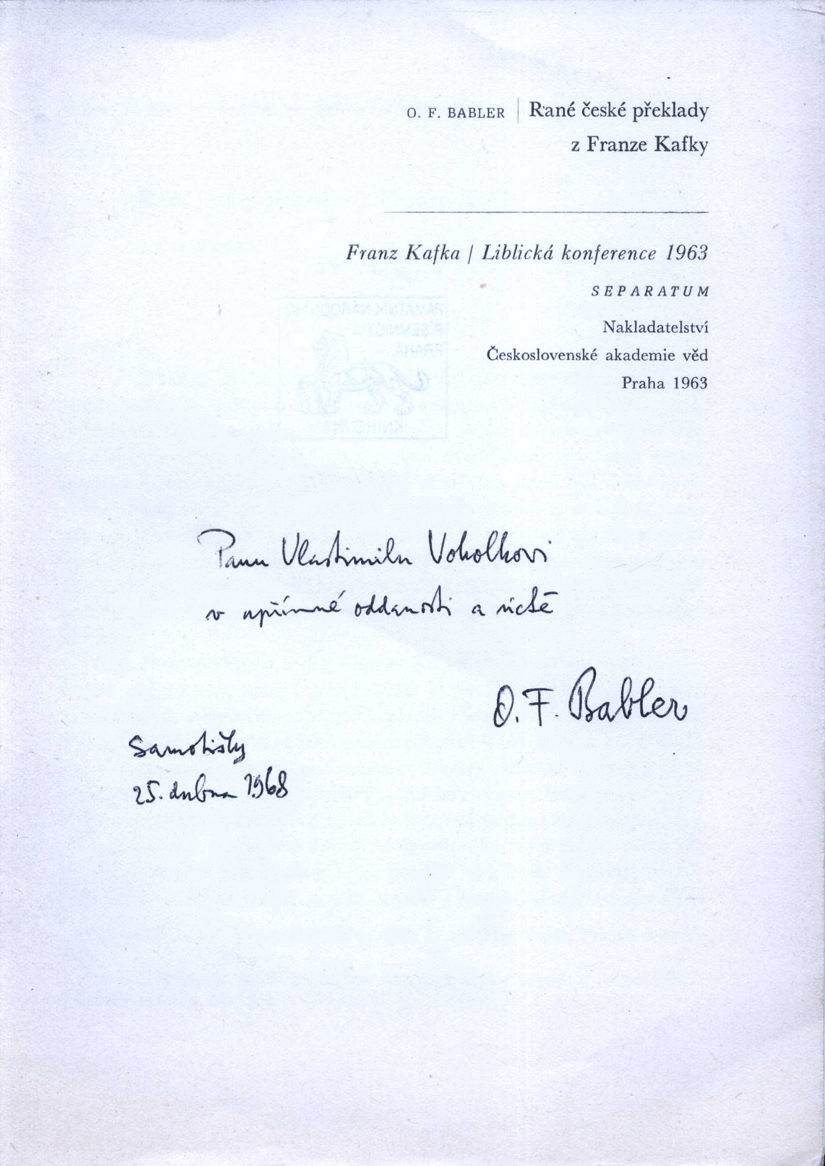 Názvové údaje Adalbert Stifter 2000 : "Překračování hranic" : česko-rakousko-německé sympozium o Adalbertu Stifterovi : Český Krumlov 2000 / redakce Johann Lachinger a Ivan Slavík. [překlad Ivan Slavík] Záhlaví-akce Adalbert Stifter 2000 - "Překračování hranic" (2000 : Český Krumlov, Česko) Další autoři Lachinger, Johann, 1939-2016 (Tiskař) Slavík, Ivan, 1920-2002 (Tiskař) (Překladatel) Korp. Adalbert Stifter-Institut des Landes Oberösterreich (Linec (Rakousko)) (Nakladatel, vydavatel) (Organizátor akce) Nakladatel Český Krumlov : Contract, 2004 Rozsah 80 s. : il. Osobní hesla Stifter, Adalbert, 1805-1868 - rakouský spisovatel a básník, malíř, pedagog Klíčová slova rakouská literatura * rakouská próza * překlady * česká literatura * sborník * sympozium * literárněvědné rozbory * rakouští spisovatelé * stol. 19. * německy píšící spisovatelé * Stifter A. * Český Krumlov * Česko * r. 2000 Počet ex. 1, z toho volných 1 Druh dok. monografie Signatura C12c 2859 Názvové údaje Le travail du style enseigné par les corrections manuscrites des grands écrivains / Antoine Albalat Osobní jméno Albalat, Antoine, 1856-1935 (Autor) Nakladatel Paris : Armand Colin, 1909 Rozsah 312 stran ; 17 cm Klíčová slova francouzští spisovatelé * stol. 17.-19. * německy píšící spisovatelé * stol. 18. * literární texty * vypravěčské techniky * studie * dokumenty Počet ex. 1, z toho volných 1 Druh dok. monografie Signatura V IX f 35 Názvové údaje Franz Kafka / R.-M. Albérès et Pierre de Boisdeffre Osobní jméno Albérès, René Marill, 1921-1982 Další autoři Boisdeffre, Pierre de, 1926-2002 (Autor) Nakladatel Paris : Éditions Universitaires, 1960. Rozsah 126 stran : ilustrace Osobní hesla Kafka, Franz, 1883-1924 - pražský německý spisovatel Klíčová slova pražští němečtí spisovatelé * německy píšící spisovatelé * židovští spisovatelé * pražská německá literatura * studie * biografická data * bibliografie Počet ex. 3, z toho volných 3 Druh dok. monografie Signatura M 173 f 74, M 141 e 21, M 87 f 13 Názvové údaje Středoevropští spisovatelé v exilu : H.G. Adler, Elias Canetti a Franz Baermann Steiner / zpracoval Marcel Atze ; česká verze Eva Adlerová ; [grafická úprava Zdeněk Granát] Osobní jméno Atze, Marcel, 1967- (Autor) Další autoři Adlerová, Eva (Autor) (Překladatel) Granát, Zdeněk, 1965- (Knižní grafik) Nakladatel Brno : Barrister & Principal, 2000 Rozsah 175 s., [16] s. obr. příl. : il., portréty, faksim. Osobní hesla Adler, Hans Günther, 1910-1988 - čes. německy píšící spisovatel, literární a hudební vědec, sociolog a historik * Canetti, Elias, 1905-1994 - německy píšící romanopisec, dramatik, esejista * Steiner, Franz Baermann, 1909-1952 - antropolog, etnolog, spisovatel, překladatel Klíčová slova židovští spisovatelé * německy píšící spisovatelé * německy psaná literatura * židovská literatura * exilová literatura * Adler H. G. * Canetti E. * Steiner F. B. * životní osudy * exilový život * společnost * politika * Evropa * stol. 20. * studie Počet ex. 2, z toho volných 2 Druh dok. monografie Signatura C12b 4101, C12b 14734 Názvové údaje Rané české překlady z Franze Kafky / O. F. Babler Osobní jméno Babler, Otto František, 1901-1984 (Autor) Další autoři Nakladatelství Československé akademie věd (Nakladatel, vydavatel) Nakladatel Praha : Nakladatelství Českoslovnské akademie věd, 1963 Rozsah S. 143-150 Osobní hesla Kafka, Franz, 1883-1924 - pražský německý spisovatel Klíčová slova německy psaná literatura * německy píšící spisovatelé * Kafka F. * dílo * překladová literatura * překlady * studie * referát Počet ex. 1, z toho volných 1 Druh dok. PERIODIKA - Souborný záznam periodika Signatura C12b 14216 Názvové údaje Hermann Hesse : sein Leben und sein Werk / von Hugo Ball Osobní jméno Ball, Hugo, 1886-1927 (Autor) Další autoři Fuks, Ladislav, 1923-1994 (Autor podpisu) Nakladatel Berlin : S. Fischer Verlag, 1927 Výrobce Poeschel & Trepte) Rozsah 242 s., [14] obr. příl. Osobní hesla Hesse, Hermann, 1877-1962 - švýcarský prozaik, básník, esejista Klíčová slova německy píšící spisovatelé * Švýcarsko * život a dílo Počet ex. 1, z toho volných 1 Druh dok. monografie Signatura Fuks 0253 Názvové údaje Adolph Donath (1876-1937) : parcours d´un intellectuel juif germanophone : Vienne-Berlin-Prague / Doris Bensimon Osobní jméno Bensimon, Doris, 1924- (Autor) Nakladatel Paris : L´Harmattan, 2000 Rozsah 302 s. Osobní hesla Donath, Adolf, 1876-1937 - umělecký kritik, redaktor, protinacistické spisy a literatura o uměleckém sběratelství Klíčová slova německy píšící spisovatelé * básníci * literární kritici * historici umění * stol. 19., léta 90.-stol. 20., léta 20. * Vídeň * Československo * Praha * stol. 20., léta 30. * kulturní činnost * biografie Počet ex. 1, z toho volných 1 Druh dok. monografie Signatura C12b 14089 Názvové údaje Exil-Literatur, 1933-1945 : Ausstellung, Mai bis August 1965 / Ausstellung und Katalog: Werner Berthold; Mitarbeiterin: Christa Wilhelmi Záhlaví-korpor. Deutsche Bibliothek (nakladatelství) (Organizátor akce) Další autoři Berthold, Werner, 1921- (Autor) Wilhelmi, Christa (Spolupracovník) Korp. Die Deutsche Bibliothek (Frankfurt am Main) (Nakladatel, vydavatel) Nakladatel Frankfurt am Main : Deutschen Bibliothek, 1965 Výrobce Druck: Johannes Weisbecker Rozsah 324 stran, 40 stran obrazových příloh : ilustrace, fotografie ; 21 cm Klíčová slova exilová literatura * německá literatura * nacismus * německy píšící spisovatelé * německy psaná literatura * výstavy * katalogy výstav * stol. 20., 1. pol. Počet ex. 2, z toho volných 2 Druh dok. monografie Signatura R XVIII g 32, C12b 19183 Názvové údaje Bibliographisches Handbuch der Barockliteratur : hundert
