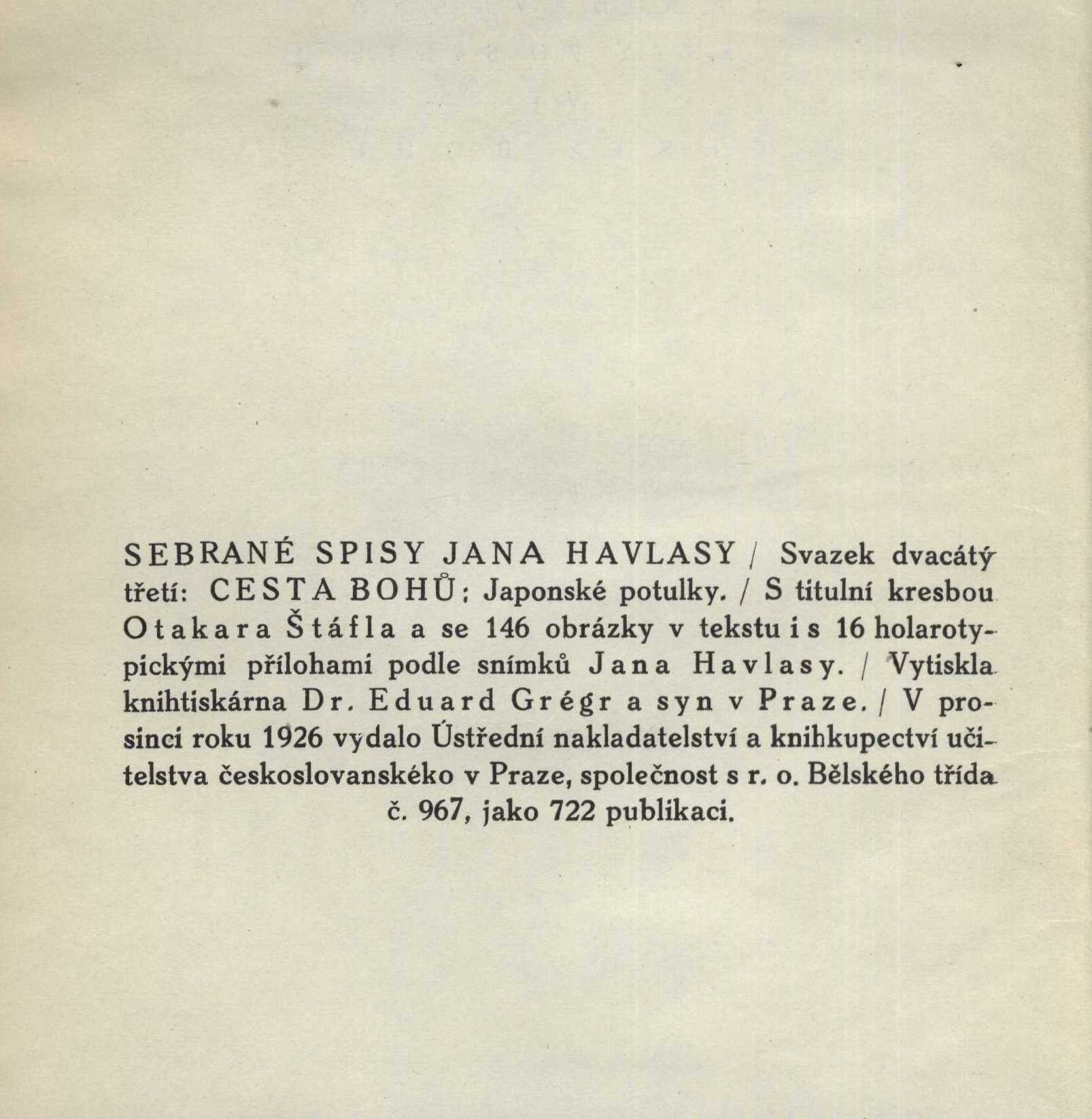 Názvové údaje Čechy. Díl X, Krušné hory a Poohří / společnou prací spisovatelův a umělců českých ; sepsal B. Bernau ; vede Alois Jirásek Osobní jméno Bernau, Bedřich, 1849-1904 (Autor) Další autoři Jirásek, Alois, 1851-1930 (Editor) Korp. Nakladatelství Jan Otto (Nakladatel, vydavatel) Nakladatel Praha : Otto, 1896 Rozsah 361 s., [24] obr. příl. : il. Geografické heslo Krušné hory (Česko a Německo : oblast) * Krušné hory (Česko a Německo) * Poohří (Česko) Klíčová slova severozápadní Čechy * vlastivěda kraje * historie kraje * historická geografie * města * hrady * pamětihodnosti * přírodní zajímavosti * historický místopis * vlastivědný sborník Počet ex. 1, z toho volných 1 Druh dok. monografie Signatura PS 0 Názvové údaje Strana Prometeja / K.A. Čcheidze Osobní jméno Čcheidze, Konstantin A., 1897-1974 (Autor) Nakladatel Nal'čik : Poligrafservis i T, 2004 Rozsah 264 s. : il. Klíčová slova gruzínská literatura * próza * příběhy lidí * život lidu * přírodní zajímavosti Počet ex. 1, z toho volných 1 Druh dok. monografie Signatura C12b 14593 Názvové údaje Demänovské jaskyne a zaujímavosti krasu v okolí / Anton Droppa Osobní jméno Droppa, Anton, 1920-2013 (Autor) Nakladatel Bratislava : Šport, 1959 Rozsah 147 s. : 40 s. obr. příl., [5] volných mp. příl. Klíčová slova Slovensko * příroda * přírodní zajímavosti * životní prostředí * jeskyně Počet ex. 1, z toho volných 1 Druh dok. monografie Signatura M 175 g 13 Názvové údaje Rytíři svatého Jana, aneb, Duše jihočeské krajiny kolem Radomyšle / Ondřej Fibich ; [všechny fotografie pořídila Ivana Řandová, mimo fotografie na obálce (Václav Jelínek) ; ilustrační perokresby Tomáš Němejc] Osobní jméno Fibich, Ondřej, 1954- (Autor) Další autoři Řandová, Ivana, 1965- (Fotograf) Němejc, Tomáš (Ilustrátor) Nakladatel Písek : Praam, 2005 Rozsah 248 s. : il. (některé barev.), mapy, faksim. ; 20 cm Geografické heslo Radomyšl-oblast (Česko) Klíčová slova jižní Čechy * architektonické památky * přírodní zajímavosti * historie kraje * česká próza * pověsti * příběhy * vyprávění Počet ex. 1, z toho volných 1 Druh dok. monografie Signatura C12b 11615 Názvové údaje Gemälde von Sicilien : mit Abbildungen / nach De Lasalle Osobní jméno Gigault de La Salle, Achille Étienne, 1772-1855 (Autor) Další autoři Verlag von Siegmund Schmerber (Nakladatel, vydavatel) Nakladatel Frankfurt am Main : Verlag von Siegmund Schmerber, 1837 Rozsah 160 s., [24] listů obrazových příloh na různých místech : il. Klíčová slova cestopisy * Itálie * Sicílie * obrazové publikace * architektonické památky * přírodní zajímavosti * historie Počet ex. 1, z toho volných 0 Druh dok. monografie Signatura KaG I A2 42 Názvové údaje Cesta bohů : [japonské potulky : 1912 - 1926] / Jan Havlasa ; [s titulní kresbou Otakara Štáfla ; a se 146 obrázky v tekstu [sic] i s 16 holarotypickými přílohami podle snímků Jana Havlasy] Osobní jméno Havlasa, Jan, 1883-1964 (Autor) (Fotograf) Další autoři Štáfl, Otakar, 1884-1945 (Ilustrátor) Korp. Ústřední nakladatelství a knihkupectví učitelstva českoslovanského (Praha, Česko) (Nakladatel, vydavatel) Dr. Ed. Grégr a syn (nakladatelství, tiskárna) (Tiskař) Nakladatel V Praze : Ústřední nakladatelství a knihkupectví učitelstva českoslovanského, 1926 Výrobce (Dr. Eduard Grégr a syn) Rozsah 410 s., [16] obr. příl. : il. ; 24 cm Klíčová slova Japonsko * obyvatelstvo * způsob života * příroda * přírodní zajímavosti * náboženství * cestování * cestopisné reportáže * cestopisné vyprávění * autobiografické vyprávění * r. 1912-1926 Počet ex. 1, z toho volných 1 Druh dok. monografie Signatura VMartínek 0998 Názvové údaje Malajské léto / Jan Havlasa ; s titulní kresbou Otakara Štáfla ; a se 150 obrázky v textu i s 10 holarotypickými přílohami podle snímků Jana Havlasy Osobní jméno Havlasa, Jan, 1883-1964 (Autor) (Fotograf) (Ilustrátor) Další autoři Štáfl, Otakar, 1884-1945 (Ilustrátor) (Autor obálky) Mikulová, Helena, 1948-2020 (Dřívější majitel) (Dárce) Korp. Ústřední nakladatelství a knihkupectví učitelstva českoslovanského (Praha, Česko) (Nakladatel, vydavatel) Dr. Ed. Grégr a syn (nakladatelství, tiskárna) (Tiskař) Nakladatel V Praze : Ústřední nakladatelství a knihkupectví učitelstva českoslovanského, 1926 Výrobce (Dr. Ed. Grégr a syn) Rozsah 361 stran, 10 nečíslovaných listů obrazových příloh : ilustrace ; 24 cm Klíčová slova Malajsie * tropy * přírodní podmínky * Orient * Asie * přírodní zajímavosti * obyvatelstvo * náboženství * život * cestopisné reportáže * cestopisné vyprávění * autobiografické vyprávění * r. 1912-1925 Počet ex. 2, z toho volných 2 Druh dok. monografie Signatura VMartínek 0997, C12c 5693 Názvové údaje V brazilských horách / Jan Havlasa ; s titulní kresbou Otakara Štáfla ; a 140 obázky v textu i s 12 holarotypickými přílohami podle snímků Jana Havlasy Osobní jméno Havlasa, Jan, 1883-1964 (Autor) (Fotograf) Další autoři Štáfl, Otakar, 1884-1945 (Ilustrátor) Mikulová, Helena, 1948-2020 (Dárce) (Dřívější majitel) Korp. Ústřední nakladatelství a knihkupectví učitelstva českoslovanského (Praha, Česko) (Nakladatel, vydavatel) Dr. Ed. Grégr a syn (nakladatelství, tiskárna) (Tiskař) Nakladatel V Praze : Ústřední nakladatelství a knihkupectví učitelstva českoslovanského, 1925 Výrobce Dr. Ed. Grégr a syn Rozsah 342 stran, 12 nečíslovaných listů obrazových příloh : ilustrace ; 23 cm Klíčová slova Brazílie * příroda * přírodní krásy * přírodní zajímavosti * způsob života * brazilští Indiáni * cestopisy * cestopisné reportáže * cestopisné příběhy * r. 1920-1924 Počet ex. 2, z toho volných 2 Druh dok. monografie
