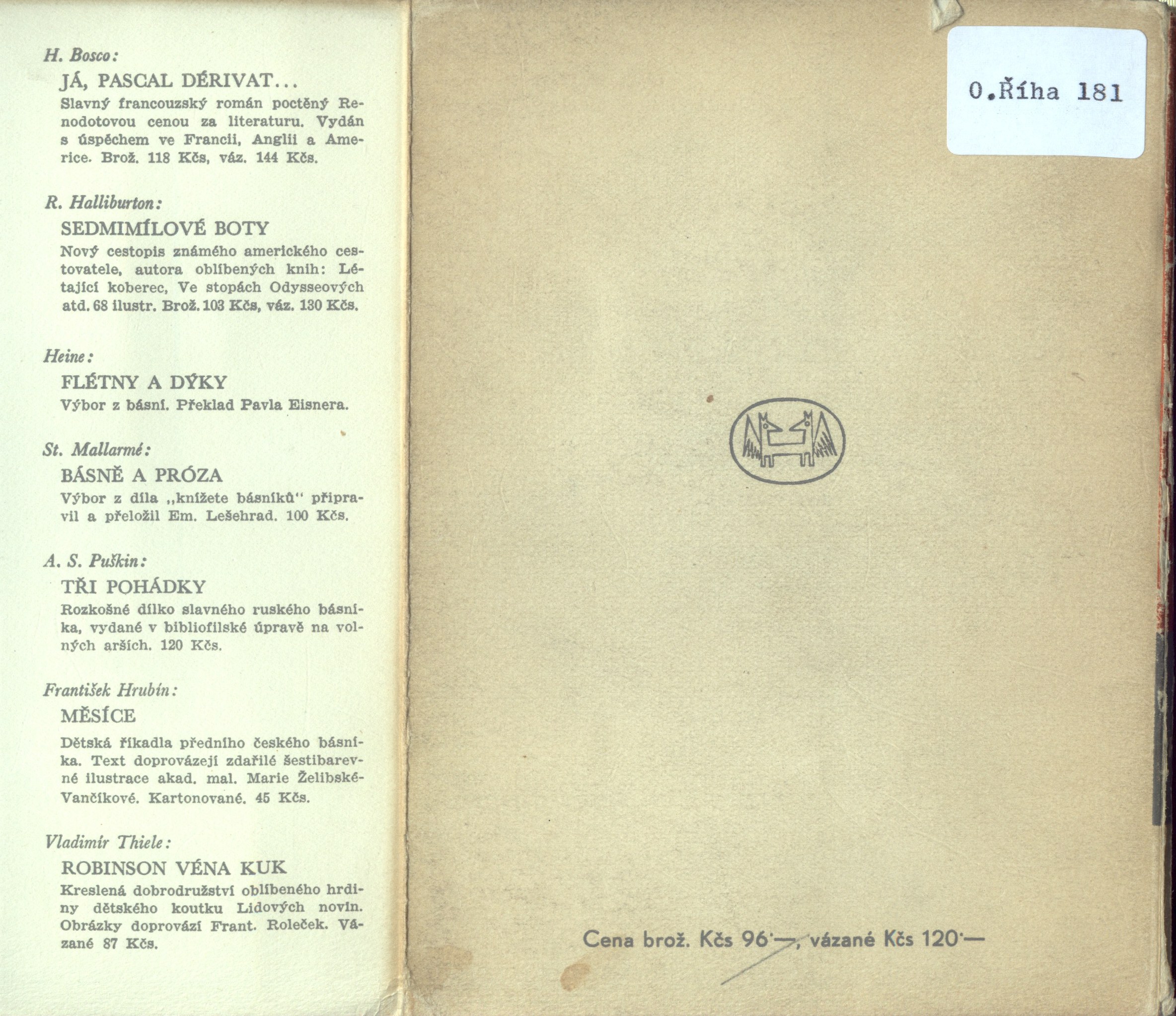 Názvové údaje Demokracie a jedinec / Carleton Kemp Allen ; z anglického originálu ... přeložil Antonín Dryák ; návrh obálky Jaroslav Šváb Osobní jméno Allen, Carleton Kemp, 1887-1966 (Autor) Další autoři Dryák, Antonín (Překladatel) Šváb, Jaroslav, 1906-1999 (Autor obálky) Korp. Melantrich (nakladatelství) (Nakladatel, vydavatel) Nakladatel V Praze : Melantrich, 1948 Výrobce Melantrich Rozsah 89 stran ; 22 cm Předmětová hesla demokracie * člověk a společnost Klíčová slova anglická literatura * demokracie * demokratická společnost * studie * pojmy Počet ex. 2, z toho volných 2 Druh dok. monografie Signatura MEL 1181, M 41 f 44 Názvové údaje Kategorie / Aristoteles ; přeložil Antonín Kříž ; poznámkovým komentářem opatřili Antinín Kříž a Karel Berka Autor Aristotelés, 384-322 př. Kr. (Autor adaptace, upravovatel) Další autoři Berka, Karel, 1923-2004 (Autor úvodu atd.) (Autor komentáře) Kříž, Antonín, 1889-1965 (Autor komentáře) (Překladatel) Korp. Nakladatelství Československé akademie věd (Nakladatel, vydavatel) Rudé právo (tiskárna, Praha) (Tiskař) Nakladatel Praha : Nakladatelství Československé akademie věd, 1958 Výrobce Rudé právo Rozsah 75 stran ; 21,5 cm Osobní hesla Aristotelés, 384-322 př. Kr. - řecký filozof Klíčová slova antická filozofie * řecká filozofie * platónská filozofie * filozofické pojmy * kategorie * filozofické pojmy Počet ex. 5, z toho volných 5 Druh dok. monografie Signatura Patočka 0124, M 147 f 42, Janeček 476, Knytl 31?, Eisner 1295 Názvové údaje Kniha definic / Ibn Síná (Avicenna) ; z arabského originálu "Risálat fíl-Hudúd", Pojednání o definicích, přeložila Jarmila Štěpková ; výtvarně spolupracoval, obálku a vazbu navrhl Zdeněk Rossmann Autor Avicenna, 980-1037 (Autor) Další autoři Štěpková, Jarmila, 1926-1997 (Překladatel) Rossmann, Zdeněk, 1905-1984 (Autor obálky) Nakladatel V Praze : Státní nakladatelství politické literatury, n.p., 1954 Výrobce Rudé právo Rozsah 133 stran, 2 nečíslované listy obrazových příloh ; 21 cm Klíčová slova arabská filozofie * výroky * pojmy * hlediska * náboženská hlediska * historie * stol. 16. Počet ex. 2, z toho volných 2 Druh dok. monografie Signatura Šafář 088, J X V 26 Názvové údaje Malá liturgika / [úspořádal P. Josef Beneš ; obrázky kreslil Bohumil Lonek] Osobní jméno Beneš, Josef, 1905-1979 (Sestavovatel, kompilátor) Další autoři Lonek, Bohumil, 1903-1998 (Ilustrátor) Korp. Katolická církev. Česká katolická charita (Nakladatel, vydavatel) Nakladatel Praha : Vyšehrad, 1952 Výrobce Knihtiskem Jihočeské tiskárny 20) Rozsah 67 s. ; 8° Klíčová slova katolická církev * liturgika * pojmy Počet ex. 1, z toho volných 1 Druh dok. monografie Signatura C12a 3829 Názvové údaje Sociologie inteligence / Arnošt Bláha Osobní jméno Bláha, Arnošt Inocenc, 1879-1960 (Autor) Další autoři Orbis (tiskárna) (Nakladatel, vydavatel) Nakladatel V Praze : Orbis, 1937 Výrobce knihtiskárna Orbis) Rozsah 395 s. Klíčová slova česká literatura * vědecké pojednání * sociologie * inteligence * charakteristika * pojmy * funkce * typy * r. 1937 Počet ex. 2, z toho volných 2 Druh dok. monografie Signatura MUK 1524, Teige 113 Názvové údaje Přehled pojmů z českého jazyka a literatury / Radoslava Brabcová, Simona Pišlová Osobní jméno Kvapilová Brabcová, Radoslava, 1935-2021 (Autor) Další autoři Pišlová, Simona, 1952- (Autor) Nakladatel Jinočany : H & H, c1992 Rozsah 101 s. Klíčová slova český jazyk česká literatura slovník pojmů jazykové pojmy literární pojmy Počet ex. 2, z toho volných 2 Druh dok. monografie Signatura C12b 5740, C12b 7593 Názvové údaje Filozofický slovník = Dictionnaire de philosophie / Gérard Durozoi, André Roussel ; [z francouzštiny přeložil Jan Binder ... [et al.] ; grafická úprava a vazba Jiřina Perglová] Osobní jméno Durozoi, Gérard, 1942-2023 (Autor) Další autoři Roussel, André, 1923- (Autor) Binder, Jan, 1927-2012 (Překladatel) Perglová, Jiřina (Grafický technik) (Výtvarník vazby) Nakladatel Praha : Ewa, 1994 Výrobce Moravská tiskárna) Rozsah 352 s. : il Klíčová slova filozofické pojmy * filozofické směry * světoví filozofové * abecední slovník Počet ex. 1, z toho volných 1 Druh dok. monografie Signatura PS Názvové údaje Čeština poklepem a poslechem / Pavel Eisner ; [obálku a vazbu navrhl Jaroslav Šváb] Osobní jméno Eisner, Pavel, 1889-1958 (Autor) Další autoři Šváb, Jaroslav, 1906-1999 (Autor obálky) (Výtvarník vazby) Korp. Jaroslav Podroužek (nakladatelství) (Nakladatel, vydavatel) Cíl (tiskárna v Praze) (Tiskař) Nakladatel Praha : Jaroslav Podroužek, 1948 Výrobce knihtiskárna Cíl) Rozsah 369, [3] s. ; 17,7 cm Klíčová slova česká literatura * studie * čeština * pojmy * jazykovědná studie * populárně naučná literatura Počet ex. 1, z toho volných 1 Druh dok. monografie Signatura OŘíha 181 Názvové údaje Archeologie vědění / Michel Foucault ; [z francouzského originálu ... přeložil Čestmír Pelikán] Osobní jméno Foucault, Michel, 1926-1984 (Autor) Další autoři Pelikán, Čestmír (Překladatel) Nakladatel V Praze : Herrmann & synové, 2002 Rozsah 315 s. Klíčová slova francouzská literatura * dějiny vědy * pojednání * vědecká metodologie * kritika * definice * pojmy * Francie * stol. 20., léta 70. Počet ex. 1, z toho volných 1 Druh dok. monografie Signatura C12a 2410