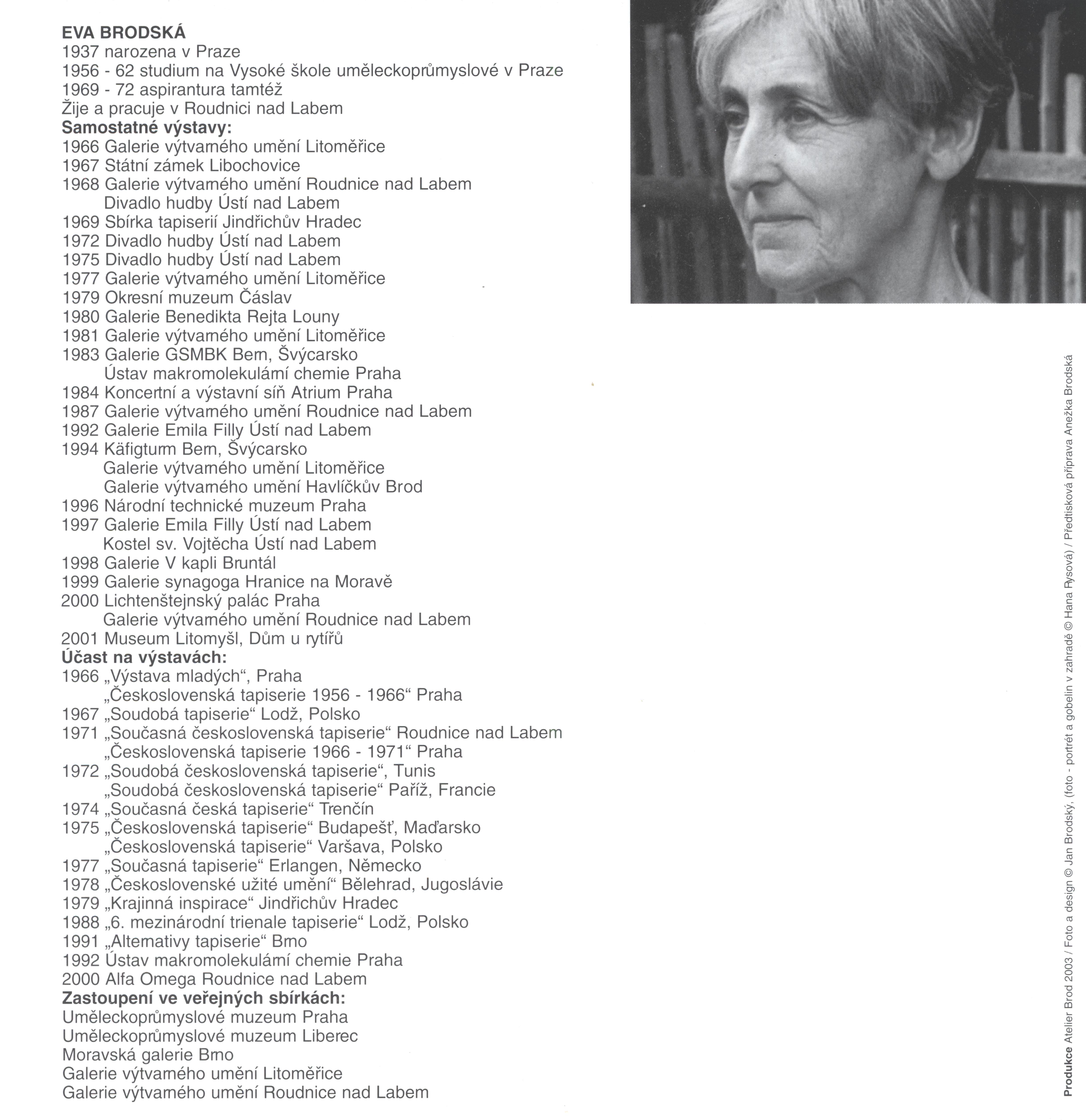 Názvové údaje Václav Boštík, Jan Křížek, Jiří Mrázek : Galerie Benedikta Rejta v Lounech, 15.11. 2003-25.1. 2004 / [text: Jaromír Zemina, Jiří Mrázek ; foto: Vasil Stanko, Rudo Prekop] Osobní jméno Boštík, Václav, 1913-2005 (Umělec) Další autoři Křížek, Jan, 1919-1985 (Umělec) Mrázek, Jiří, 1920-2008 (Umělec) (Autor úvodu atd.) Zemina, Jaromír, 1930- (Autor úvodu atd.) Stanko, Vasil, 1962- (Fotograf) Prekop, Rudo, 1959- (Fotograf) Korp. Galerie Benedikta Rejta (Louny, Česko) (Nakladatel, vydavatel) (Jiná role) Nakladatel V Lounech : Galerie Benedikta Rejta, 2003 Rozsah [40] s. : barev. il. ; 21 cm Osobní hesla Boštík, Václav, 1913-2005 - malíř, grafik * Křížek, Jan, 1919-1985 - sochař, grafik, malíř, kreslíř * Mrázek, Jiří, 1920-2008 - výtvarník, malíř Chronologie 20. stol. Předmětová hesla české výtvarné umění - 20. stol * moderní umění - Česko Klíčová slova katalog výstavy * české výtvarné umění * moderní umění * čeští výtvarní umělci * Boštík V. * Křížek J. * Mrázek J. * Louny * Česko * r. 2003-2004 Počet ex. 1, z toho volných 1 Druh dok. monografie Signatura EJulis 0690 Názvové údaje Eva Brodská : kresby, akvarely, gobelíny / [báseň Zdeněk Kirschner ; foto a design Jan Brodský] Osobní jméno Brodská, Eva, 1937- (Umělec) Další autoři Kirschner, Zdeněk, 1928-2024 (Autor úvodu atd.) Brodský, Jan, 1952- (Fotograf) (Grafický technik) Nakladatel [Česko] : Atelier Brod, 2003 Rozsah [12] s. : il. Osobní hesla Brodská, Eva, 1937- - akademická malířka, textilní výtvarnice, grafička Klíčová slova katalog výstavy * autorský katalog * české výtvarné umění * moderní umění * textilní umění * kresby * akvarely * gobelíny * čeští výtvarní umělci * Brodská E. * Česko * r. 2003 Počet ex. 1, z toho volných 1 Druh dok. monografie Signatura EJulis 0680 Názvové údaje Josef Čapek - Nejskromnější umění = The humblest art : [Obecní dům v Praze 3.12.2003-29.2.2004 : Místodržitelský palác, Moravská galerie v Brně 26.3-23.5.2004 / [autorka koncepce publikace a textů Alena Pomajzlová ; překlad do angličtiny Branislava Kuburović ; grafická úprava Juraj Horváth] Osobní jméno Čapek, Josef, 1887-1945 (Autor) Další autoři Pomajzlová, Alena, 1955- (Sestavovatel, kompilátor) Kuburović, Branislava, 1969- (Překladatel) Horváth, Juraj, 1974- (Knižní grafik) Korp. Josef Čapek : nejskromnější umění (2004 : Praha (Česko)) Nakladatel Praha : Obecní dům, 2003 Rozsah 199 s. : il. Osobní hesla Čapek, Josef, 1887-1945 - malíř, grafik, scénický výtvarník a spisovatel Klíčová slova české malířství * čeští malíři * Čapek J. * obrazy * ilustrace * výstava * r. 2003 Počet ex. 3, z toho volných 3 Druh dok. monografie Signatura C12d 863, NK /03 04, NK /03 04a Názvové údaje Dny poezie Broumov 2003 : sborník veršů účastníků 4. Dnů poezie v Broumově 26.-28.září 2003 / [ilustrace a obálka Miroslav Hartych ; překlad básní polských autorů Ondřej Parus, Věra Kopecká] Záhlaví-akce Dny poezie (4._: 2003_: Broumov, Česko Další autoři Hartych, Miroslav, 1953- (Ilustrátor) Parus, Ondřej, 1980- (Překladatel) Kopecká, Věra, 1951- (Překladatel) (Editor) Nakladatel Broumov : Volné seskupení broumovských autorů, 2003 Rozsah 111 s. : il. Klíčová slova literatura * poezie * sborníky * literární festival * česká poezie * polská poezie * Broumov * r. 2003 Počet ex. 1, z toho volných 1 Druh dok. monografie Signatura C12a 2559 Názvové údaje ...a ráno zase do školy : Drápanda 2003 : [sborník prací z dětské literární soutěže / vybral a sestavil, obálku s použitím kresby René Pacáka a grafickou úpravu navrhl Milan Hrabal ; fotografie Petr Zápotocký ml.] Záhlaví-akce Drápanda 2003 (2003 : Varnsdorf, Česko) Další autoři Hrabal, Milan, 1954- (Sestavovatel, kompilátor) (Autor obálky) (Grafický technik) Zápotocký, Petr, ml. (Fotograf) Nakladatel Varnsdorf : Městská knihovna, 2003 Rozsah 29 s. : il. Klíčová slova literární soutěže * literární činnost * děti a mládež * r. 2003 Počet ex. 1, z toho volných 1 Druh dok. monografie Signatura C12b 7595 Názvové údaje Totaliter aliter : obrazy z let 2003-2007 / Ivan Exner ; [grafická úprava Ivan Exner] Osobní jméno Exner, Ivan, 1960- (Autor) (Umělec) (Knižní grafik) Další autoři Regulus (nakladatelství) (Nakladatel, vydavatel) Tiskárna Daniel (Tiskař) FPS Repro (firma) (Litograf) Nakladatel Praha : Nakladatelství Regulus, 2008 Výrobce (Tiskárna Daniel) Rozsah [152] s. : il. (převážně barev.) ; 31 cm Osobní hesla Exner, Ivan, 1960- - akademický malíř Předmětová hesla české malířství - 21. stol * moderní malířství - Česko Klíčová slova české výtvarné umění * monografie * Exner I. * česká malba * tvorba * r. 2003-2007 * obrazové publikace Počet ex. 1, z toho volných 1 Druh dok. monografie Signatura C12d 2089 Názvové údaje Mezery v soumraku / Třináct měsíců : pf 2004 / Petr Fabian Osobní jméno Fabian, Petr, 1974- (Autor) Nakladatel Praha ; Vlašim : Petr Fabian, 2003 Rozsah 13 s. Klíčová slova česká literatura * poezie * básně * novoroční tisk * r. 2003 Počet ex. 2, z toho volných 2 Druh dok. monografie Signatura EJulis 0086, EJulis 0467