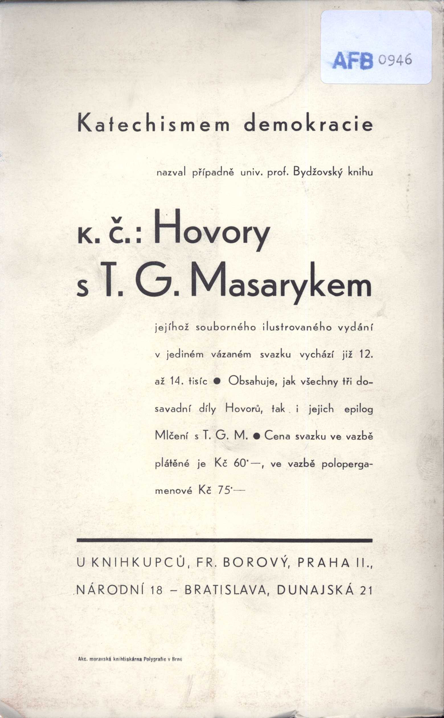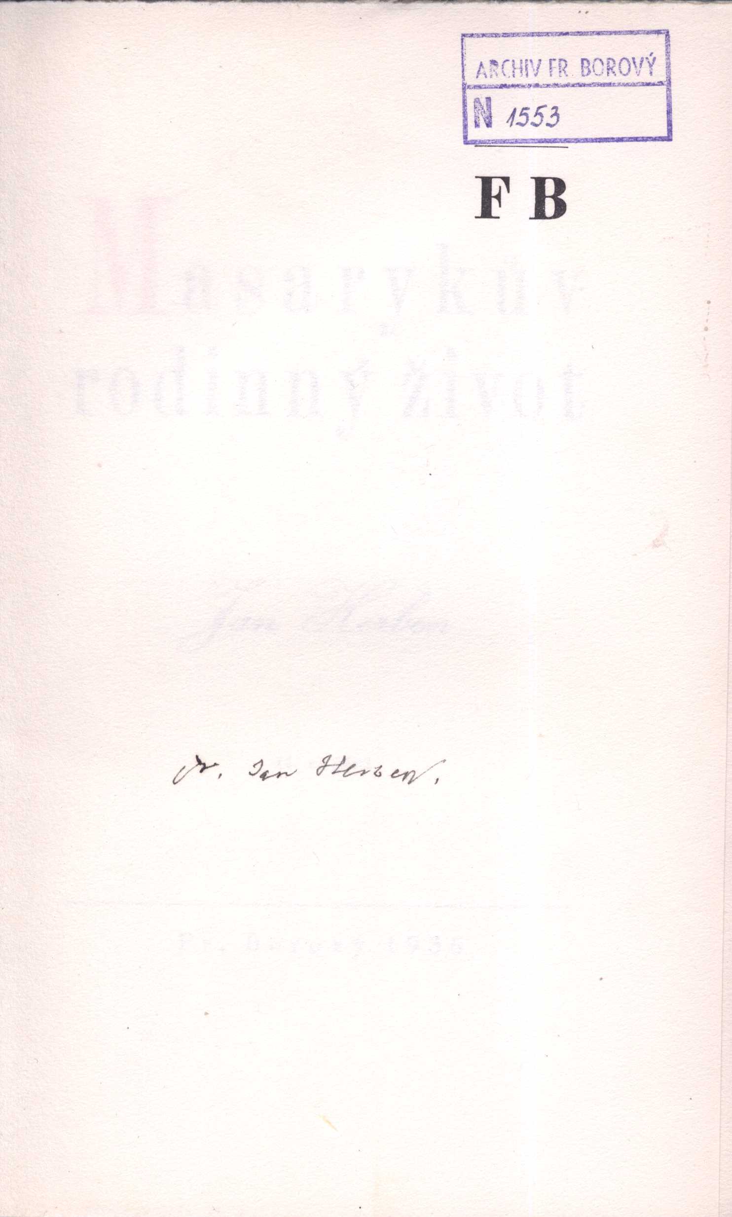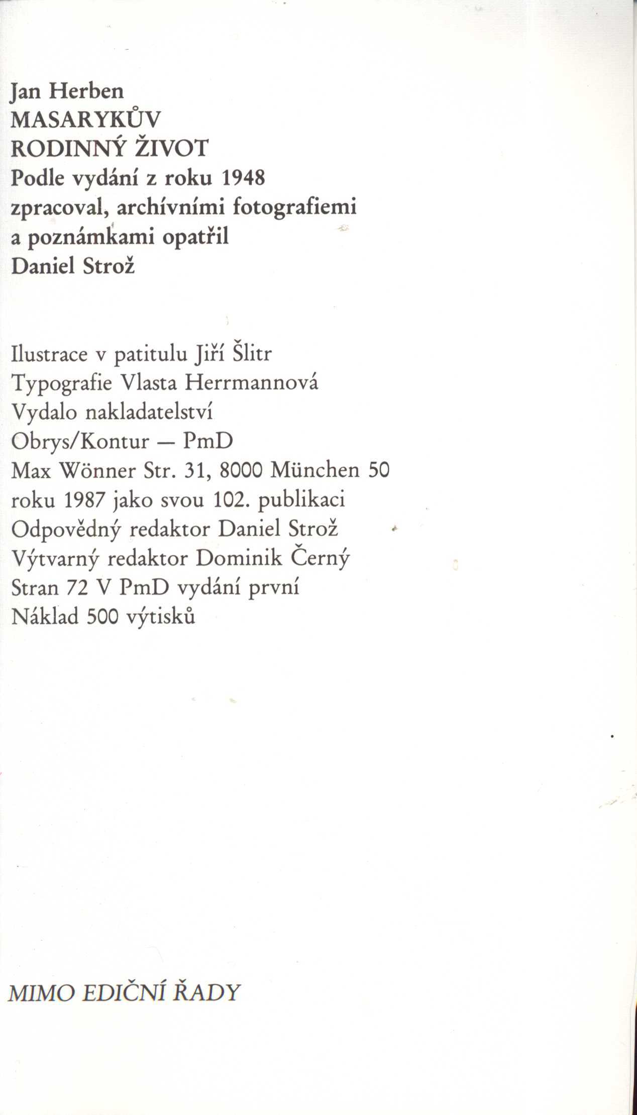 Názvové údaje Deutsches Leben im 12. und 13. Jahrhundert : Realkommentar zu den Volks- und Kunstepen und zum Minnesang. II, Privatleben / von J. Dieffenbacher Osobní jméno Dieffenbacher, Julius, 1866- (Autor) Další autoři G. J. Göschen'sche Verlagsbuchhandlung (vydavatelství a knihkupectví) (Nakladatel, vydavatel) Spamerschen Buchdruckerei (tiskárna) (Tiskař) Nakladatel Leipzig : G.J. Göschen'sche Verlagshandlung, 1907 Výrobce Spamersche Buchdruckerei Rozsah 162 stran : ilustrace, plány Klíčová slova Německo * stol. 12.-13. * kulturní život * sociologie kultury * každodenní život * osobní život * rodinný život * studie Počet ex. 1, z toho volných 1 Druh dok. monografie Signatura Šafář 101 Názvové údaje Odkud přišel bratříček? / Ellis Ethelmer ; přeložil J.L. Osobní jméno Ethelmer, Ellis (Autor) Další autoři J. L. (Překladatel) Korp. Josef Pelcl (nakladatelství) (Nakladatel, vydavatel) Edvard Leschinger (firma) (Tiskař) Nakladatel V Praze : nákladem Josefa Pelcla, 1912 Výrobce Tiskem E. Leschingra Rozsah 16 stran ; 18,5 cm Klíčová slova rodinný život * sexuální výchova * stol. 20., léta 10. * pojednání * publikace pro děti Počet ex. 1, z toho volných 1 Druh dok. monografie Signatura VMartínek 1648 Názvové údaje S Masarykovými : hrst vzpomínek / Josef Jaroslav Filipi ; [obálka a vazba Viktora Nikodema] Osobní jméno Filipi, Josef Jaroslav, 1875-1954 (Autor) Další autoři Nikodém, Viktor, 1885-1958 (Autor obálky) Korp. Čin - tiskové a nakladatelské družstvo československých legionářů (Nakladatel, vydavatel) Grafia (tiskárna, nakladatelství) (Tiskař) Nakladatel Praha : Čin, 1947 Výrobce (Grafia) Rozsah 167 s., [17] s. obr. příl. Osobní hesla Masaryk, Tomáš Garrigue, 1850-1937 - politik, první čsl. president, filosof Klíčová slova českoslovenští prezidenti * českoslovenští politici * Masaryk T. G. * Masarykovi (rodina) * rodinný život * vztahy * vzpomínky Počet ex. 1, z toho volných 1 Druh dok. monografie Signatura C12b 11975 Názvové údaje Cestovní deníky Kateřiny Jungmannové-Lauermannové z let 1841, 1845, 1849 : diplomová práce / Lucie Galbavá ; Milena Lenderová ; Univerzita Pardubice. Fakulta humanitních studií, Katedra historických věd Osobní jméno Galbavá, Lucie (Autor) Další autoři Lenderová, Milena, 1947- (Vedoucí diplomové práce nebo disertace) Korp. Univerzita Pardubice. Fakulta humanitních studií. Katedra historických věd (Pardubice) (Nakladatel, vydavatel) Nakladatel Pardubice, 2005 Rozsah 131 s. : il., mp. + 1 CD ROM Osobní hesla Jungmannová-Lauermannová, Kateřina, 1811-1889 - autorka cestovních deníků, dcera Josefa Jungmanna * Jungmann, Josef, 1773-1847 - filolog, literární historik Klíčová slova cestovní deníky * cestování * rodinný život * lázně * stol. 19. Počet ex. 1, z toho volných 1 Druh dok. diplomové/disertační práce Signatura D 0013 Názvové údaje Masarykův rodinný život / Jan Herben ; [podle vydání z roku 1948 zpracoval, archívními fotografiemi a poznámkami doplnil Daniel Strož ; ilustrace v patitulu Jiří Šlitr ; typografie Vlasta Herrmannová] Osobní jméno Herben, Jan, 1857-1936 (Autor) Další autoři Strož, Daniel, 1943- (Editor) (Autor komentáře textu) Herrmannová, Vlasta (Typograf) Korp. Poezie mimo Domov (nakladatelství) (Nakladatel, vydavatel) Nakladatel München : Obrys/Kontur - PmD Verlag, 1987 Rozsah 70 s. : il. Osobní hesla Masaryk, Tomáš Garrigue, 1850-1937 - politik, první čsl. president, filosof * Herben, Jan, 1857-1936 - novinář, publicista, spisovatel Klíčová slova česká literatura * Masaryk T. G. * Masarykovi (rodina) * rodinný život * monografie * exilová literatura Počet ex. 1, z toho volných 1 Druh dok. monografie Signatura BVolkova 0105 Názvové údaje Masarykův rodinný život / Jan Herben ; [v obálce Frant. Muziky] Osobní jméno Herben, Jan, 1857-1936 (Autor) Další autoři Muzika, František, 1900-1974 (Autor obálky) Korp. Fr. Borový (firma) (Nakladatel, vydavatel) Akciová moravská knihtiskárna Polygrafie (Tiskař) Nakladatel V Praze : Fr. Borový, 1937 Výrobce Akciová moravská knihtiskárna Polygrafie) Rozsah 66 s. ; 8° Osobní hesla Masaryk, Tomáš Garrigue, 1850-1937 - politik, první čsl. president, filosof * Masaryková-Garrigue, Charlotte, 1850-1923 - překladatelka, autorka odborných statí Klíčová slova česká literatura * Masaryk T. G. * Masaryková-Garrigue Ch. * Masarykovi (rodina) * rodinný život Počet ex. 1, z toho volných 1 Druh dok. monografie Signatura AFB 1021 Názvové údaje Masarykův rodinný život / Jan Herben ; [v obálce Frant. Muziky] Osobní jméno Herben, Jan, 1857-1936 (Autor) Další autoři Muzika, František, 1900-1974 (Autor obálky) Korp. Fr. Borový (firma) (Nakladatel, vydavatel) Akciová moravská knihtiskárna Polygrafie (Tiskař) Nakladatel V Praze : Fr. Borový, 1936 Výrobce Akciová moravská knihtiskárna Polygrafie) Rozsah 66 s. ; 8° Osobní hesla Masaryk, Tomáš Garrigue, 1850-1937 - politik, první čsl. president, filosof * Masaryková-Garrigue, Charlotte, 1850-1923 - překladatelka, autorka odborných statí Klíčová slova česká literatura * Masaryk T. G. * Masaryková-Garrigue Ch. * Masarykovi (rodina) * rodinný život Počet ex. 2, z toho volných 2 Druh dok. monografie Signatura AFB 0946, AFB 0946a