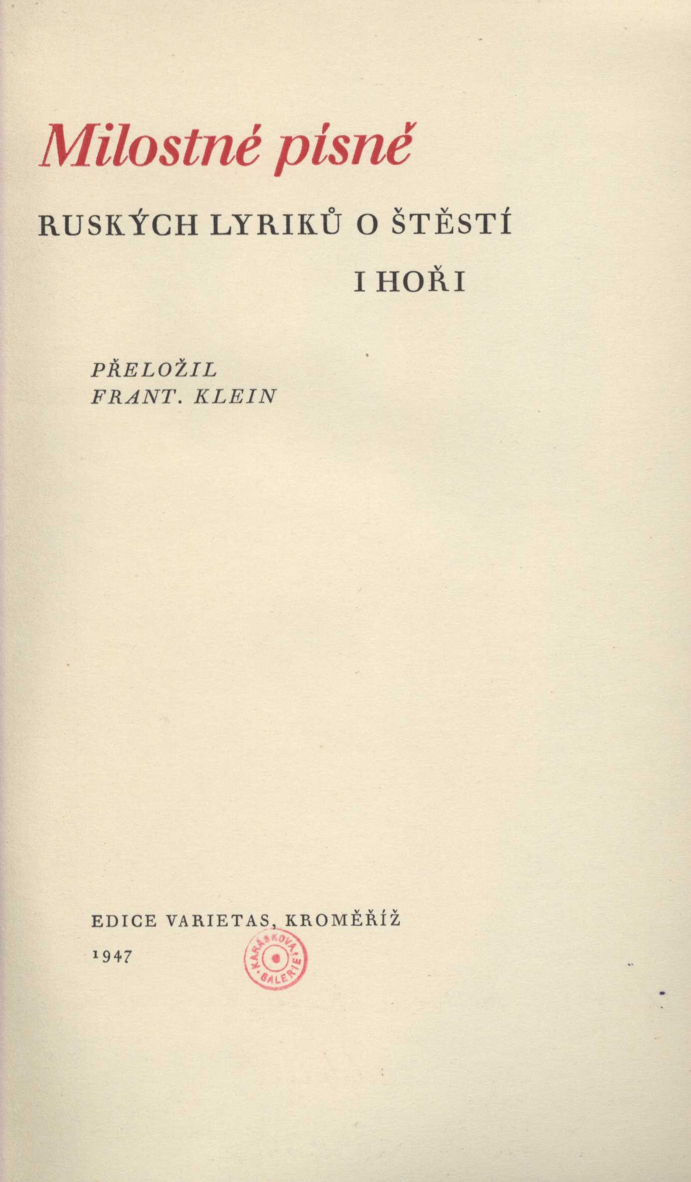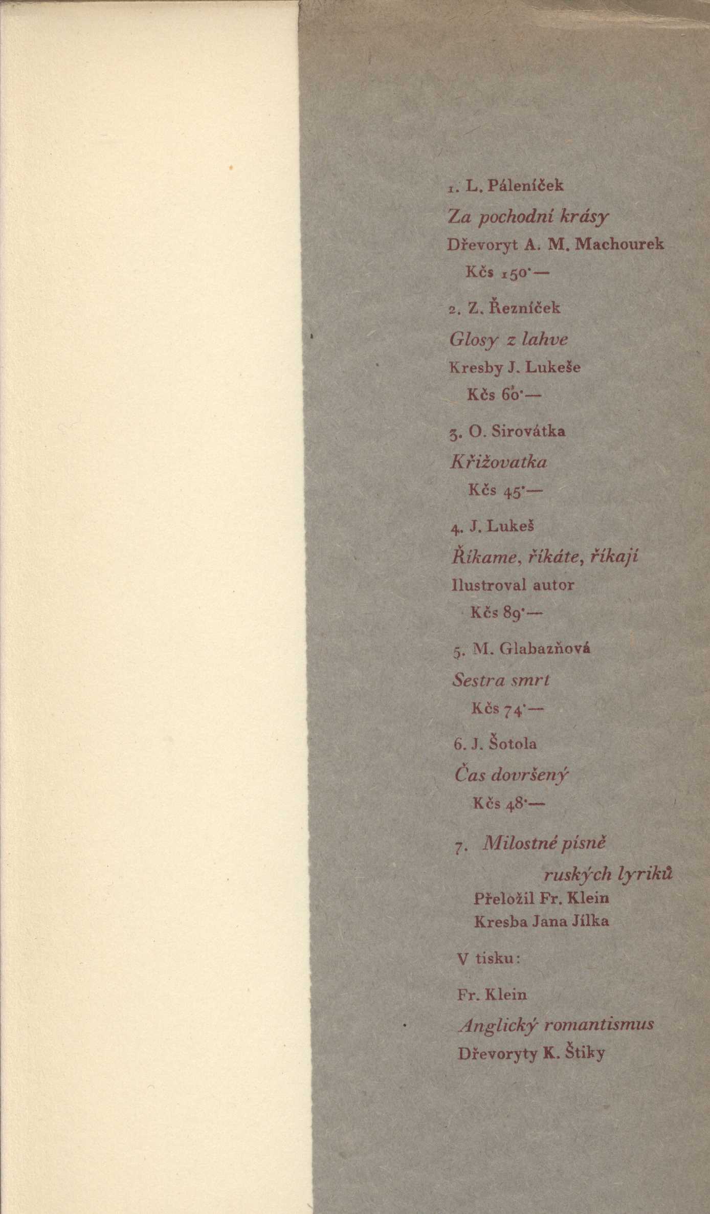 Názvové údaje Básně / Alexandr Blok ; [přeložil Jiří Víška] Osobní jméno Blok, Alexandr Alexandrovič, 1880-1921 (Autor) Další autoři Víška, Jiří, 1912-1942 (Překladatel) Záruba, Vladimír, 1925- (Nakladatel, vydavatel) Nakladatel B.m. : Vladimír Záruba, [194-] Rozsah [16] s. ; 16 cm Klíčová slova ruská literatura * ruská poezie * lyrika * ruská lyrika Počet ex. 2, z toho volných 2 Druh dok. monografie Signatura Holan 1192, KaG XXXII E 3 Názvové údaje Ryšavý podzim / Sergej Jesenin ; z ruského originálu (výbor z několika sbírek, vydaných různými sovětskými nakladatelstvími) přeložil a ediční poznámku napsal Jan Zábrana ; vazba a kresby Sylvie Vodákové ; graficky upravil Martin Dyrynk Osobní jméno Jesenin, Sergej Aleksandrovič, 1895-1925 (Autor) Další autoři Zábrana, Jan, 1931-1984 (Překladatel) (Autor komentáře textu) Vodáková, Sylvie, 1926-2016 (Výtvarník vazby) Dyrynk, Martin, 1941-2019 (Knižní grafik) Korp. Mladá fronta (nakladatelství) (Nakladatel, vydavatel) Stráž, tiskařské závody (Tiskař) Nakladatel Praha : Mladá fronta, 1984 Výrobce Vimperk : Stráž Rozsah 199 stran Klíčová slova ruská literatura * ruská poezie * ruská lyrika * výbor básní Počet ex. 2, z toho volných 2 Druh dok. monografie Signatura RSzpuk 0592, F I 1450 Názvové údaje Bratr smutek / Michajl J. Lermontov ; přeložil Josef Hora, Marie Marčanová, Bohumil Mathesius ; úvod, poznámku a doslov napsal Bohumil Mathesius ; v úpravě F. Muziky Osobní jméno Lermontov, Michail Jur‘jevič, 1814-1841 (Autor) Další autoři Hora, Josef, 1891-1945 (Překladatel) Marčanová, Marie, 1892-1979 (Překladatel) Mathesius, Bohumil, 1888-1952 (Překladatel) (Autor úvodu atd.) (Autor komentáře textu) (Autor doslovu, tiráže atd.) Muzika, František, 1900-1974 (Knižní grafik) Korp. Melantrich (nakladatelství) (Nakladatel, vydavatel) (Tiskař) Nakladatel V Praze : Melantrich, 1941 Rozsah 266 stran, 4 nečíslované listy obrazové přílohy : ilustrace ; 21 cm Klíčová slova ruská literatura * ruská poezie * ruská lyrika * romantismus * výbor lyriky Počet ex. 4, z toho volných 4 Druh dok. monografie Signatura Holan 193, MEL 1060, VHB 1809, JVladislav 1164 Názvové údaje Lirika / Sergej Orlov Osobní jméno Orlov, Sergej Sergejevič, 1921-1977 (Autor) (Dedikátor) Další autoři Slabý, Zdeněk Karel, 1930-2020 (Dedikant) Nakladatel Leningrad : Lenizdat, 1966 Rozsah 118 s. Klíčová slova sovětská poezie * ruská lyrika * básně * stol. 20., léta 60. Počet ex. 1, z toho volných 1 Druh dok. monografie Signatura ZKSlabý 0518 Názvové údaje Život můj bratr / Boris Pasternak ; přeložila Zdenka Bergrová ; ilustroval Věroslav Bergr Osobní jméno Pasternak, Boris Leonidovič, 1890-1960 (Autor) Další autoři Bergrová, Zdenka, 1923-2008 (Překladatel) Bergr, Věroslav, 1928-2022 (Ilustrátor) Korp. Melantrich (nakladatelství) (Nakladatel, vydavatel) Nakladatel Praha : Melantrich, 1994 Rozsah 77 stran : ilustrace ; 20 cm Klíčová slova ruská literatura * ruská lyrika * ruská poezie * sbírka básní Počet ex. 2, z toho volných 2 Druh dok. monografie Signatura MEL 1860, LITb 02814 Názvové údaje Pod ruským nebem / Vladimír Poljakov Osobní jméno Poljakov, Vladimír (Autor) Nakladatel V Novém Bydžově : Tisk a náklad Jana Novotného, 1900 Rozsah 64 stran Klíčová slova česká literatura * česká poezie * Rusko * ruská literatura * ruská lyrika * ruská poezie Počet ex. 1, z toho volných 1 Druh dok. monografie Signatura KaG III E2 85 Názvové údaje Lyrika / A.S. Puškin ; přeložil Petr Křička Osobní jméno Puškin, Aleksandr Sergejevič, 1799-1837 (Autor) Další autoři Křička, Petr, 1884-1949 (Nakladatel, vydavatel) Sutnar, Ladislav, 1897-1976 (Knižní grafik) Korp. Melantrich (nakladatelství) (Nakladatel, vydavatel) (Tiskař) Nakladatel V Praze : Melantrich, a.s., 1937 Výrobce Melantrich, a.s. Rozsah 272 stran, 1 nečíslovaný list fotografické přílohy ; 21 cm Osobní hesla Puškin, Aleksandr Sergejevič, 1799-1837 - ruský básník, prozaik a dramatik Klíčová slova ruská literatura * ruská poezie * ruská lyrika * výbor poezie Počet ex. 3, z toho volných 3 Druh dok. monografie Signatura MEL 0567, MEL 0567a, JVladislav 387 Názvové údaje Lirika / Aleksandr Blok ; sostavlenije i predislovije Vl. Orlova Osobní jméno Blok, Aleksandr Aleksandrovič, 1880-1921 (Autor) Další autoři Orlov, Vladimir Nikolajevič, 1908-1985 (Sestavovatel, kompilátor) (Autor úvodu atd.) Korp. Chudožestvennaja literatura (nakladatelství) (Nakladatel, vydavatel) Nakladatel Moskva : Chudožestvennaja literatura, 1964 Rozsah 241 stran ; 17 cm Klíčová slova ruská literatura * ruská poezie * ruská lyrika Počet ex. 1, z toho volných 1 Druh dok. monografie Signatura BVolkova 1726 Názvové údaje Milostné písně ruských lyriků o štěstí i hoři / přeložil Frant. Klein ; [kresbou vyzdobil Jan Jílek] Další autoři Jílek, Jan, 1905-1982 (Ilustrátor) (Dedikátor) Klein, František, 1905-2004 (Překladatel) (Sestavovatel, kompilátor) Kryl, Karel, 1910-1971 (Nakladatel, vydavatel) (Tiskař) Karásek ze Lvovic, Jiří, 1871-1951 (Dedikant) Nakladatel Kroměříž : Karel Kryl, 1947 Rozsah 47 s. : il. Klíčová slova ruská literatura * ruská lyrika * ruská poezie Počet ex. 1, z toho volných 1 Druh dok. monografie Signatura KaG XLI E 17 Názvové údaje Ruské byliny : výběr / [doplňkem k souborným básnickým překladům Emanuela z Lešehradu ; upraveny pro toto vydání za redakce Dr. Mil. Novotného ; obálka Jindř. Štyrského] Další autoři Lešehrad, Emanuel, 1877-1955 (Překladatel) Novotný, Miloslav, 1894-1966 (Editor) Štyrský, Jindřich, 1899-1942 (Autor obálky) Korp. Orbis (tiskárna) (Tiskař) Alois Srdce (nakladatelství) (Knihkupec) Nakladatel V Praze : A. Srdce [distributor], 1934 Výrobce (Orbis) Rozsah 49 s. ; 17,6 cm Klíčová slova rus