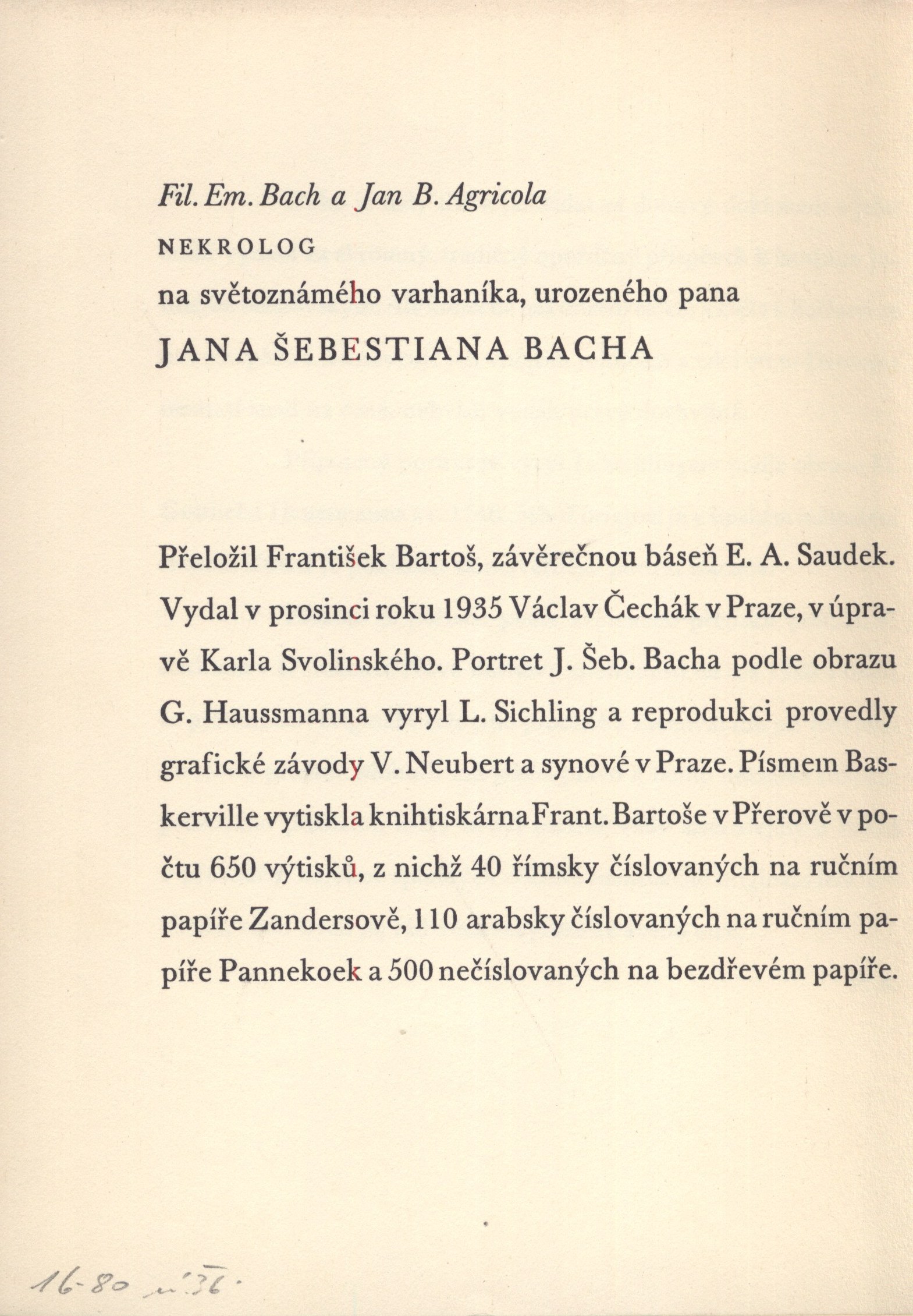 Názvové údaje Betchoven : materialy dlja bibliografičeskogo ukazatelja russkoj literatury o nem / M.P. Aleksejev, Ja.Z. Berman Osobní jméno Aleksejev, Michail Pavlovič, (Autor) 1896-1981 Další autoři Berman, Jakov Zinov'jevič (Autor) Nakladatel Odessa : [nakladatel není známý], 1927 Výrobce Odespoligraf Rozsah 35 stran Osobní hesla Beethoven, Ludwig van, 1770-1827 - německý hudební skladatel, pianista a dirigent Klíčová slova hudební skladatelé * Německo * stol. 18.-19. * ruská literatura * literární náměty * bibliografie Počet ex. 1, z toho volných 1 Druh dok. monografie Signatura M 61 b 84 Názvové údaje Appassionata : román o Beethovenovi / Alfred Amenda ; [z něm. přel. Daniela Tomášková ; typogr. Milan Kopřiva] Osobní jméno Amenda, Alfred, 1893-1973 (Autor) Další autoři Tomášková, Daniela (Překladatel) Kopřiva, Milan, 1929-1997 (Typograf) Korp. Melantrich (nakladatelství) (Nakladatel, vydavatel) Nakladatel Praha : Melantrich, 1972 Výrobce (Mír 6) Rozsah 556 s. Osobní hesla Beethoven, Ludwig van, 1770-1827 - německý skladatel Klíčová slova německá literatura * próza * životopisný román * Beethoven L. van Počet ex. 2, z toho volných 2 Druh dok. ***nezařazeno*** Signatura MEL 0509, MEL 1204 Názvové údaje Zur Pflege Händelscher Musik in der 2. Hälfte des 18. Jahrhunderts / Theophil Antonicek Osobní jméno Antonicek, Theophil, 1937-2014 (Autor) Nakladatel Wien : H. Böhlaus Nachf., 1966 Rozsah 58 stran Osobní hesla Händel, George Friedrich, 1685-1759 - německý hudební skladatel Klíčová slova hudební skladatelé * hudba * hudební texty * Německo * stol. 18., 2. pol. * studie Počet ex. 1, z toho volných 1 Druh dok. monografie Signatura M 47 b 8 Názvové údaje Tři strážníci : Čtení o J. Voskovcovi, J. Werichovi a J. Ježkovi / Sborník připravili Ota Bahner a Karel Čejka ; Návrh obálky Jiří Neuwirt ; Graf. úpr. Karel Čejka Osobní jméno Bahner, Ota (Editor) Další autoři Čejka, Karel (Editor) Neuwirt, Jiří, 1948-2024 Čejka, Karel (Grafický technik) Nakladatel Ostrava : Nakladatelství A-Z, 1992 Rozsah 117 s. : fot., il Osobní hesla Voskovec, Jiří, 1905-1981 - herec, dramatik, režisér, básník, překladatel * Werich, Jan, 1905-1980 - herec, dramatik, prozaik * Ježek, Jaroslav, 1906-1942 - hudební skladatel, teoretik moderní české hudby, spoluzakladatel Osvobozeného divadla * Voskovec, Jiří, 1905-1981 - herec, dramatik, režisér, básník, překladatel * Voskovec, Jiří, 1905-1981 - herec, dramatik, režisér, básník, překladatel Klíčová slova sborník * Osvobozené divadlo * Voskovec J. * Werich J. * Ježek J. Počet ex. 1, z toho volných 1 Druh dok. monografie Signatura M 219 f 24 Názvové údaje Nekrolog na světoznámého varhaníka, urozeného pana Jana Šebestiana Bacha, královského polského a kurfiřtského saského dvorního skladatele a ředitele kůru v Lipsku / Fil. Em. Bach a Jan B. Agricola ; přeložil František Bartoš ; závěrečnou báseň E. A. Saudek ; v úpravě Karla Svolinského ; portret J. Šeb. Bacha podle obrazu G. Haussmanna vyryl L. Sichling Osobní jméno Bach, Carl Philipp Emanuel, 1714-1788 (Autor) Další autoři Agricola, Johann Friedrich, 1720-1774 Bartoš, František, 1905-1973 (Překladatel) Saudek, Erik Adolf, 1904-1963 (Překladatel) Svolinský, Karel, 1896-1986 (Knižní grafik) Haußmann, Elias Gottlob, 1695-1774 (Ilustrátor) Sichling, Lazarus Gottlieb (Rytec) Čechák, Václav, 1906-1975 (Nakladatel, vydavatel) Korp. Frant. Bartoš (tiskárna) (Tiskař) Grafické umělecké závody V. Neubert (firma) (Tiskař obrazu) Nakladatel V Praze : vydal Václav Čechák, 1935 Výrobce V Přerově : knihtiskárna Frant. Bartoše Rozsah 56 nečíslovaných listů : ilustrace ; 20 cm Osobní hesla Bach, Johann Sebastian, 1685-1750 - německý hudební skladatel a varhaník, virtuóz na klávesové nástroje Klíčová slova německá literatura * překlad * nekrology * Bach J. S. Počet ex. 2, z toho volných 2 Druh dok. monografie Signatura Topič 0355, ZA 1 g 4 Názvové údaje Milostný život Richarda Wagnera : s předmluvou autorovou k českému vydání / Louis Barthou ; přeložil Vladimír Žikeš ; [vazba dle návrhu Josefa Solara, který upravil obálku s použitím sochy Hudba od Jos. Drahoňovského] Osobní jméno Barthou, Louis, 1862-1934 (Autor) Další autoři Žikeš, Vladimír, 1906-1980 (Překladatel) Solar, Josef, 1896-1977 (Autor obálky) Drahoňovský, Josef, 1877-1938 (Sochař) Korp. Karel Voleský (nakladatelství) (Nakladatel, vydavatel) Vojtěch Šmíd (tiskárna) (Tiskař) Nakladatel Praha Karel Voleský, [1934] Výrobce (Knihtiskárna V. Šmída) Rozsah 137 s. Osobní hesla Wagner, Richard, 1813-1883 - německý hudební skladatel Klíčová slova francouzská literatura * německá hudba * romantismus Počet ex. 1, z toho volných 1 Druh dok. monografie Signatura KaG XV B2 57 Názvové údaje Antonín Dvořák : kritická studie / Josef Bartoš Osobní jméno Bartoš, Josef, 1887-1952 (Autor) Další autoři Pelcl, Josef, 1861-1916 (Nakladatel, vydavatel) Korp. E. Leschinger (knihtiskař, nakladatel) (Tiskař) Nakladatel V Praze : Nákladem Josefa Pelcla, 1913 Výrobce (Tiskem E. Leschingra) Rozsah 447 s. Osobní hesla Dvořák, Antonín, 1841-1904 - hudební skladatel Klíčová slova česká literatura * česká hudba * česká hudební tvorba * čeští hudebníci * hudební skladatelé * stol. 19., 2. pol. * hudba Počet ex. 1, z toho volných 1 Druh dok. monografie Signatura KaG XXVIII G2 71 Názvové údaje Zdeněk Fibich : s 18 obrazovými přílohami a 4 facsimily / Josef Bartoš Osobní jméno Bartoš, Josef, 1887-1952 (Autor) Další autoři Spolek výtvarných umělců Mánes (Nakladatel, vydavatel) "Grafia", dělnická knihtiskárna (tiskárna, nakladatelství) (Tiskař) Štencův grafický závod (Leptař) (Tiskař obrazu) Nakladatel V Praze : nákladem Spolku výtvarných umělců Man