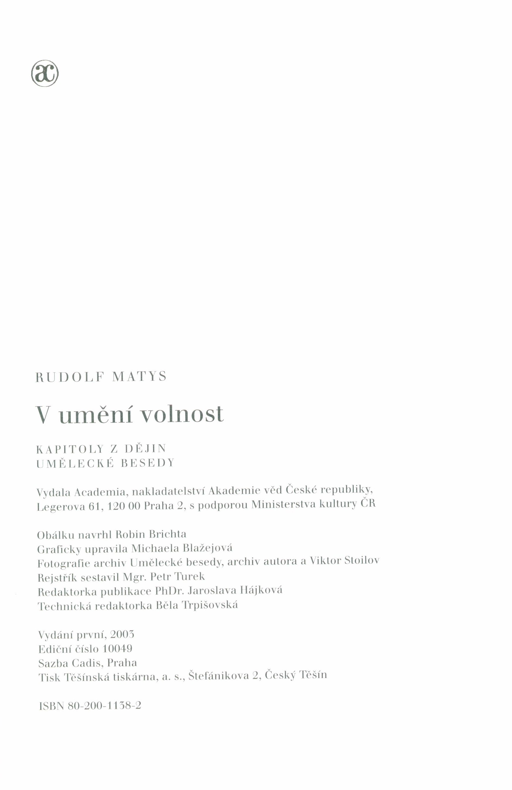 Názvové údaje 50 let SČUG Hollar / [redakce katalogu František Dvořák ; grafická úprava katalogu Josef Týfa] Záhlaví-akce 50 let SČUG Hollar (1967 : Praha, Česko) Další autoři Dvořák, František, 1920-2015 (Editor) Týfa, Josef, 1913-2007 (Knižní grafik) Korp. Sdružení českých umělců grafiků Hollar (Nakladatel, vydavatel) Svaz československých výtvarných umělců (profesní organizace) (Nakladatel, vydavatel) Nakladatel Praha : Svaz československých výtvarných umělců : SČUG Hollar, 1967 Rozsah 1 sv., obr. příl. : il. Heslo korporace (zkrác. heslo korp.) : Sdružení českých umělců grafiků Hollar - organizace českých grafiků Klíčová slova umělecké svazy * čeští výtvarní umělci * r. 1967 * 50. výročí * výstavy * katalogy výstav Počet ex. 1, z toho volných 1 Druh dok. monografie Signatura C12c 2806 Názvové údaje Sladké s hořkým : ze života umělecké družiny Domu umělců SVUM v Hodoníně / vybral, doplnil a uspořádal Jan Andrys - 1986 Osobní jméno Andrys, Jan, 1895-1992 (Sestavovatel, kompilátor) (Editor) (Autor) Další autoři Galerie výtvarného umění (Hodonín, Česko) Nakladatel Boskovice : Albert ; V Hodoníně : Galerie výtvarného umění, 2007 Rozsah 236 s. : il., portréty ; 21 cm Osobní hesla Andrys, Jan, 1895-1992 - učitel, kulturní pracovník, autor pamětí Heslo korporace (zkrác. heslo korp.) : Sdružení výtvarných umělců moravských Klíčová slova kulturní pracovníci * umělecké svazy * české výtvarné umění * moderní umění * výtvarní umělci * kultura * společnost * dějiny * Česko * stol. 20. * paměti Počet ex. 1, z toho volných 1 Druh dok. monografie Signatura C12b 10574 Názvové údaje Komunismus, levicová kultura a česká politika 1890-1938 / Ladislav Cabada Osobní jméno Cabada, Ladislav, 1973- (Autor) Další autoři Západočeská univerzita. Filozofická fakulta Nakladatel Plzeň : Vydavatelství a nakladatelství Aleš Čeněk, 2005 Rozsah 198 s. Klíčová slova kulturní politika * komunistické strany * levicová kultura * umělci * umělecké svazy * politické názory * Česko * r. 1890-1938 * studie Počet ex. 1, z toho volných 1 Druh dok. monografie Signatura C12b 8747 Názvové údaje Hollar ; Pocta Václavu Hollarovi : [výstava k] 400. výročí narození světoznámého českého grafika [a k] 90. výročí založení Sdružení českých umělců grafiků Hollar : [100 originálních leptů Václava Hollara ze sbírky Vlastivědného muzea v Šumperku a Zábřehu, přehlídka současné grafické tvorby členů SČUG Hollar, retrospektiva bibliofilských tisků SČUG Hollar] / redakce katalogu a resumé Miroslav Kudrna ; odborná příprava a realizace katalogu Bohuslav Holý, Pavek Sivko ; grafická úprava Rostislav Vaněk ; reprodukce Václav Ostádal ; překad resumé Vladimíra Šefranka] Osobní jméno Hollar, Václav, 1607-1677 (Umělec) Záhlaví-korpor. Sdružení českých umělců grafiků Hollar (Autor) Další autoři Holý, Bohuslav, 1944-2015 (Jiná role) Sivko, Pavel, 1948- (Jiná role) Vaněk, Rostislav, 1945- (Knižní grafik) Kudrna, Miroslav, 1935-2014 (Autor úvodu atd.) Ostádal, Václav, 1941- (Fotograf) Šefranka, Vladimíra, 1961- (Překladatel) Korp. Sdružení českých umělců grafiků Hollar (Nakladatel, vydavatel) Muzeum (Zábřeh, Šumperk, Česko) Vlastivědné muzeum (Šumperk, Česko) Trico (tiskárna) (Tiskař) Nakladatel Praha : SČUG Hollar, 2007 Výrobce (Trico) Rozsah 164, [4] s. : il. (převážně barev.) ; 29,6 cm Osobní hesla Hollar, Václav, 1607-1677 - rytec, grafik Heslo korporace (zkrác. heslo korp.) : Sdružení českých umělců grafiků Hollar - organizace českých grafiků Klíčová slova česká grafika * lepty * stol. 17. * Hollar V. * Šumperk * umělecké sbírky * umělecké svazy * Hollar * bibliofilské tisky * grafiky * čeští grafici * stol. 20.-21. * katalogy výstav * obrazové publikace Počet ex. 3, z toho volných 3 Druh dok. monografie Signatura US 0072, NK /07 097, C12d 1586 Názvové údaje V umění volnost : kapitoly z dějin Umělecké besedy / Rudolf Matys ; obálku navrhl Robin Brichta ; graficky upravila Michaela Blažejová Osobní jméno Matys, Rudolf, 1938-2023 (Autor) Další autoři Brichta, Robin, 1966- (Autor obálky) Blažejová, Michaela, 1966- (Knižní grafik) Vladislav, Jan, 1923-2009 (Dedikant) Korp. Academia (nakladatelství) (Nakladatel, vydavatel) Těšínská tiskárna (Tiskař) Nakladatel Praha : Academia, 2003 Výrobce Český Těšín : Těšínská tiskárna, a.s. Rozsah 356 stran : ilustrace ; 24 cm Klíčová slova monografie * dějiny * umělecké svazy * Umělecká beseda * Praha * Česko * stol. 19.-20. Počet ex. 4, z toho volných 4 Druh dok. monografie Signatura C12c 1627, C12c 1627a, C12c 3095, JVladislav 538 Názvové údaje Polylegran a hosté : výstavní síň Svazu československých spisovatelů, Praha 4. prosince 1969 / pořádá Čs. svaz výtvarných umělců Záhlaví-akce Polyegran a hosté (1969 : Praha, Česko) Další autoři Svaz československých výtvarných umělců (profesní organizace) Nakladatel [Praha : s.n., 1969] Rozsah [14] s. : čb. obr. Heslo korporace (zkrác. heslo korp.) : Polyegran (umělecká skupina) Klíčová slova umělecké svazy * výtvarníci * karikatury * kresby * stol. 20., léta 60. * výstavy * katalogy výstav Počet ex. 1, z toho volných 1 Druh dok. monografie Signatura C12b 11342 Názvové údaje SČUG Hollar - grafika - 71 : Praha, Mánes, leden - únor 1971 / Svaz českých výtvarných umělců, Skupina českých umělců grafiků Holllar Záhlaví-akce SČUG Hollar - grafika - 71 (1971 : Praha, Česko) Další autoři Sdružení českých umělců grafiků Hollar Svaz českých výtvarných umělců (Praha) (Nakladatel, vydavatel) Nakladatel [Praha] : Svaz českých výtvarných umělců, 1971 Výrobce Ruch) Rozsah 33 s. : il. Klíčová slova umělecké svazy * čeští 