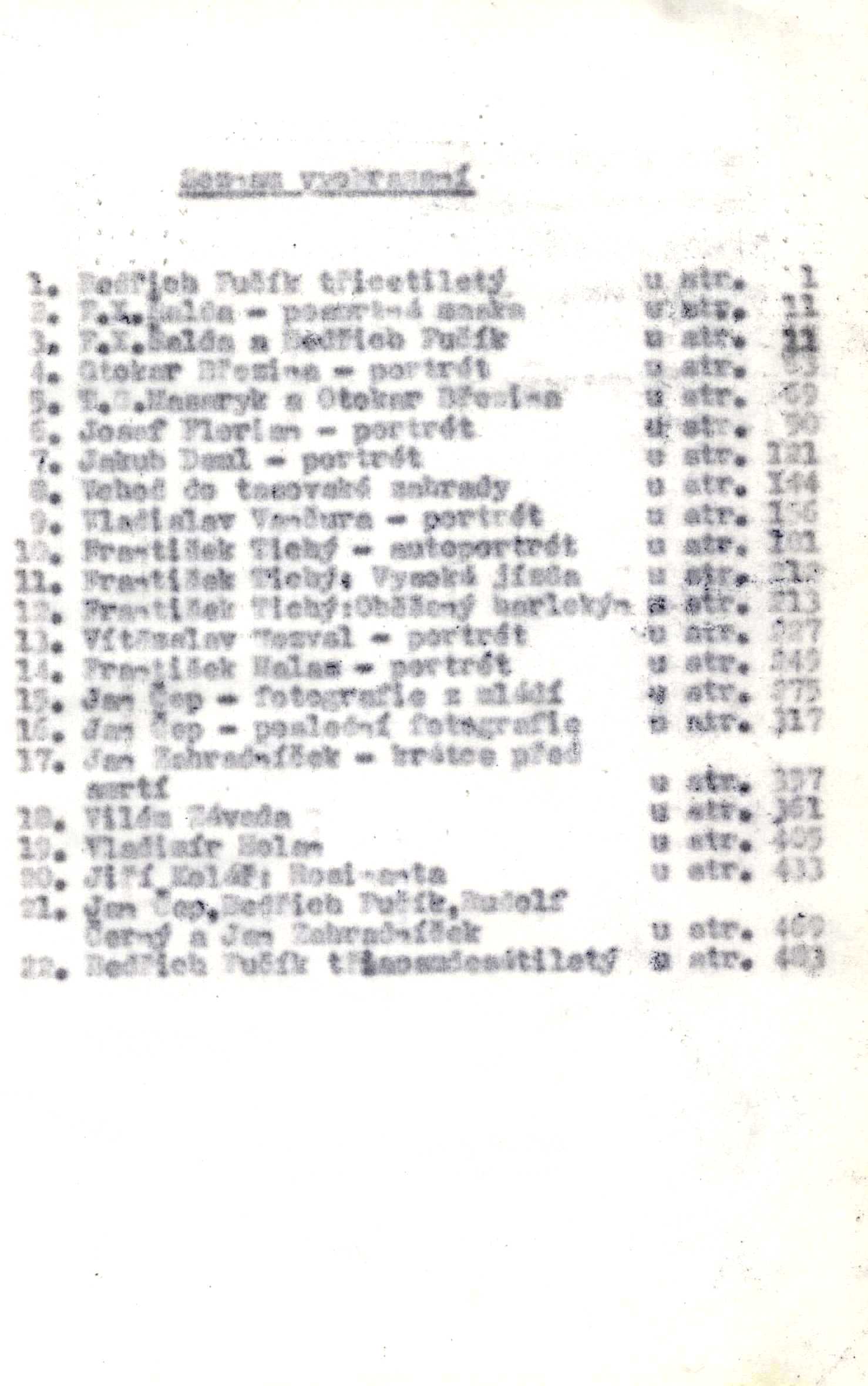 Názvové údaje Stopami Josefa Liboslava Zieglera v Chrudimi / sepsal Jaroslav Adámek Osobní jméno Adámek, Jaroslav, 1877-1954 (Autor) Nakladatel Chrudim : Vlastivědné museum pro východní Čechy, 1930 Výrobce Fr. Slavík Rozsah 16 stran Osobní hesla Ziegler, Josef Liboslav, 1782-1846 - katolický kněz a spisovatel Klíčová slova Chrudim * význačné osobnosti Počet ex. 1, z toho volných 1 Druh dok. monografie Signatura J V II 28 Názvové údaje Vyšehradský hřbitov / Pavel Bedrníček ; [grafická úprava Luboš Drtina] Osobní jméno Bedrníček, Pavel, 1930-2010 (Autor) Další autoři Drtina, Luboš, 1963- (Knižní grafik) Nakladatel Praha : Volvox Globator, 2008 Rozsah 54 s. : il., plán ; 21 cm Heslo korporace (zkrác. heslo korp.) : Vyšehradský hřbitov. Slavín Klíčová slova Praha (Česko) * Vyšehrad (Praha) * hřbitovy * historie hřbitova * hroby * náhrobky * náhrobní nápisy * význačné osobnosti * průvodce Počet ex. 1, z toho volných 1 Druh dok. monografie Signatura C12b 11250 Názvové údaje Osobnosti Prostějovska / Tomáš Cydlík ... [et al. ; grafická úprava, zlom, úprava reprodukcí, obálka Alice Komárková] Osobní jméno Cydlík, Tomáš, 1974- (Autor) Další autoři Komárková, Alice (Knižní grafik) (Autor obálky) Nakladatel V Prostějově : Klub historický a státovědný, 2012 Výrobce (Tiskárny Havlíčkův Brod) Rozsah 221 s. : il. (některé barev.), portréty Klíčová slova Prostějovsko * osobnosti kraje * význačné osobnosti * biografie * přehledy Počet ex. 1, z toho volných 1 Druh dok. monografie Signatura PS Názvové údaje Lázně Bělohrad : vlastivědná čítanka / Milena Černá Osobní jméno Černá, Milena, 1942-2021 (Autor) Nakladatel Lázně Bělohrad : Město Lázně Bělohrad, 2006 Rozsah 148 s. : il. (převážně barev.), mapa ; 22 cm Klíčová slova Lázně Bělohrad * vlastivěda kraje * historie města * význačné osobnosti * monografie Počet ex. 1, z toho volných 1 Druh dok. monografie Signatura C12b 9822 Názvové údaje Čtrnáctero zastavení / Bedřich Fučík Osobní jméno Fučík, Bedřich, 1900-1984 (Autor) Další autoři Březina, Otokar, 1868-1929 (Autor) Nakladatel Praha : Edice F. T., 1984 Rozsah 490 stran : ilustrace ; 21 cm Osobní hesla Deml, Jakub, 1878-1961 - katolický kněz, básník, prozaik, publicista, překladatel * Florian, Josef, 1873-1941 - nakladatel a překladatel * Březina, Otokar, 1868-1929 - učitel, básník, esejista, prozaik a myslitel * Halas, František, 1901-1949 - básník, esejista, redaktor, překladatel * Holan, Vladimír, 1905-1980 - básník, prozaik, překladatel * Nezval, Vítězslav, 1900-1958 - básník, překladatel, prozaik, publicista * Kolář, Jiří, 1914-2002 - básník, dramatik, výtvarník, sběratel, mecenáš, a překladatel * Tichý, František, 1896-1961 - malíř, grafik, ilustrátor * Vančura, Vladislav, 1891-1942 - spisovatel, publicista, filmový scénárista a režisér * Zahradníček, Jan, 1905-1960 - básník, spisovatel, překladatel, kritik, novinář a publicista katolické orientace * Závada, Vilém, 1905-1982 - redaktor, básník, prozaik, překladatel * Černý, Rudolf, 1920-1982 - prozaik, publicista * Šalda, F. X., 1867-1937 - výtvarný a literární kritik, estetik, básník, dramatik, překladatel * Čep, Jan, 1902-1974 - spisovatel, prozaik a esejista, překladatel, rozhlasový komentátor, zahraniční zpravodaj Klíčová slova česká literatura * samizdatová literatura * samizdat * monografie * vzpomínkové vyprávění * medailony osobností * význačné osobnosti * kulturní osobnosti * české osobnosti * čeští básníci * spisovatelé * umělci * literární kritici Počet ex. 1, z toho volných 1 Druh dok. monografie Signatura Kantůrková 0221 Názvové údaje Merseburg : 50 Persönlichkeiten aus 100 Jahren Geschichte / Jürgen Jankofsky Osobní jméno Jankofsky, Jürgen, 1953- (Autor) (Dedikátor) Další autoři Slabý, Zdeněk Karel, 1930-2020 (Dedikant) Nakladatel Böblingen : Anita Tykve, 1992 Rozsah 248 s. : il. Klíčová slova Německo * Mersenburg (oblast) * význačné osobnosti * historické osobnosti * stručné biografie * studie Počet ex. 1, z toho volných 1 Druh dok. monografie Signatura ZKSlabý 0389