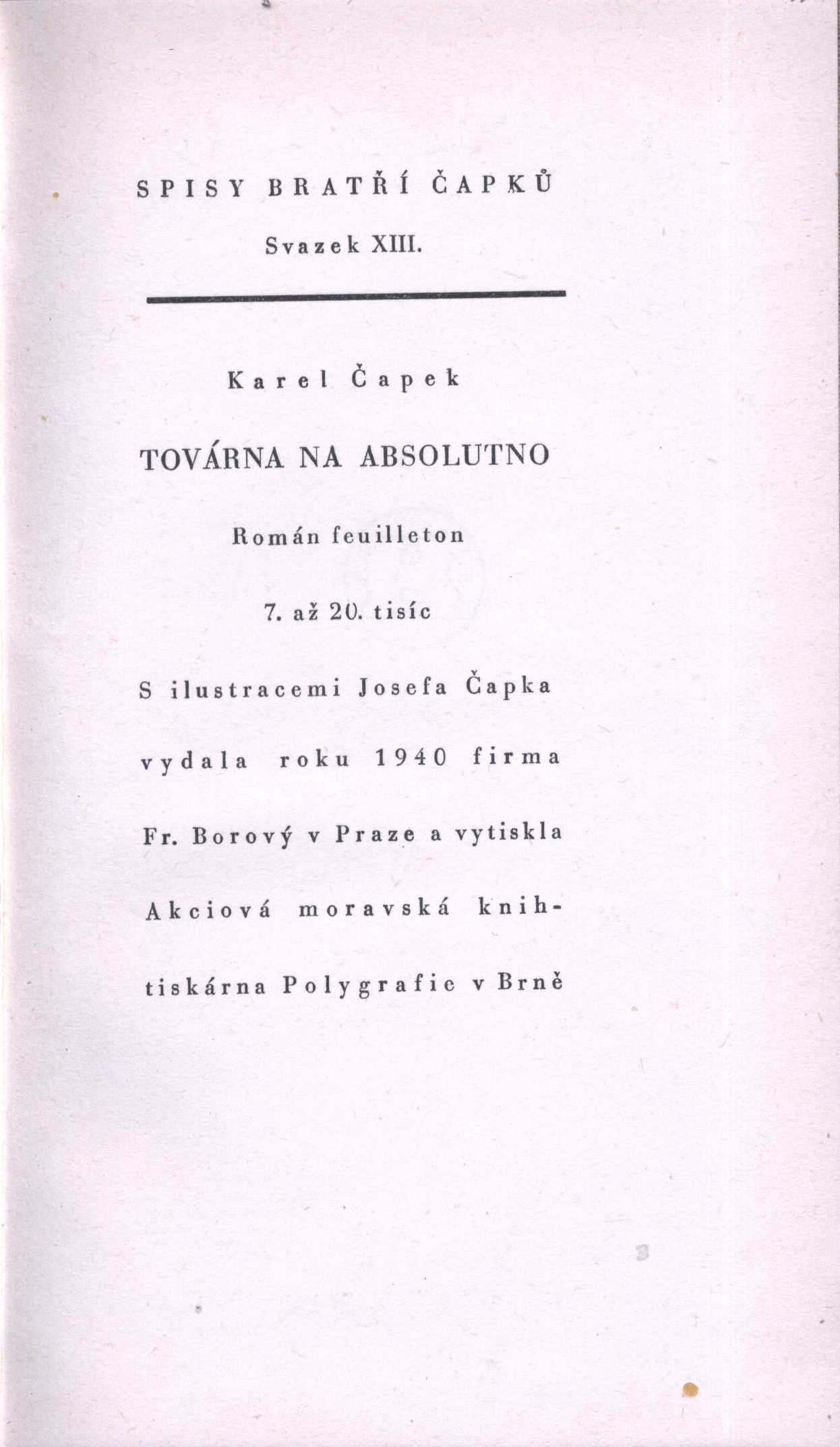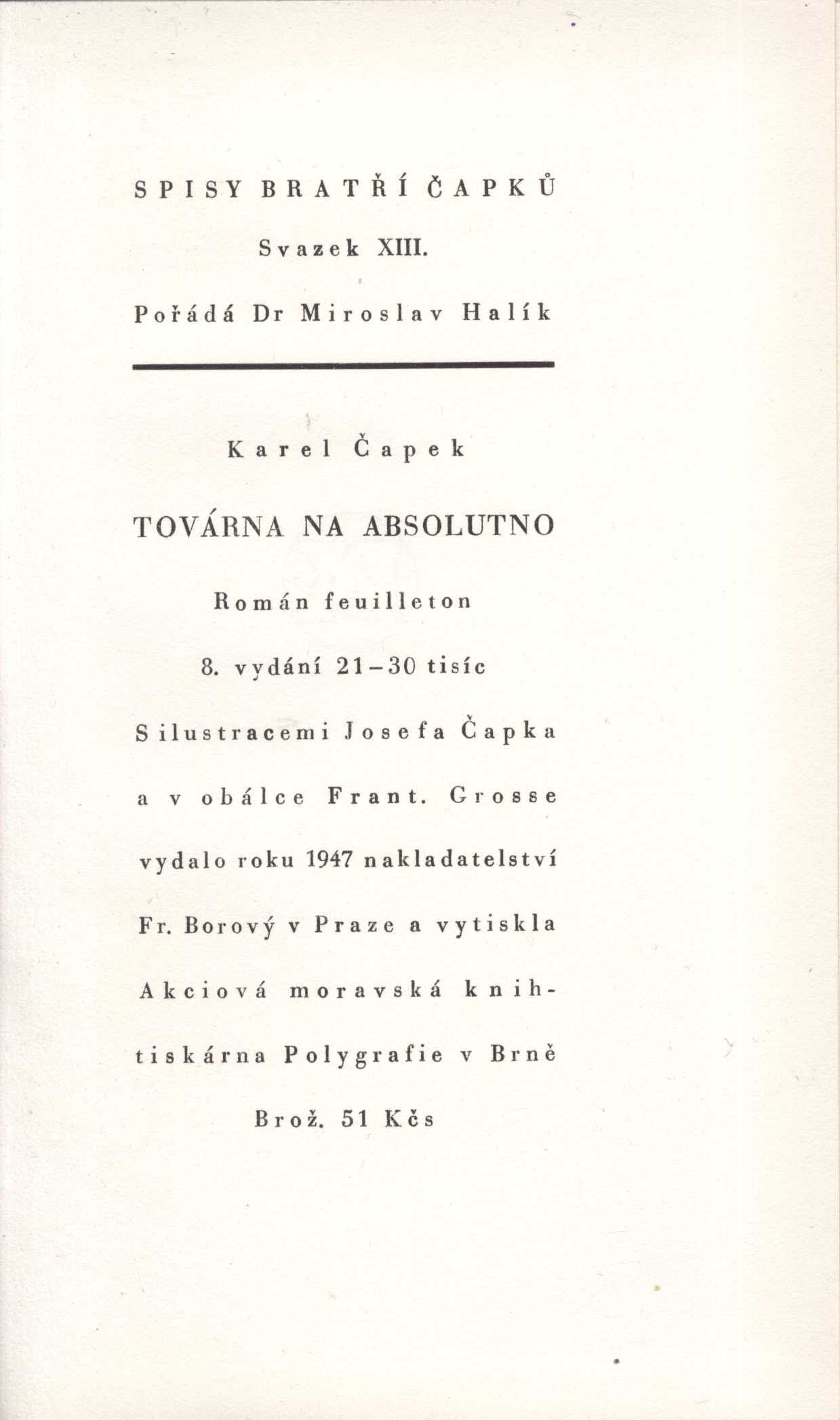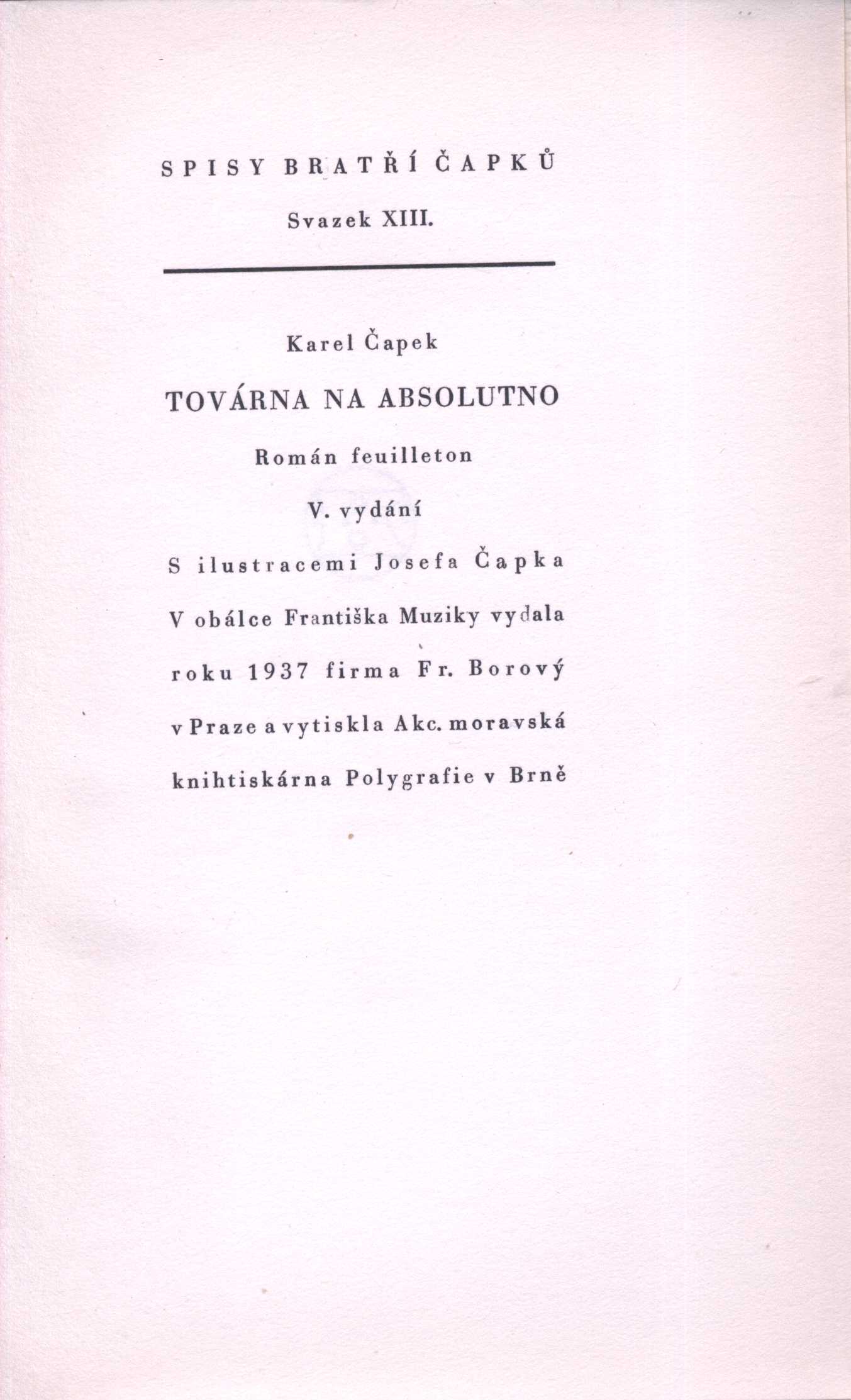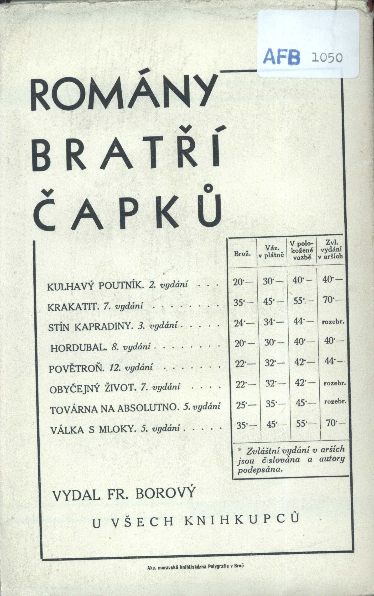 Názvové údaje Nejtěžší hřích / Dragomir Asenov ; z bulharštiny přeložila Naděžda Maršíčková ; přebal a vazbu navrhl Ervín Urban ; typograficky upravil Vladimír Hübl Osobní jméno Asenov, Dragomir, 1926- (Autor) Další autoři Maršíčková, Naděžda (Překladatel) Urban, Ervín, 1931-1997 (Autor obálky) (Výtvarník vazby) Hübl, Vladimír (Typograf) Korp. Melantrich (nakladatelství) (Nakladatel, vydavatel) Tisk Brno (tiskárna) (Tiskař) Nakladatel Praha : Melantrich, 1985 Výrobce Brno : Tisk 2 Rozsah 188 stran Klíčová slova bulharská literatura * román * vědecko-fantastická literatura * vědecko-fantastický román Počet ex. 2, z toho volných 2 Druh dok. ***nezařazeno*** Signatura MEL 0596, M 147 g 49 Názvové údaje Robinsoni vesmíru : vědeckofantastický román / František Běhounek ; [ilustroval a obálku navrhl Teodor Rotrekl [sic!] Osobní jméno Běhounek, František, 1898-1973 (Autor) Další autoři Rotrekl, Teodor, 1923-2004 (Autor obálky) (Ilustrátor) Novák, Miloš, 1909-1988 (Ilustrátor) (Dřívější majitel) Korp. Státní nakladatelství dětské knihy (Nakladatel, vydavatel) Nakladatel Praha : Státní nakladatelství dětské knihy, 1958 Výrobce Severografia, n. p.) Rozsah 185 s. : il. ; 25 cm Klíčová slova česká literatura * próza * román * vědecko-fantastický román * ilustrované knihy Počet ex. 1, z toho volných 1 Druh dok. monografie Signatura MNovák 068 Názvové údaje Továrna na absolutno : román feuilleton / Karel Čapek ; [s ilustracemi Josefa Čapka ; v obálce Frant. Grosse] Osobní jméno Čapek, Karel, 1890-1938 (Autor) Další autoři Čapek, Josef, 1887-1945 (Ilustrátor) Gross, František, 1909-1985 (Autor obálky) Korp. Fr. Borový (firma) (Nakladatel, vydavatel) Akciová moravská knihtiskárna Polygrafie (Tiskař) Nakladatel Praha : Fr. Borový, 1947 Výrobce Akc. moravská knihtiskárna Polygrafie) Rozsah 229 s. : il. ; 8° Klíčová slova česká literatura * česká próza * vědecko-fantastický román Počet ex. 1, z toho volných 1 Druh dok. monografie Signatura AFB 2192 Názvové údaje Továrna na absolutno : román feuilleton / Karel Čapek ; [s ilustracemi Josefa Čapka ; v obálce Frant. Grosse] Osobní jméno Čapek, Karel, 1890-1938 (Autor) Další autoři Čapek, Josef, 1887-1945 (Ilustrátor) Gross, František, 1909-1985 (Autor obálky) Korp. Fr. Borový (firma) (Nakladatel, vydavatel) Akciová moravská knihtiskárna Polygrafie (Tiskař) Nakladatel Praha : Fr. Borový, 1947 Výrobce Akc. moravská knihtiskárna Polygrafie) Rozsah 229 s. : il. ; 8° Klíčová slova česká literatura * česká próza * vědecko-fantastický román Počet ex. 1, z toho volných 1 Druh dok. monografie Signatura AFB 2193 Názvové údaje Továrna na absolutno : román feuilleton / Karel Čapek ; [s ilustracemi Josefa Čapka] Osobní jméno Čapek, Karel, 1890-1938 (Autor) Další autoři Čapek, Josef, 1887-1945 (Ilustrátor) Muzika, František, 1900-1974 (Výtvarník vazby) Korp. Fr. Borový (firma) (Nakladatel, vydavatel) Akciová moravská knihtiskárna Polygrafie (Tiskař) Nakladatel Praha : Fr. Borový, 1940 Výrobce Akc. moravská knihtiskárna Polygrafie) Rozsah 229 s. : il. ; 8° Klíčová slova česká literatura * česká próza * vědecko-fantastický román Počet ex. 1, z toho volných 1 Druh dok. monografie Signatura AFB 1317 Názvové údaje Továrna na absolutno : román feuilleton / Karel Čapek ; [s ilustracemi Josefa Čapka ; v obálce Františka Muziky] Osobní jméno Čapek, Karel, 1890-1938 (Autor) Další autoři Čapek, Josef, 1887-1945 (Ilustrátor) Muzika, František, 1900-1974 (Autor obálky) Korp. Fr. Borový (firma) (Nakladatel, vydavatel) Akciová moravská knihtiskárna Polygrafie (Tiskař) Nakladatel Praha : Fr. Borový, 1937 Výrobce Akc. moravská knihtiskárna Polygrafie) Rozsah 229 s. : il. ; 8° Osobní hesla Čapek, Karel, 1890-1938 - spisovatel, dramatik, novinář Klíčová slova česká literatura * česká próza * vědecko-fantastický román Počet ex. 1, z toho volných 1 Druh dok. monografie Signatura AFB 1050