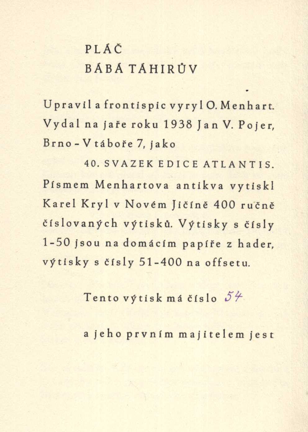 Názvové údaje Na promenádě : verše 1921-1926 / Jan Alda Osobní jméno Alda, Jan, 1901-1970 (Autor) Další autoři Vaněk a Votava (firma) (Nakladatel, vydavatel) Nakladatel Praha-Smíchov : Vaněk & Votava, 1926 Výrobce Řevnice : Jan Šťastný Rozsah 47 stran, 3 listy Klíčová slova česká poezie * verše * r. 1921-1926 Počet ex. 3, z toho volných 3 Druh dok. monografie Signatura Hora II 30, P 49 a 17, P 7 a 51 Názvové údaje Sen v Lucemburské zahradě / Richard Aldington ; přeložil Arnošt Vaněček Osobní jméno Aldington, Richard, 1892-1962 (Autor) Další autoři Vaněček, Arnošt, 1900-1983 (Překladatel) Korp. Adolf Synek (nakladatelství) (Nakladatel, vydavatel) Neuber, Pour a spol. (tiskárna) (Tiskař) Nakladatel V Praze : A. Synek, 1932 Výrobce Neuber, Pour a spol.) Rozsah 35 s. Klíčová slova anglická poezie * epická poezie * epické verše Počet ex. 6, z toho volných 6 Druh dok. monografie Signatura POR 227, LK M 150 c 69, LK P 85 E 52, KSynek 0118, KSynek 0118a, VMartínek 1567 Názvové údaje Motto z Hérakleita : výbor z veršů 1944-1989 / Ivan Andrenik ; doslov Rudolf Matys ; typo, obálka a kresby Miroslav Klomínek Osobní jméno Andrenik, Ivan, 1921-1998 (Autor) Další autoři Matys, Rudolf, 1938-2023 (Autor doslovu, tiráže atd.) Klomínek, Miroslav, 1931- (Typograf) (Autor obálky) (Ilustrátor) Korp. Česká expedice (vydavatelství) (Nakladatel, vydavatel) Riopress (nakladatelství) (Nakladatel, vydavatel) Plantin (tiskárna) (Tiskař) Nakladatel Praha : Česká expedice : Riopress, 1998 Výrobce Plantin Rozsah 71 stran : ilustrace ; 21 cm Klíčová slova česká poezie * verše * výbor z veršů * r. 1944-1989 Počet ex. 3, z toho volných 3 Druh dok. monografie Signatura C12b 3629, C12b 3629a, Listopad 0019 Názvové údaje Světlo Asie, čili, Veliké odříkání (Mahábhiniškramana), to jest, Život a učení Gótamy, prince indického a zakladatele buddhismu : (jak vyprávěno ve verších indickým buddhistou) / Edwin Arnold ; rozměrem originálu přeložil Jos. J. David Osobní jméno Arnold, Edwin, sir, 1832-1904 (Autor) Další autoři David, Josef Julius, 1871-1941 (Překladatel) Korp. J. Otto (nakladatelství) (Nakladatel, vydavatel) Nakladatel V Praze : J. Otto, spol. s r.o., 1924 Rozsah 195 stran ; 19 cm Osobní hesla Buddha, asi 563-asi 483 př. Kr. - zakladatel Buddhismu Klíčová slova buddhismus * Indie * učení buddhismu * Anglie * anglická poezie * náboženská poezie * poezie * verše * stol. 19.-20. Počet ex. 2, z toho volných 2 Druh dok. monografie Signatura Patočka 0037, P 76 e 52 Názvové údaje Holzrausch : Gedichte / H. C. Artmann ; Holzschnitte von Christian Thanhäuser Osobní jméno Artmann, Hans Carl, 1921-2000 (Autor) Další autoři Thanhäuser, Christian, 1956- (Ilustrátor) Nakladatel Ottensheim/Donau : Edition Thanhäuser, 1992 Rozsah [Nestr.], obr Klíčová slova německá literatura * poezie * verše * stol. 20., léta 90. Počet ex. 1, z toho volných 0 Druh dok. monografie Signatura C12b 4580 Názvové údaje Pláč Bábá Táhirův, čili, Rubá'iját Bábá Táhira Hamadáni ('Urján) / z perského tekstu vydaného s poznámkami a anglickým překladem od Edwarda Heron-Allena přeložil Josef Štýbr ; [upravil a frontispic vyryl O. Menhart] Autor Bábá Táhir Urján, činný 11. století (Autor) Další autoři Štýbr, Josef, 1864-1938 (Překladatel) Menhart, Oldřich, 1897-1962 (Knižní grafik) (Ilustrátor) Korp. Jan V. Pojer (Brno) (Nakladatel, vydavatel) Karel Kryl (firma : Nový Jičín, Česko) (Tiskař) Nakladatel Brno : Jan V. Pojer, 1938 Výrobce Karel Kryl) Rozsah ix, 61 s. ; 8° Klíčová slova perská poezie * verše * čtyřverší * stol. 11. * bibliofilie Počet ex. 2, z toho volných 2 Druh dok. monografie Signatura C12a 173, VMartínek 1144 Názvové údaje Nad Prahou hořký půlměsíc / Charif Bahbouh ; v české úpravě Jarmily Hannah Čermákové ; [obálka a grafická úprava Jaroslava Bičovská] Osobní jméno Bahbouh, Charif, 1941-2020 (Autor) Další autoři Čermáková, Jarmila Hannah, 1945-2024 (Autor úvodu atd.) Bičovská, Jaroslava, 1945- (Grafický technik) Nakladatel Praha : Dar Ibn Rushd, 2001 Rozsah 33, 36 s. : il. Klíčová slova verše * česká poezie * arabská poezie * r. 2000 Počet ex. 1, z toho volných 1 Druh dok. monografie Signatura C12b 5519