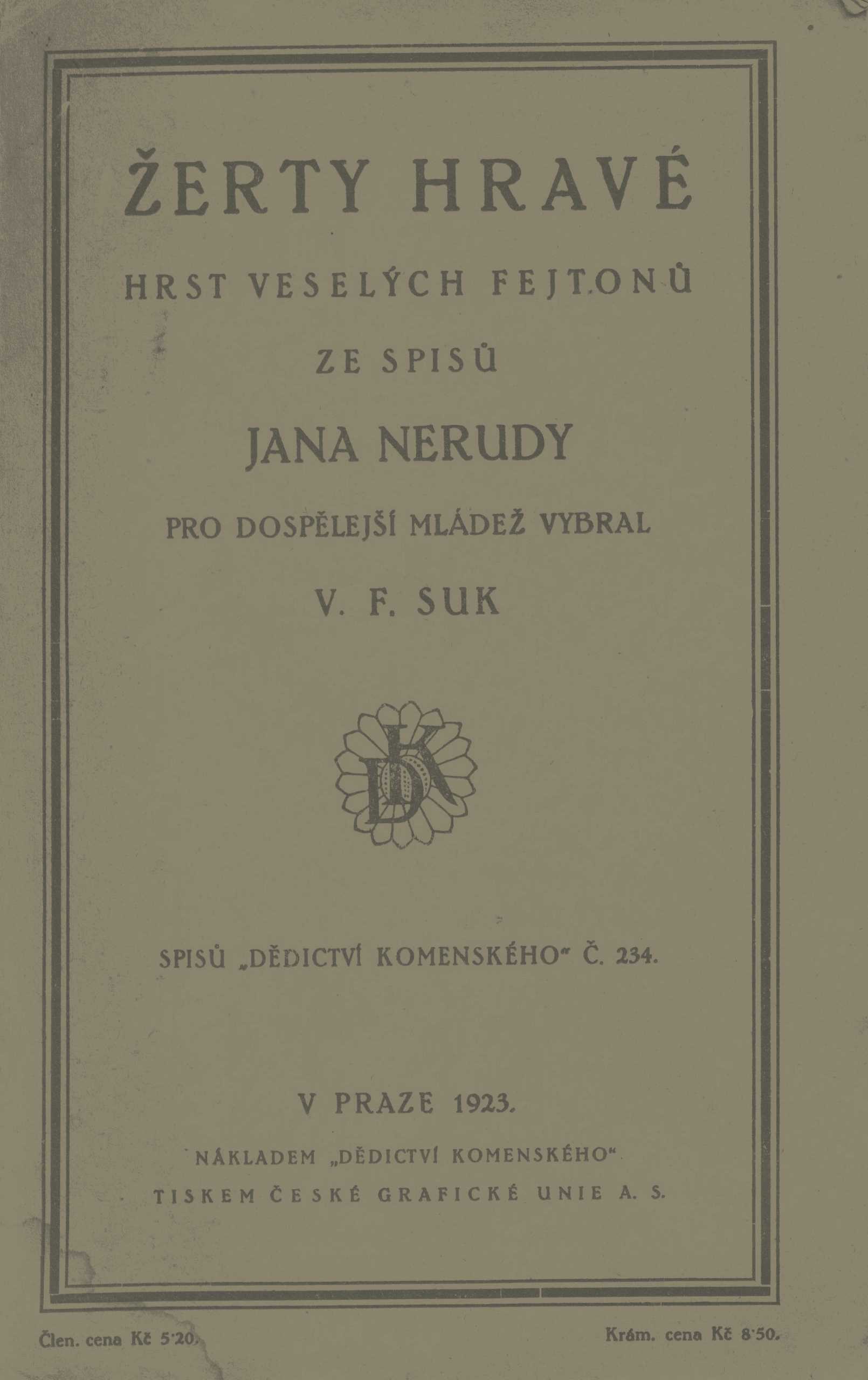 1. Title informationŽerty hravé : hrst veselých fejtonů ze spisů Jana Nerudy / pro dospělejší mládež vybral V.F. Suk