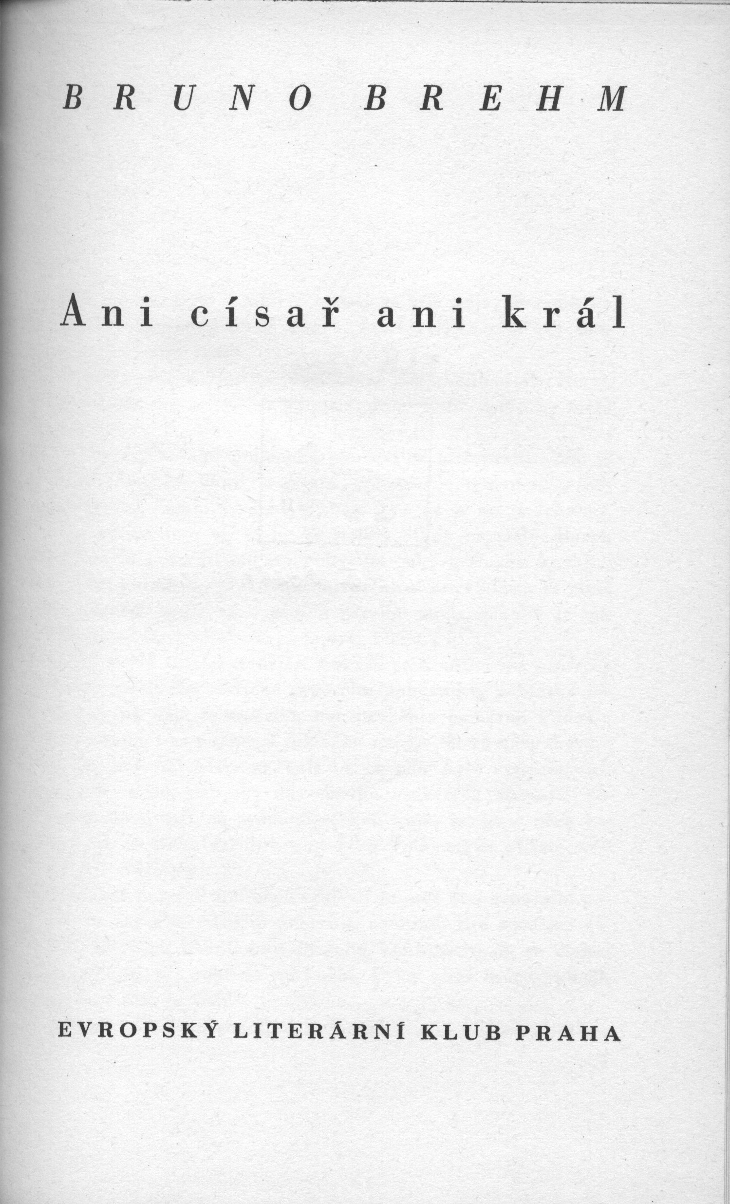1. Title informationAni císař ani král : [román] / Bruno Brehm ; [z německé předlohy přeložil F.V. Krejčí ; podle typografické úpravy J. Štyrského ; vazba i ochranný obal jsou provedeny podle návrhu Fr. Muziky]