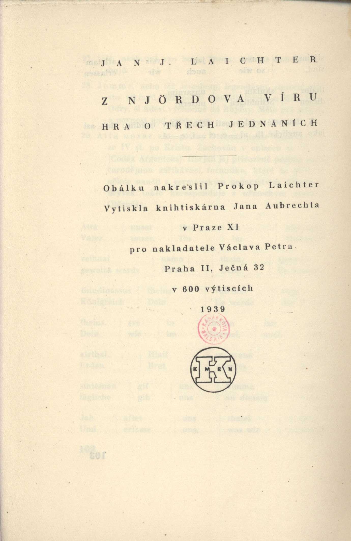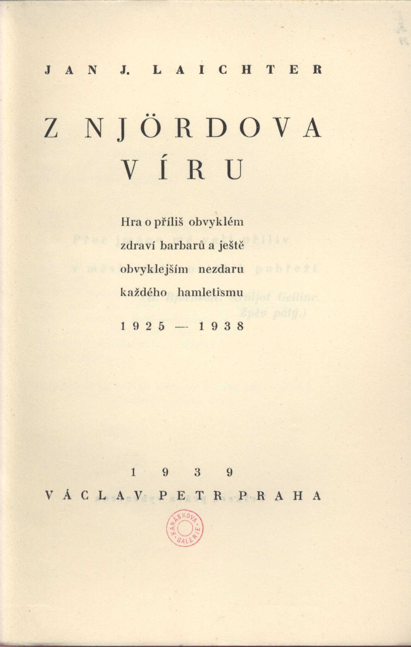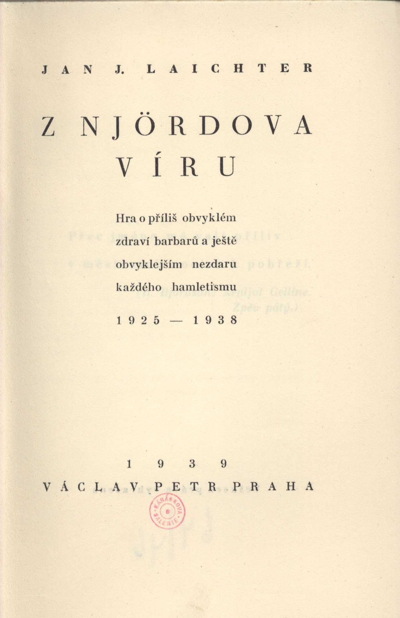 2. Title informationZ Njördova víru : hra o příliš obvyklém zdraví barbarů a ještě obvyklejším nezdaru každého hamletismu : 1925-1938 / Jan J. Laichter ; [obálku nakreslil Prokop Laichter]