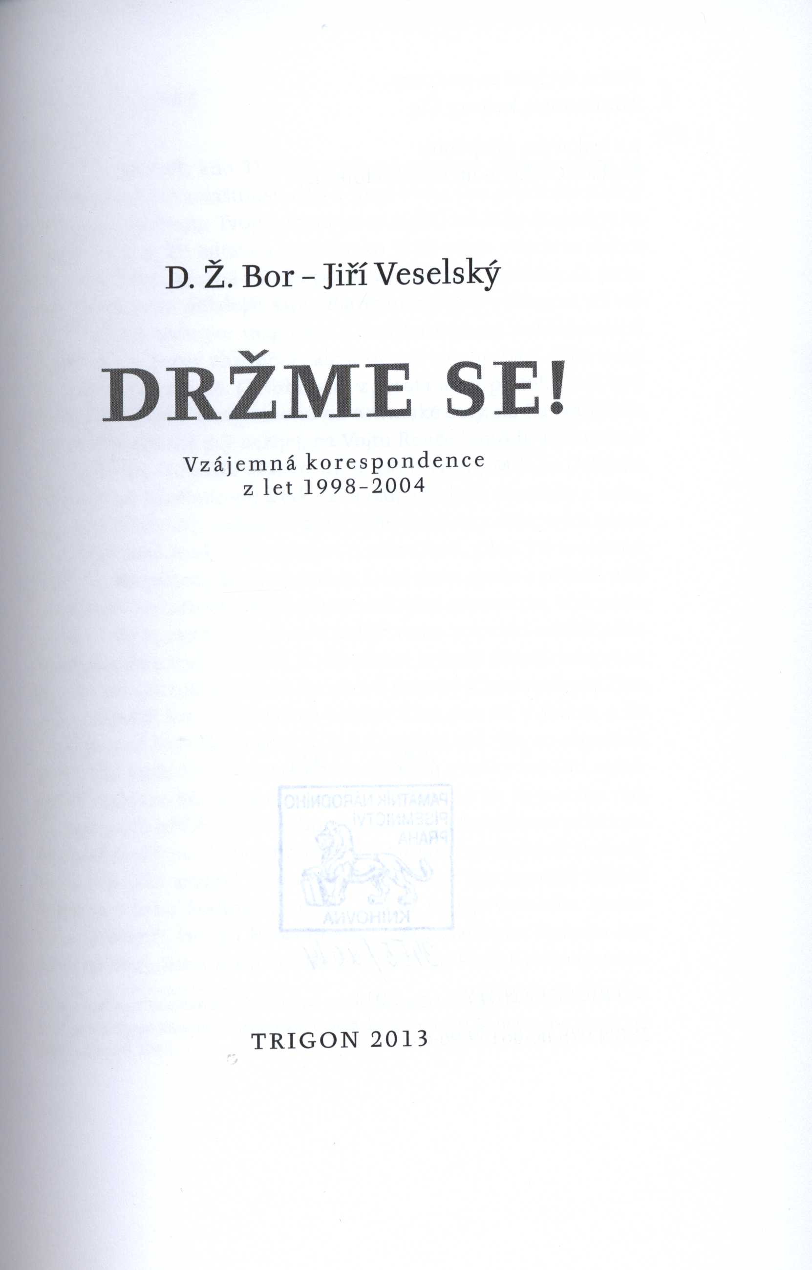 1. Title informationDržme se! : vzájemná korespondence z let 1998-2004 / D.Ž. Bor, Jiří Veselský ; [edičně zpracovali a k vydání připravili Božena Správcová a Michal Jareš ; kresba na obálce Veronika Holcová]