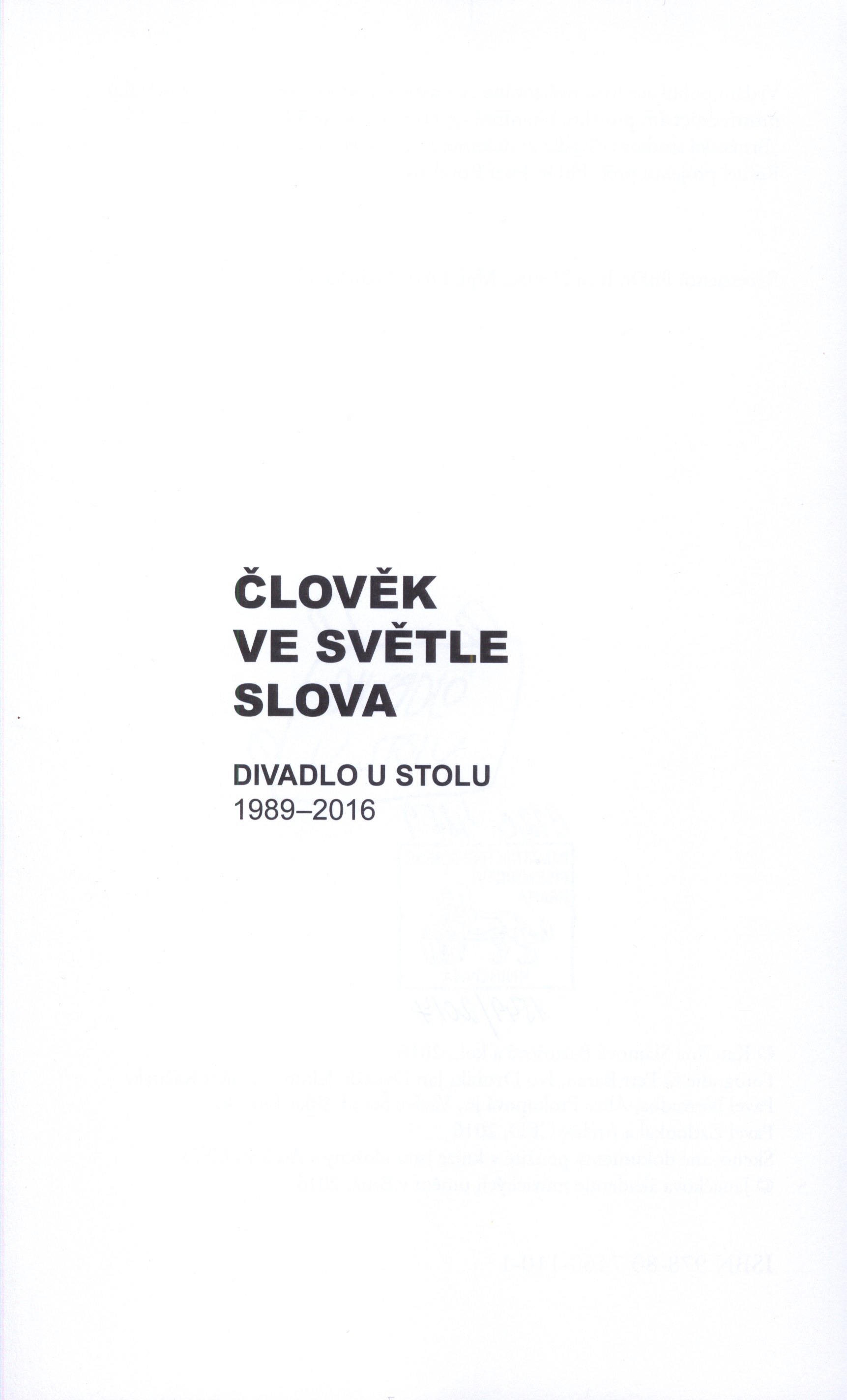 1. Title informationČlověk ve světle slova : Divadlo U stolu 1989-2016 / Kateřina Slámová Bartošová a kol.