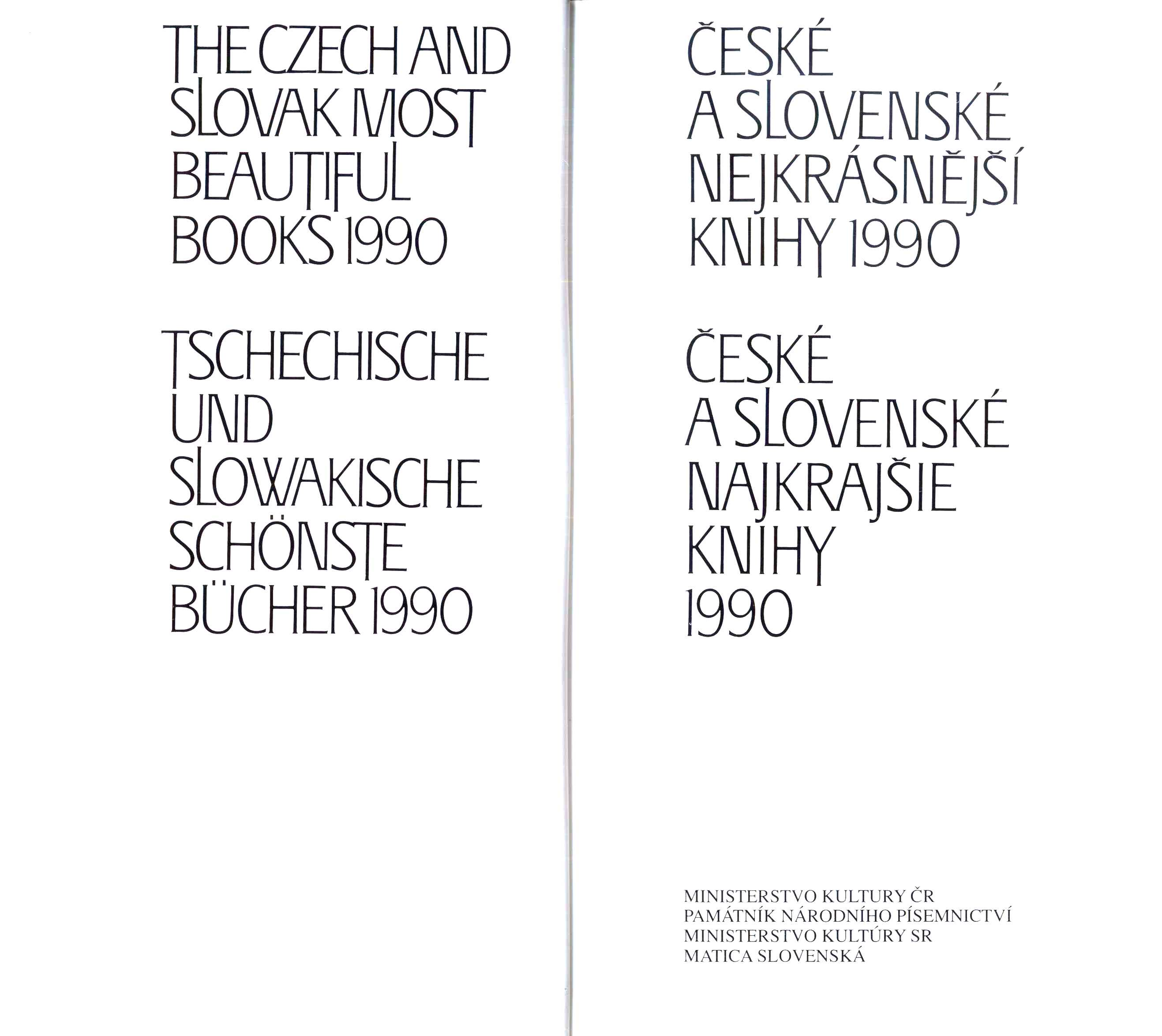 1. Title informationČeské a slovenské nejkrásnější knihy 1990 = The Czech and Slovak most beautiful books 1990 = České a slovenské najkrajšie knihy 1990 = Tschechische und slowakische schönsten Bücher 1990 / sestavil Josef Javůrek ; obálku navrhl a graficky upravil Miloslav Fulín